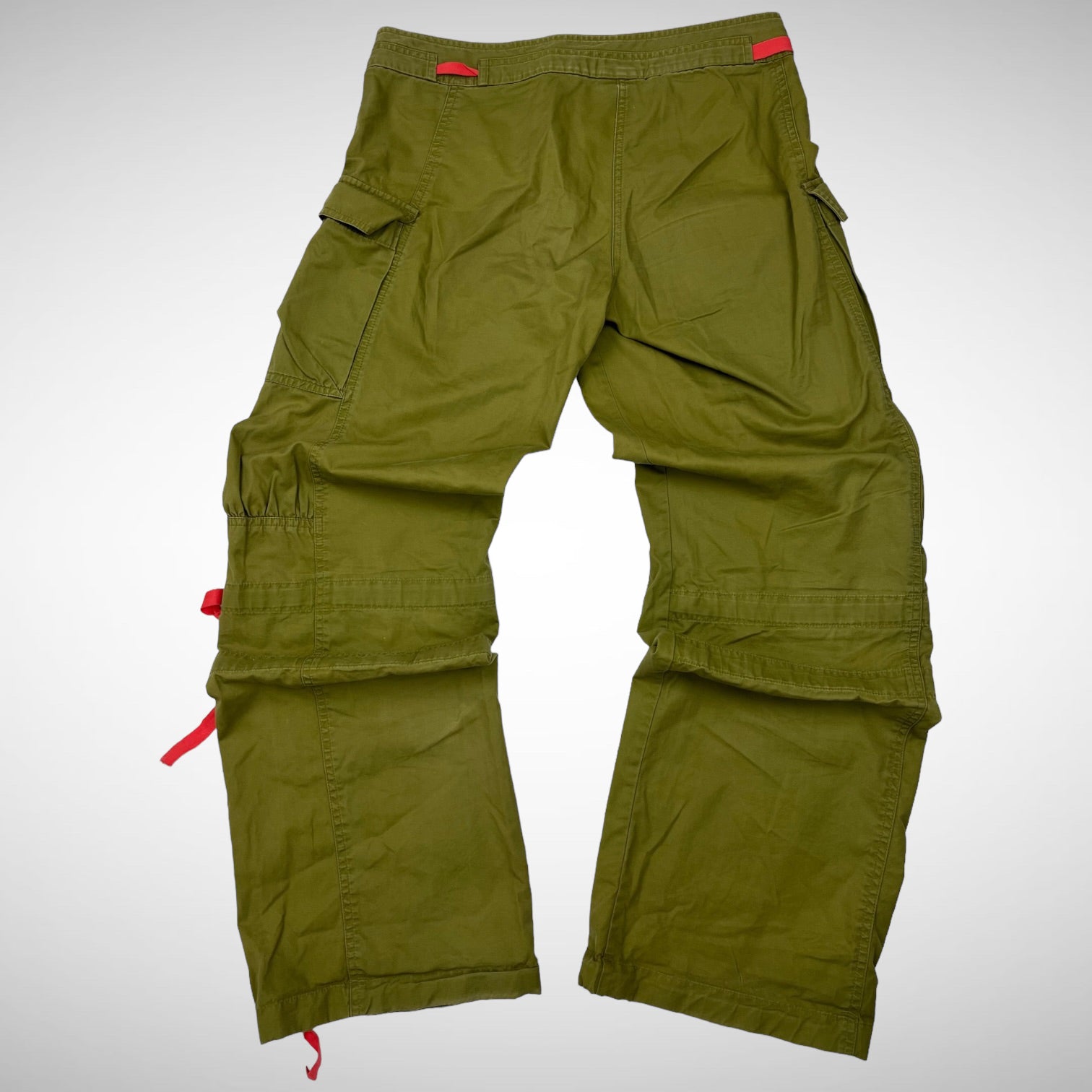 Green cargos with utility pockets on the sides including pink straps to adjust fit and style, accompanied with straps at lower legs and more pink details such as swoosh placement and double press-button closure.