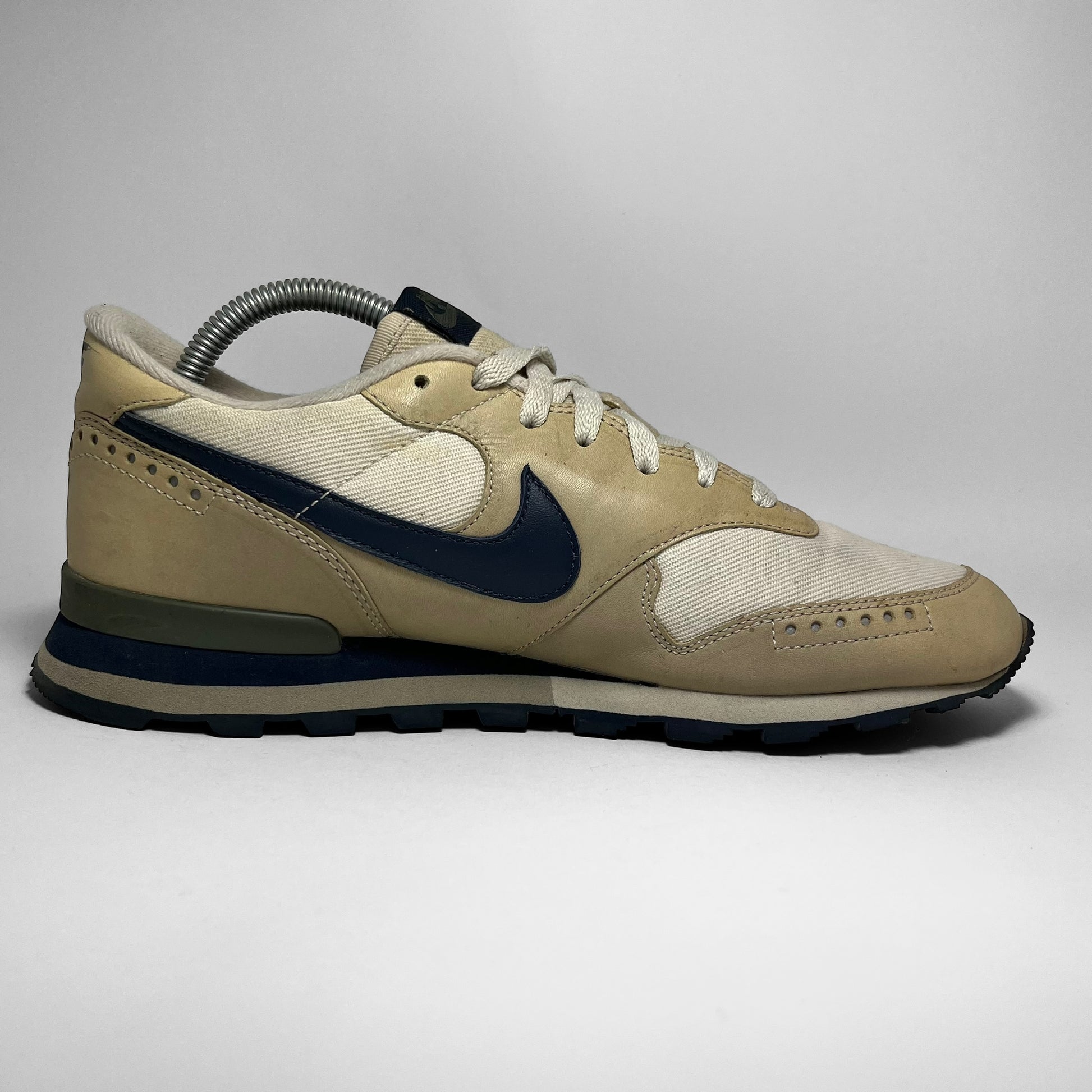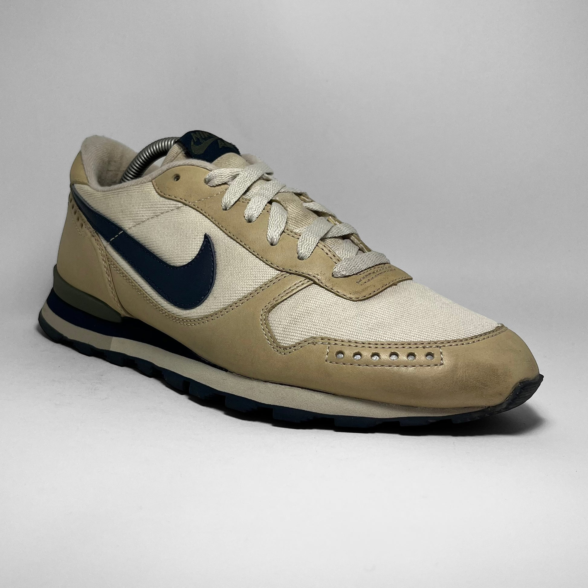 Woven tan upper combined with darker toned leather panels throughout featuring perforation details, dark navy leather swoosh and branded tag on tongue and print on heel.