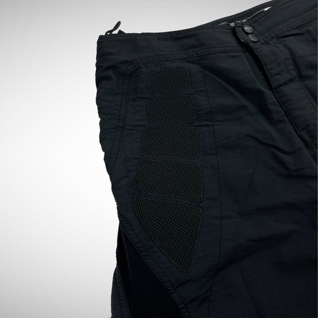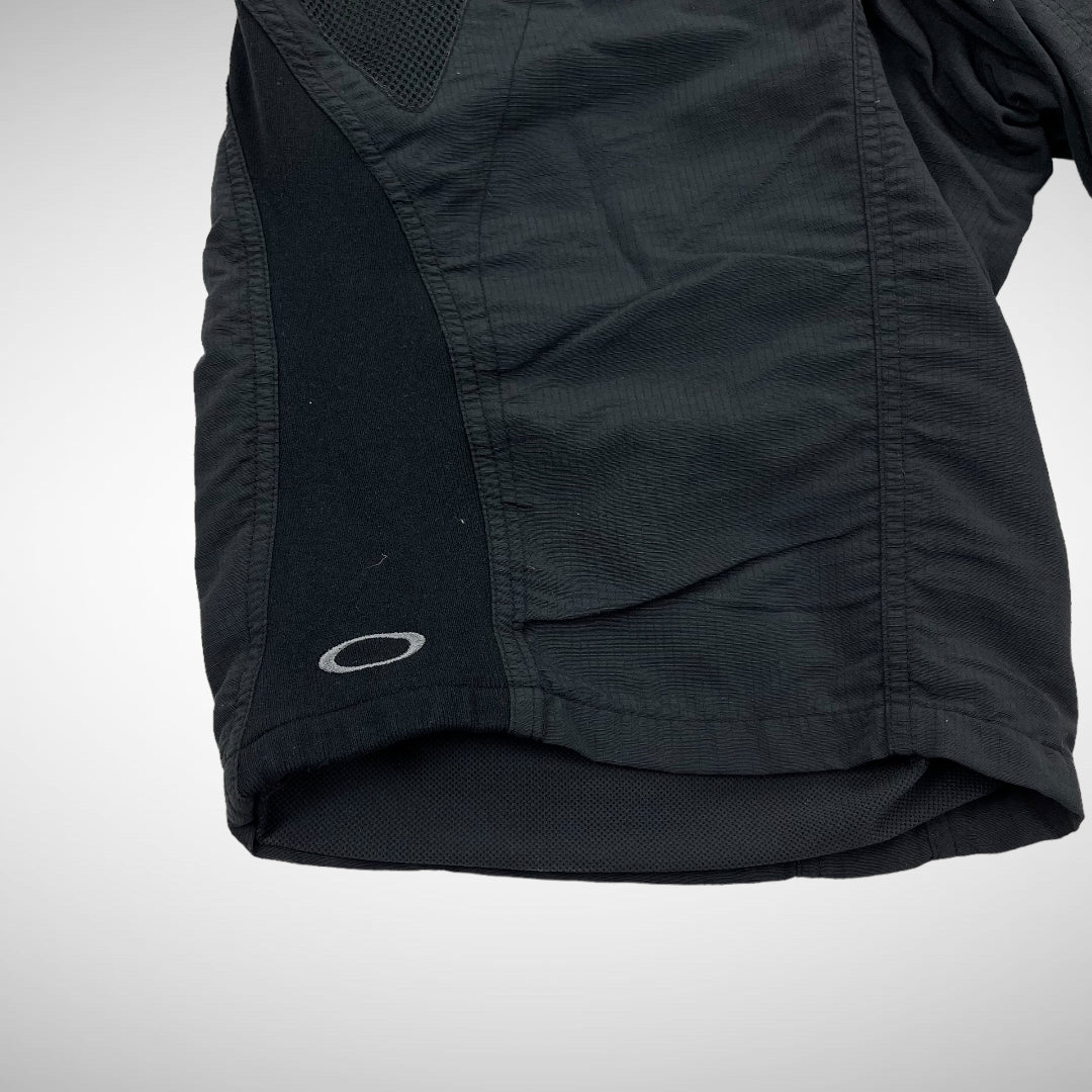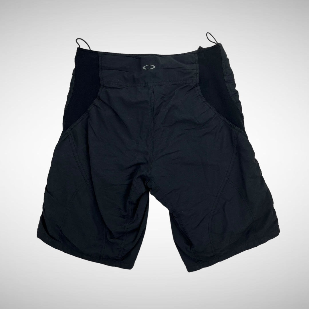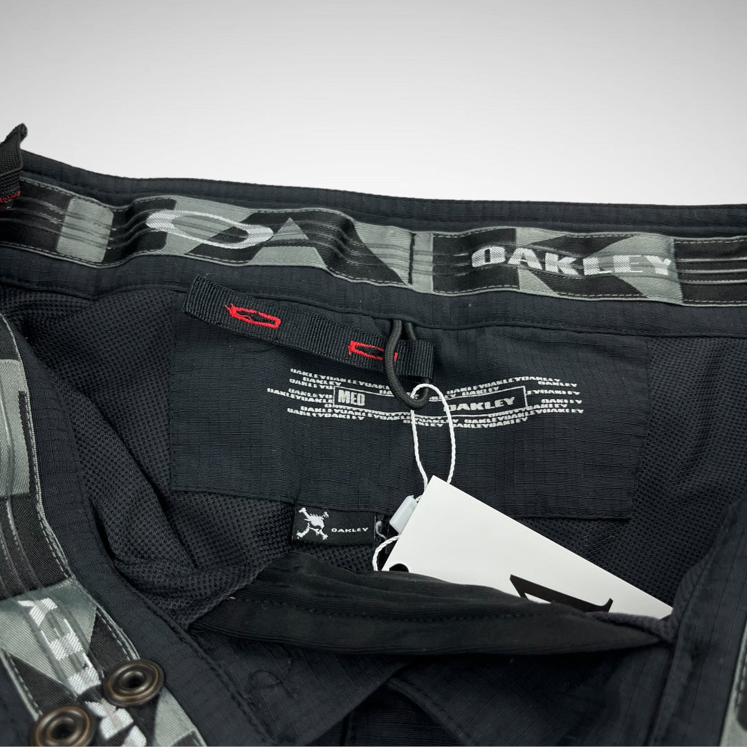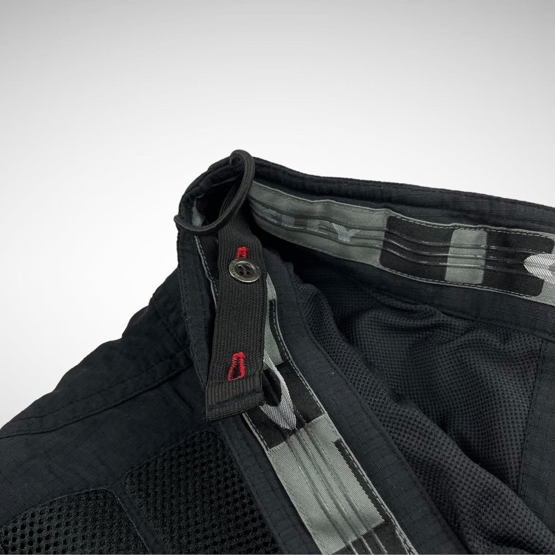 Black tactical shorts with mesh panels, stretch materials flowing from back to front including double Oakley branding and single on the back, featuring no pockets, elastic strap adjustable waist, double branded button closure and rip-stop to improve durability.