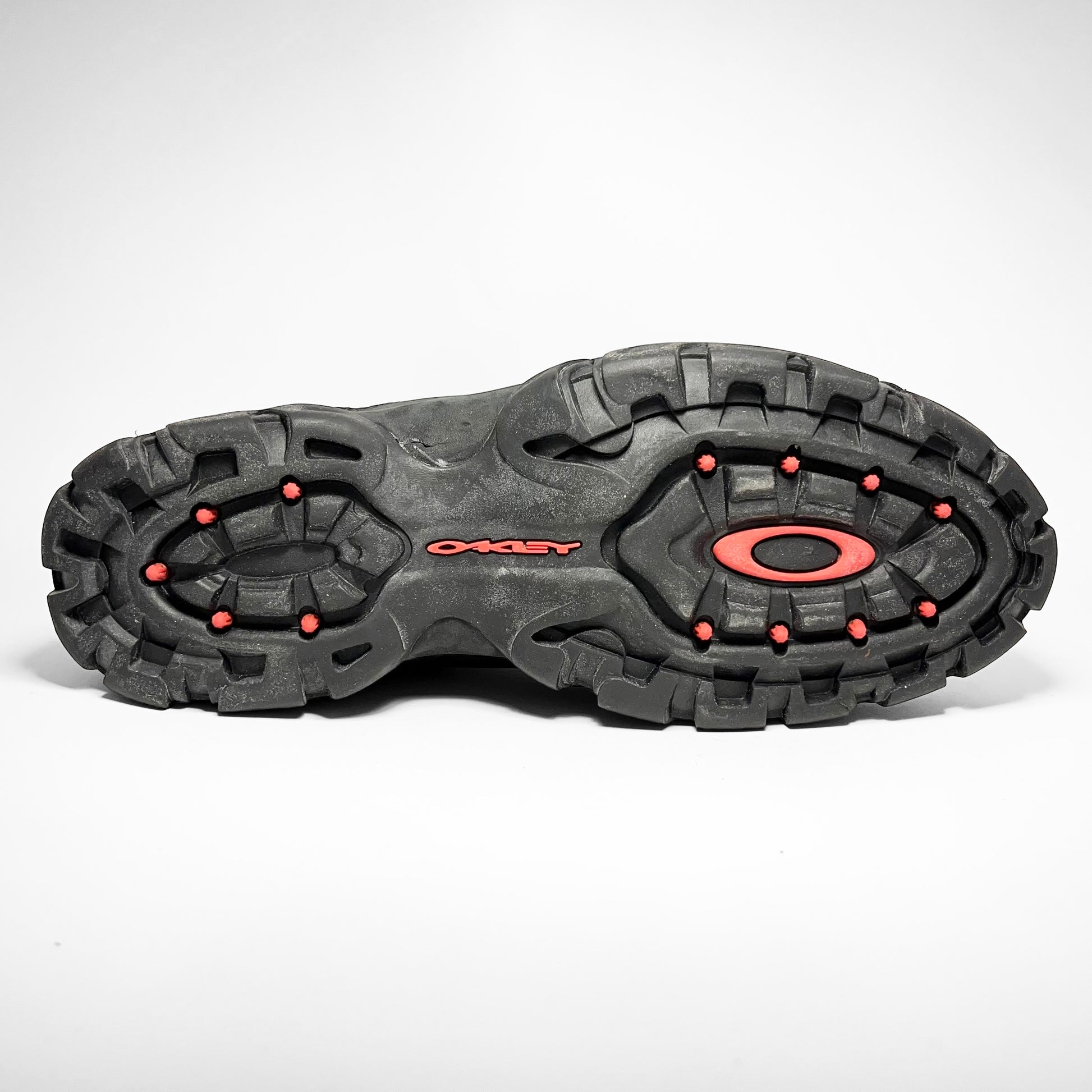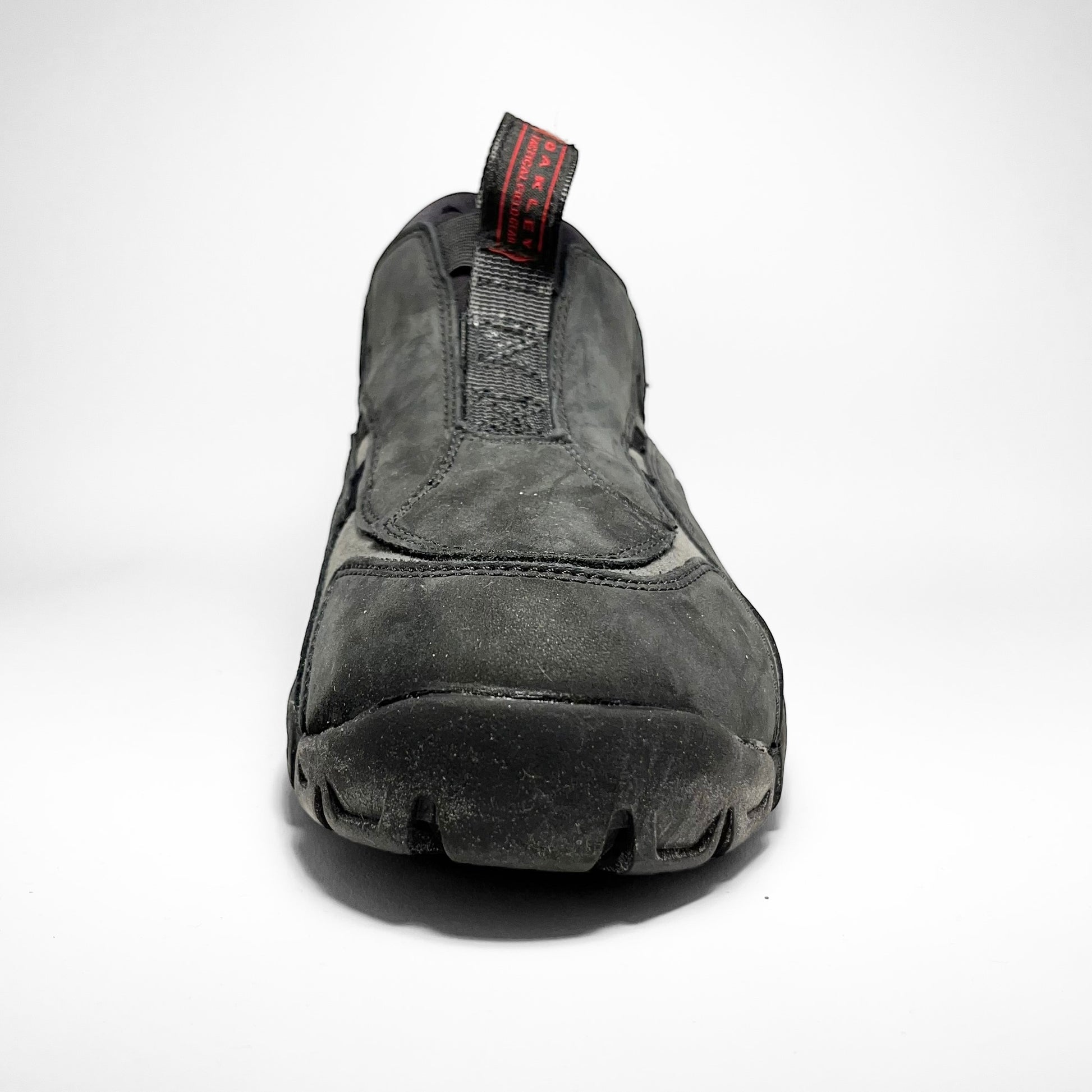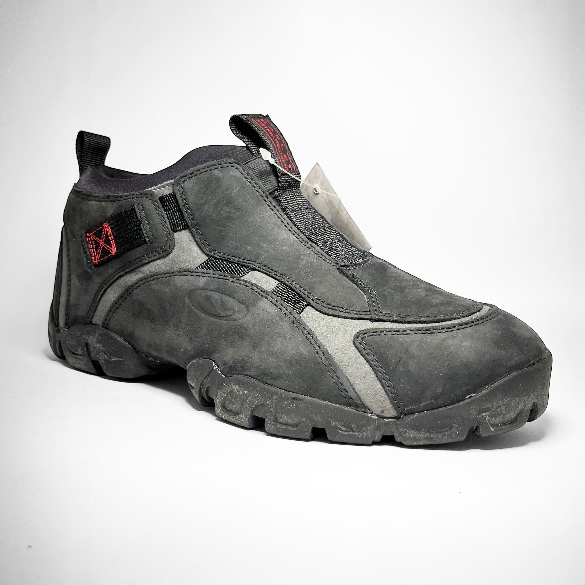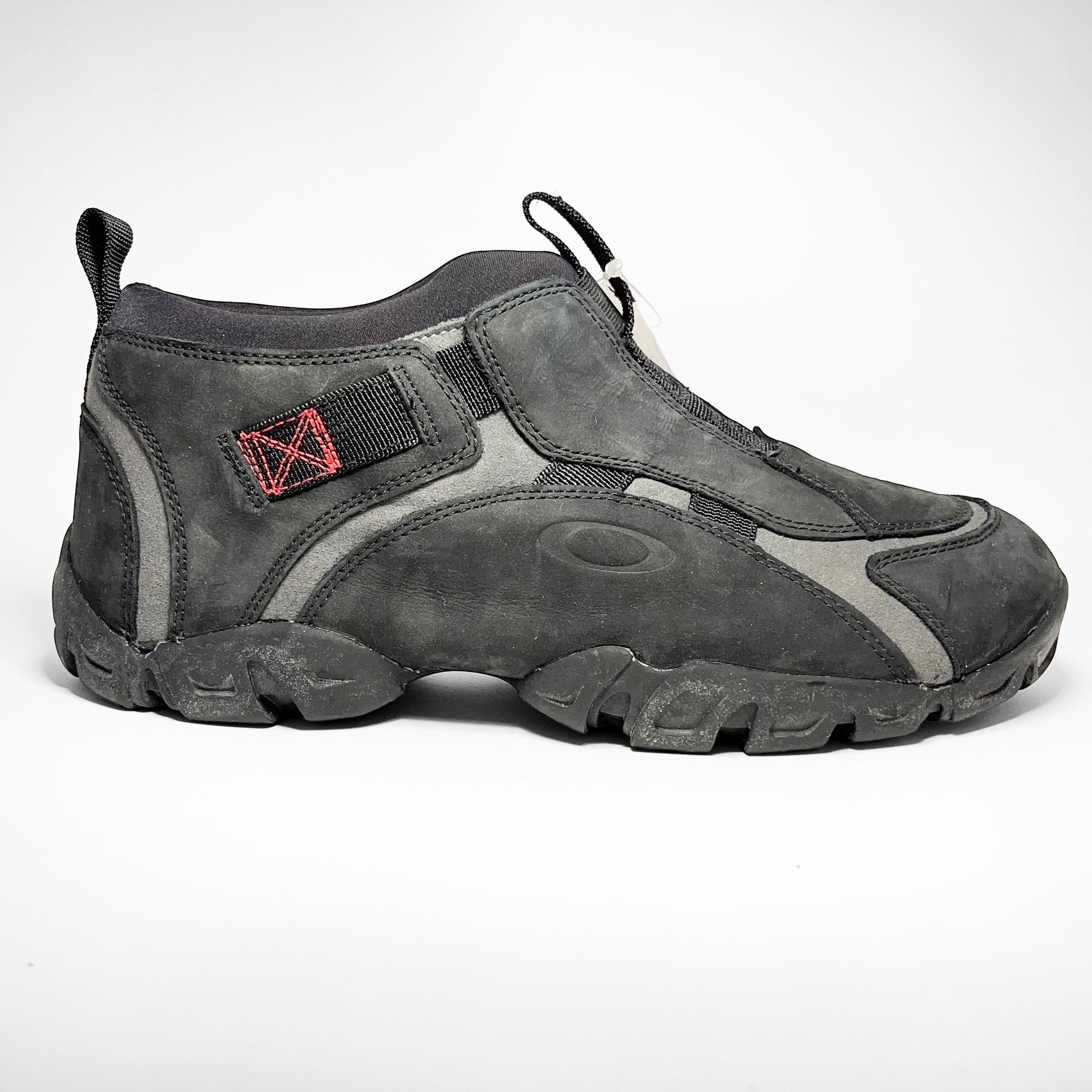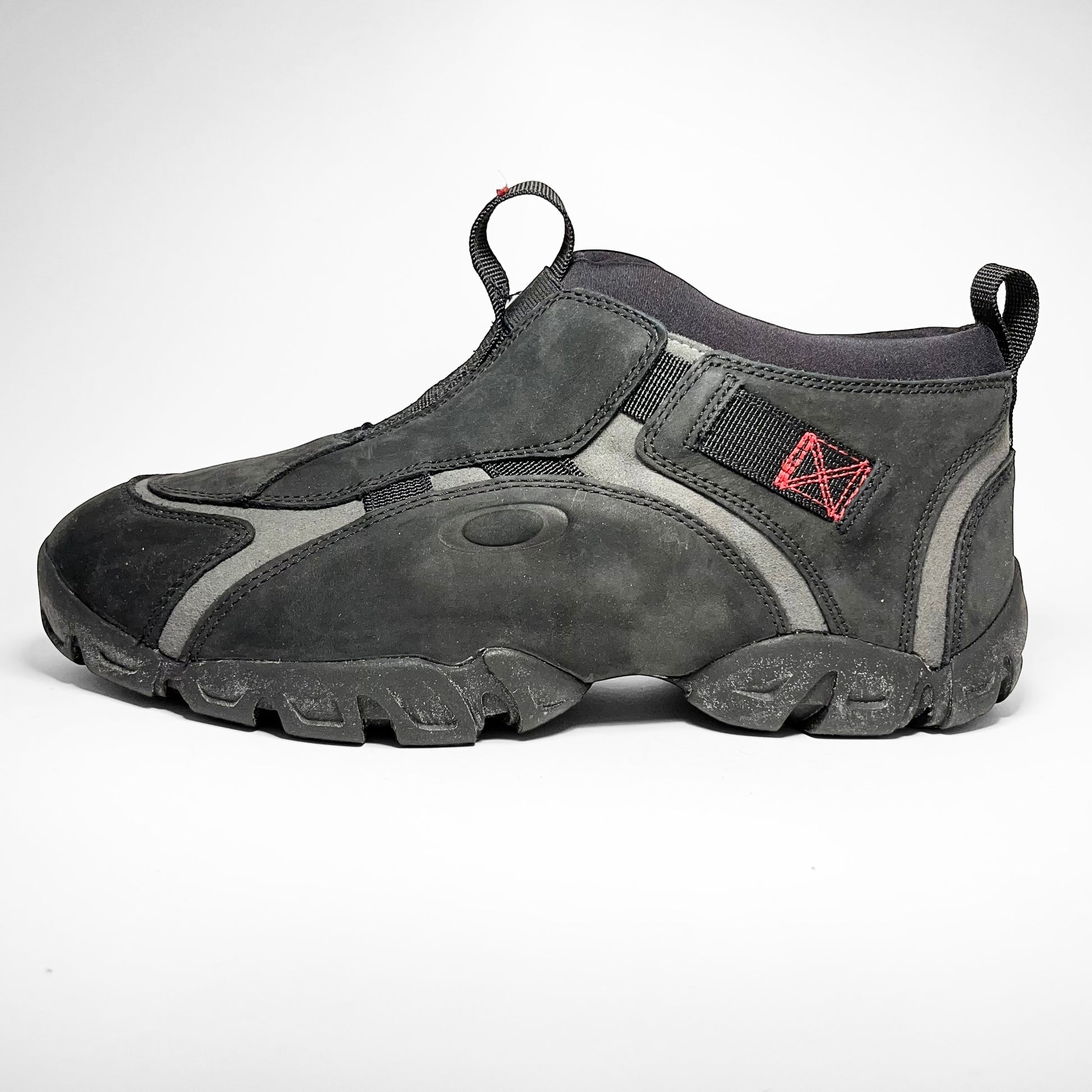 Slip-on with neoprene sock gusset, black leather panels with a grey leather base enforced with black cotton-woven straps along the pair together with red stitching details on the side and heel, Oakley embossed logo and red detail branded patch on pull-tab and outsole details.