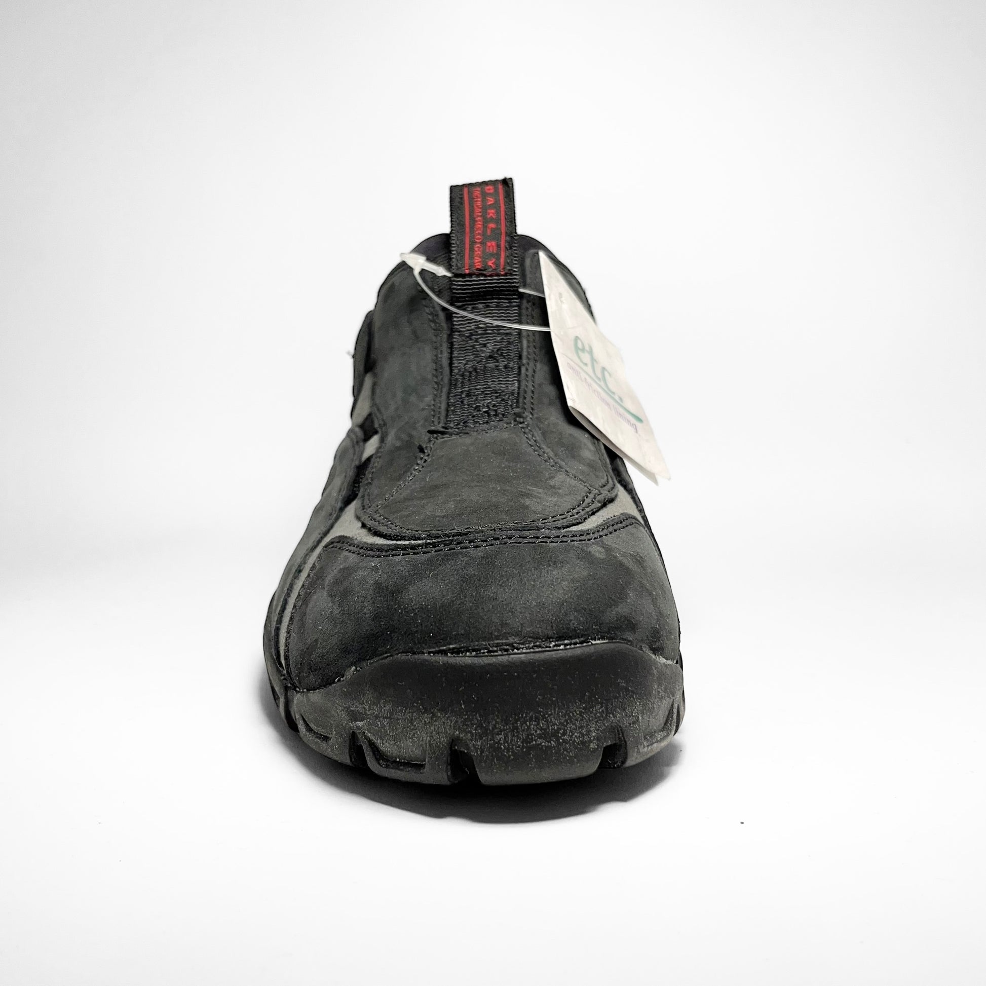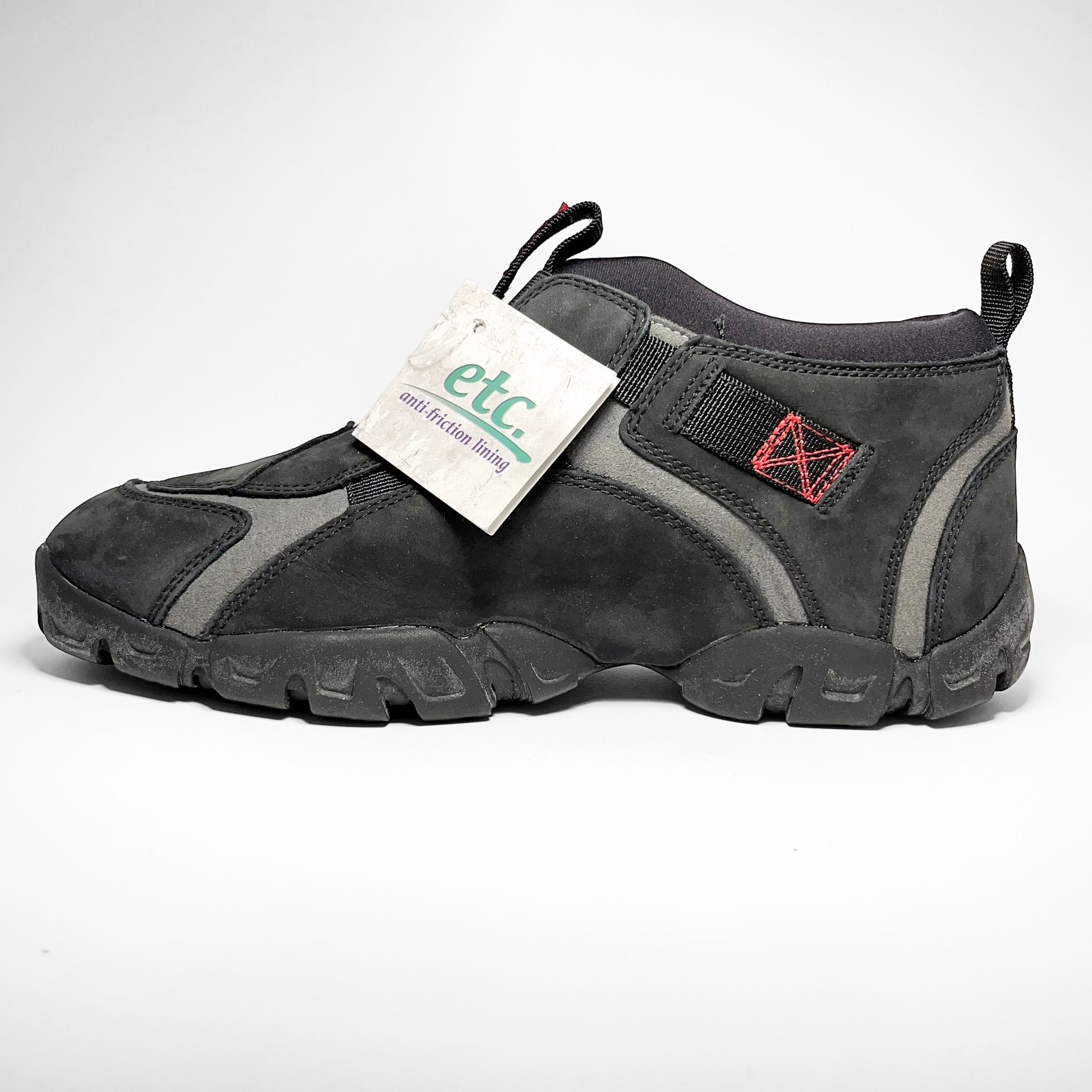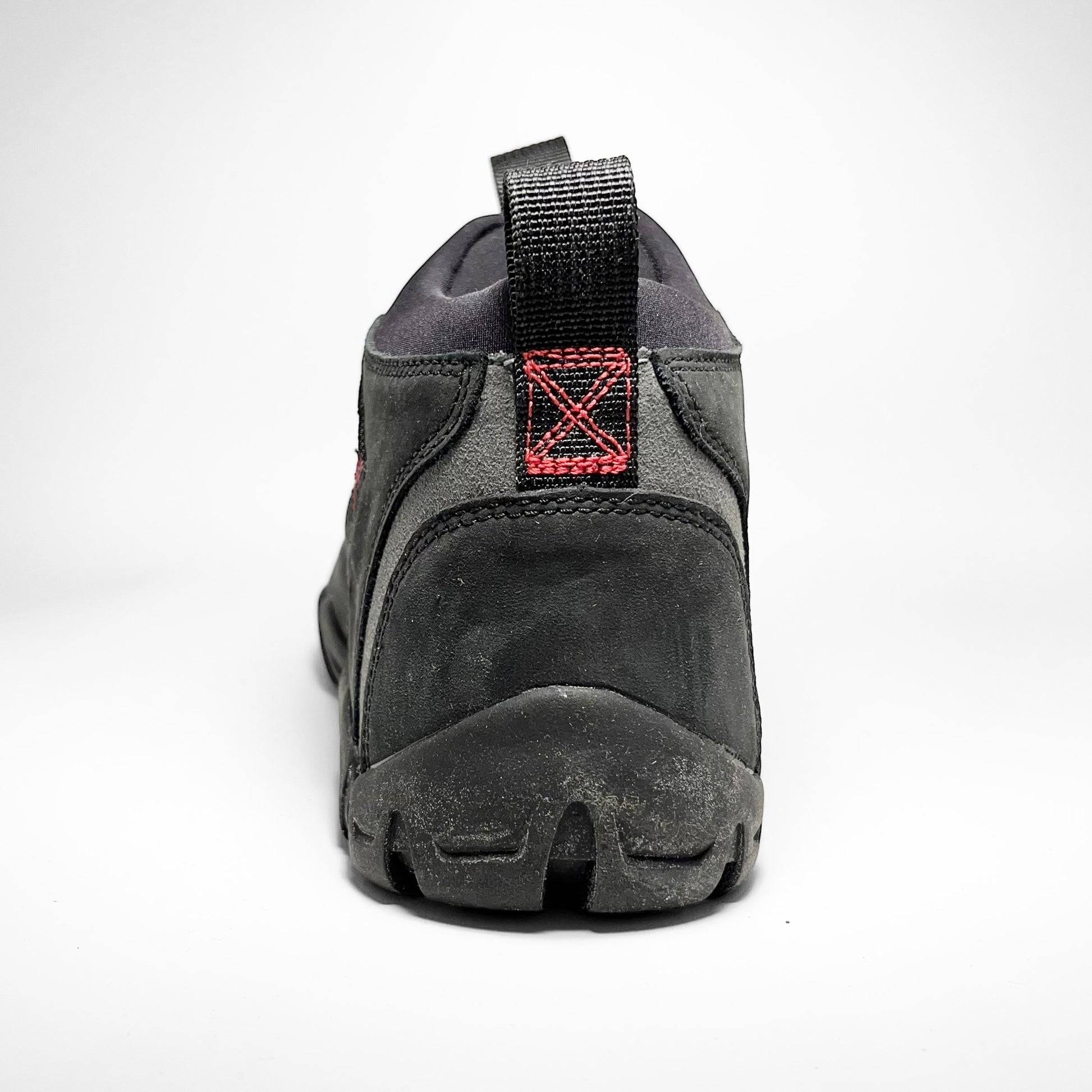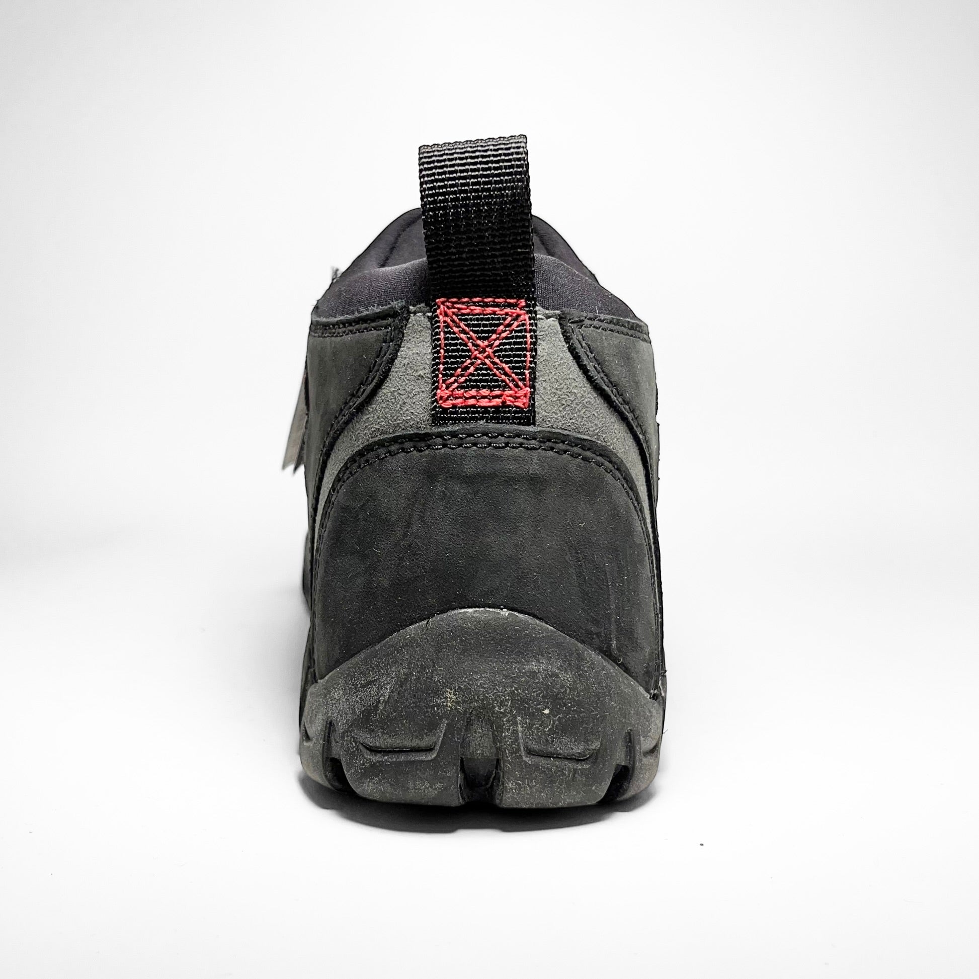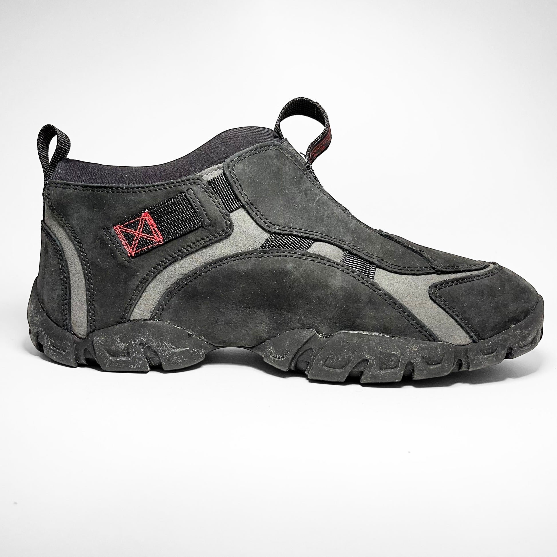 Slip-on with neoprene sock gusset, black leather panels with a grey leather base enforced with black cotton-woven straps along the pair together with red stitching details on the side and heel, Oakley embossed logo and red detail branded patch on pull-tab and outsole details.