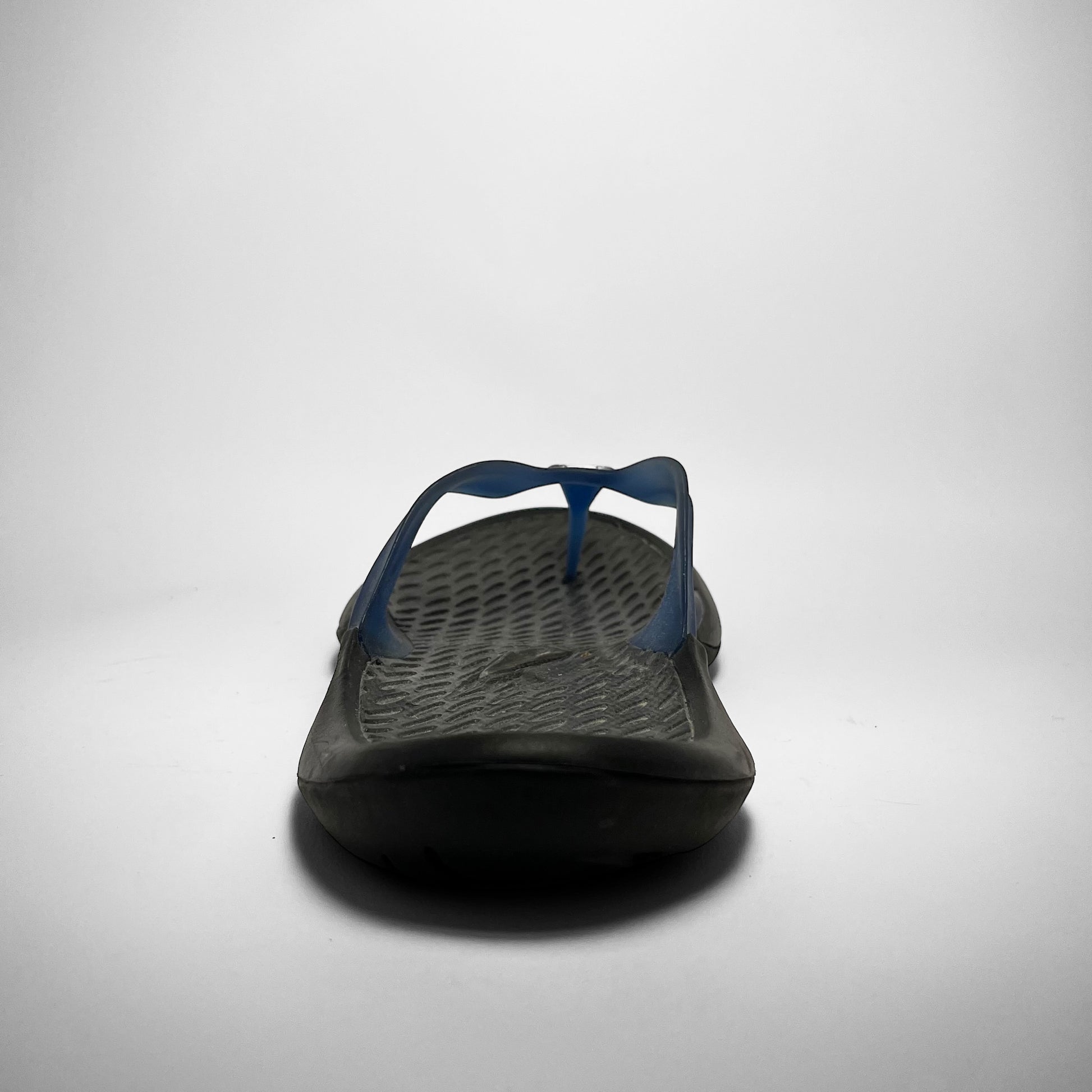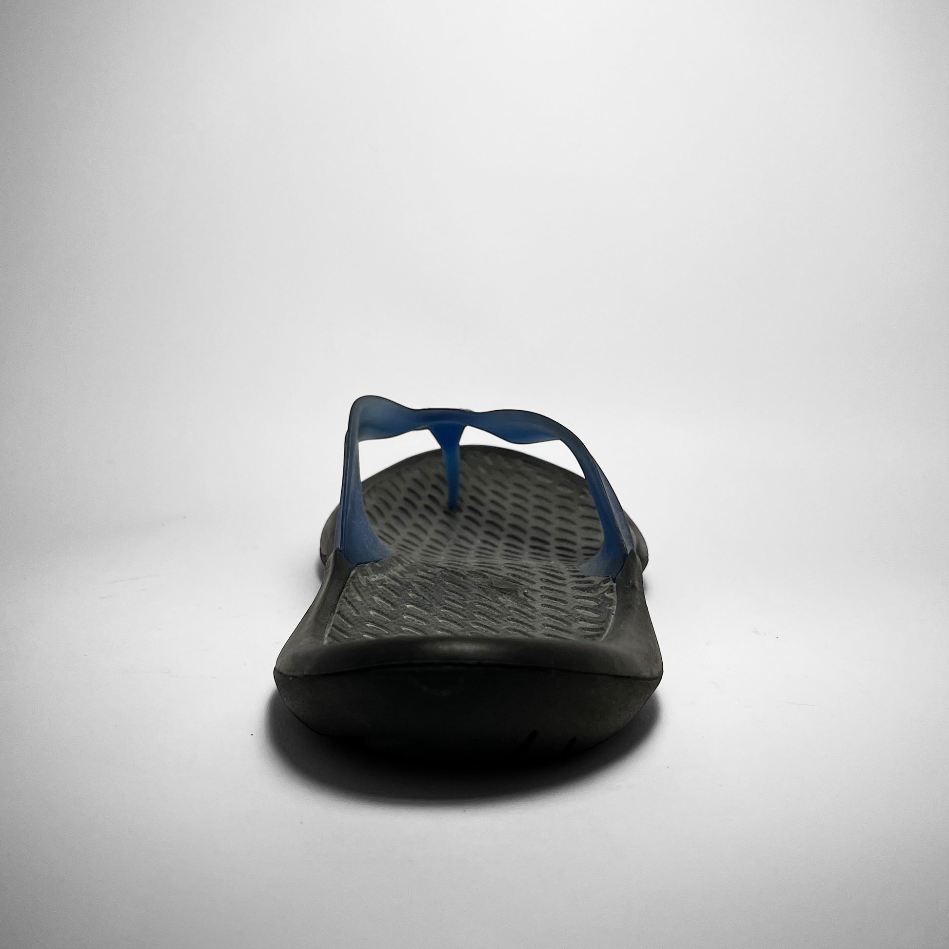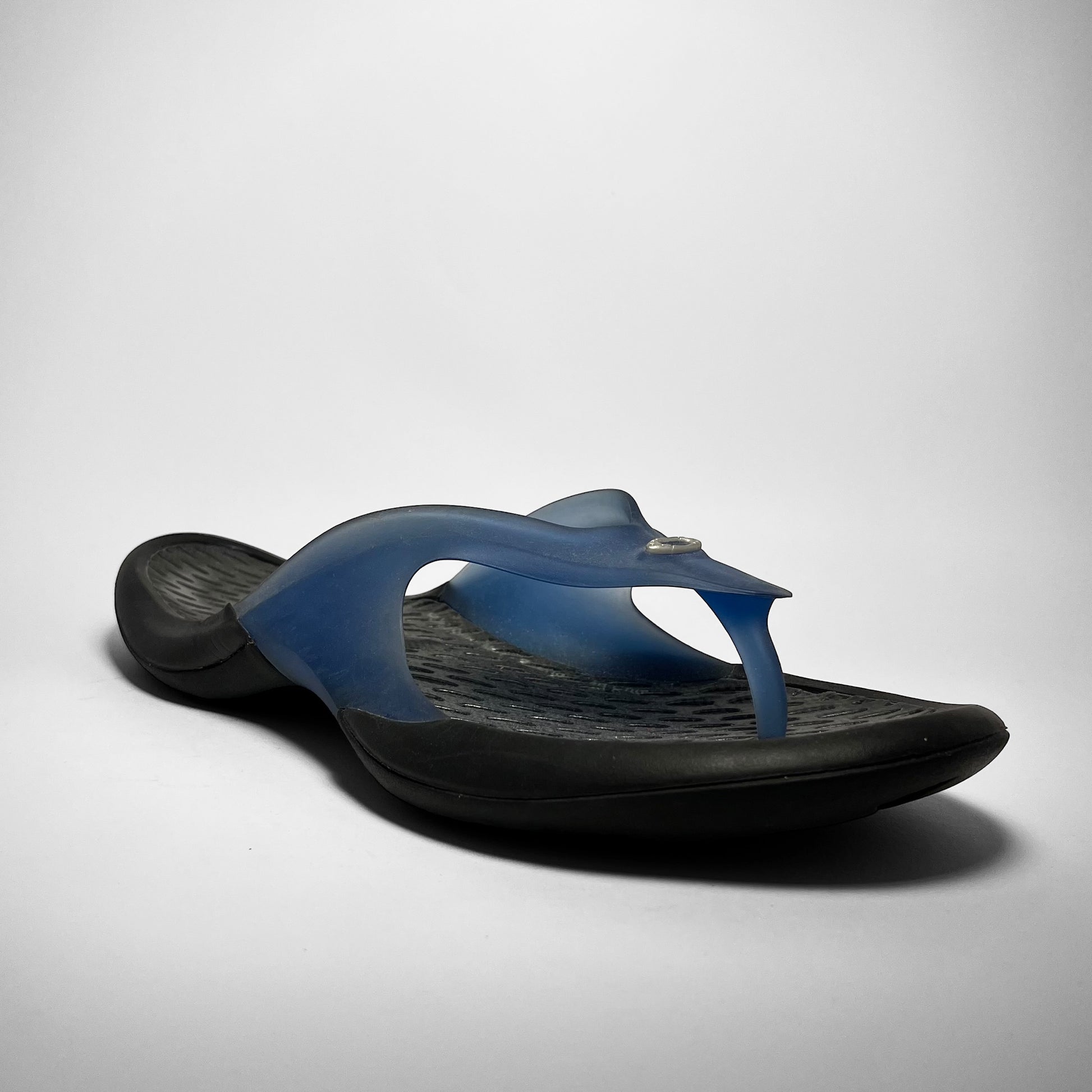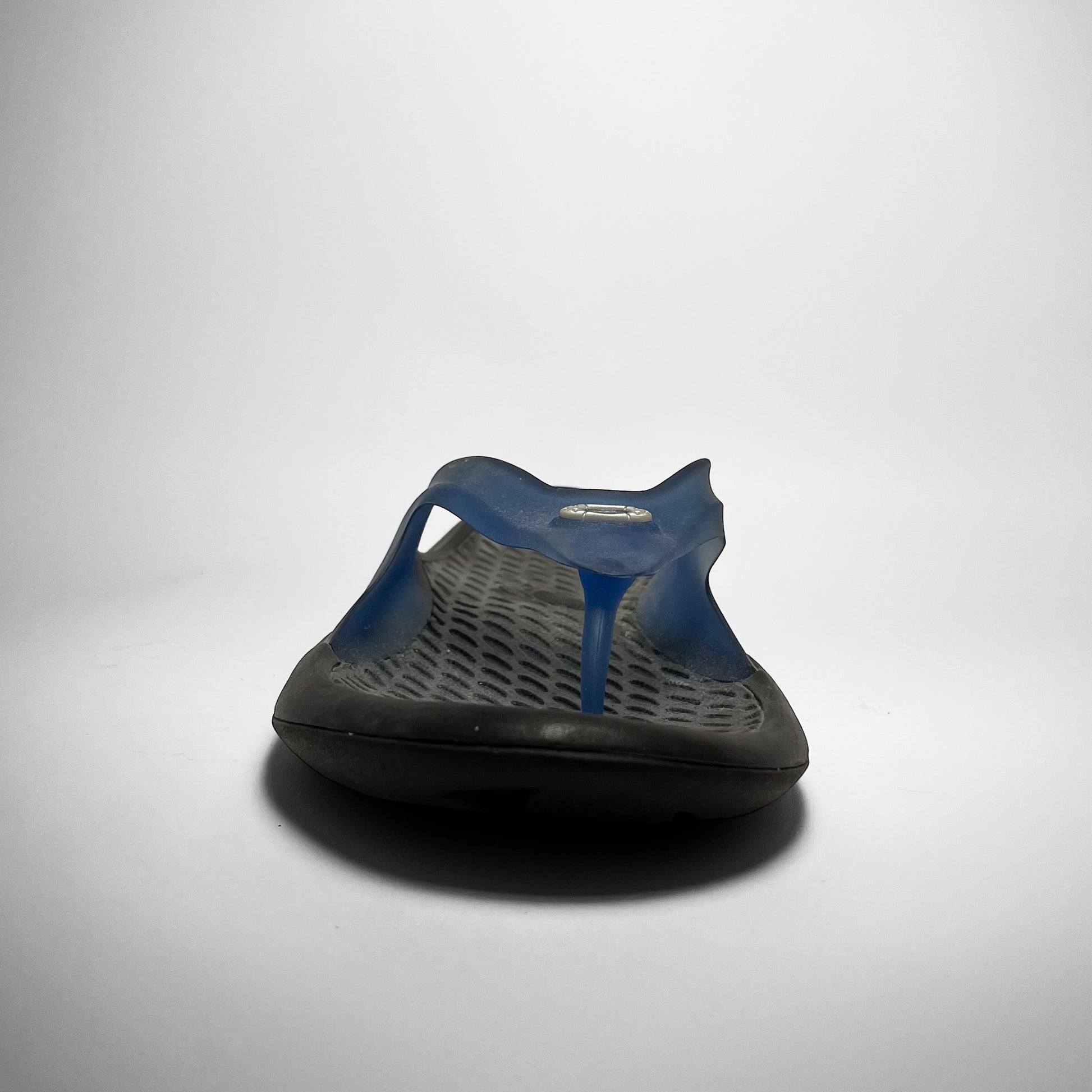 Blue rubber strap with metal Oakley logo and black rubber solo with details on the outsole including branding.