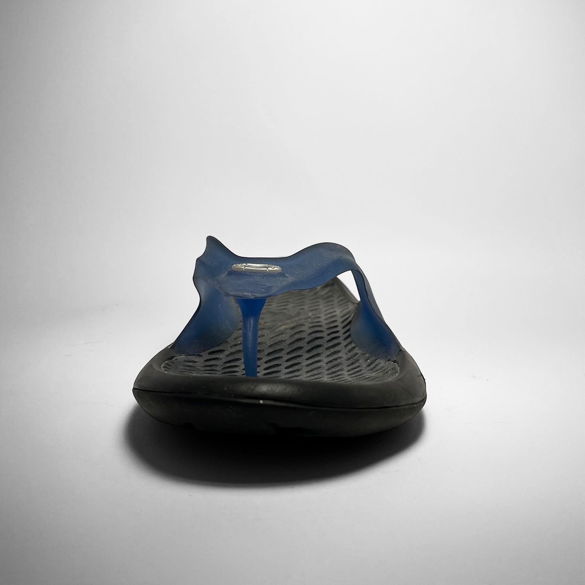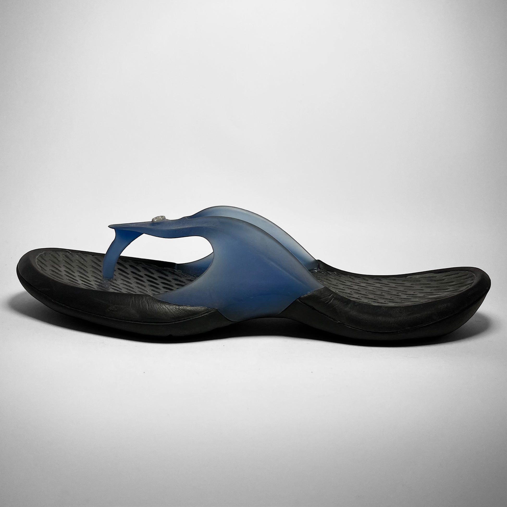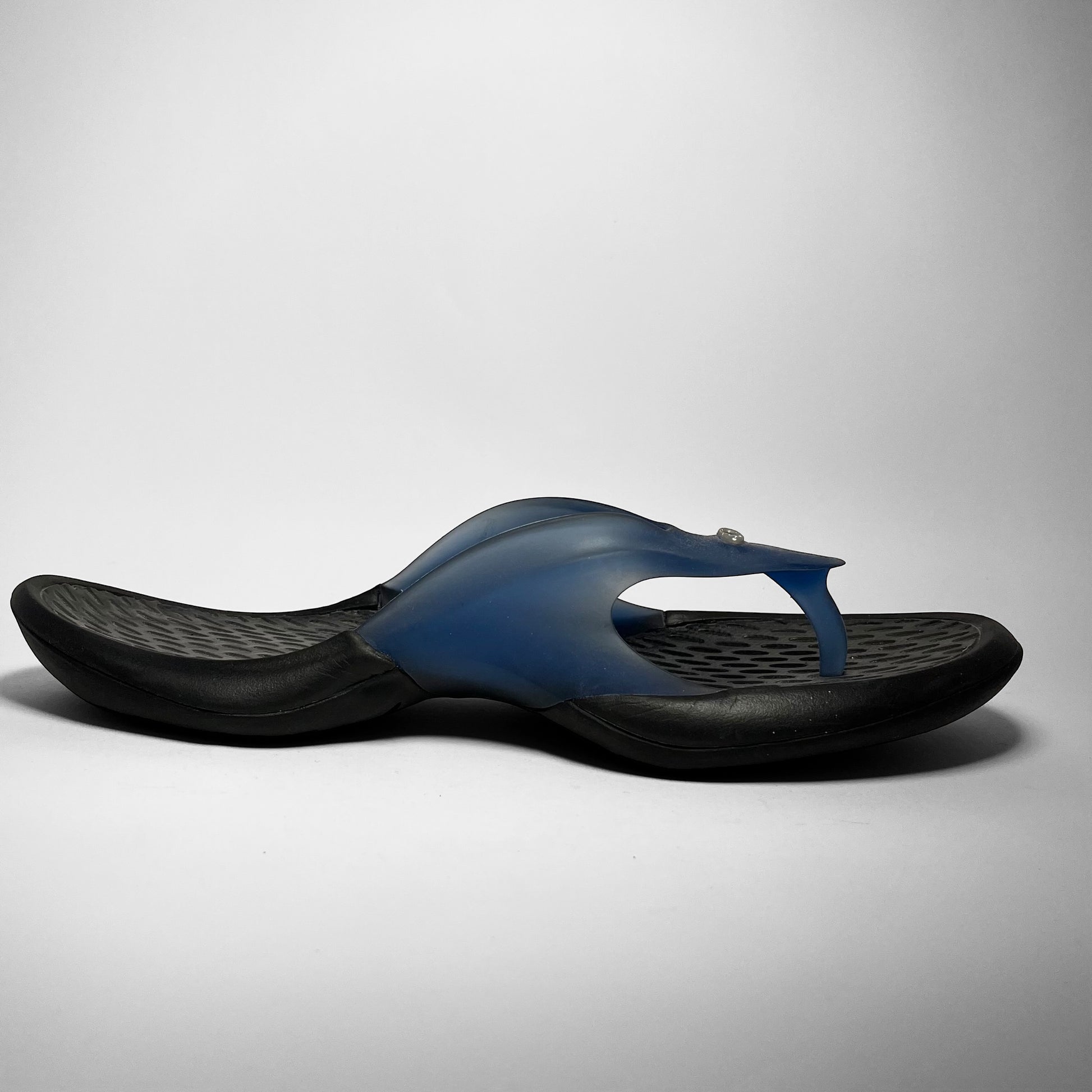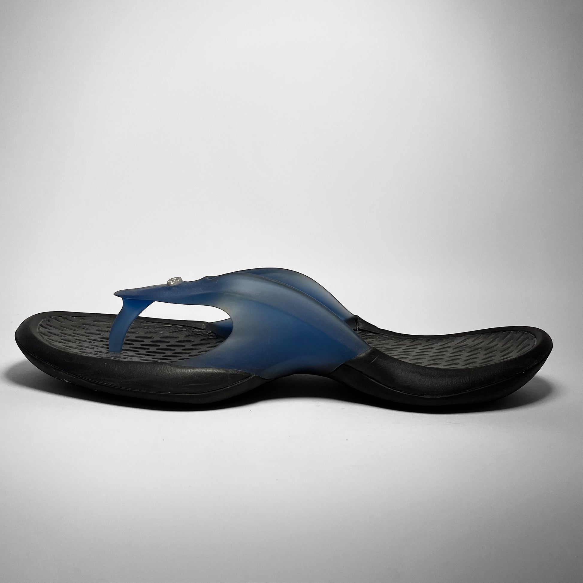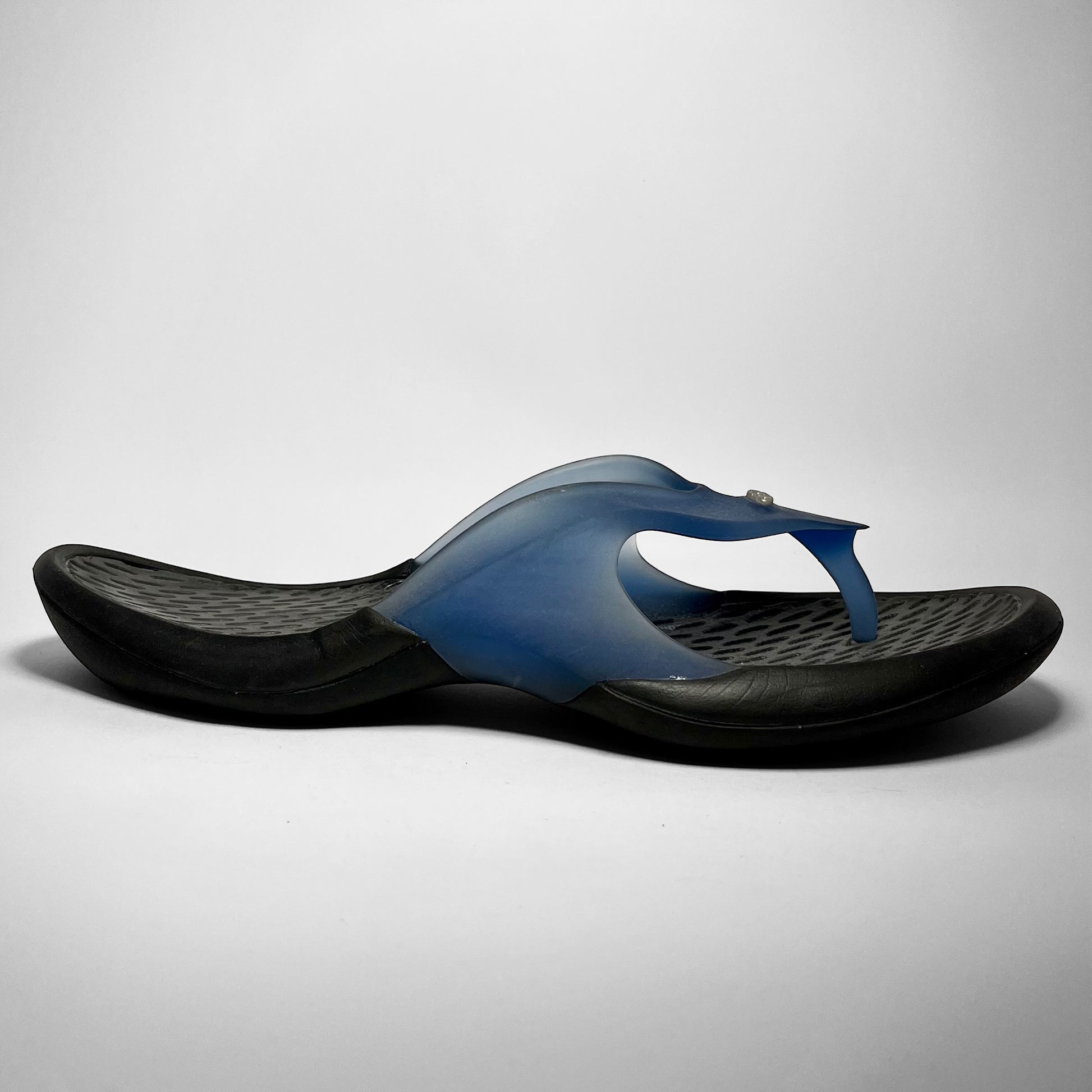Blue rubber strap with metal Oakley logo and black rubber solo with details on the outsole including branding.