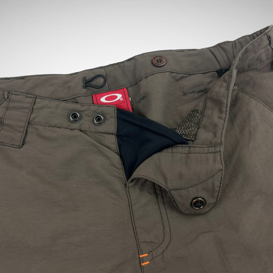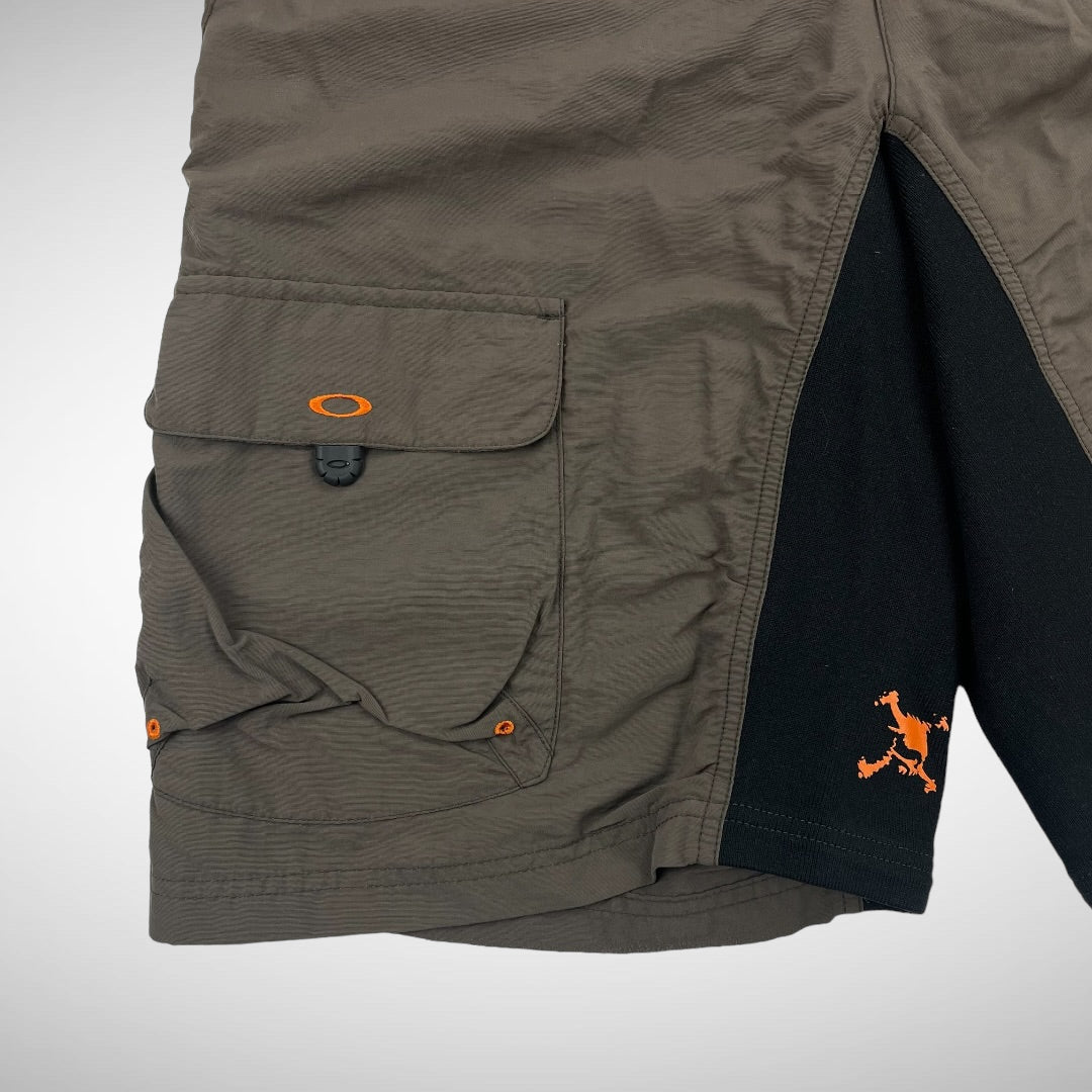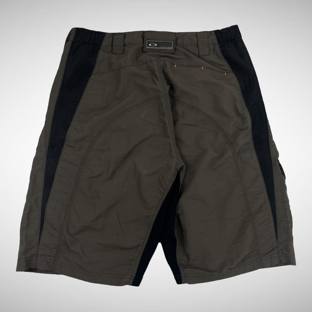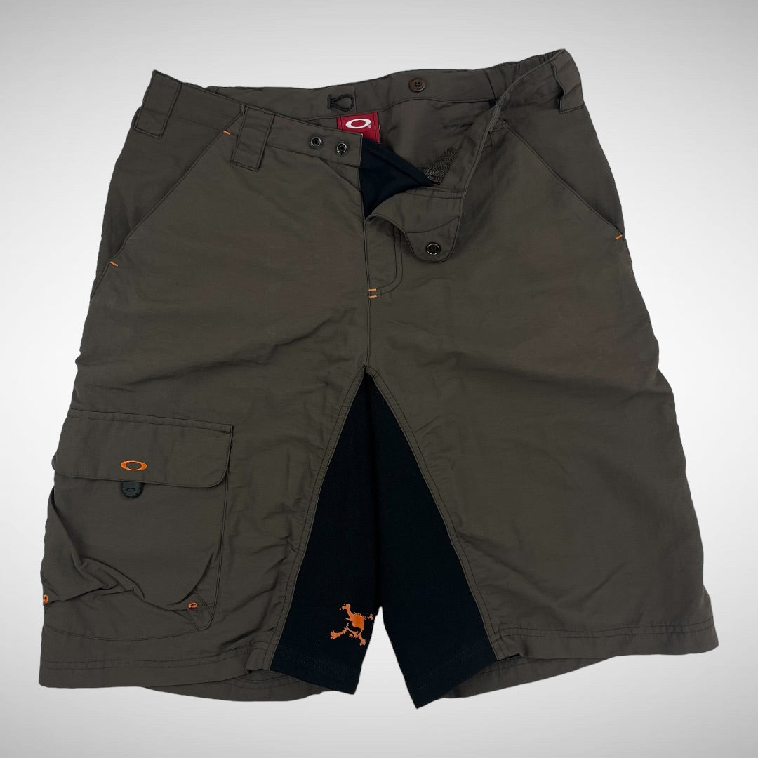 Brown shorts with orange stitching details, Oakley branding and Skull print on neoprene panel, black mesh rear panels and Oakley branding on back.