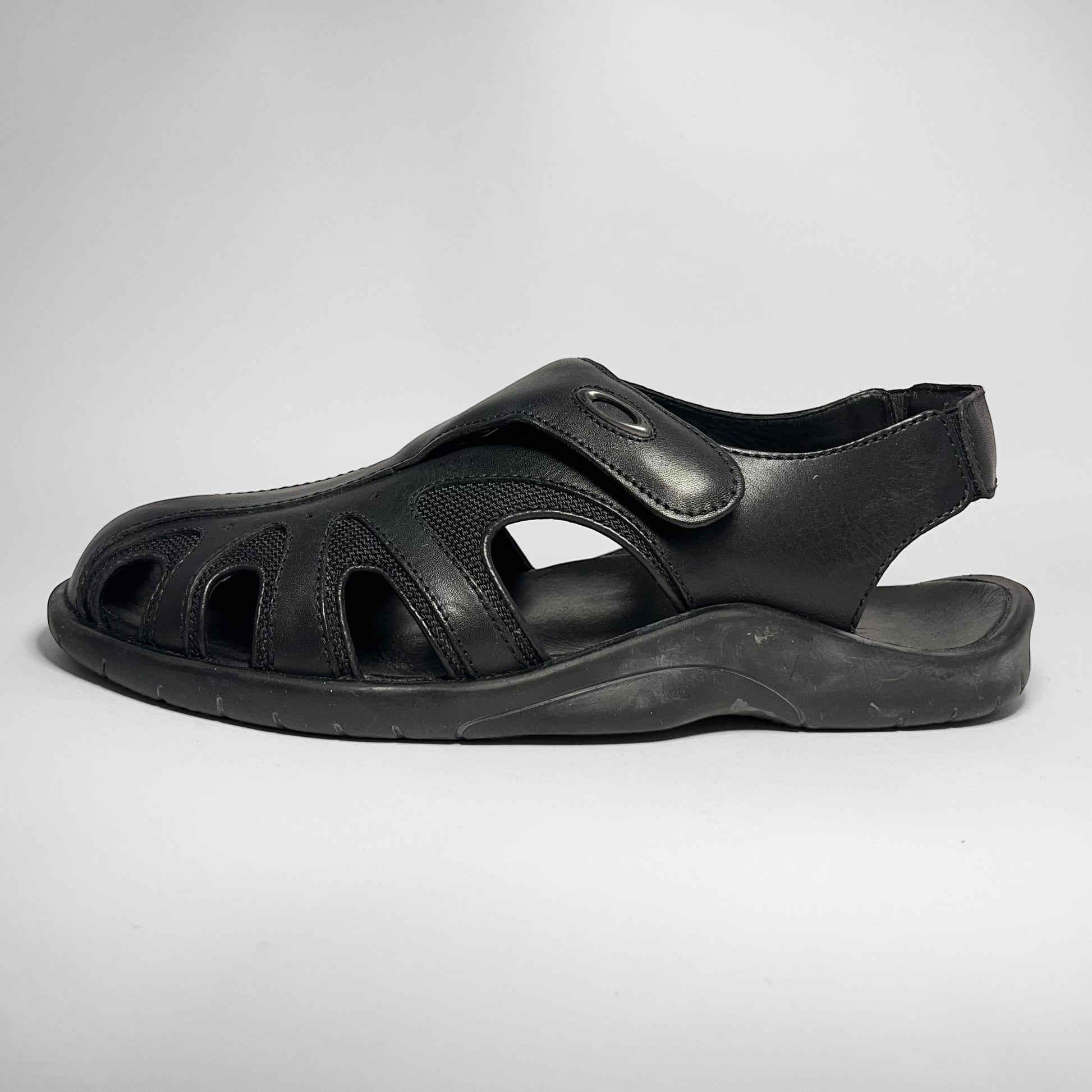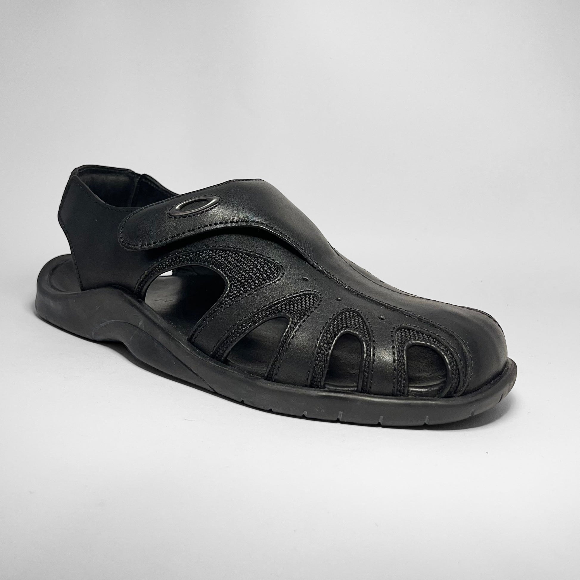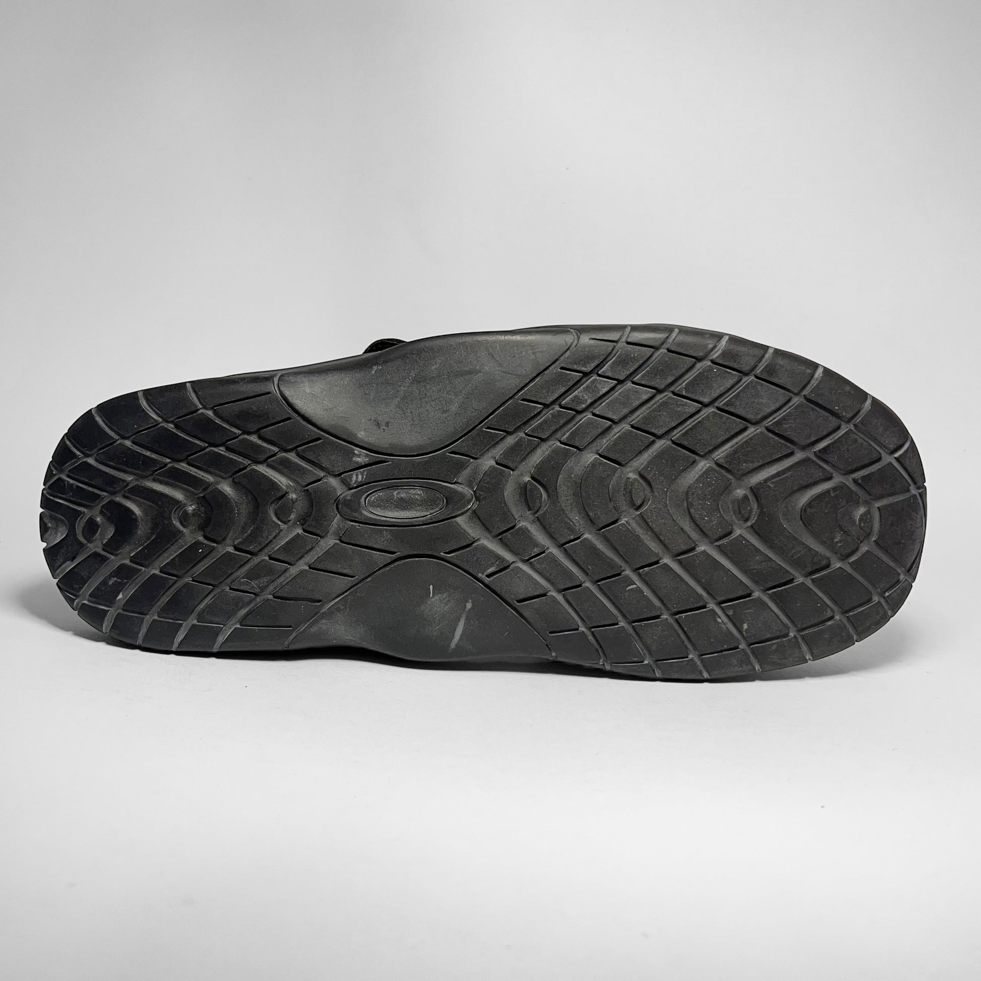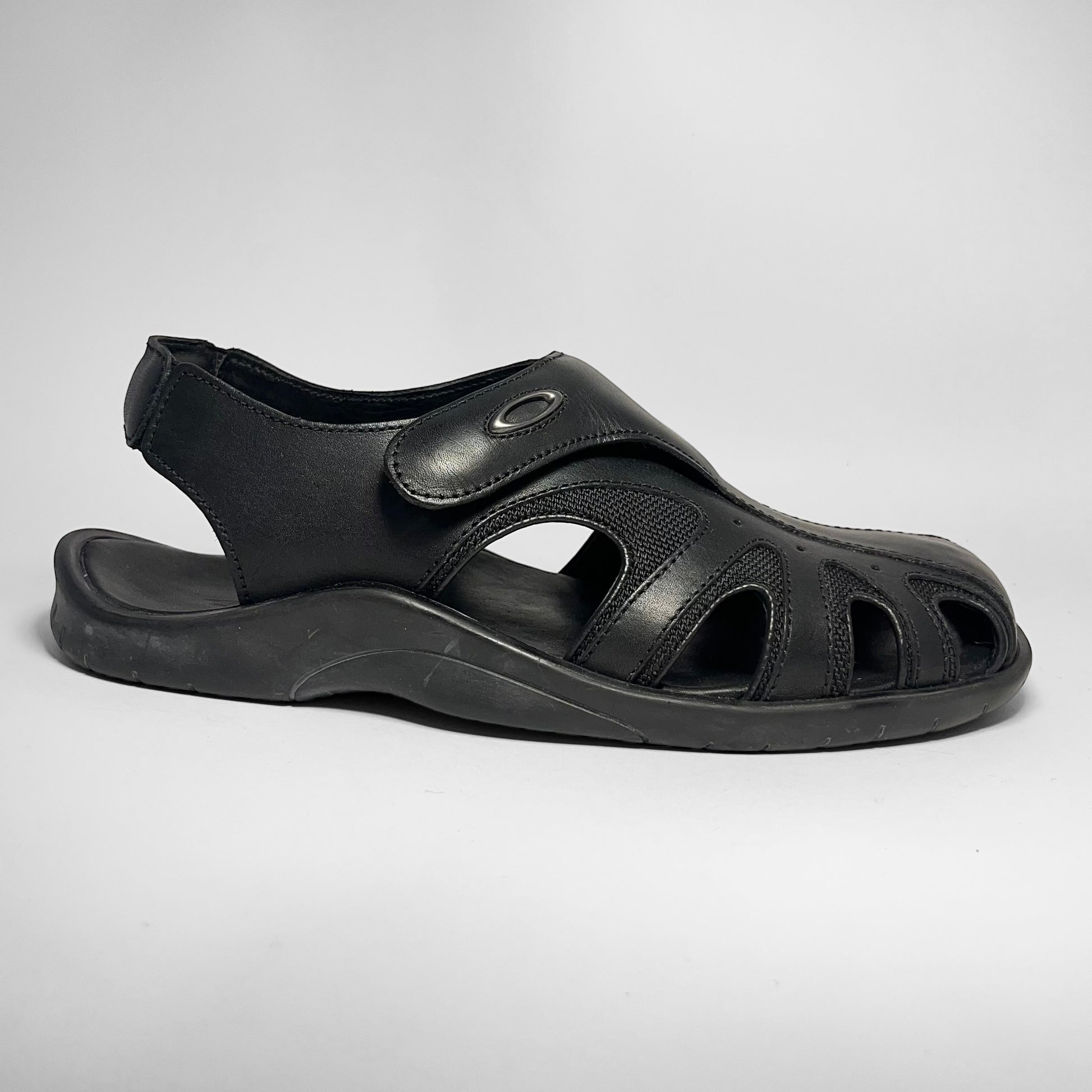 Dual layered leather uppers with perforated details, woven nylon underlay, oval openings for ventilation, metal Oakley branding, press-snap button fastening, leather footbed and ‘sock’-liner.