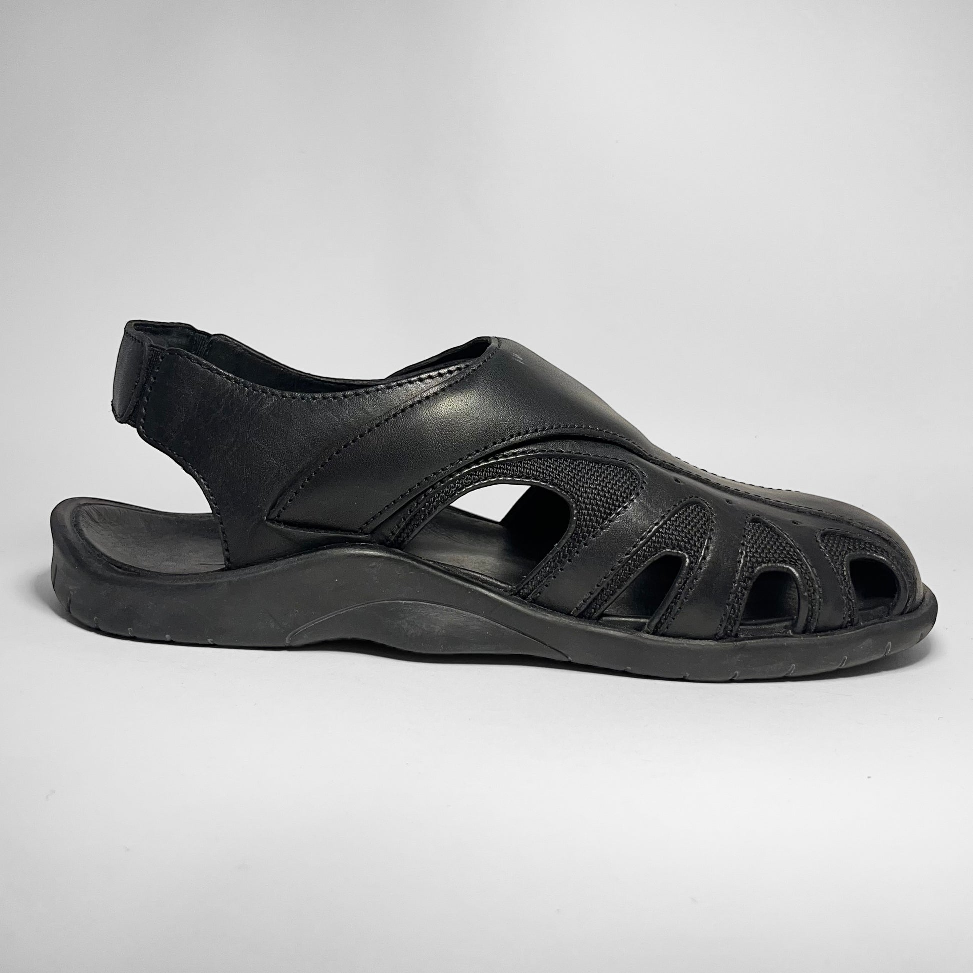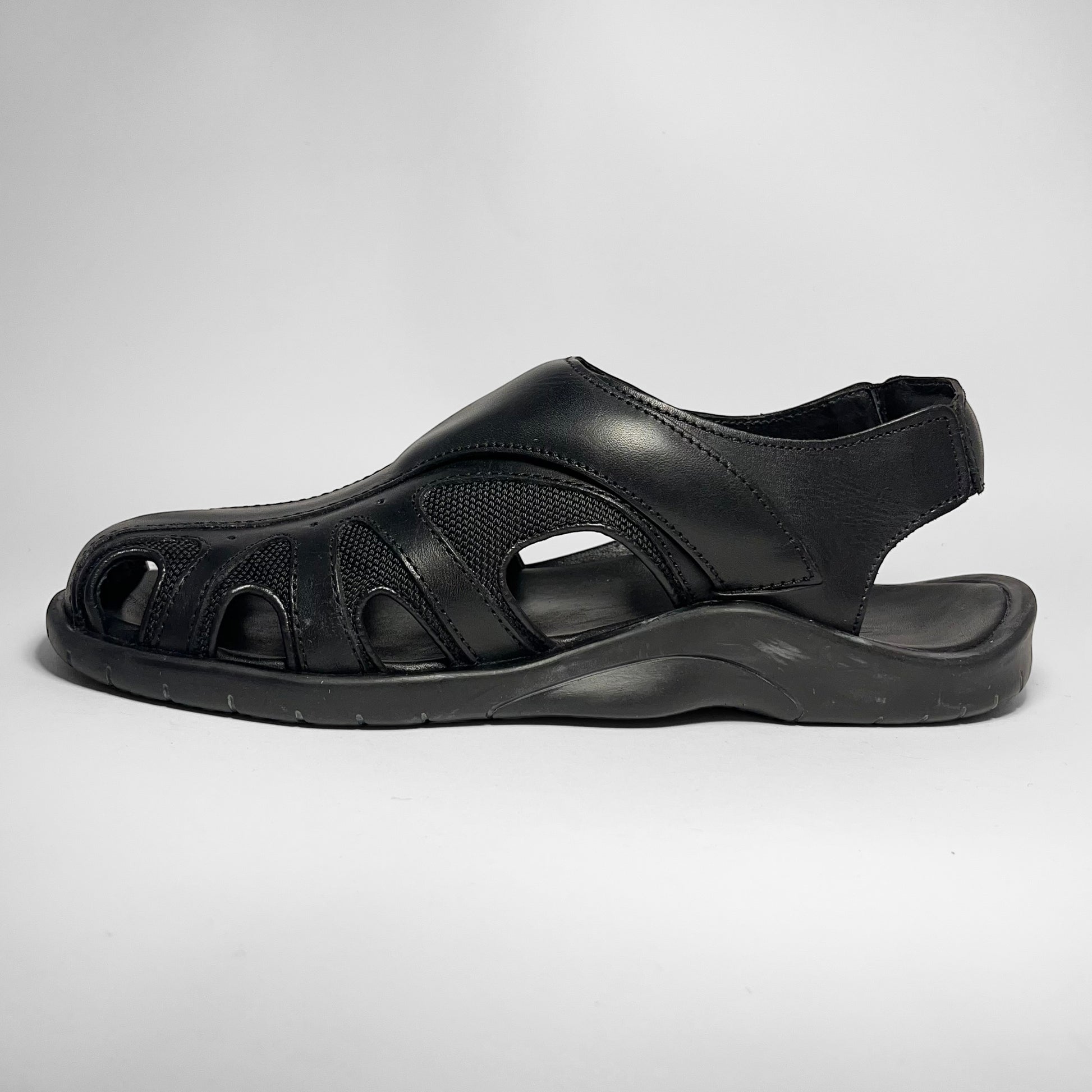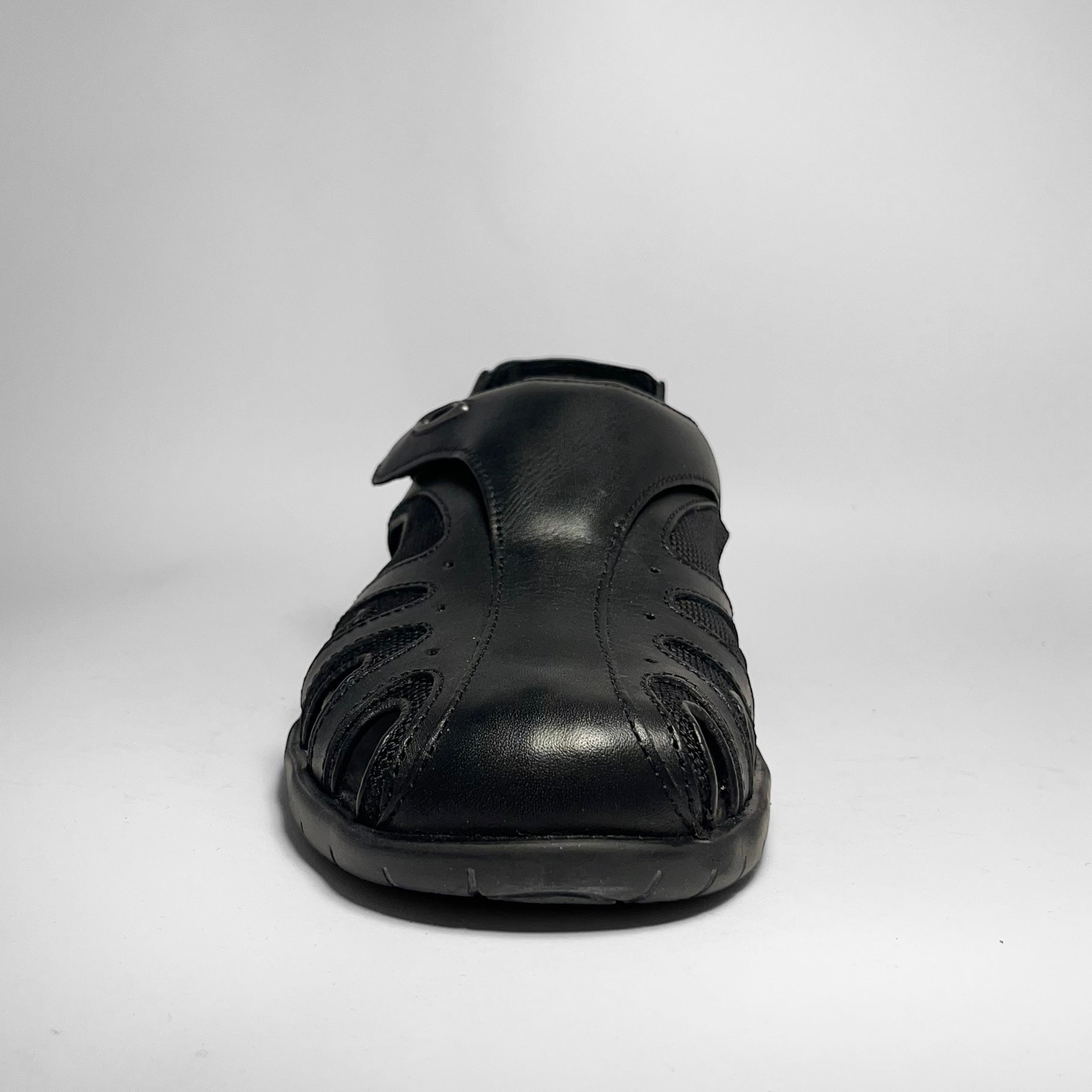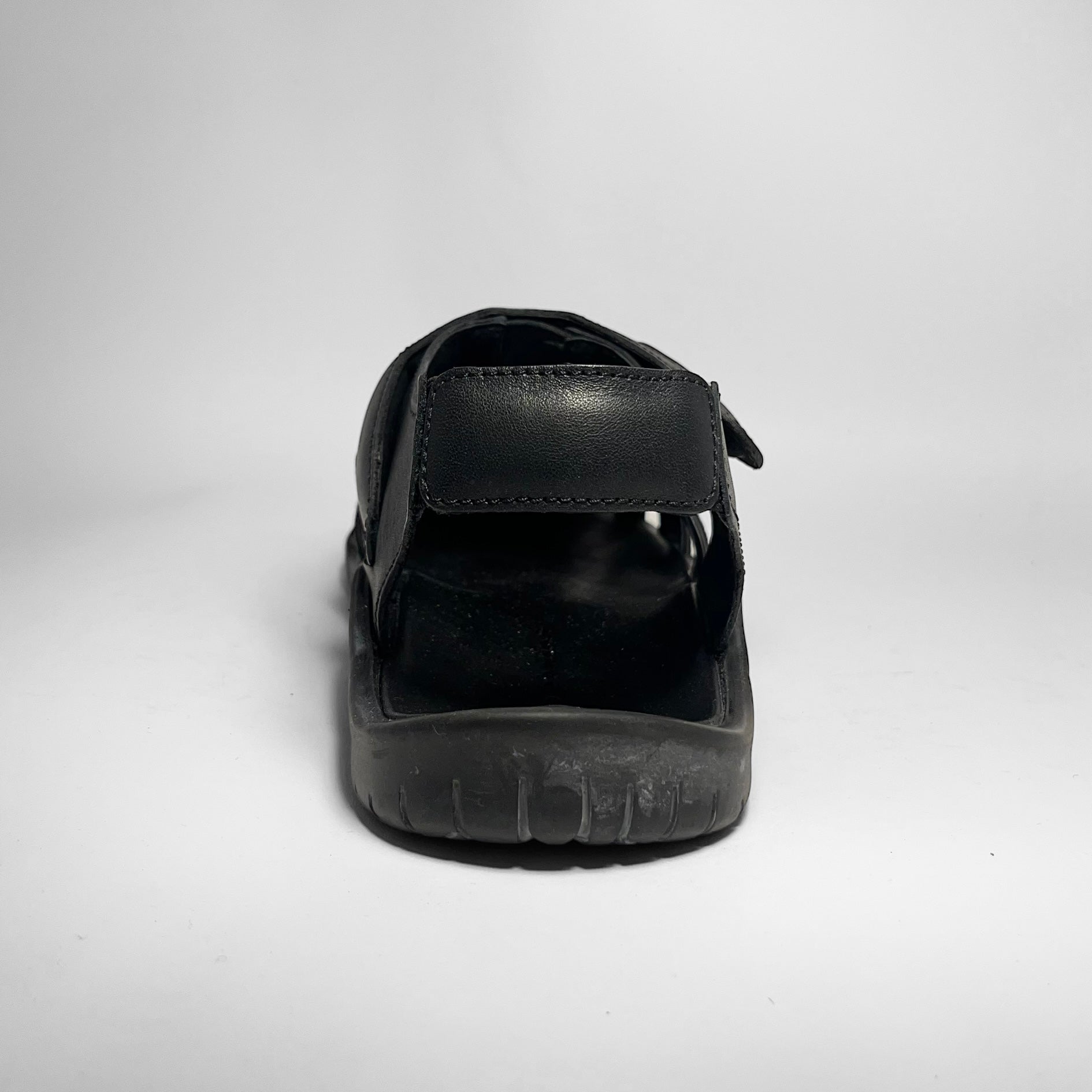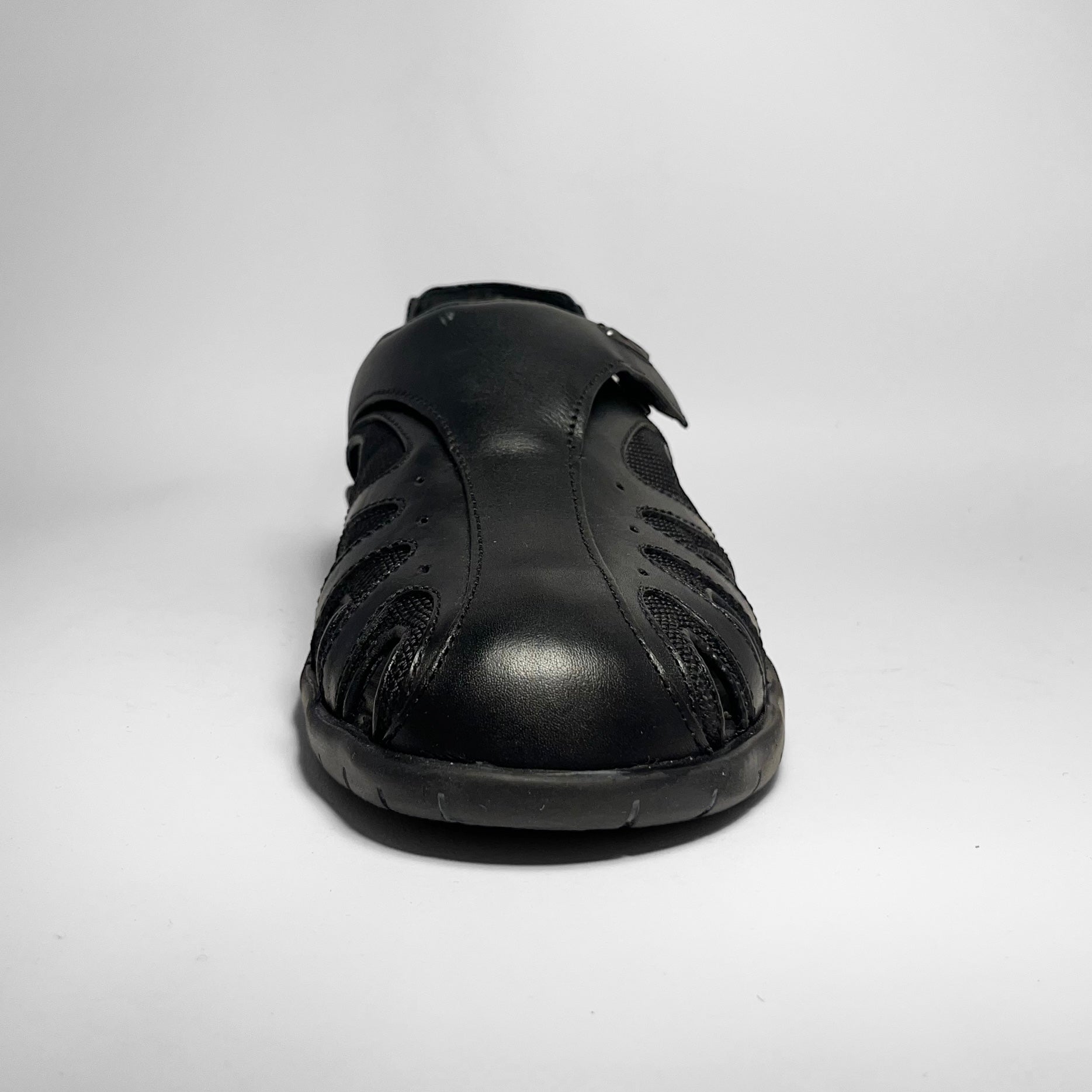 Dual layered leather uppers with perforated details, woven nylon underlay, oval openings for ventilation, metal Oakley branding, press-snap button fastening, leather footbed and ‘sock’-liner.
