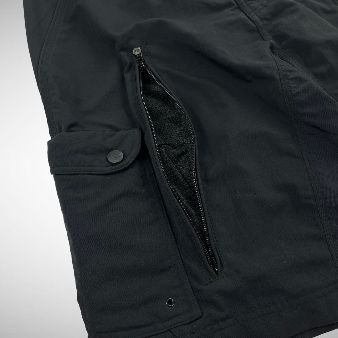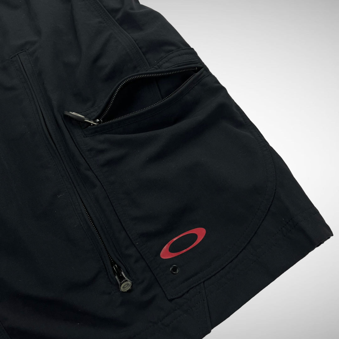 Tactical zip-cargo pockets and mesh-lined ventilation zips, double slide entry pockets, red printed skull and Oakley emblem seen on front, waist adjustable with elastic rope-button system at back and front closure size-adjustable with press-buttons and branded opening-tab, upper-back panel features a ballistic nylon panel with skull print.
