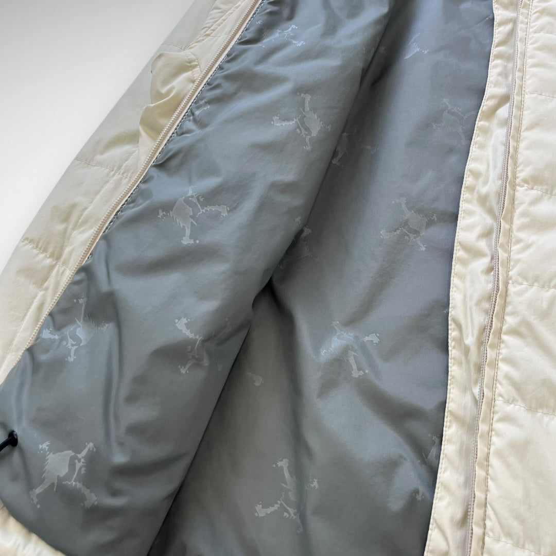 Wavy pattern stitching throughout on this lightly padded jacket which is usually a liner-jacket. Features a no seam collar, integrated velcro strap adjustable cuffs, double zip pockets, rubber branded emblem at lower body and Skull printed lining.