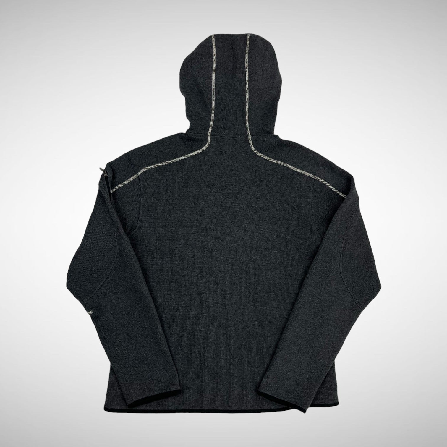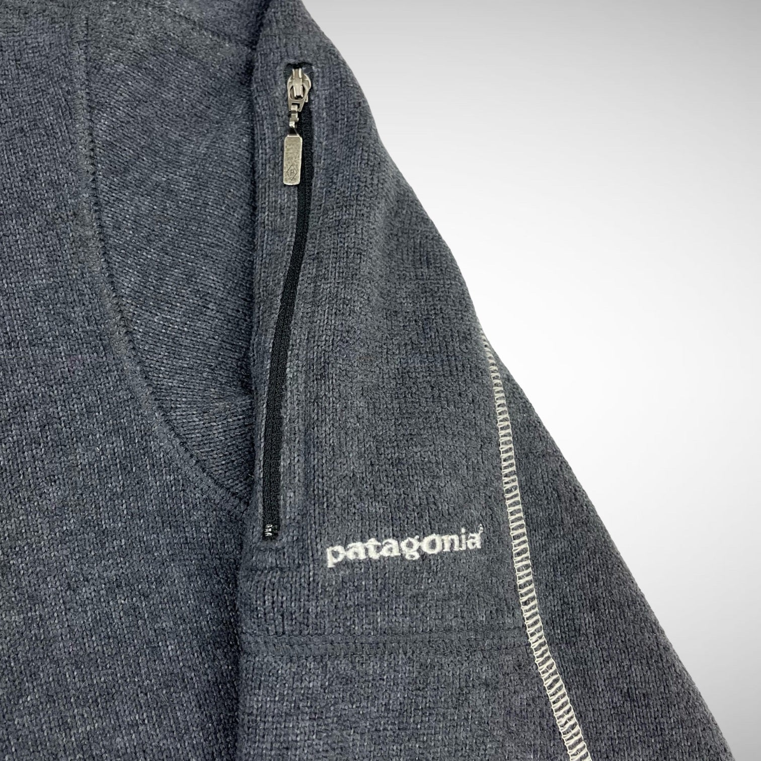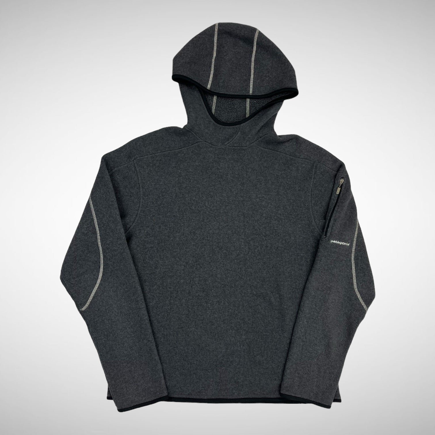 Condition is great. Grey fleece with high-collar hoody, arm zip-pocket, Patagonia embroidered spell-out and white stitching details from hood to upper arm.