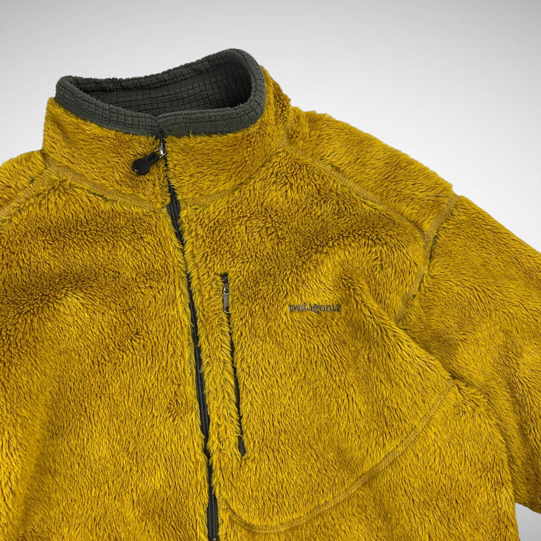 Condition is like new. Made in USA, yellow teddy with structured fleeced rims at collar, embroidered Patagonia script on chest and R outlined logo on lower left arm.