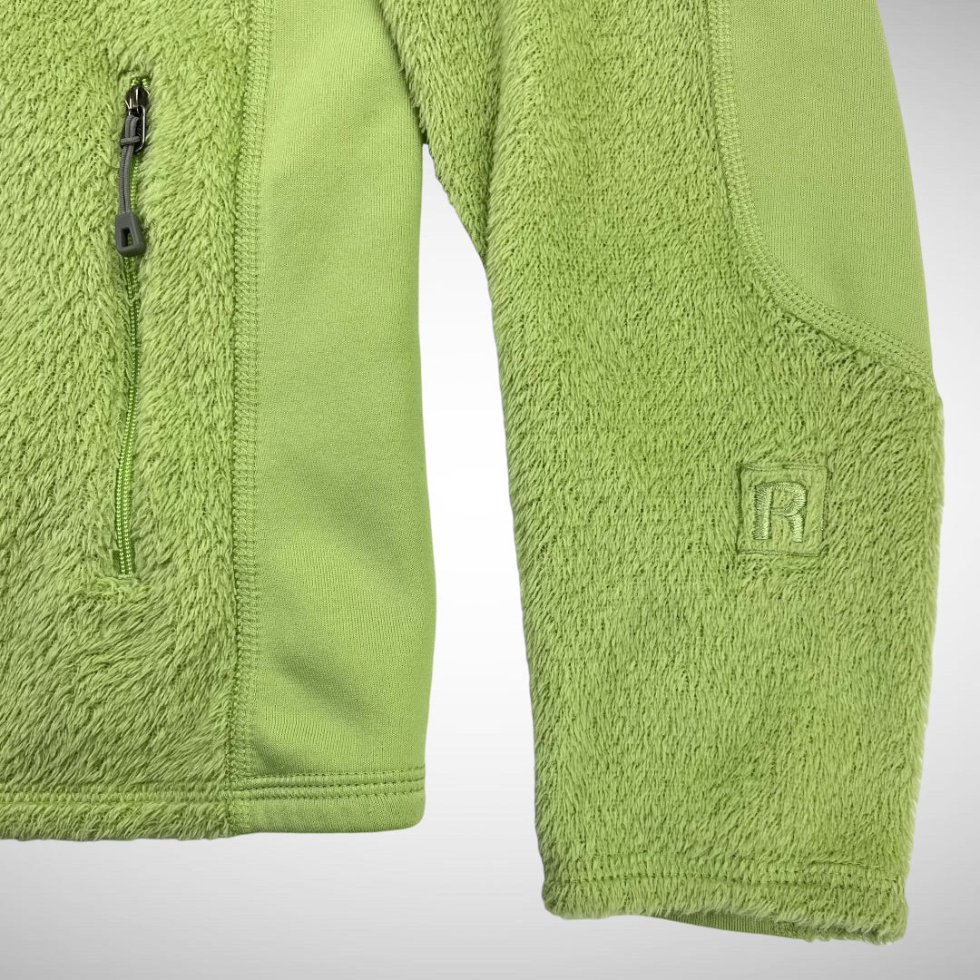 Fleece jacket in bright green with technical seams and panels on the elbows, arms and mid-section for breathability and flexibility , double zip pockets and R embroidery on sleeve.