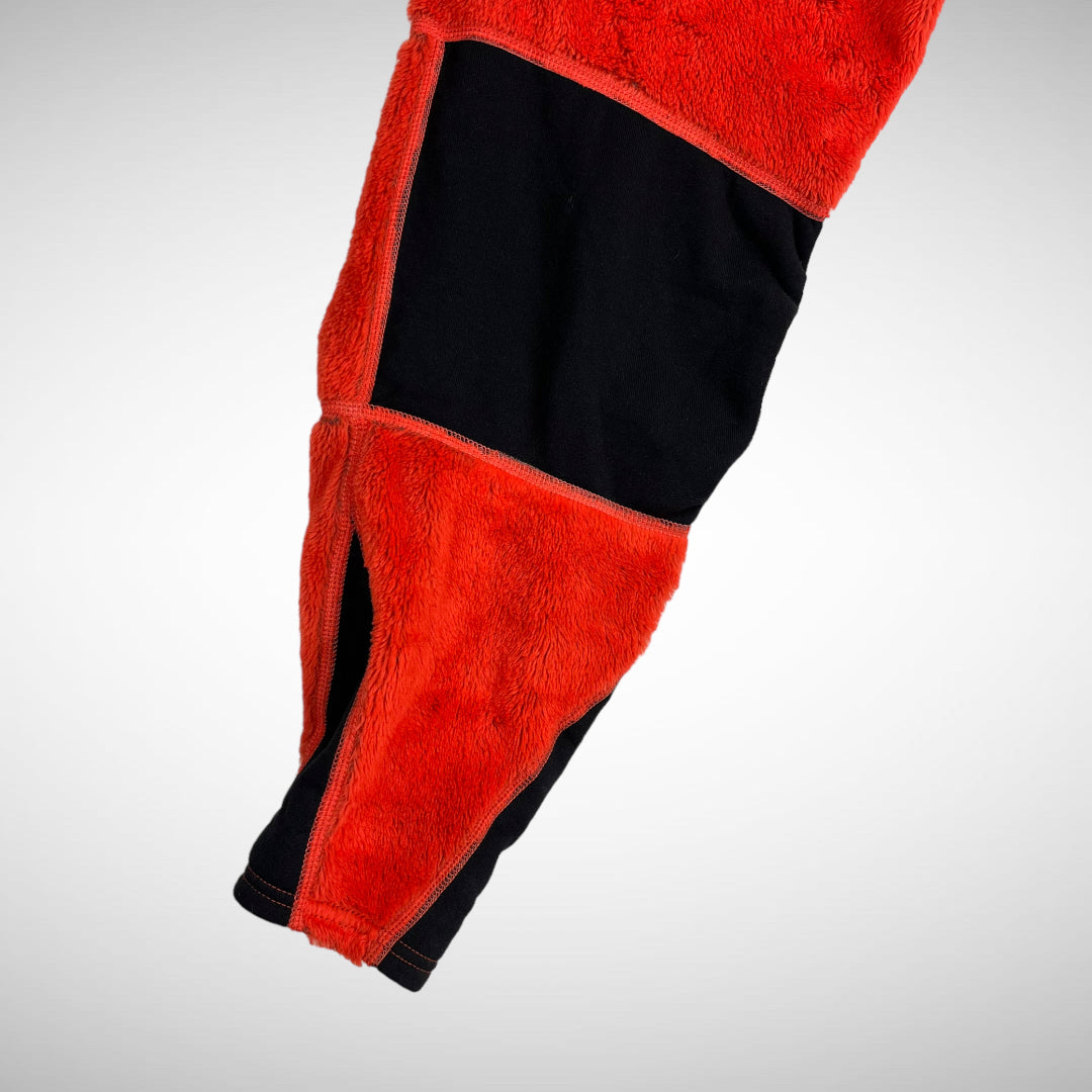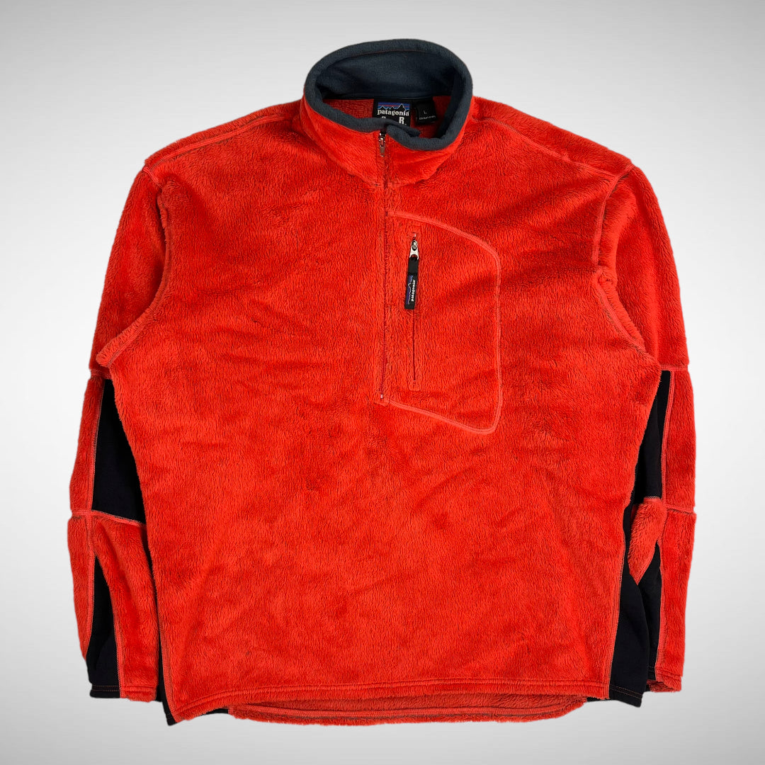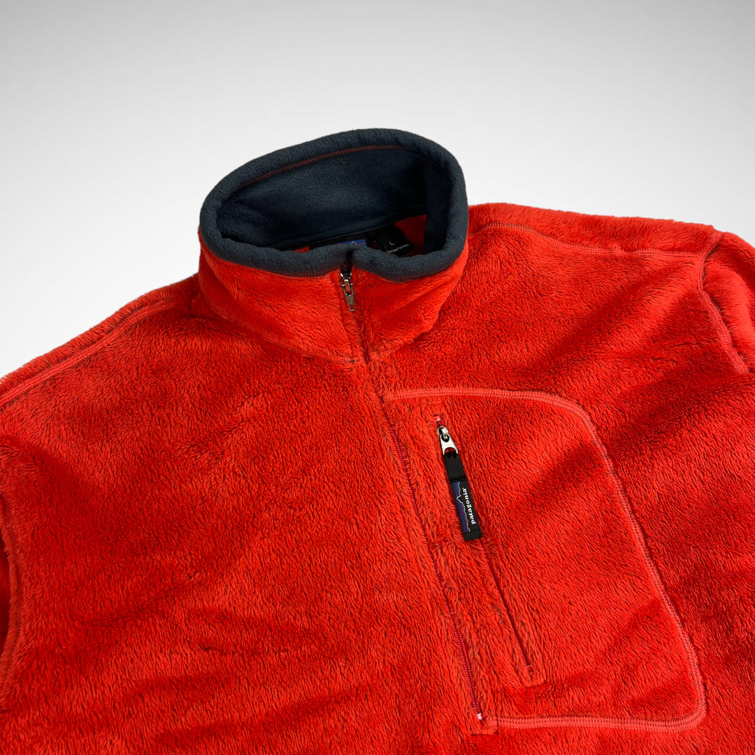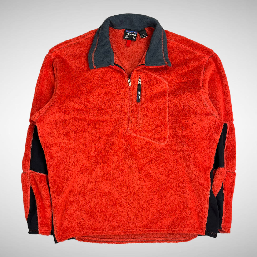 Orange high-pile body rug pullover with tag-branded vertical-zip chest pocket, 1/4 zip collar, neoprene flexible panels at cuffs, elbows and sides, and Patagonia neck-tag. From the R-series, which stands for Regulator, ensuring your body stays warm in colder days.
