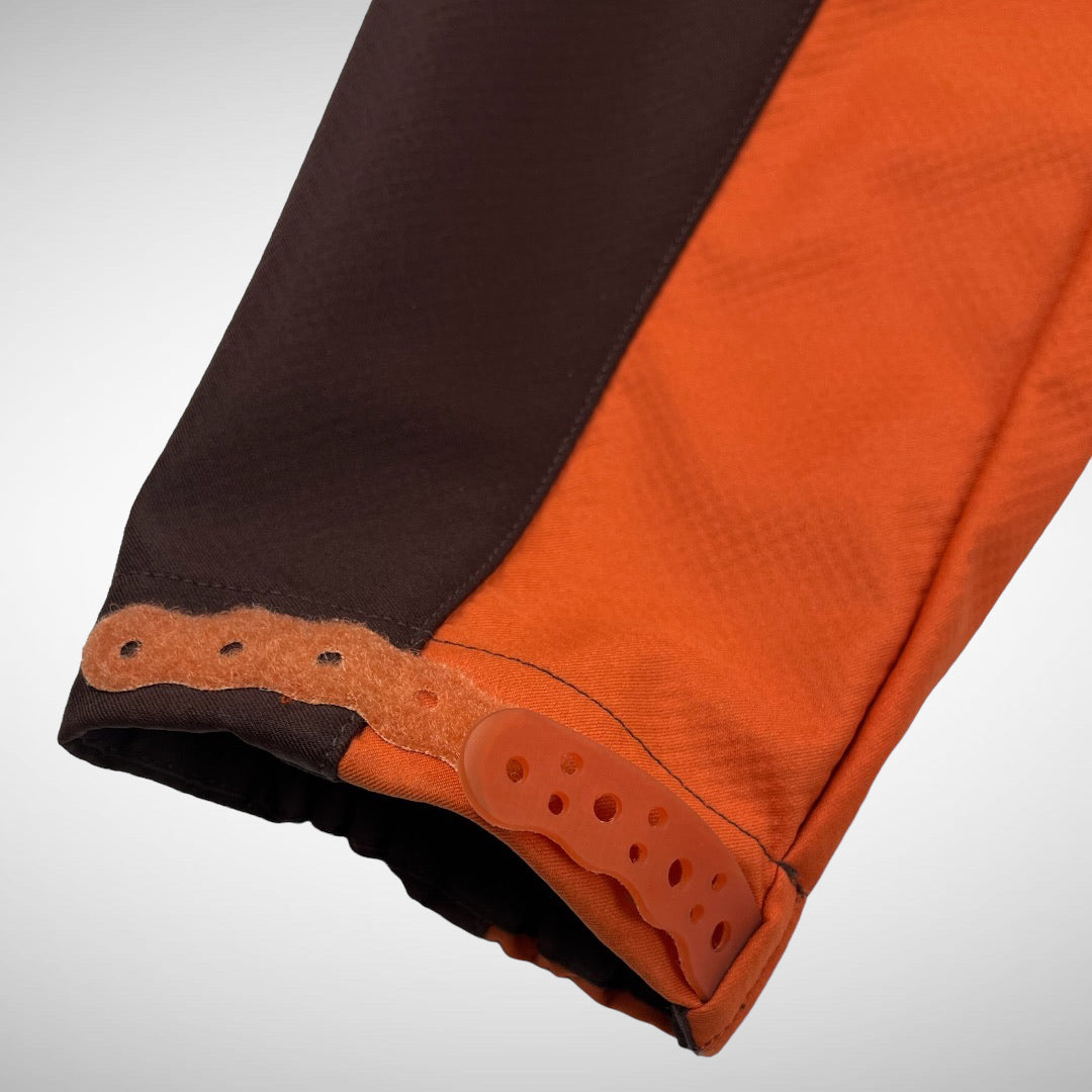 Wavy patterned brown and orange softshell from the R-line with velcro closure cuffs, adjustable hood, two front pockets and additional lower-arm zip-pocket, embroidered branding, fleeced collar and lining.