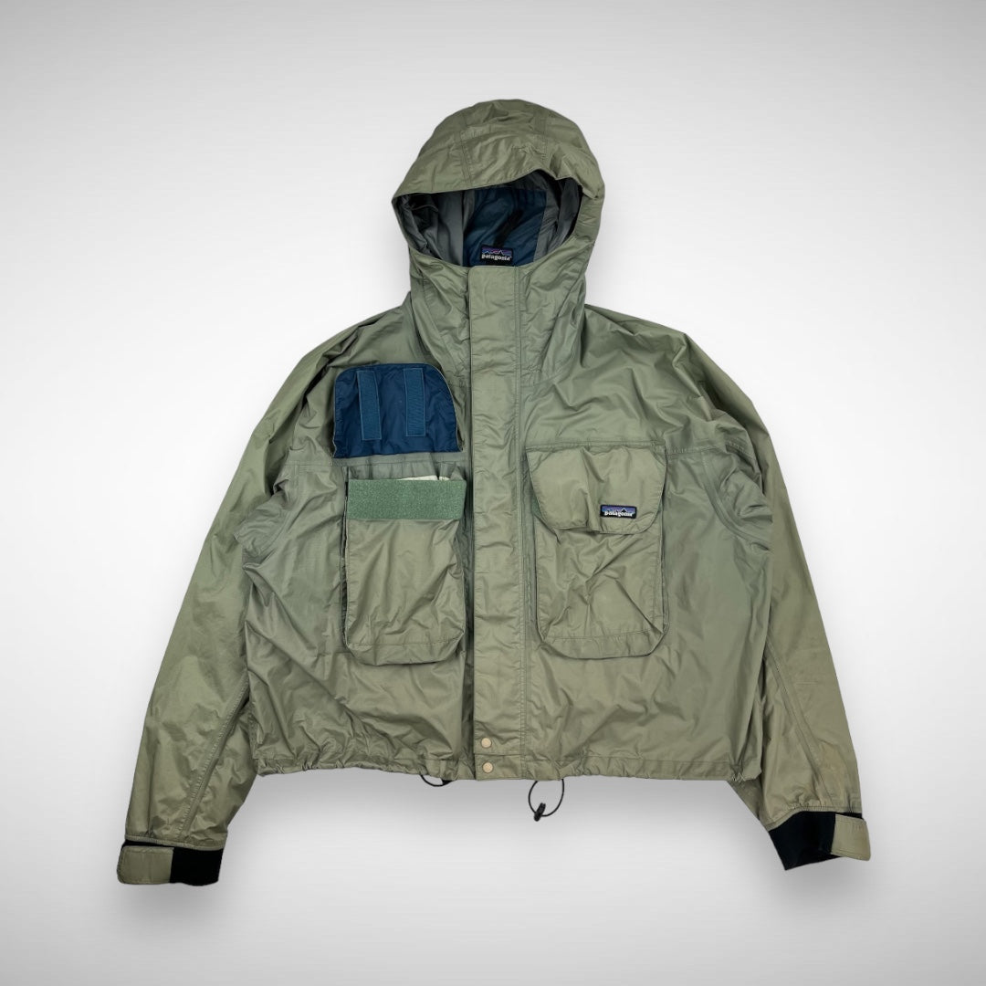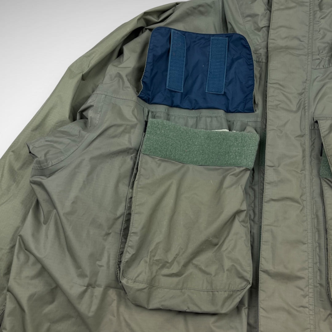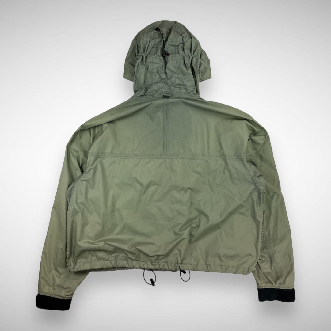 Khaki coloured outer with two velcro-flap upper-pockets, adjustable hem and hood with toggles, and velcro-closure adjustments for cuffs.