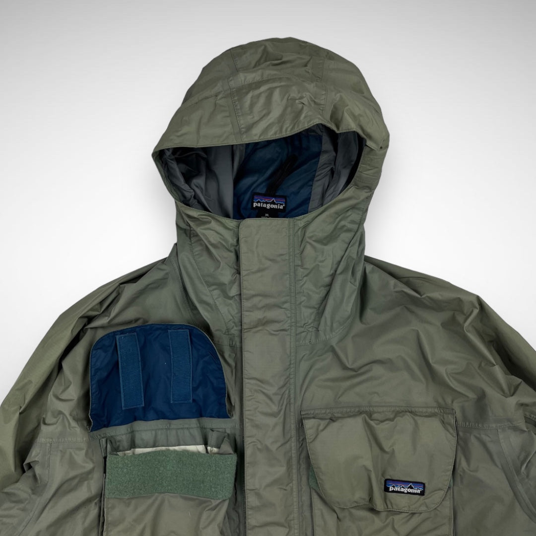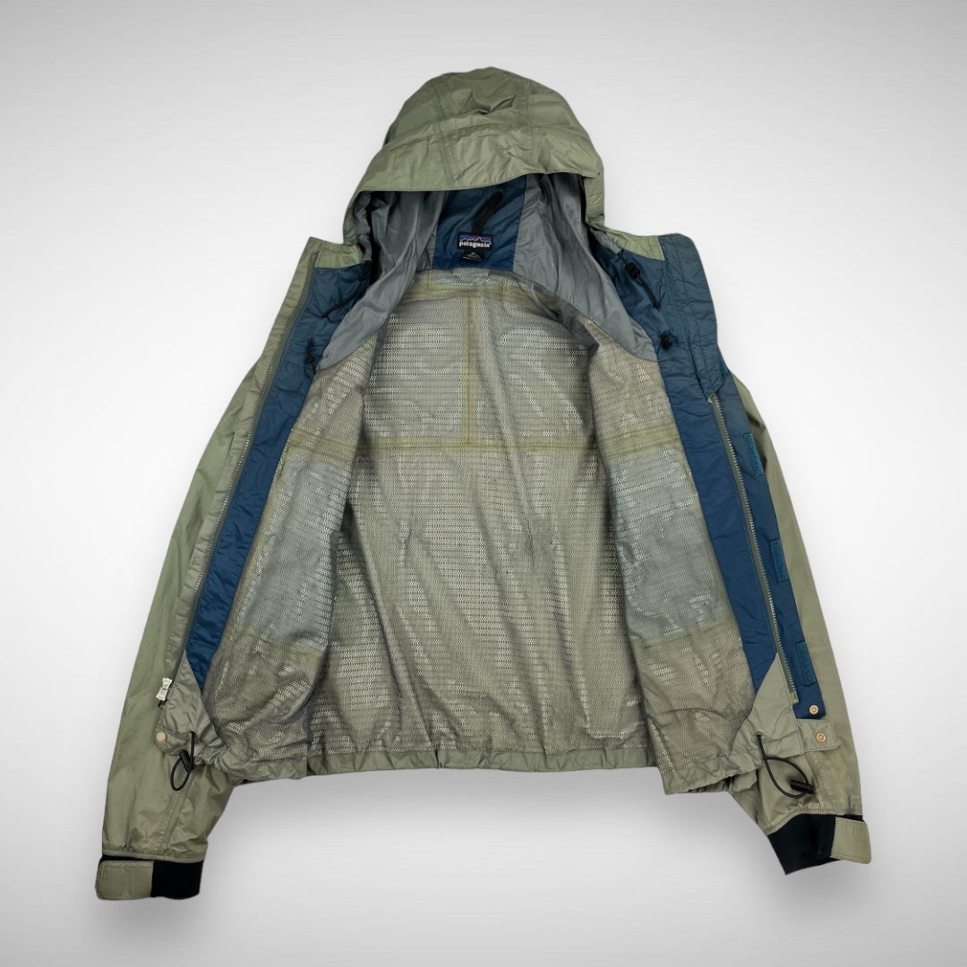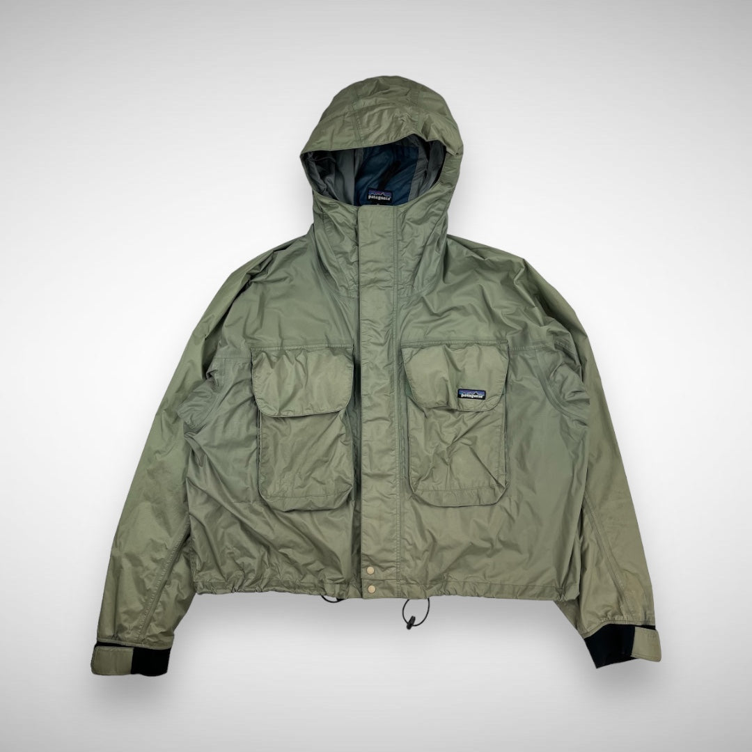 Khaki coloured outer with two velcro-flap upper-pockets, adjustable hem and hood with toggles, and velcro-closure adjustments for cuffs.