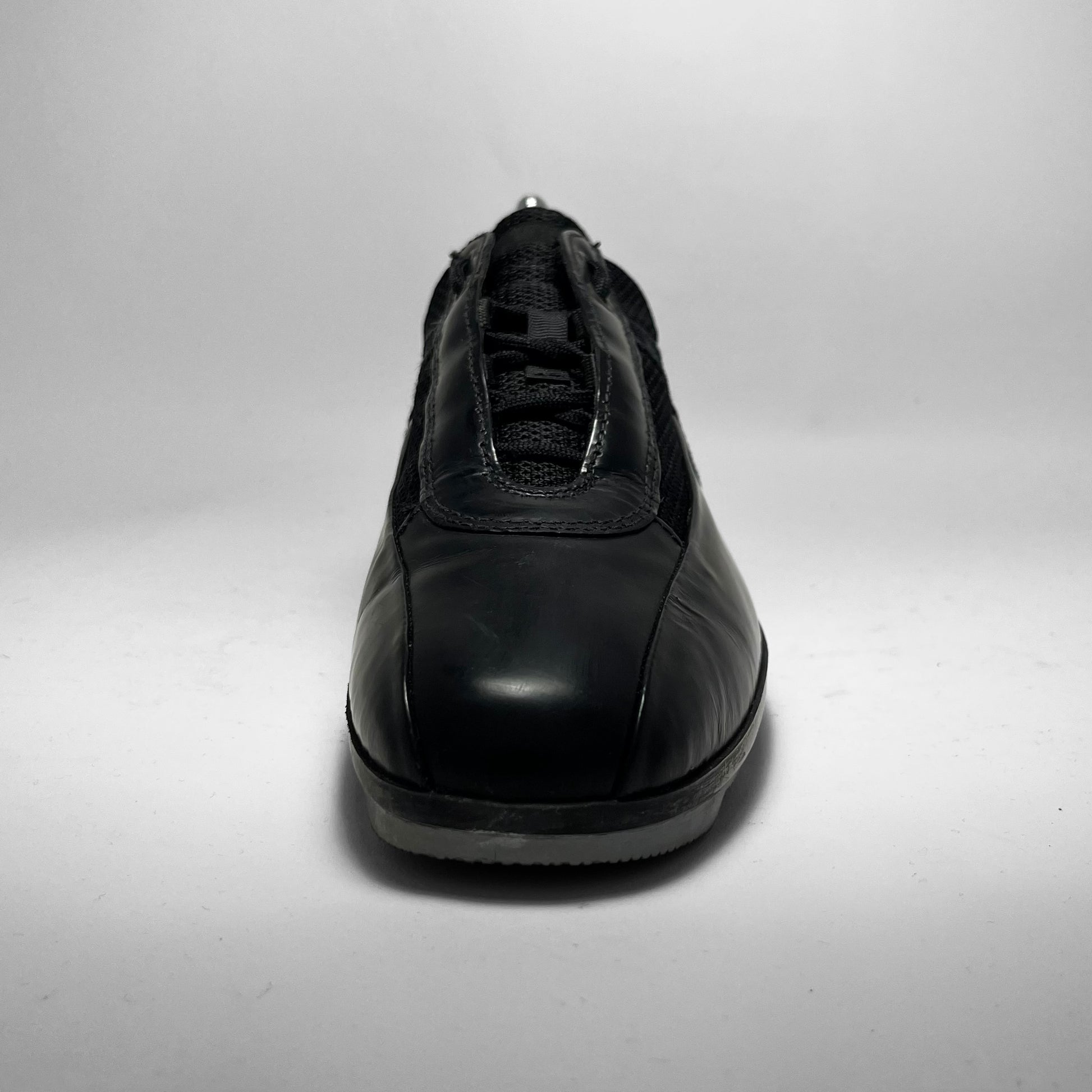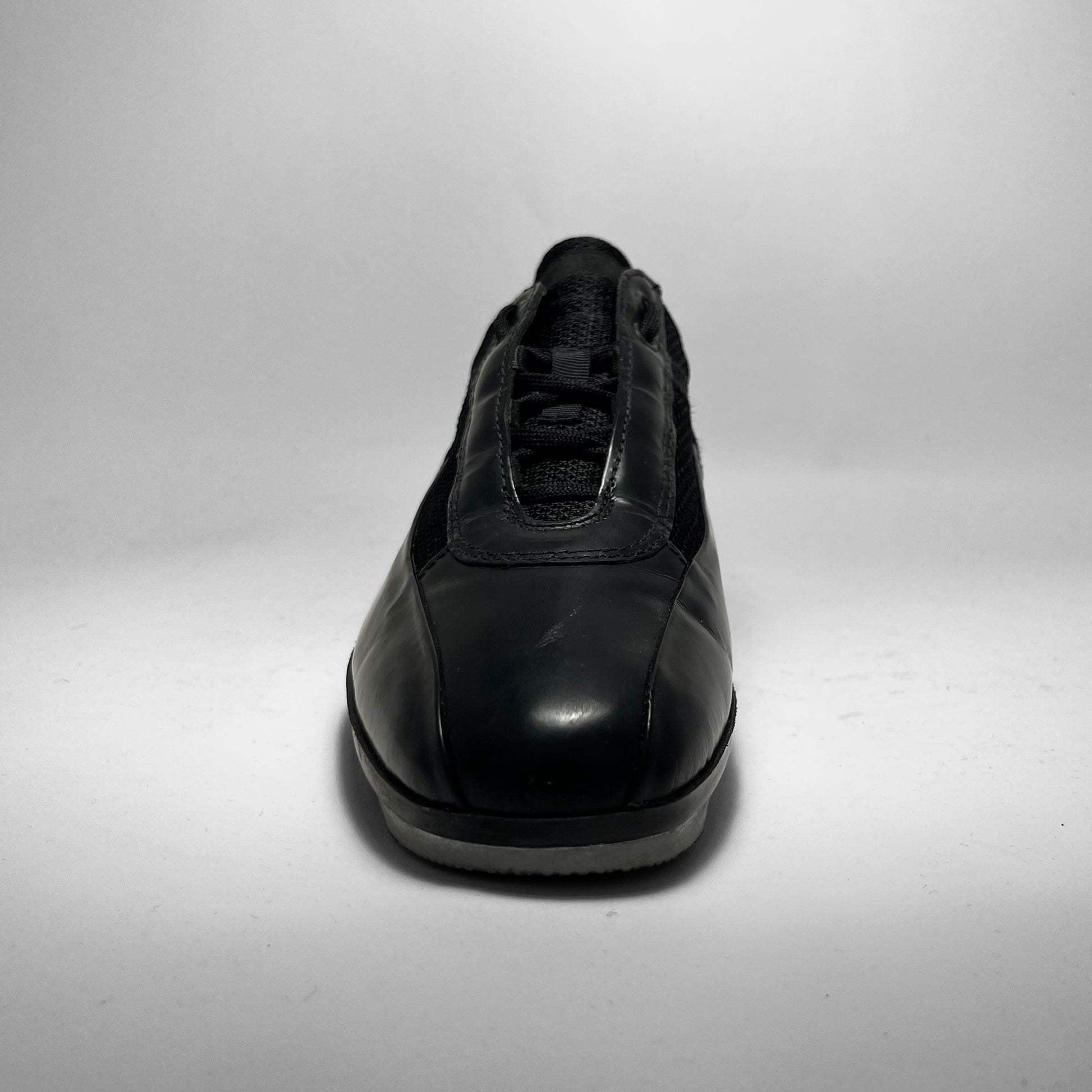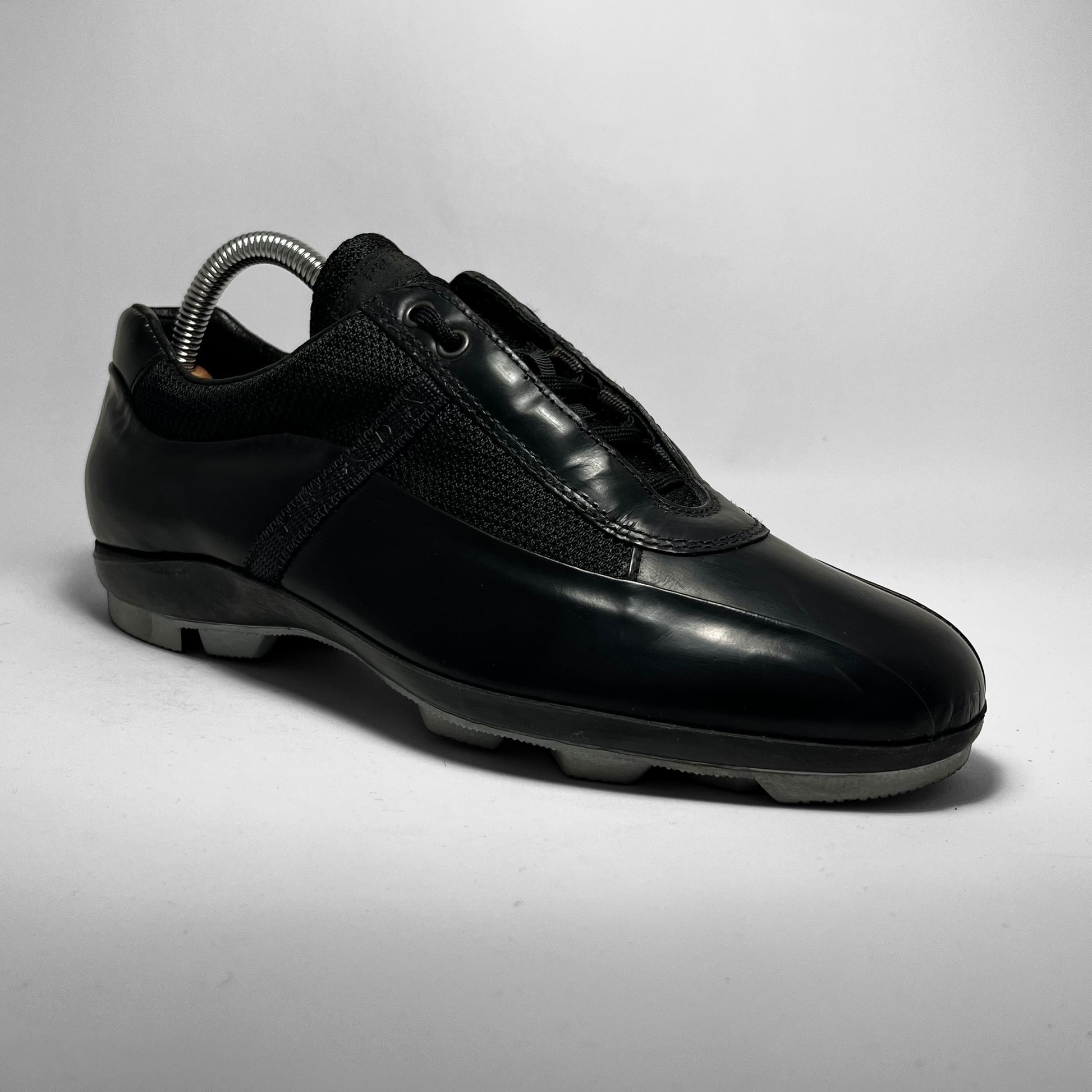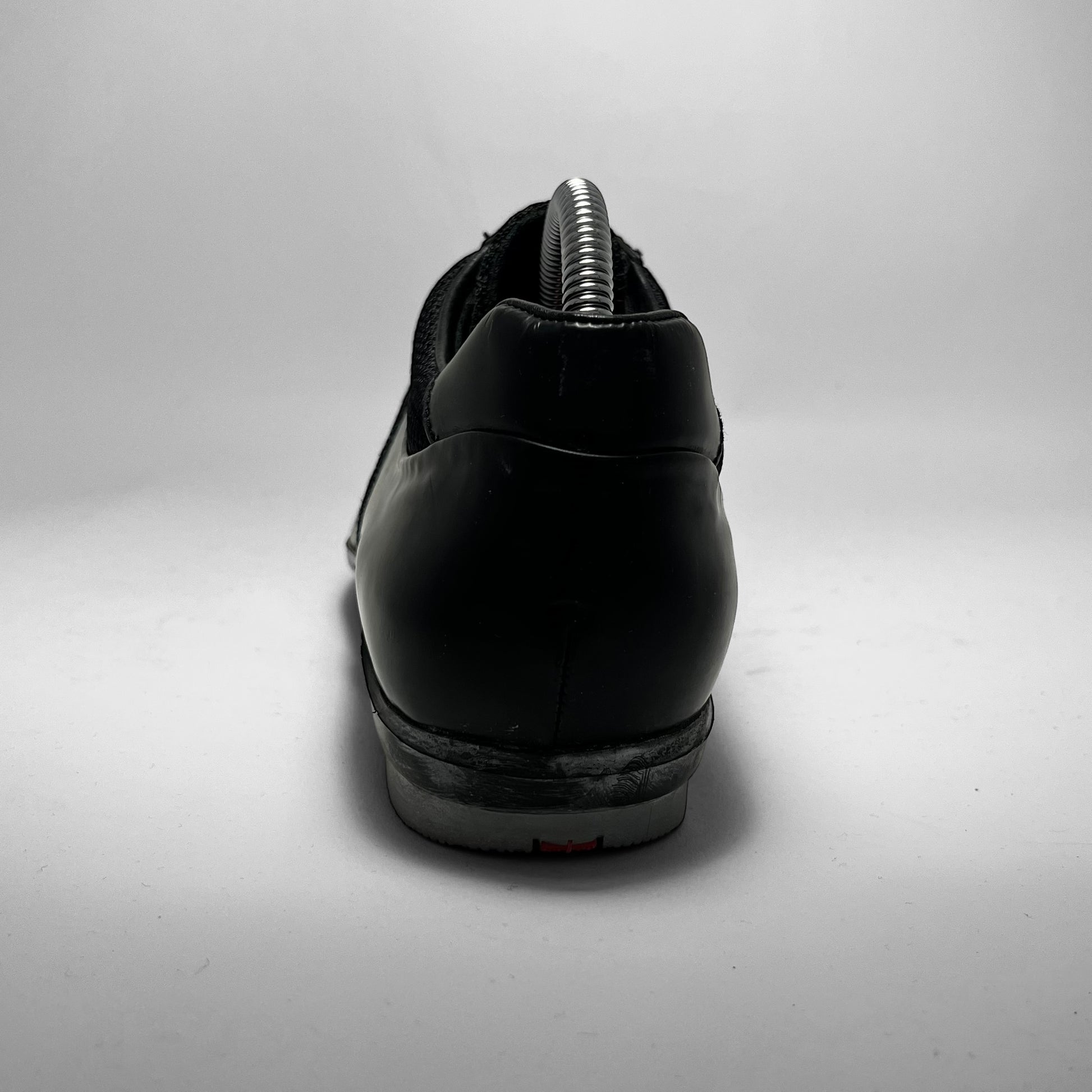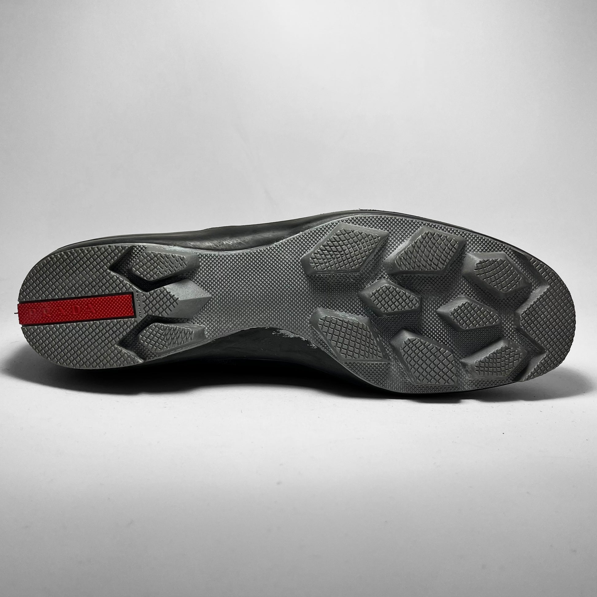 Leather upper with a mix of mesh on the sides and tongue, woven cotton strap stitched along the sides showing the Prada script, branded tag on top, red tab on outsole and football cleats inspired outsole.