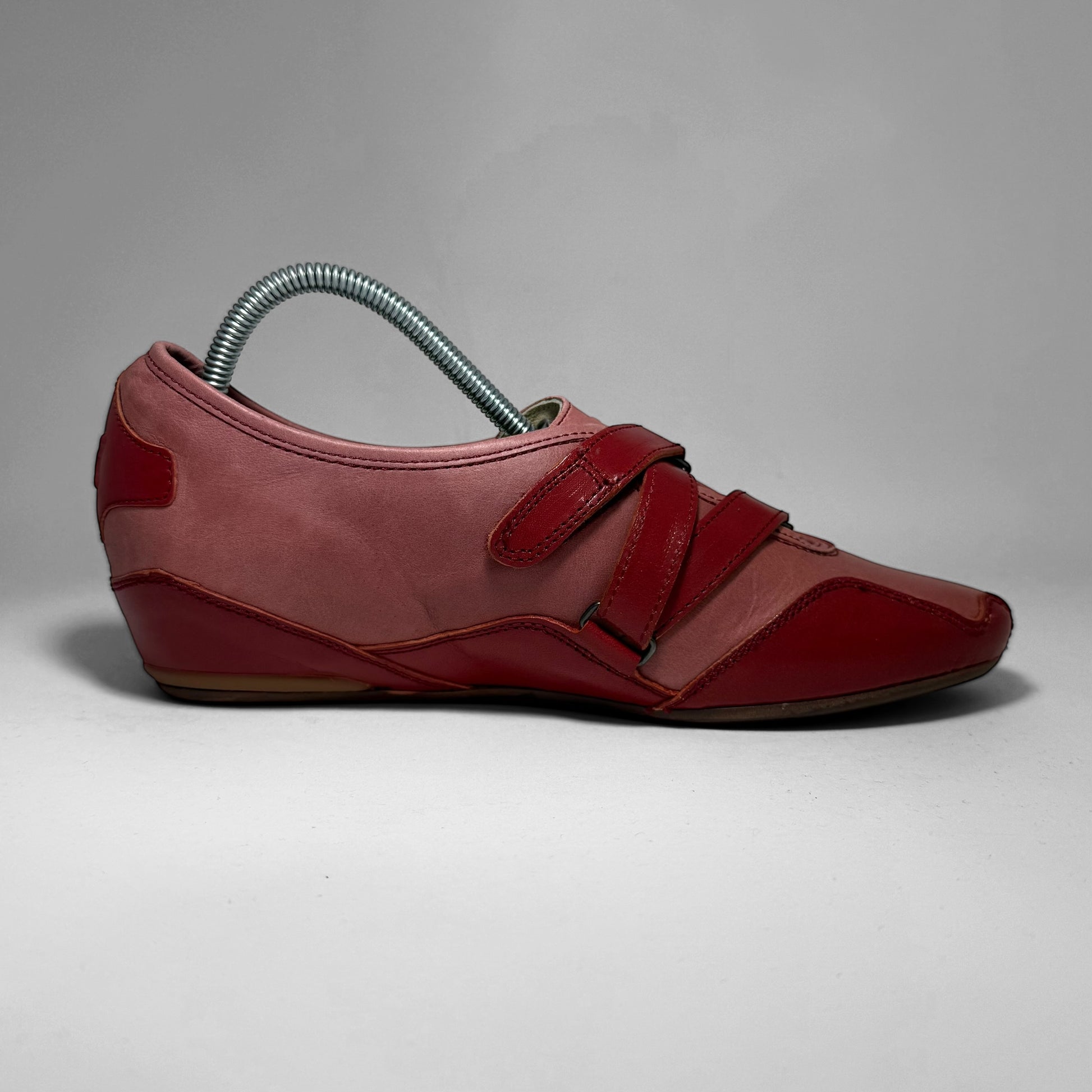 Low-profile wedged-Mostro featuring a concealed double-strap closure and angular paneling. Made in Italy with a mix of smooth and patent leather in tonal reds/pink hues. Finished with a wood-textured outsole and rubber grip pads.