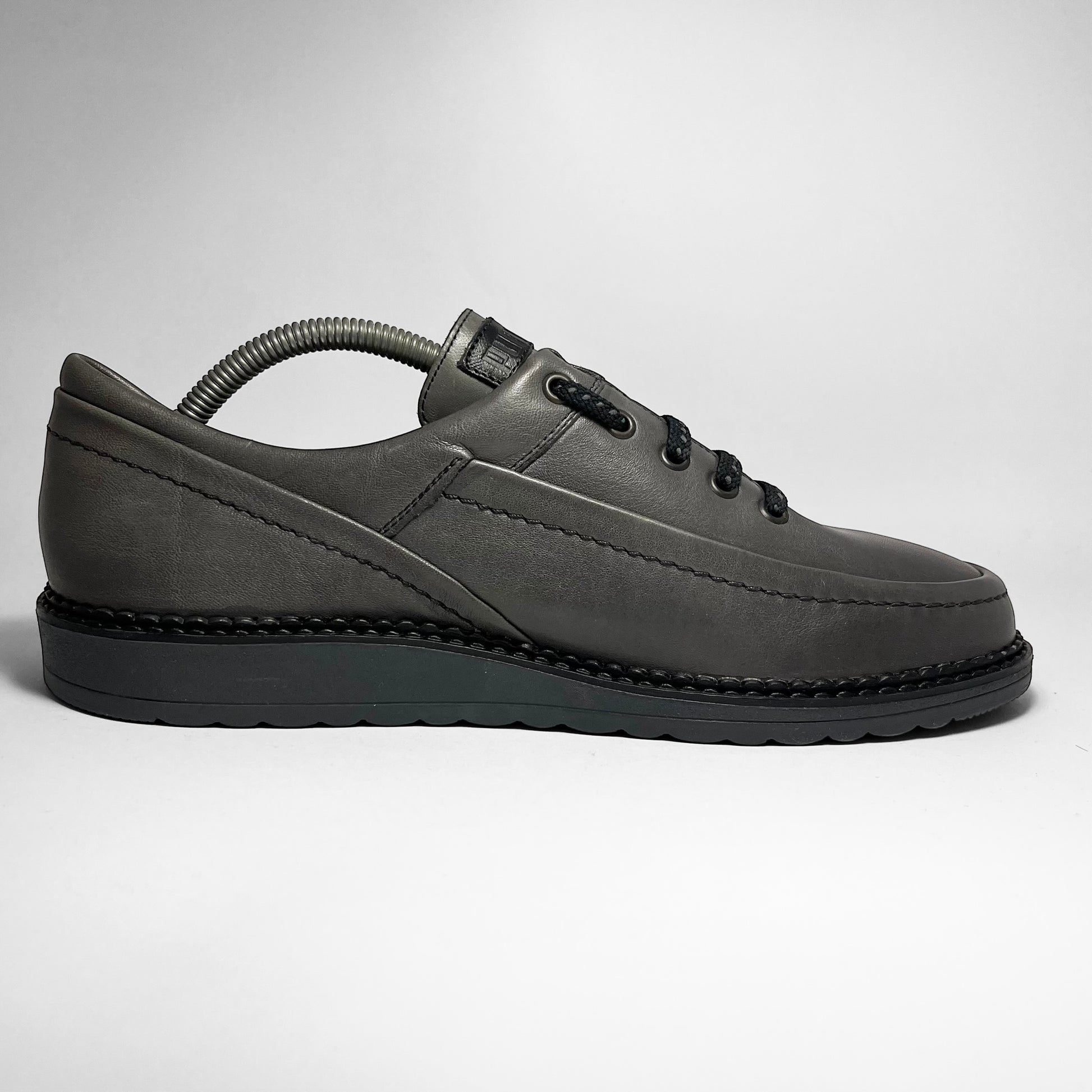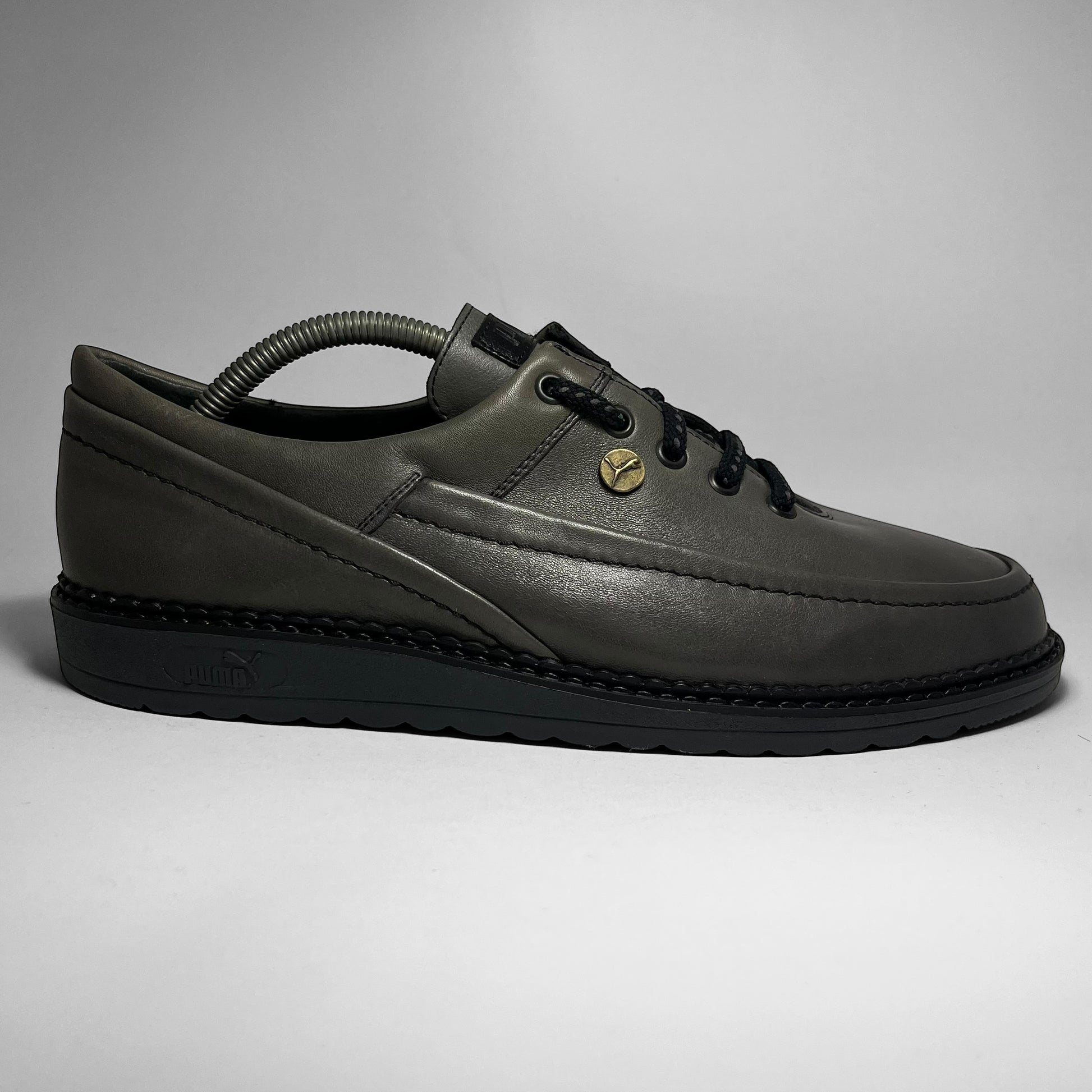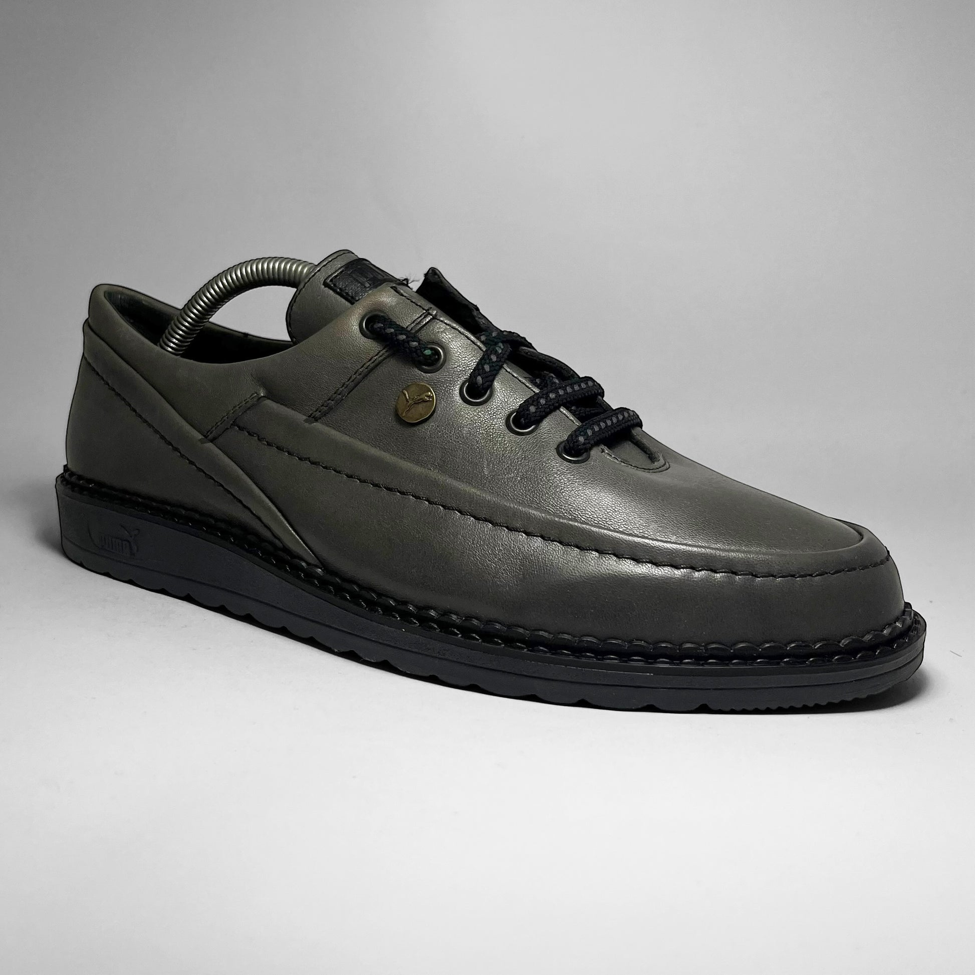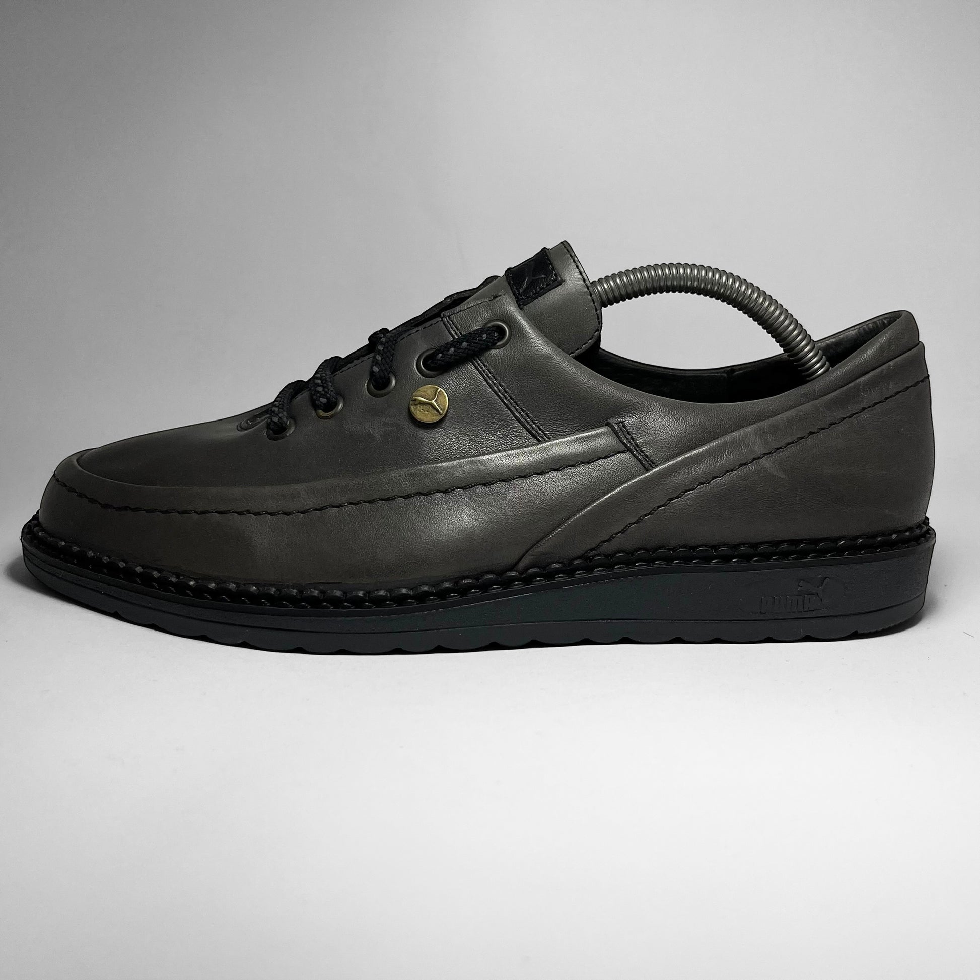Premium leather in (dark) grey, Puma stamped metal coin as branding, stitched upper and sole with beautiful decorations, matching laces.