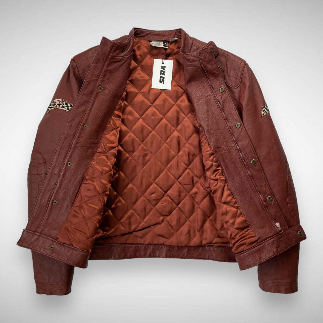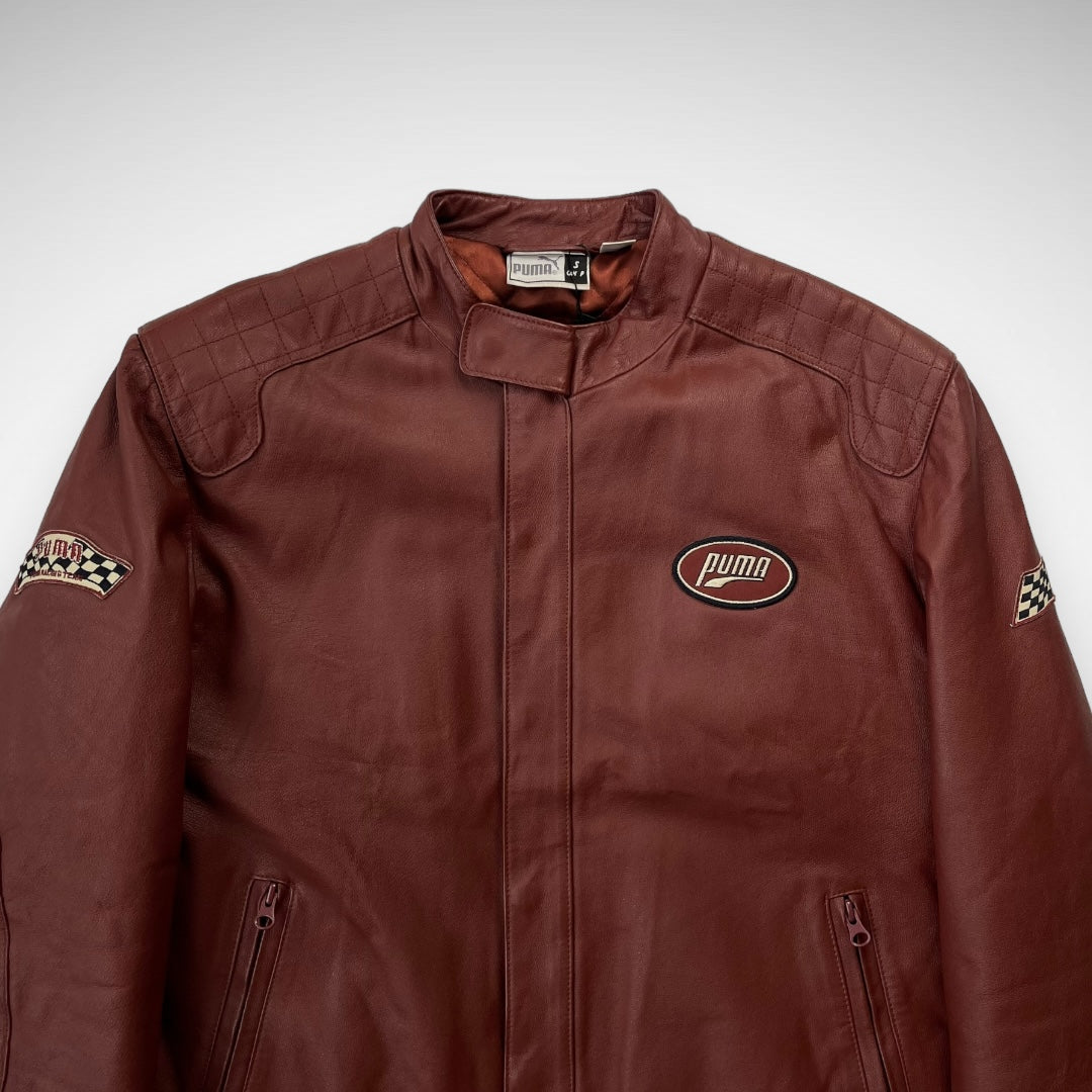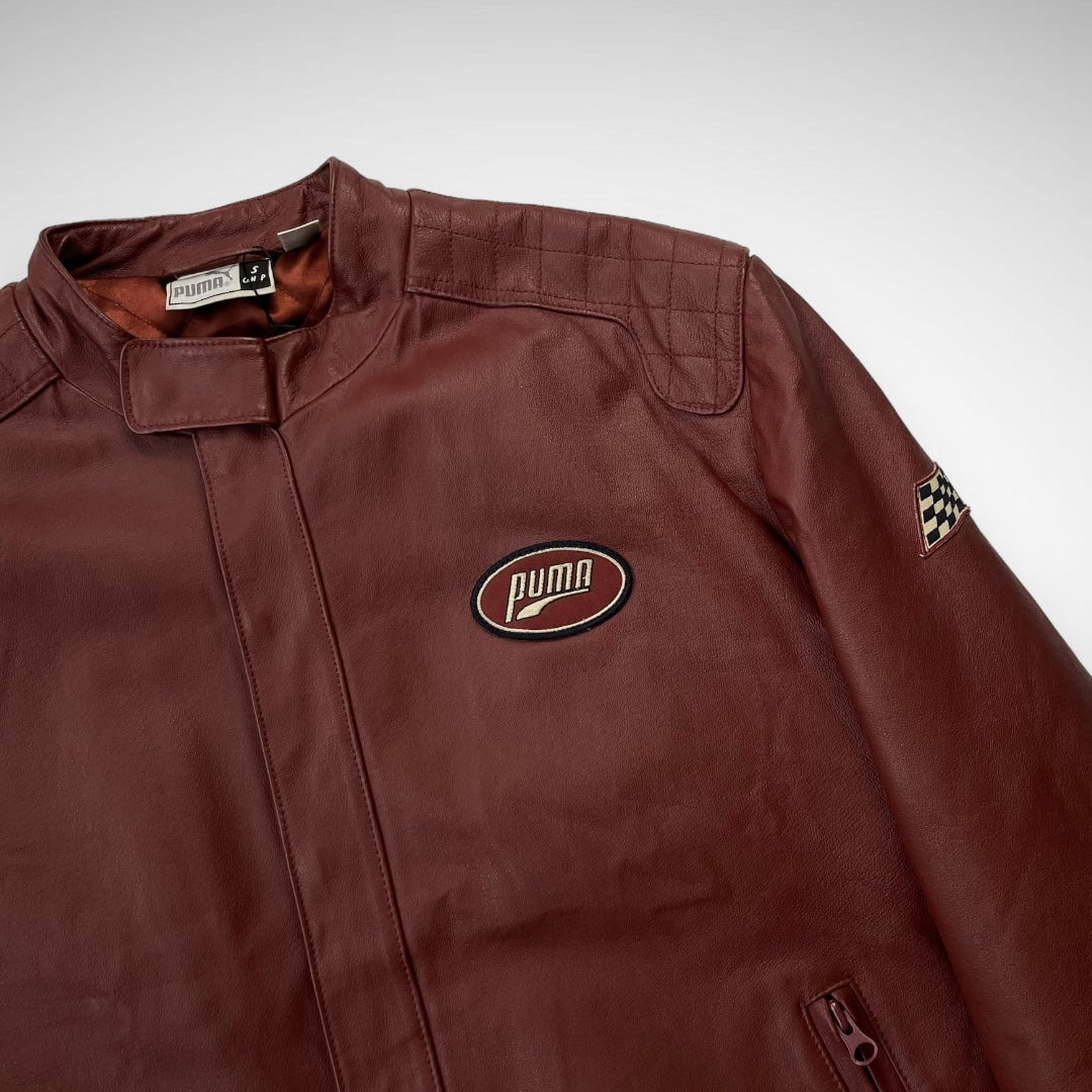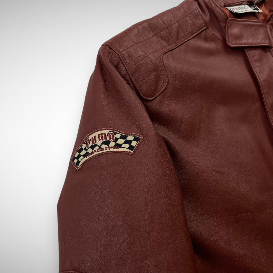 Burgundy coloured leather with grid-pattern stitched elbow and shoulder panels, Puma racing embroidered patches on both upper arms and chest, zip-expandable cuffs in cream and similar colour back expandable shoulder panels, full zip closure with snap-button fastening.