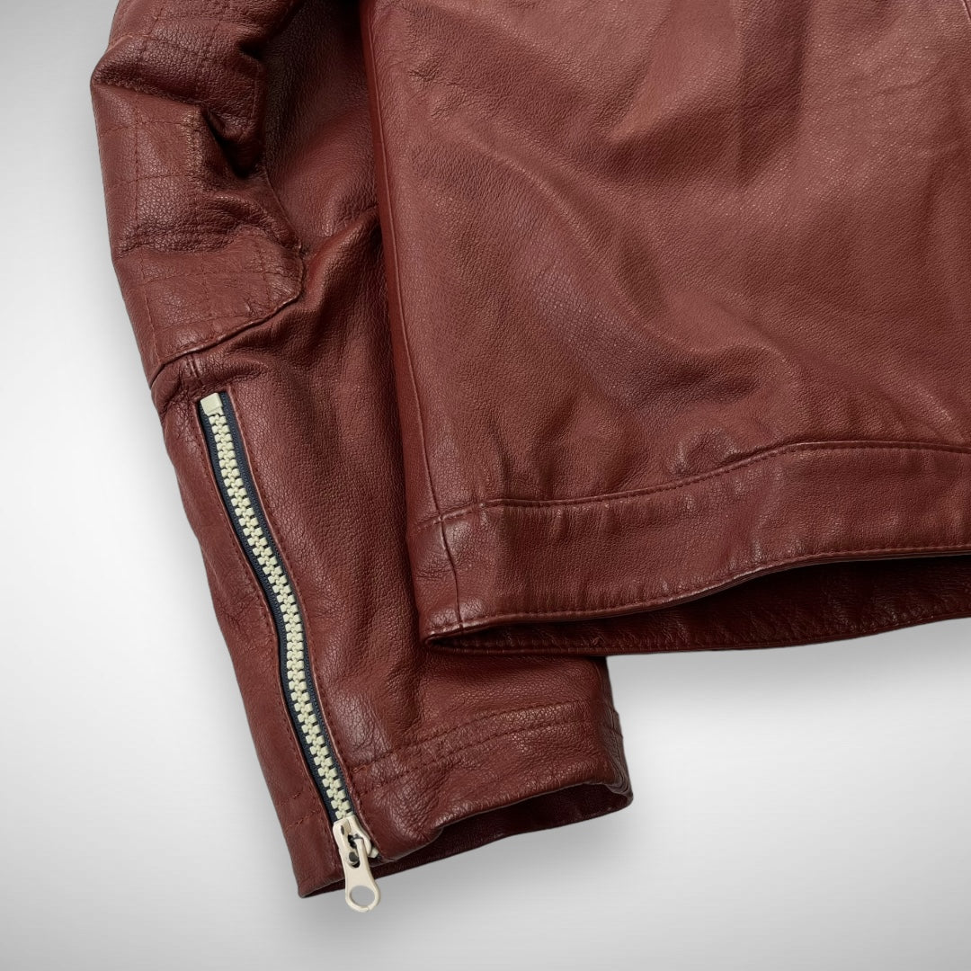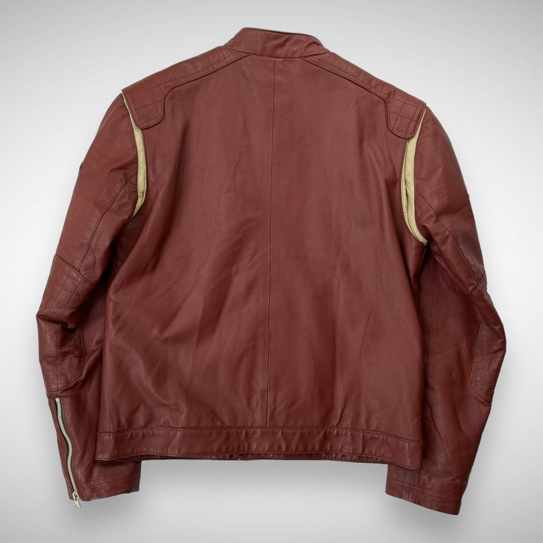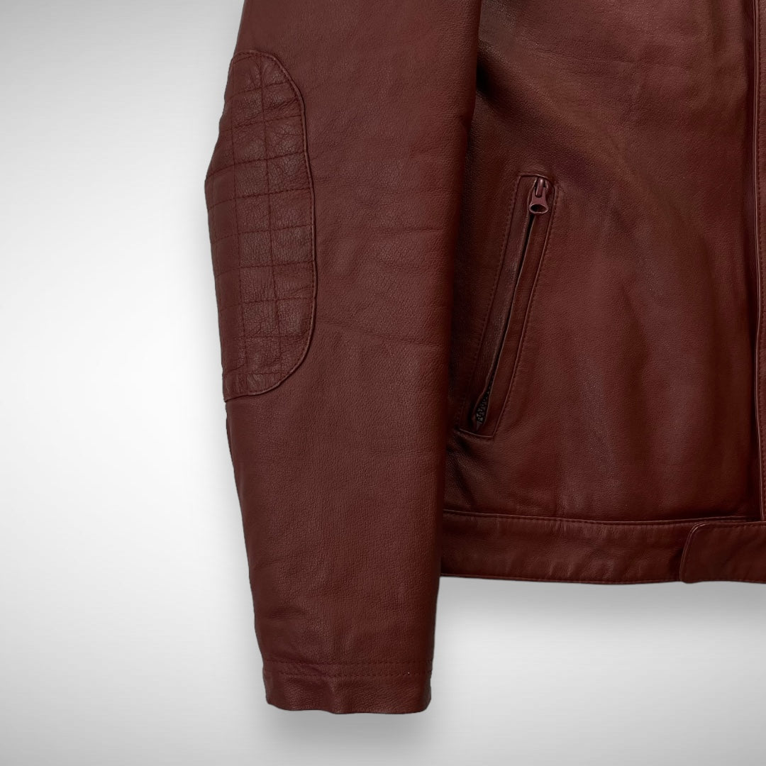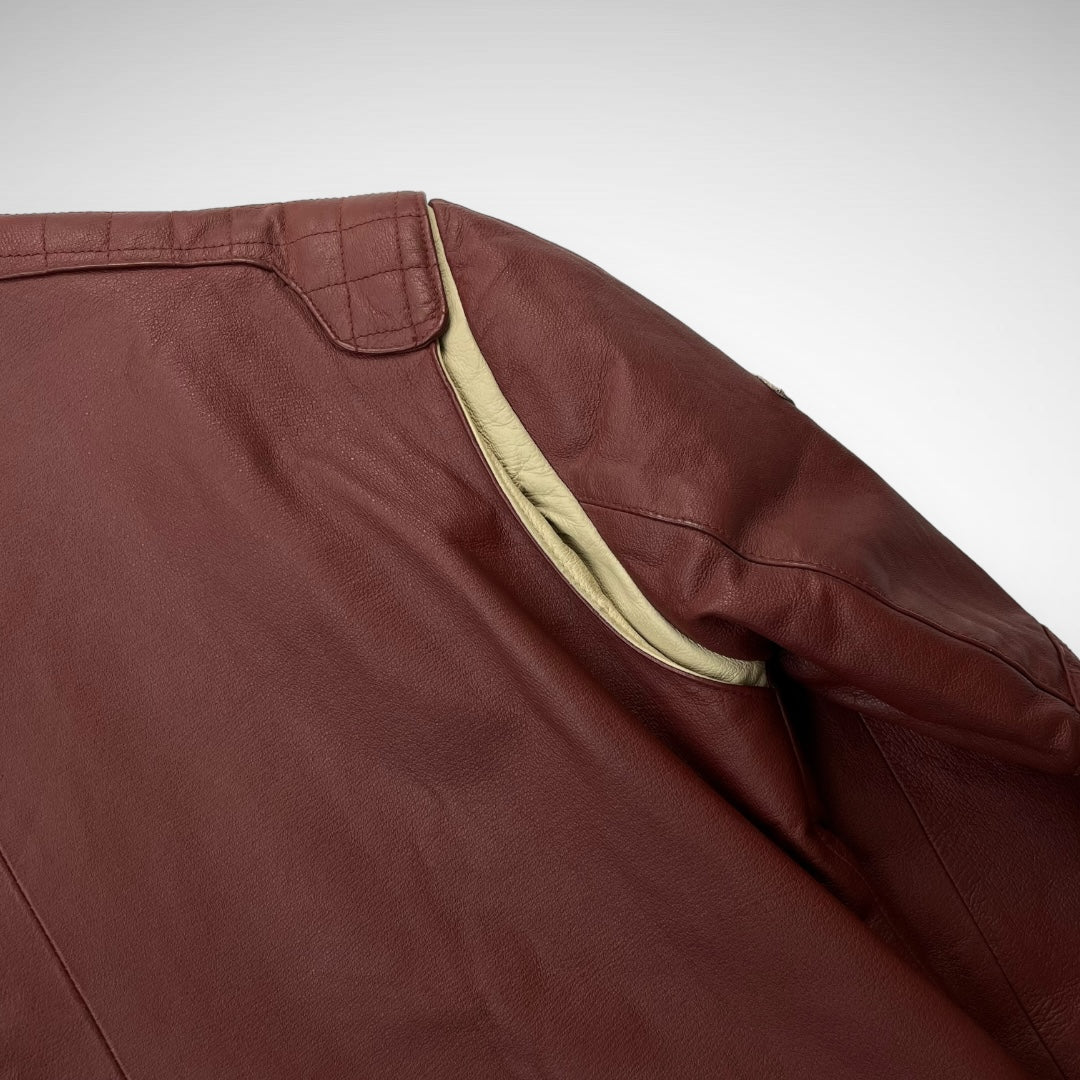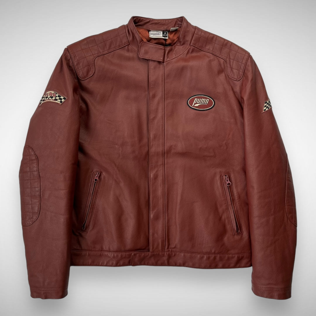 Burgundy coloured leather with grid-pattern stitched elbow and shoulder panels, Puma racing embroidered patches on both upper arms and chest, zip-expandable cuffs in cream and similar colour back expandable shoulder panels, full zip closure with snap-button fastening.