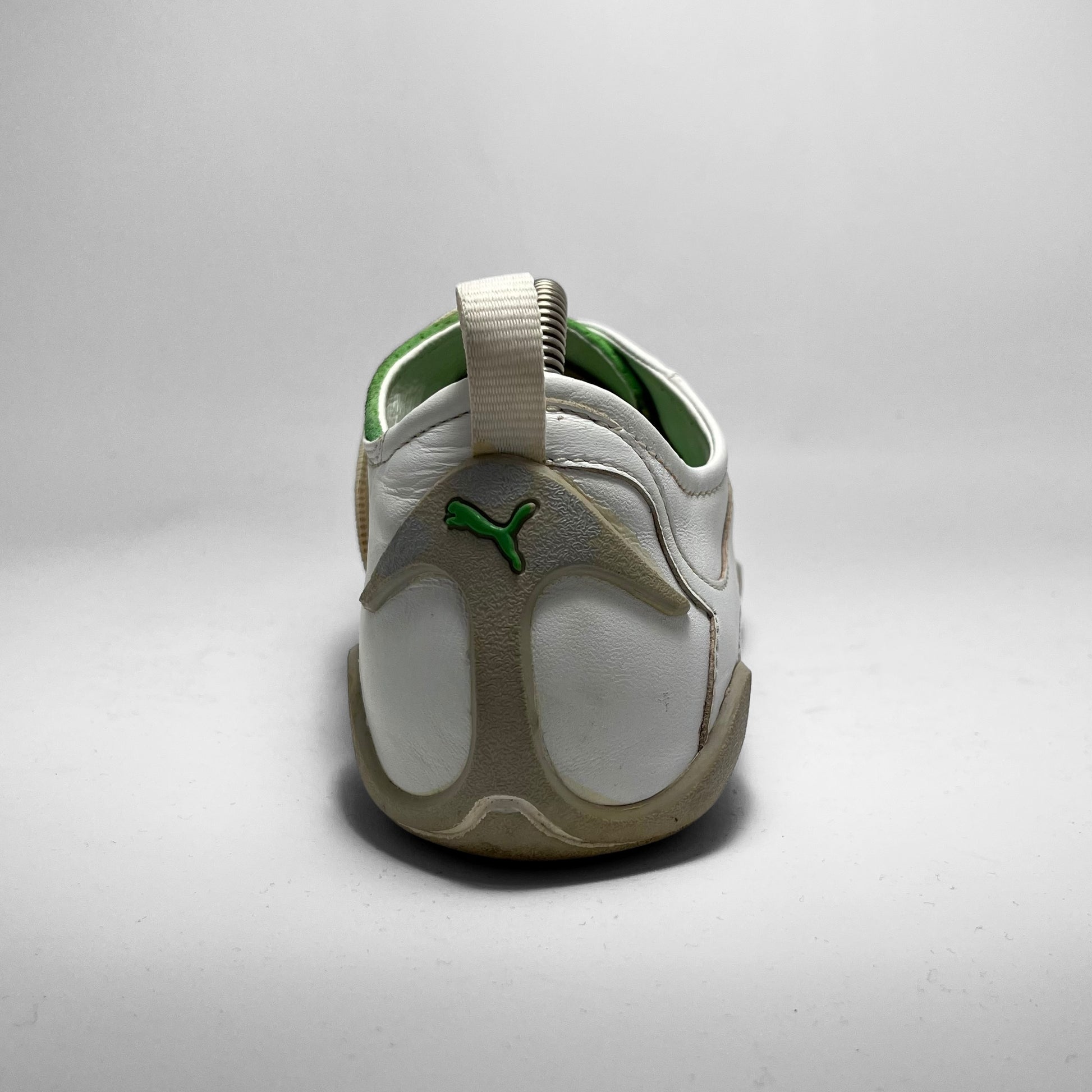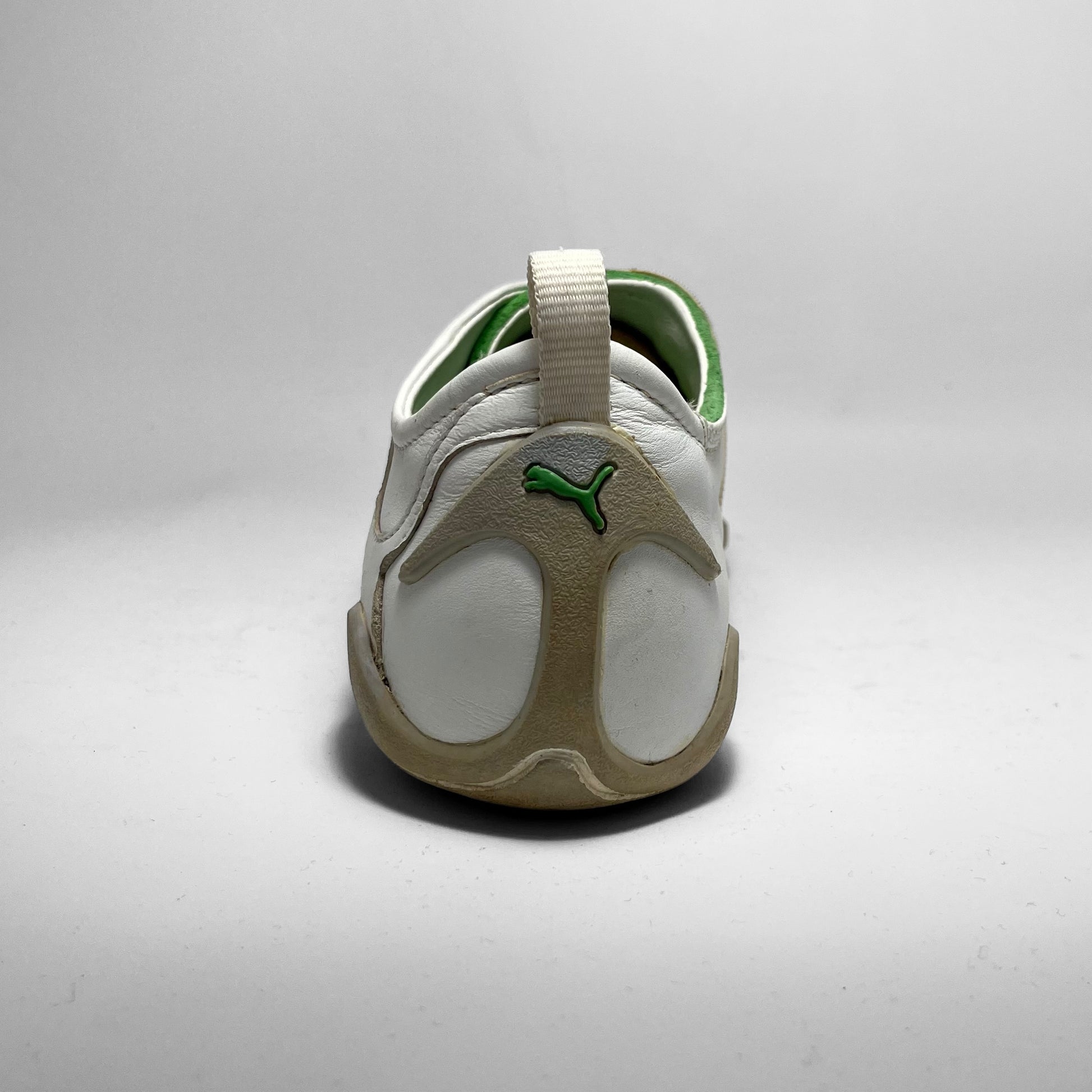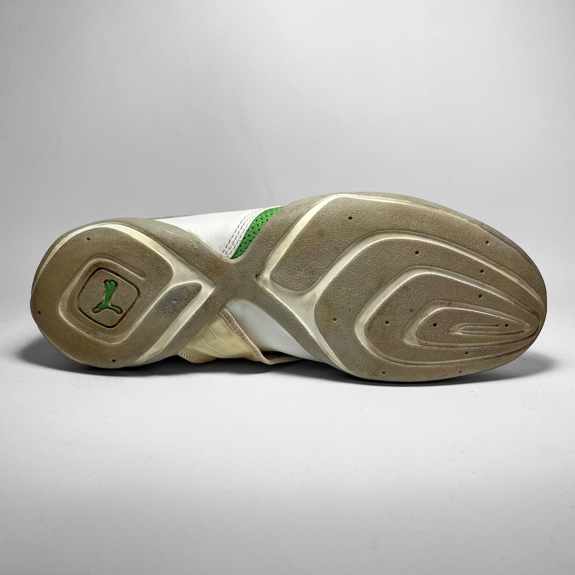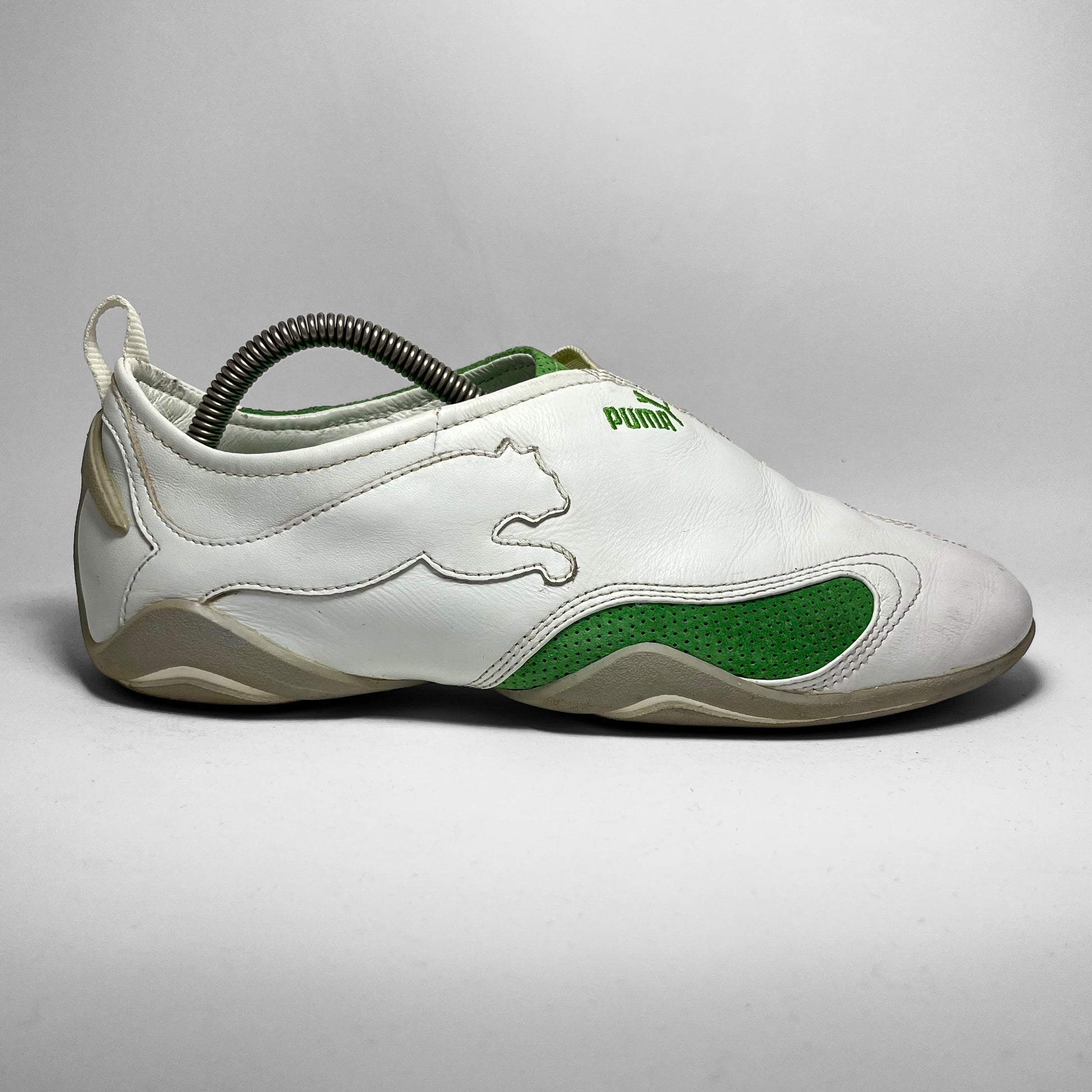 Curved leather upper panel with stitching details and green mesh layering, stacked Puma branding and embroidered script, thick rubber outsole pointing towards the heeltab and flowing forms on the bottom, elastic woven strap on the medial side.