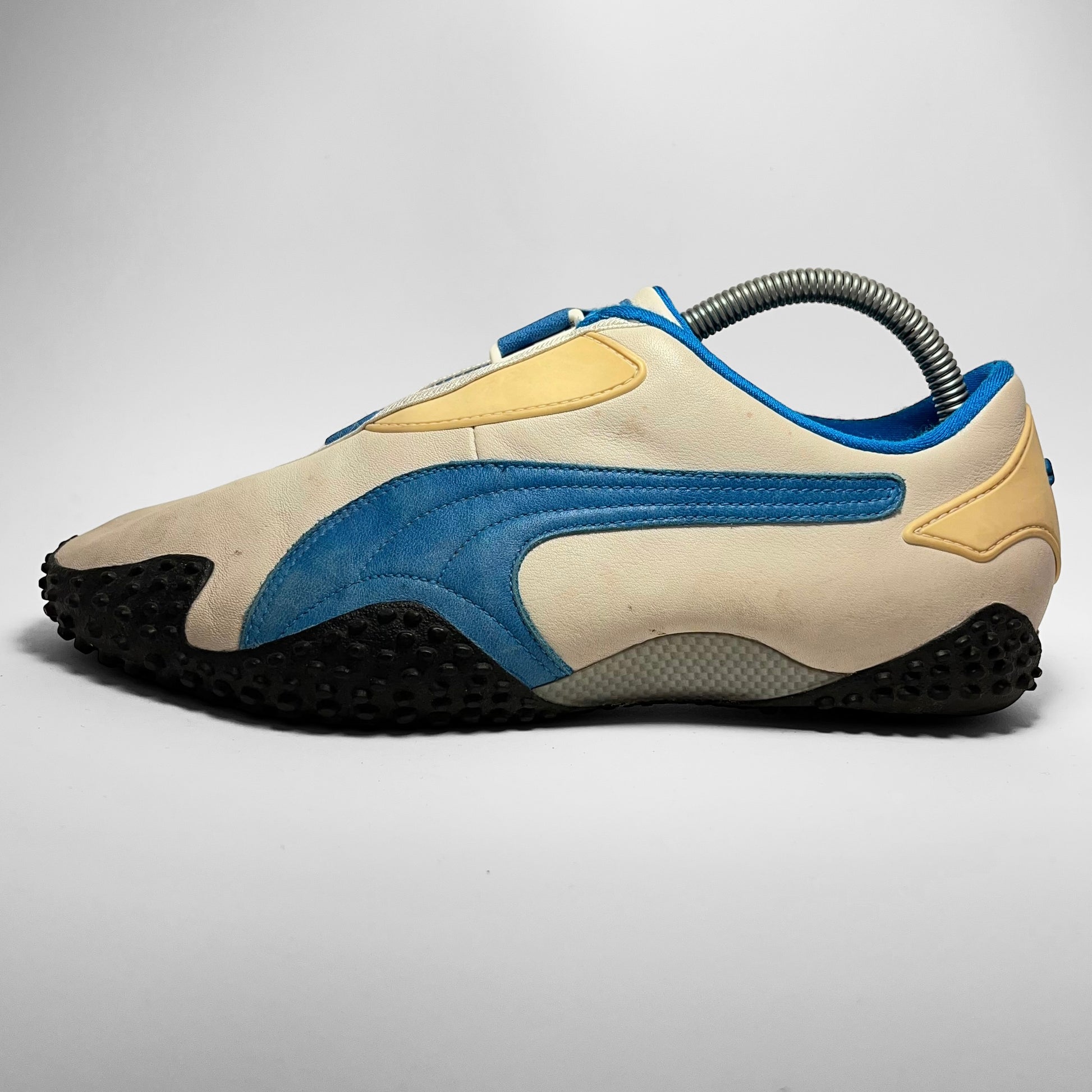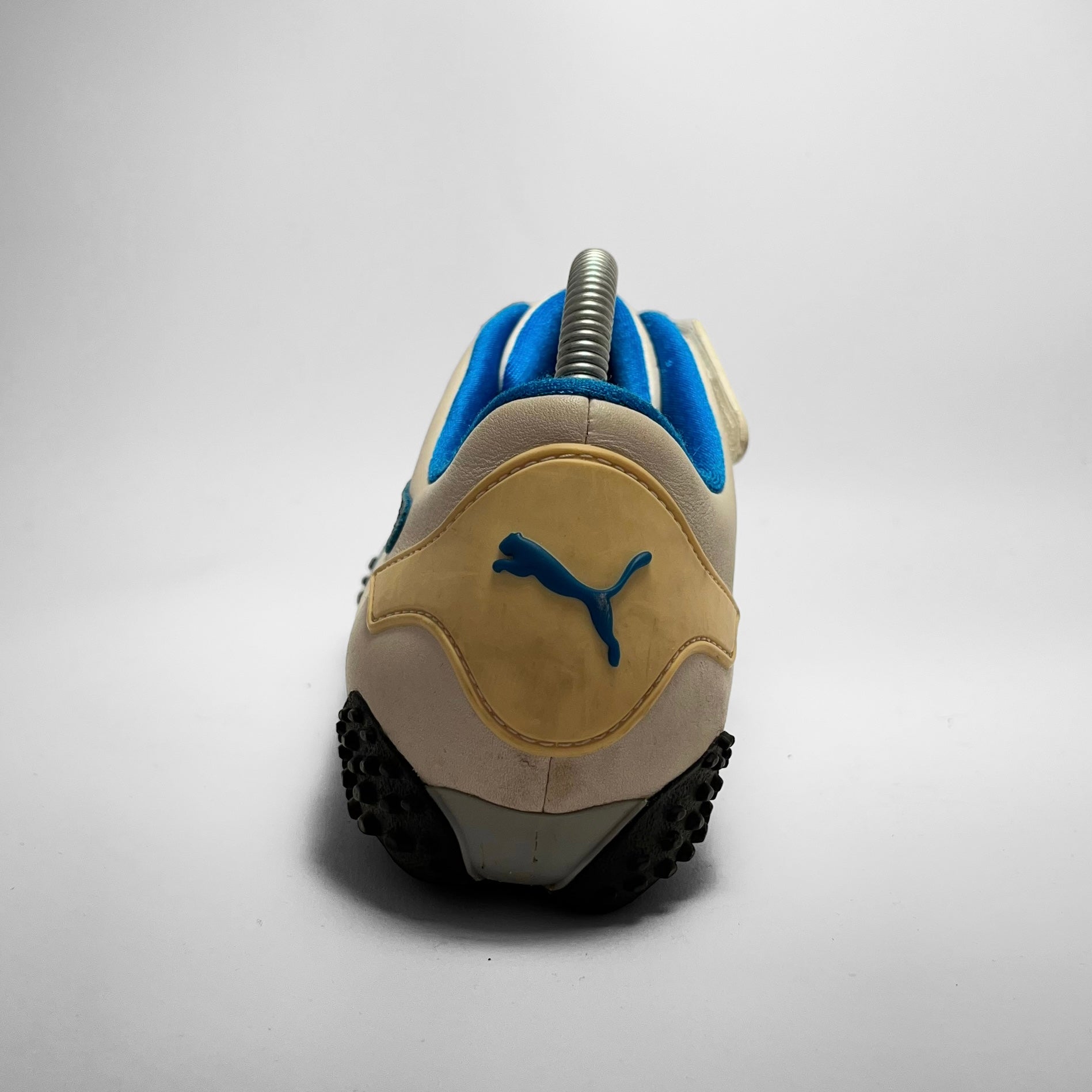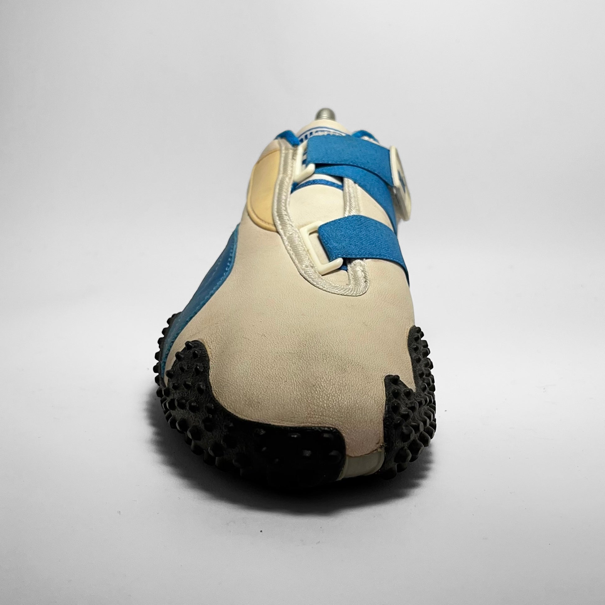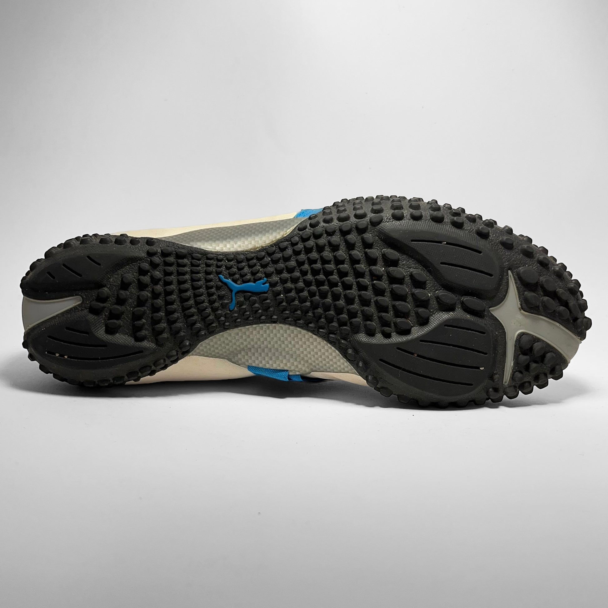 White leather upper with blue details such as Puma panel, elastic band and branded velcro strap, branded tongue, sock-liner, branding on cream rubber heel panel and outsole. Carbon chassis included.