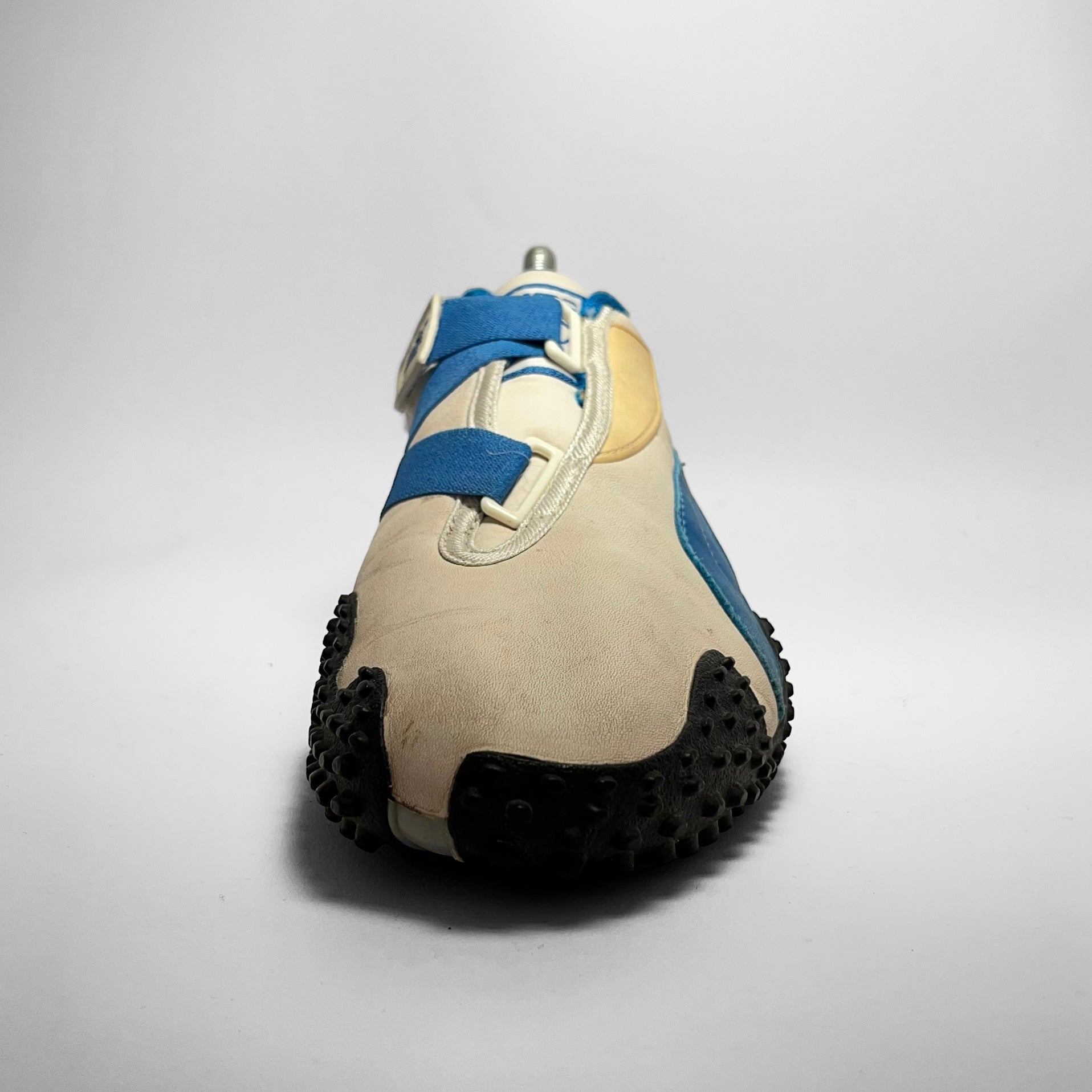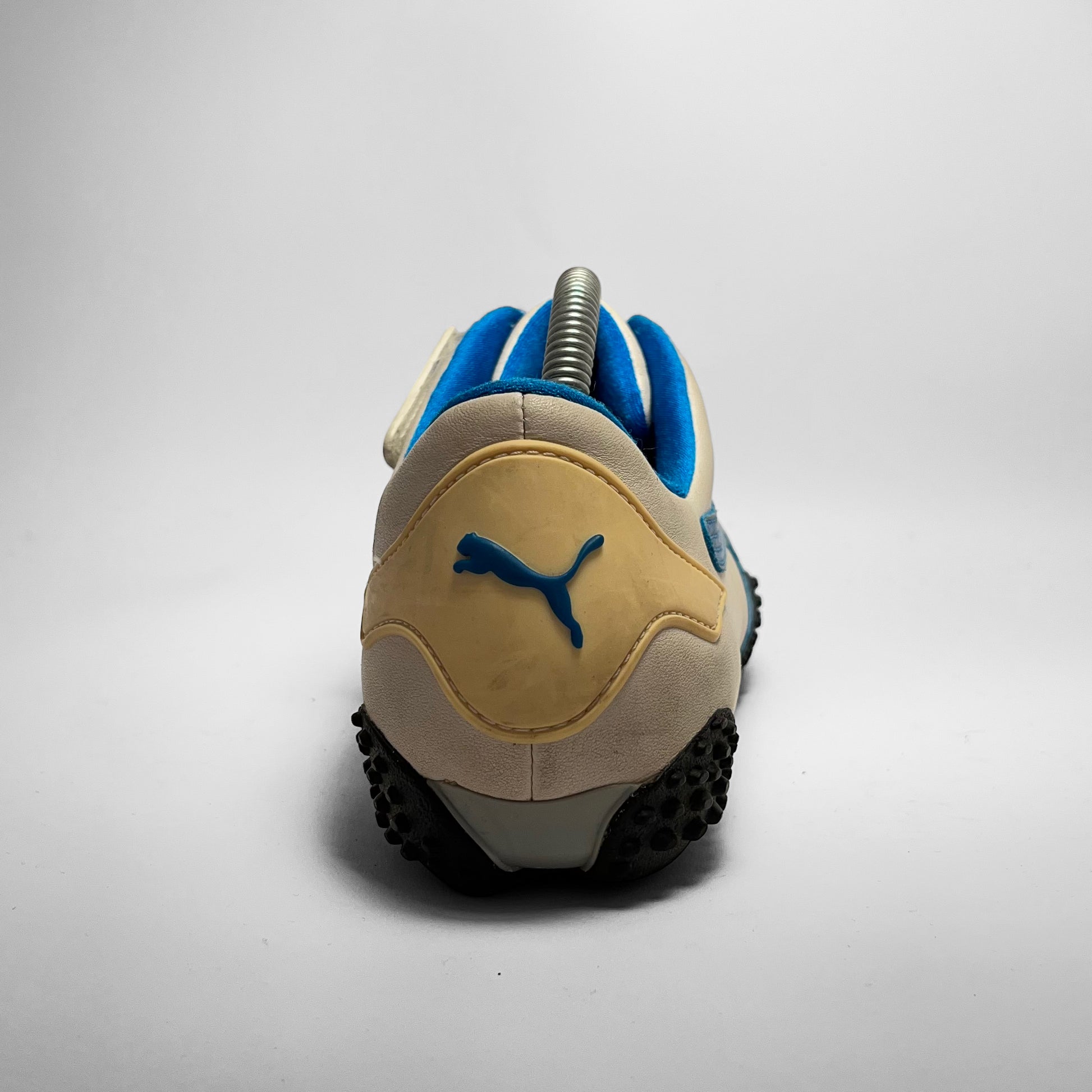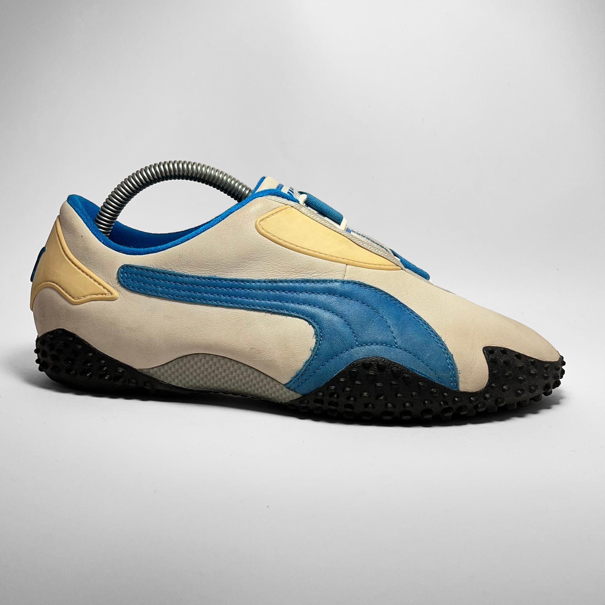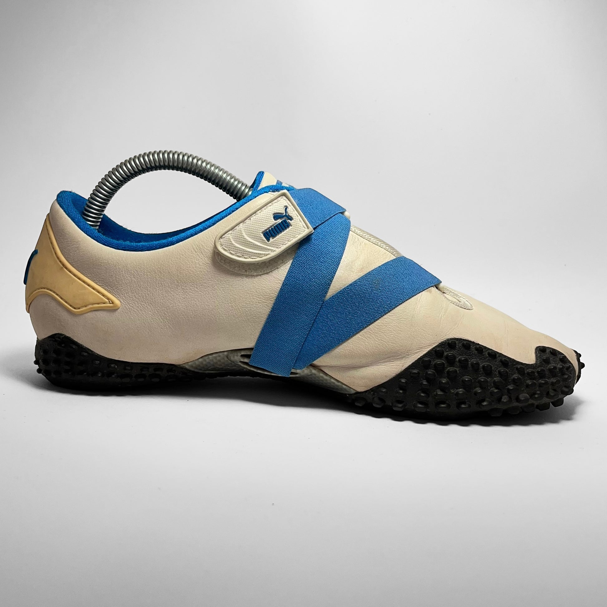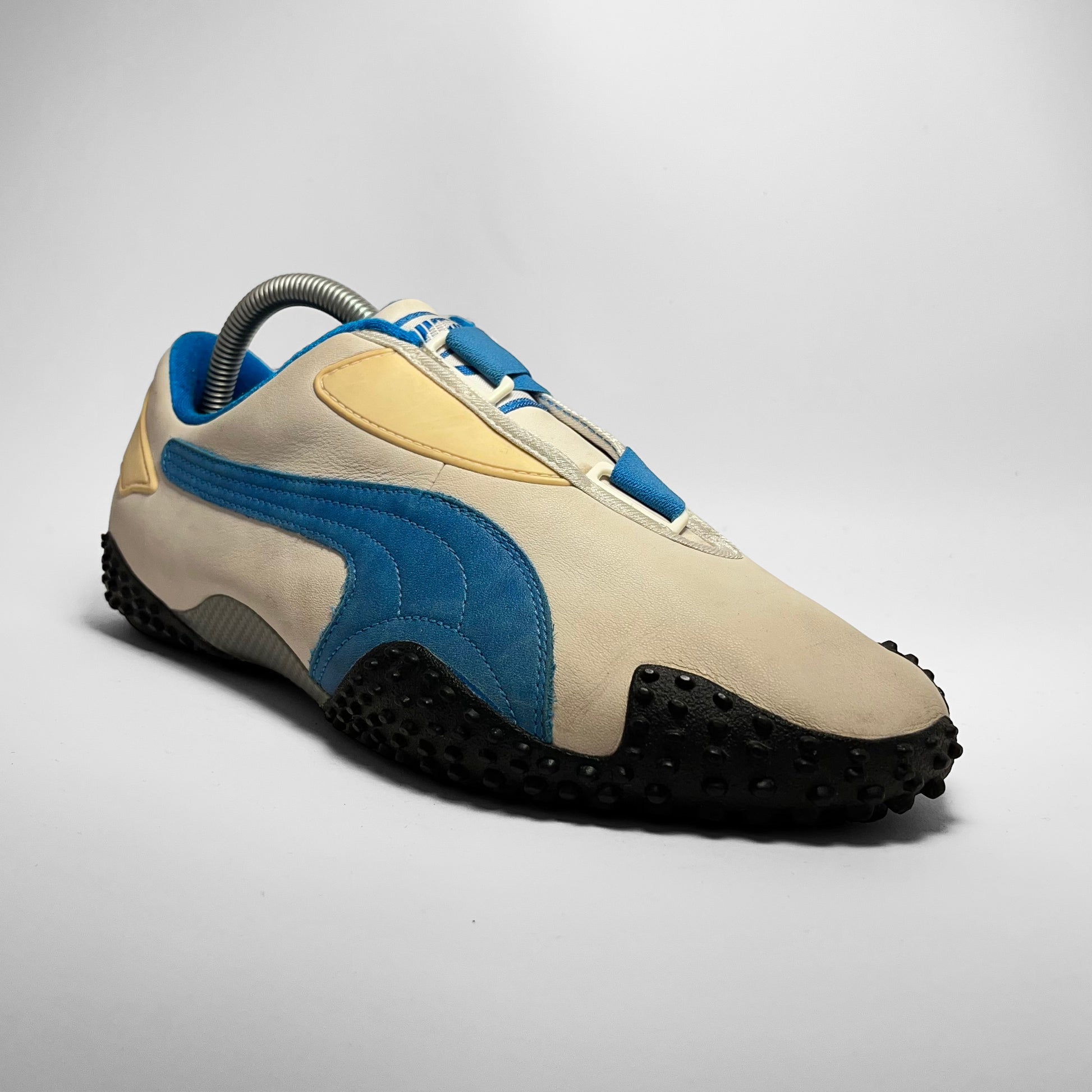 White leather upper with blue details such as Puma panel, elastic band and branded velcro strap, branded tongue, sock-liner, branding on cream rubber heel panel and outsole. Carbon chassis included.