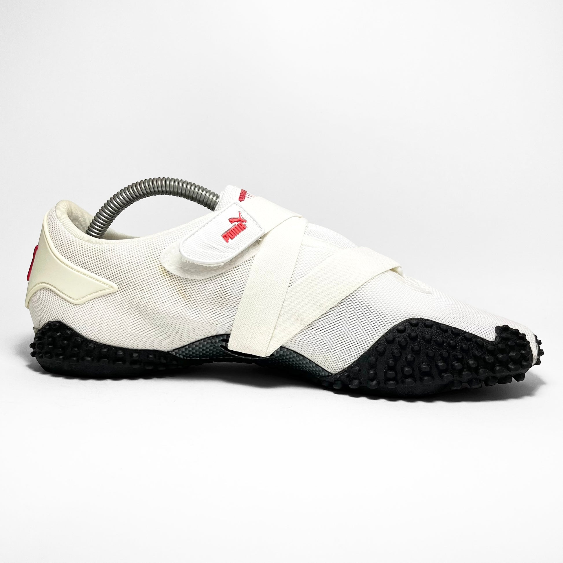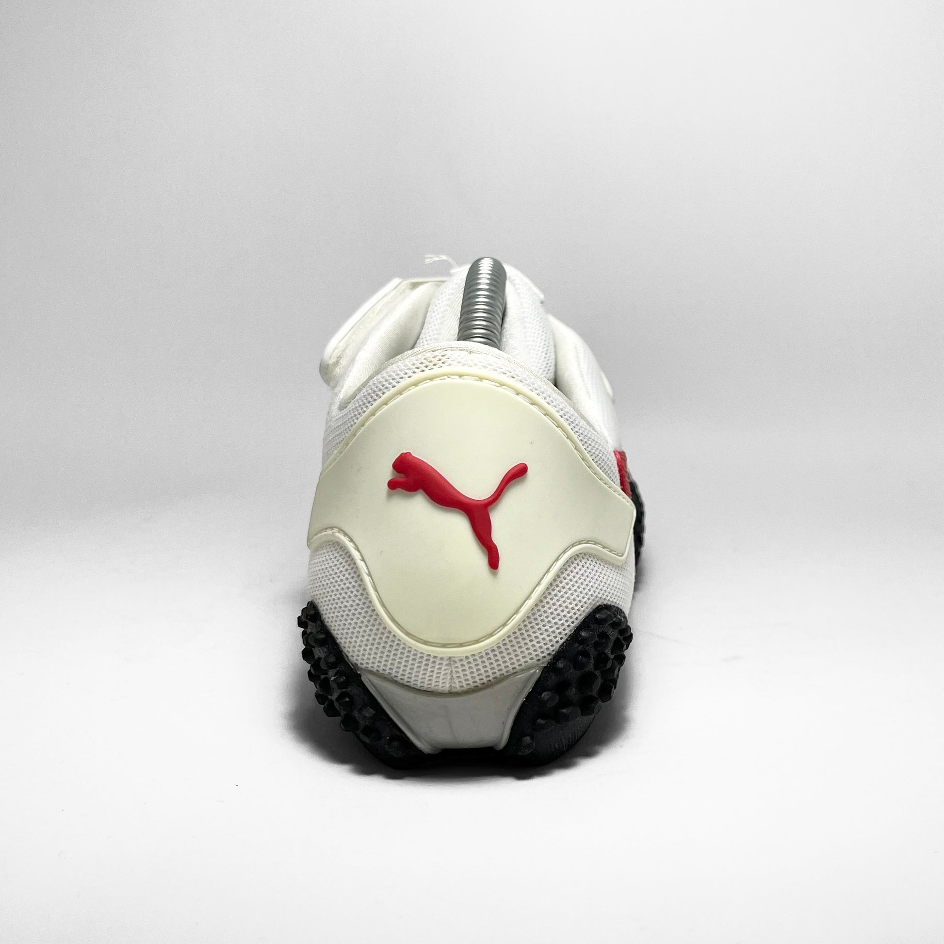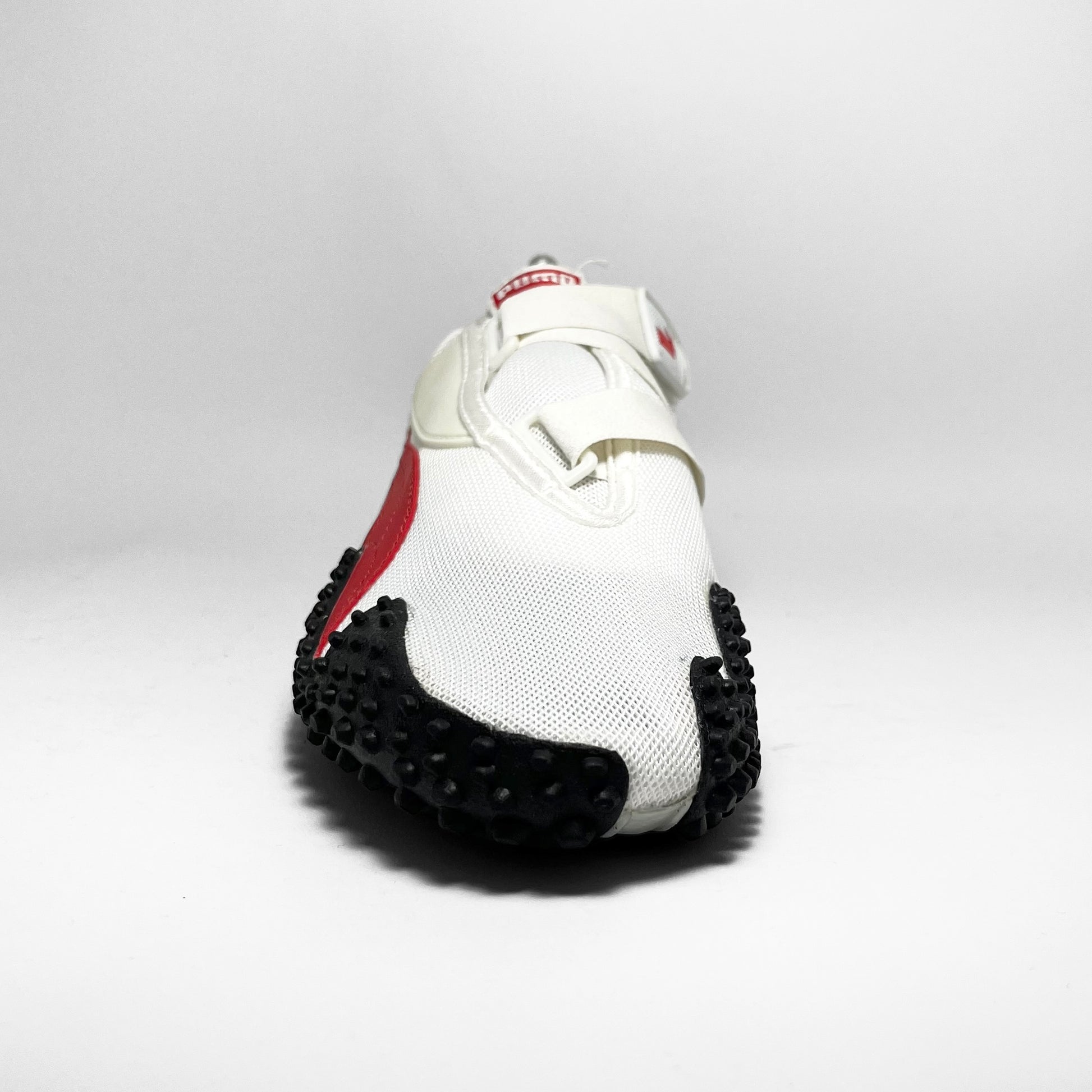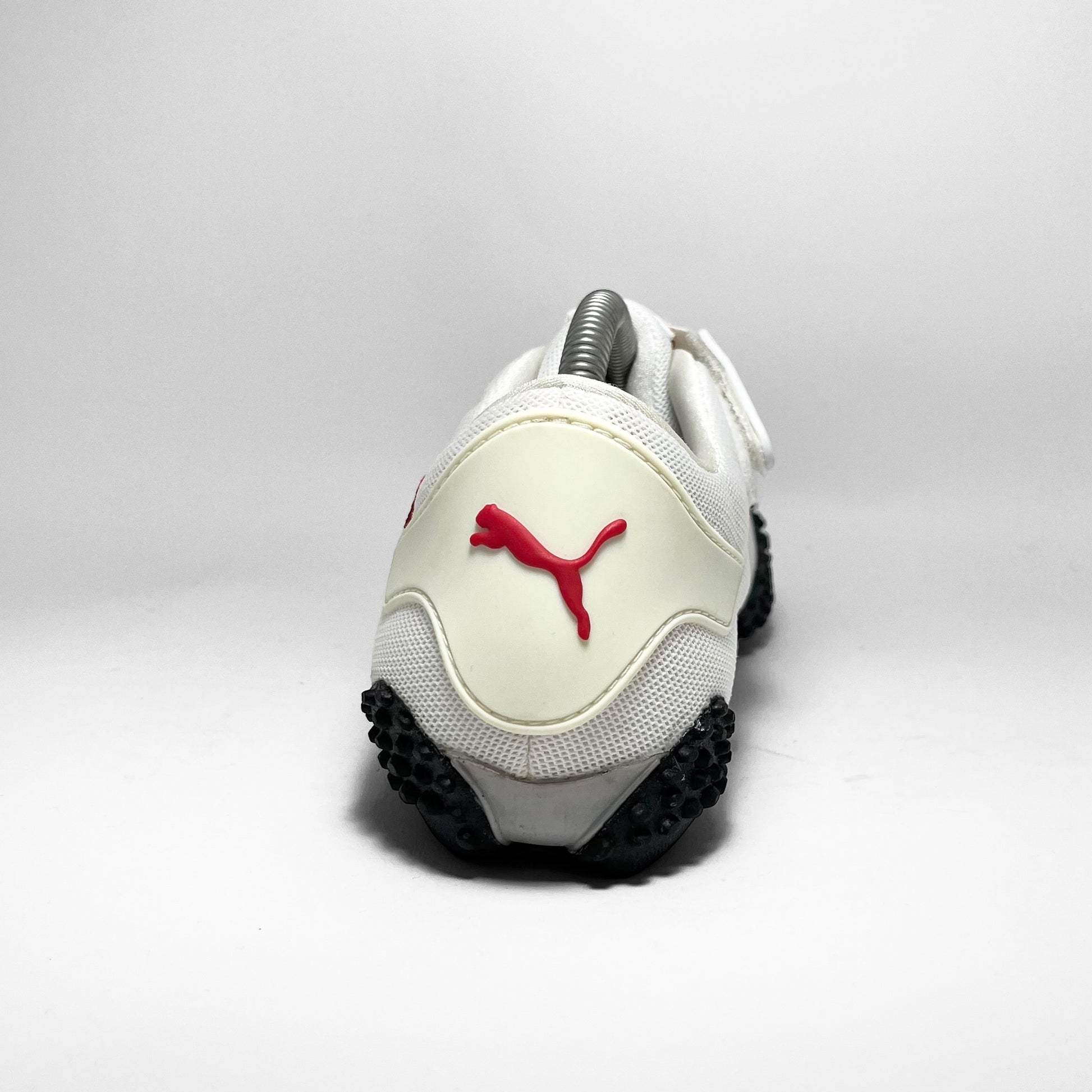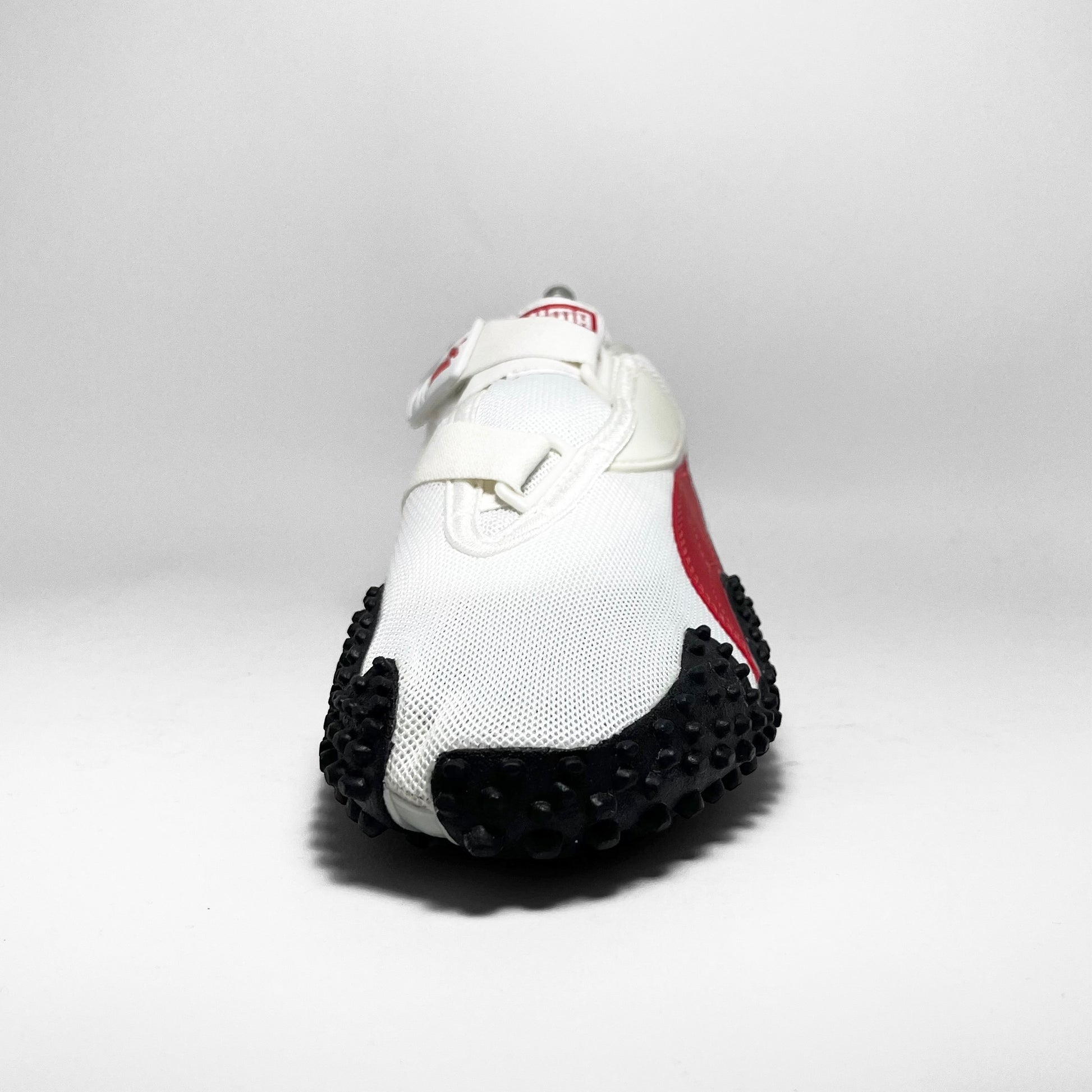 White mesh base with leather red Puma logo, elastic velcro strap with rubber branded pull-tab similar to the heel and side panels.