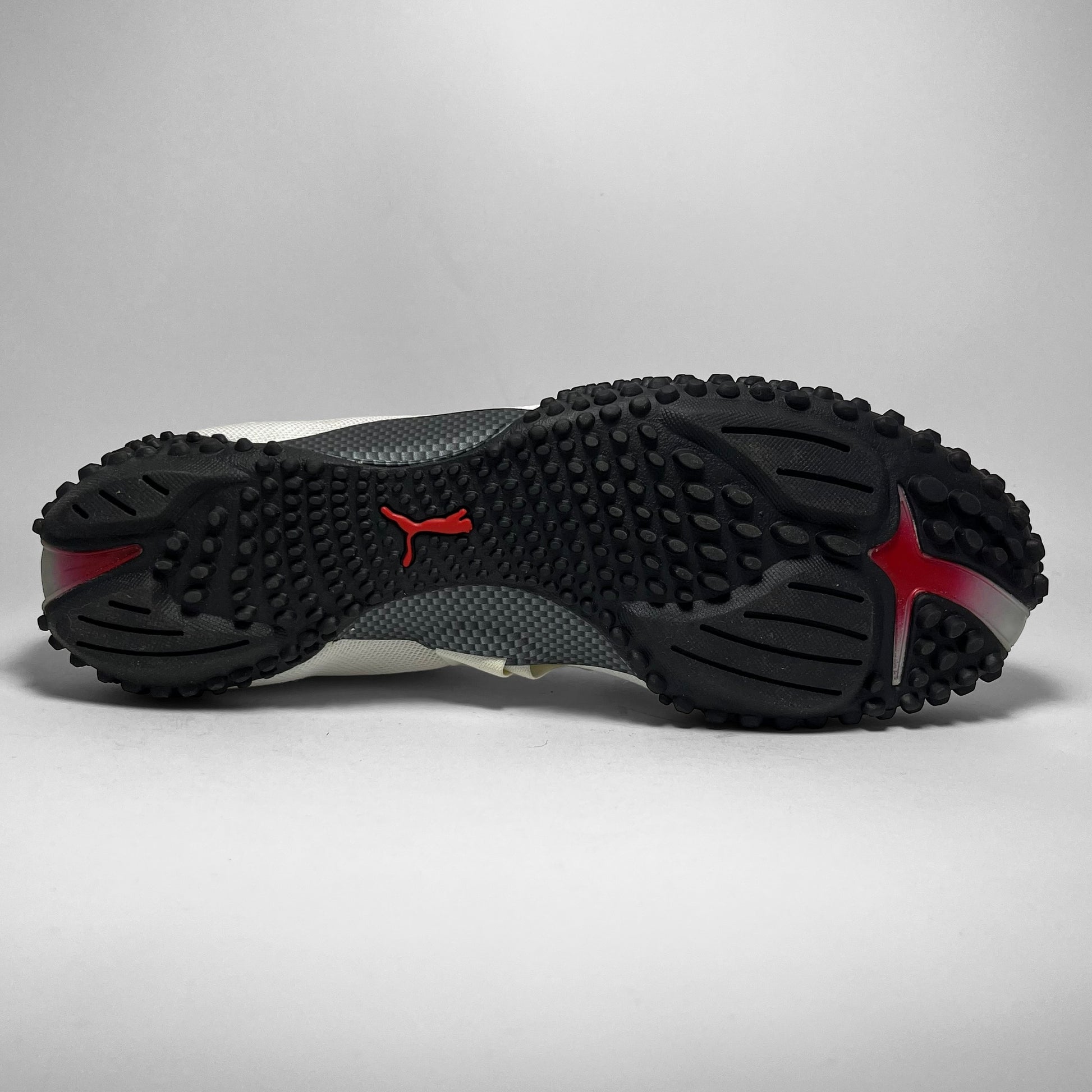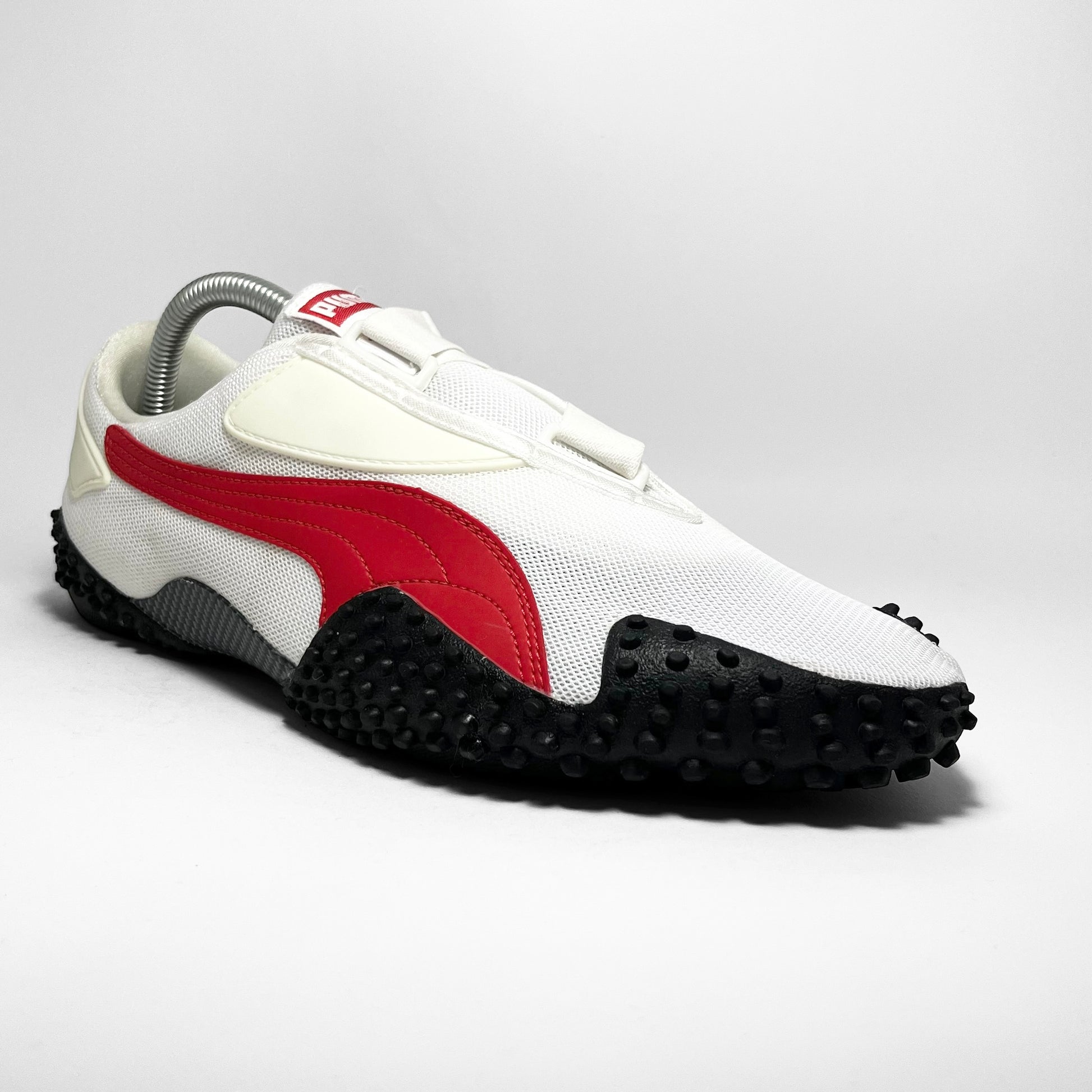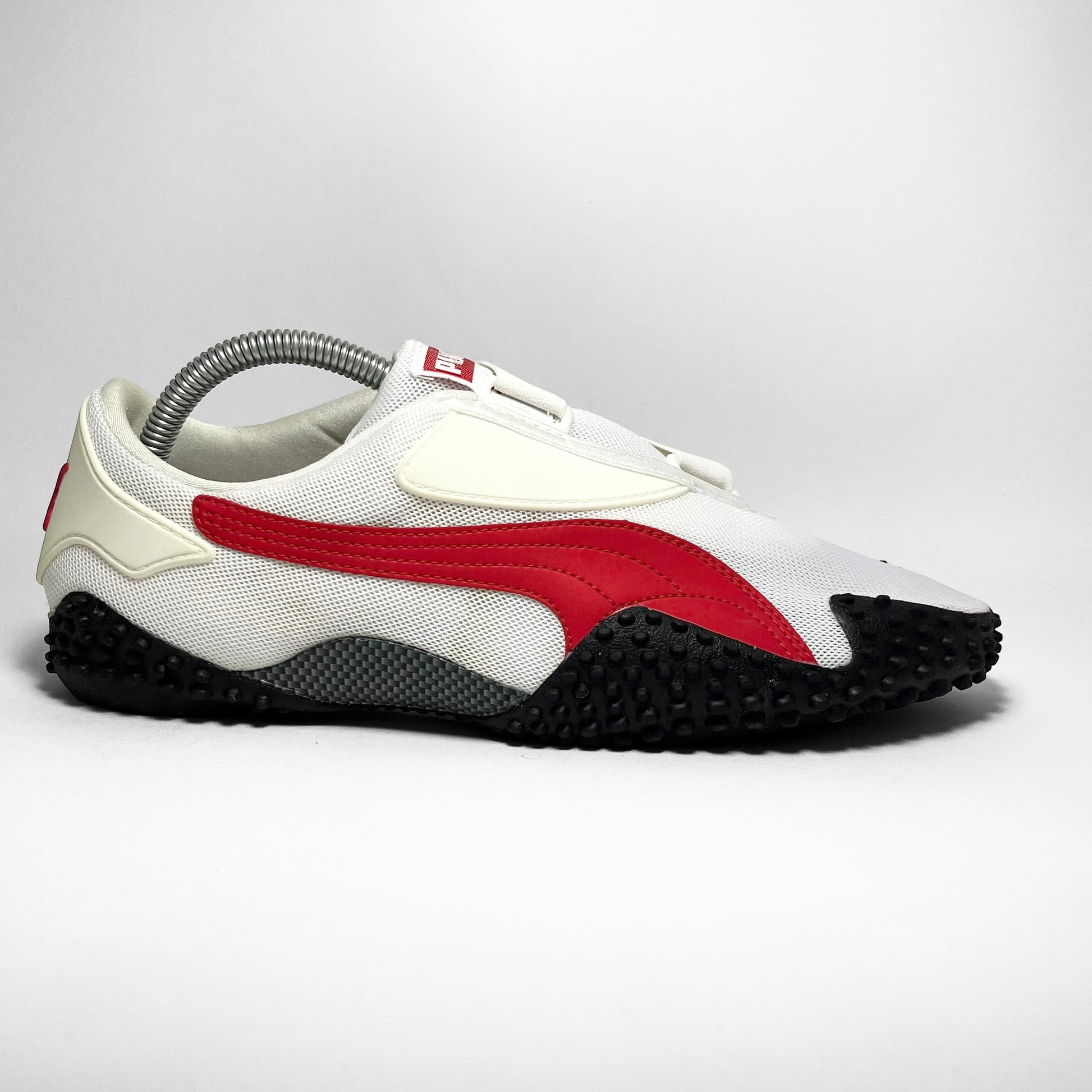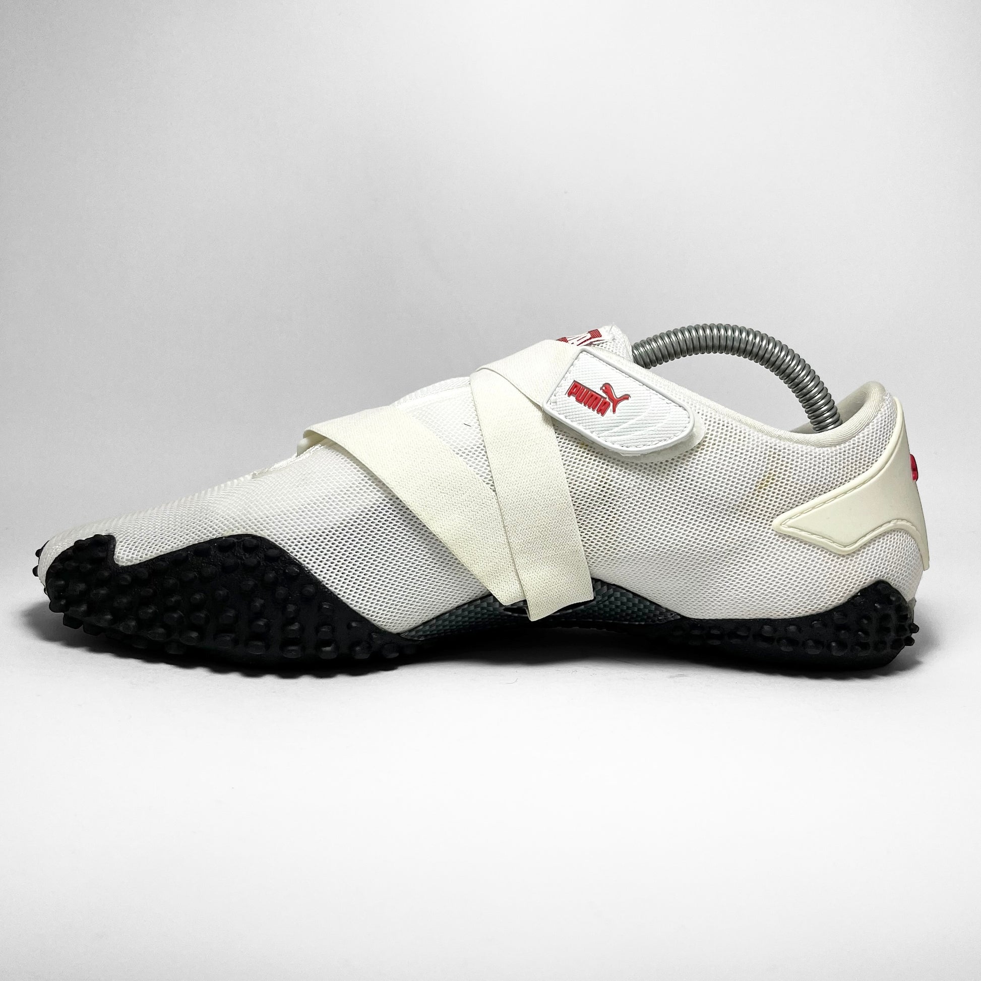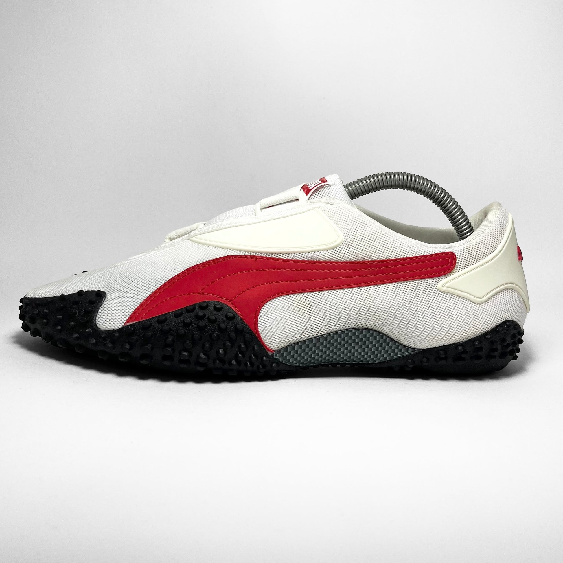 White mesh base with leather red Puma logo, elastic velcro strap with rubber branded pull-tab similar to the heel and side panels.