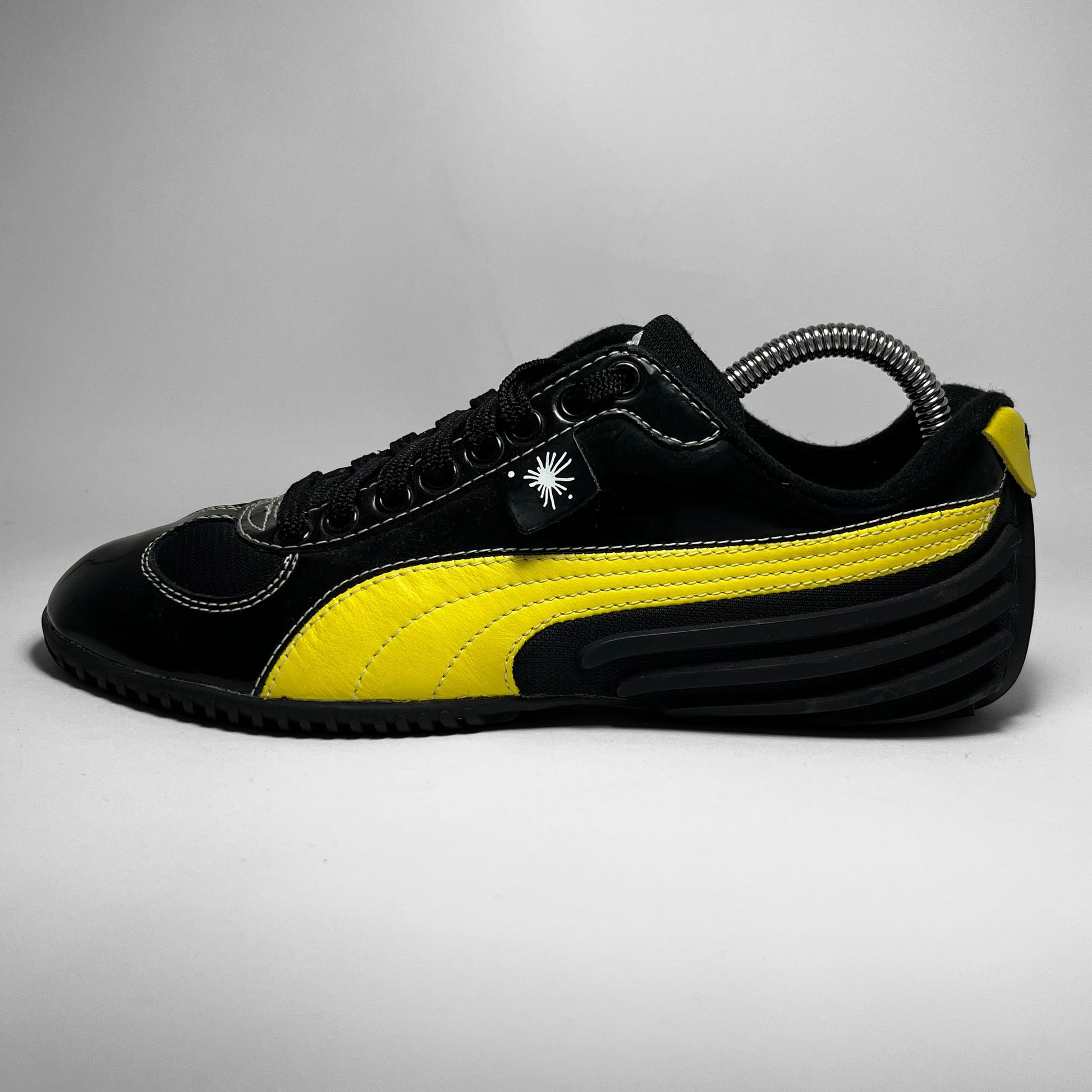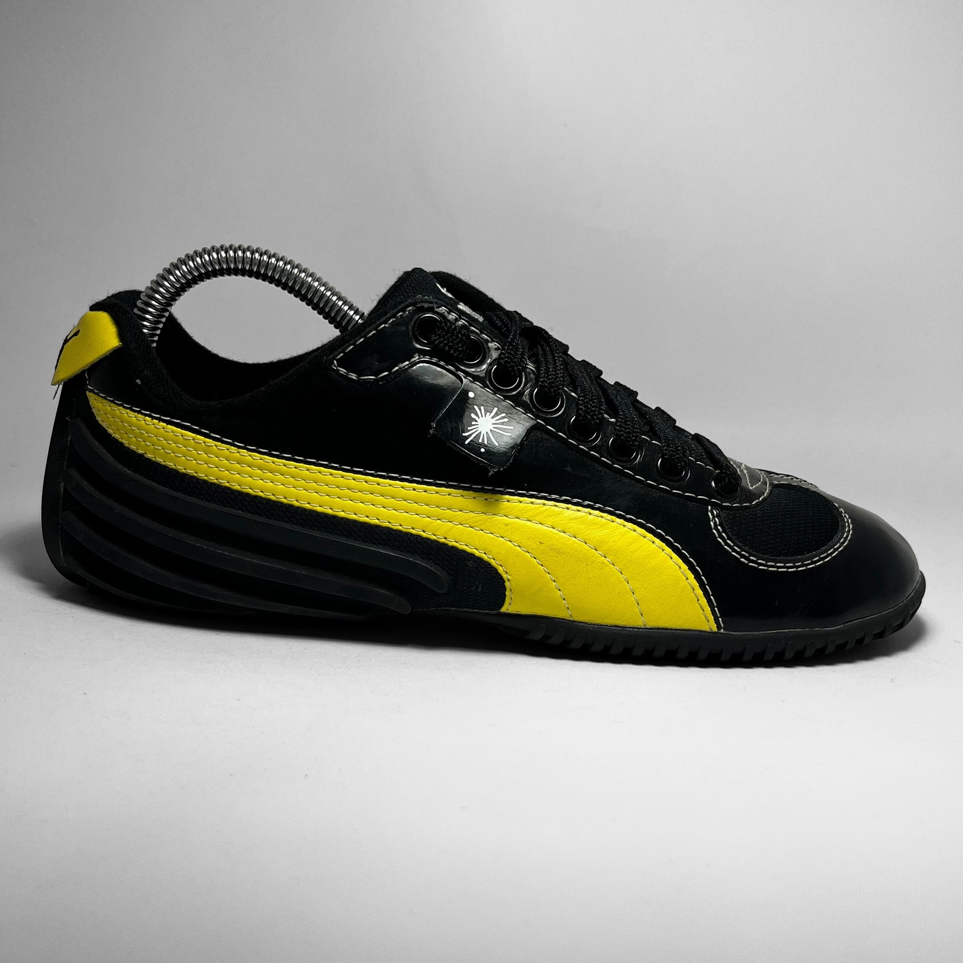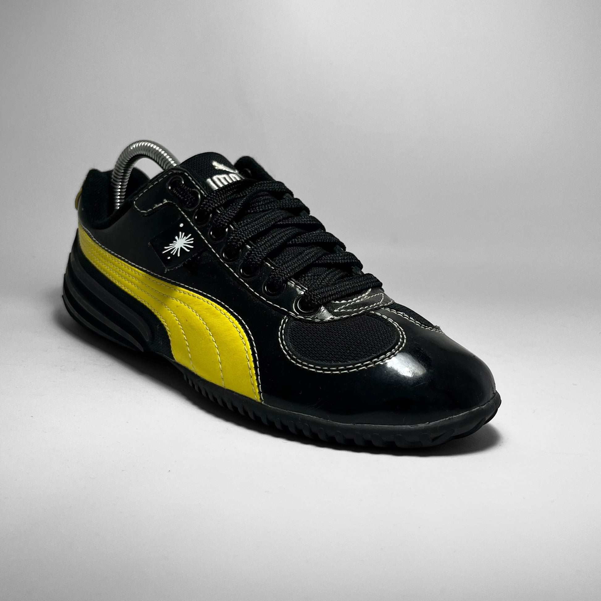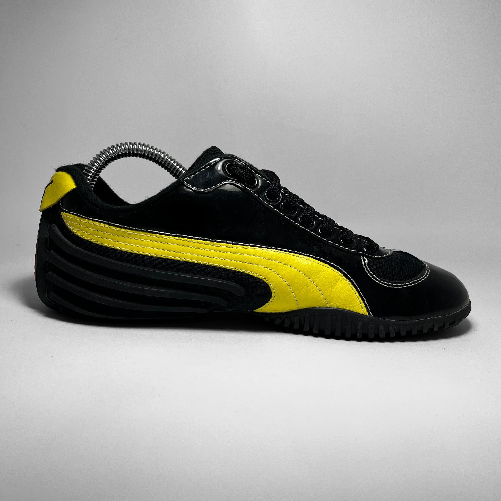 Mihara Yasuhiro designed Puma featuring woven cotton & patent leather upper in black with contrast yellow branding and white stitching throughout, signature outsole which flows into the heel showing rubber intakes and embroidered branding on tongue.