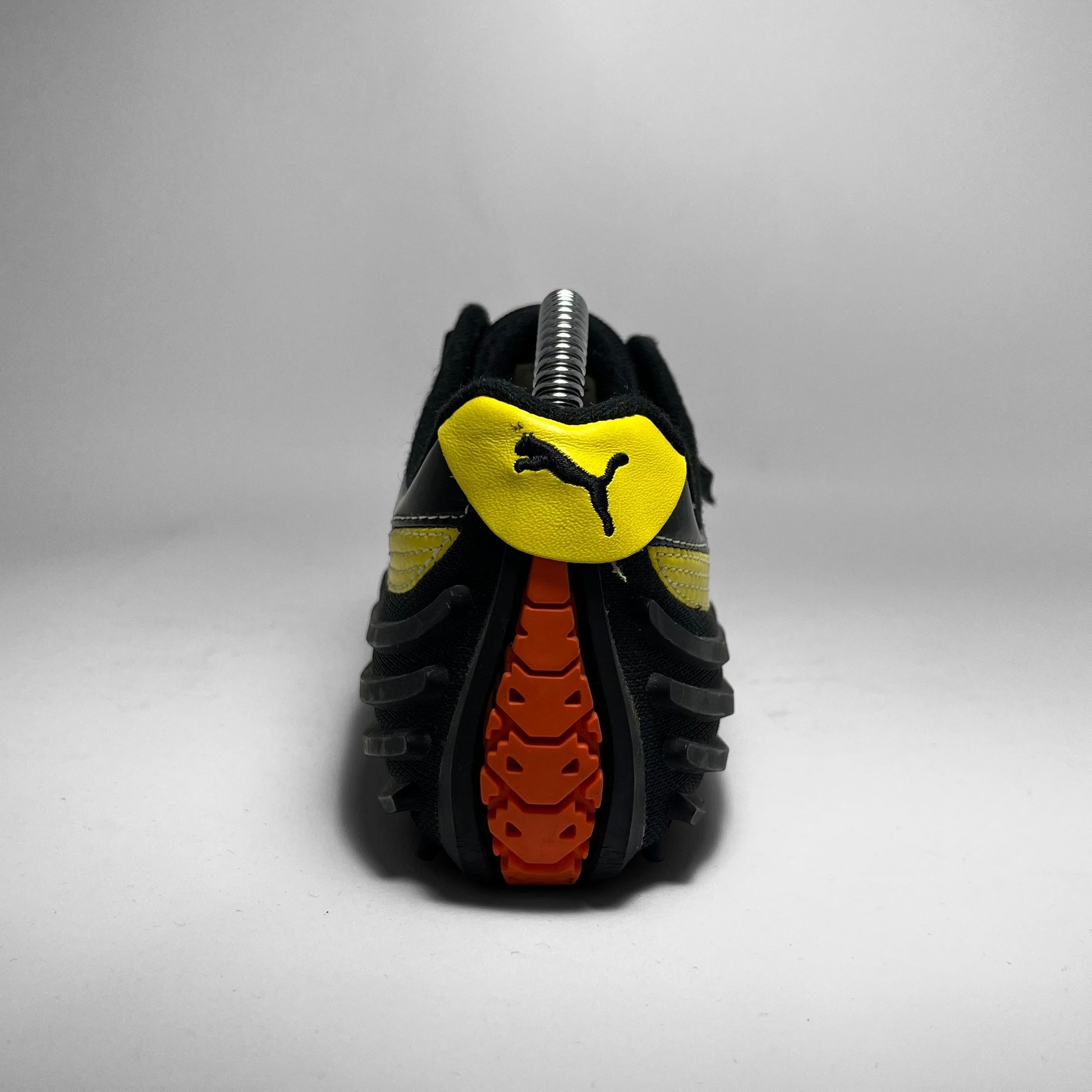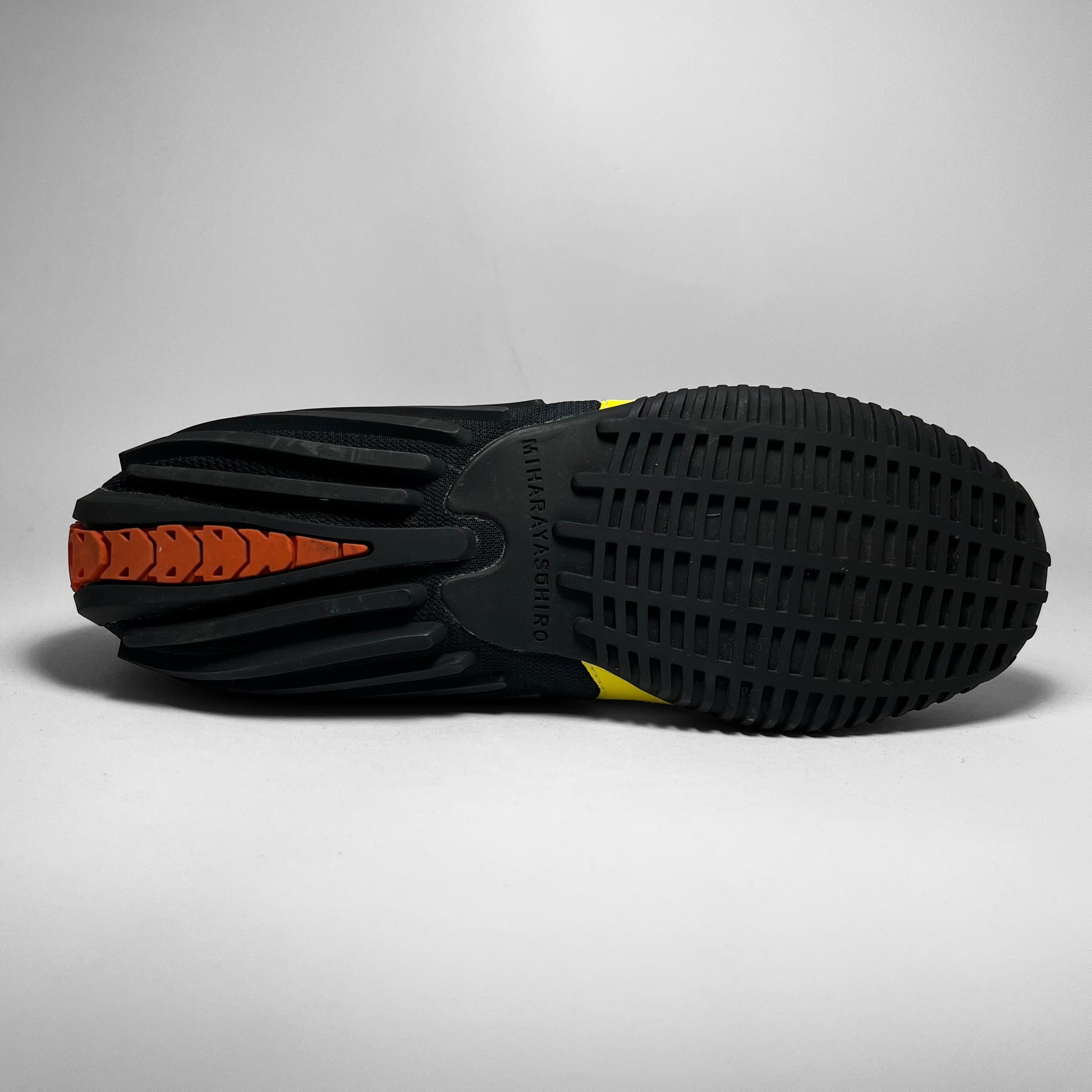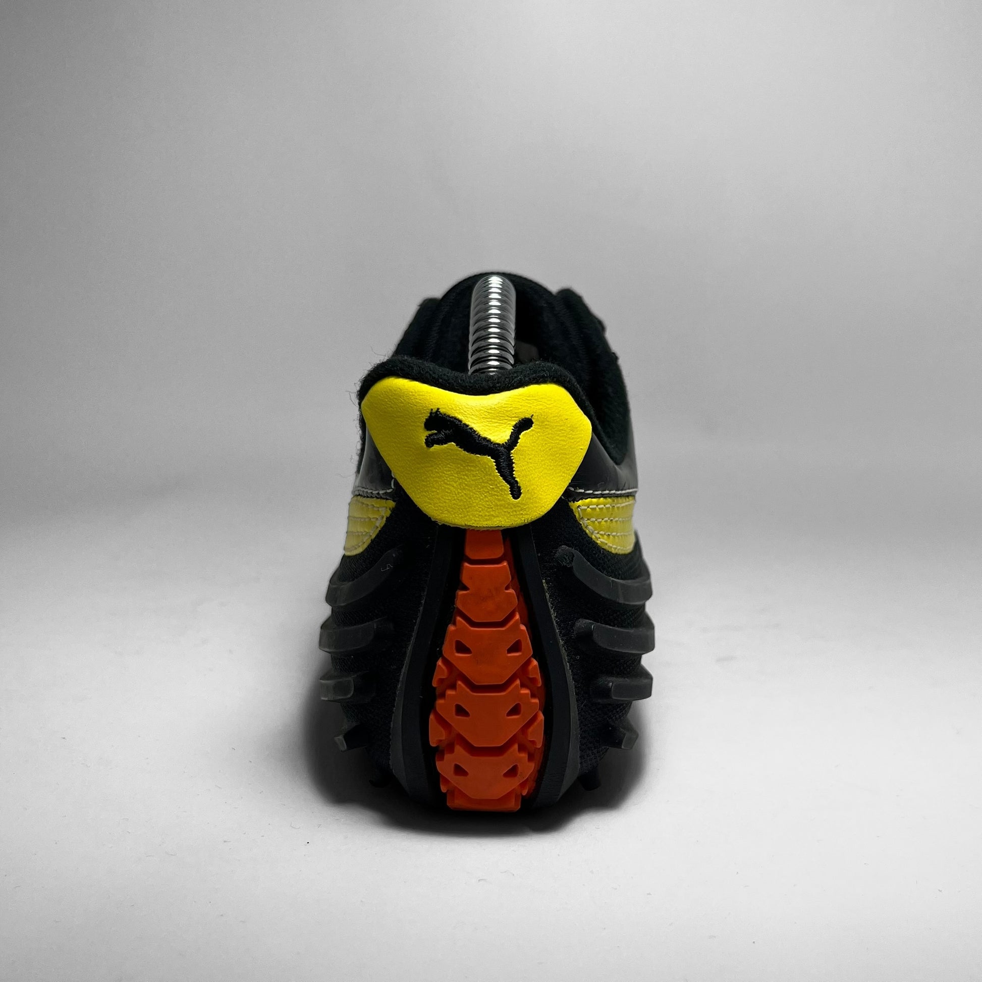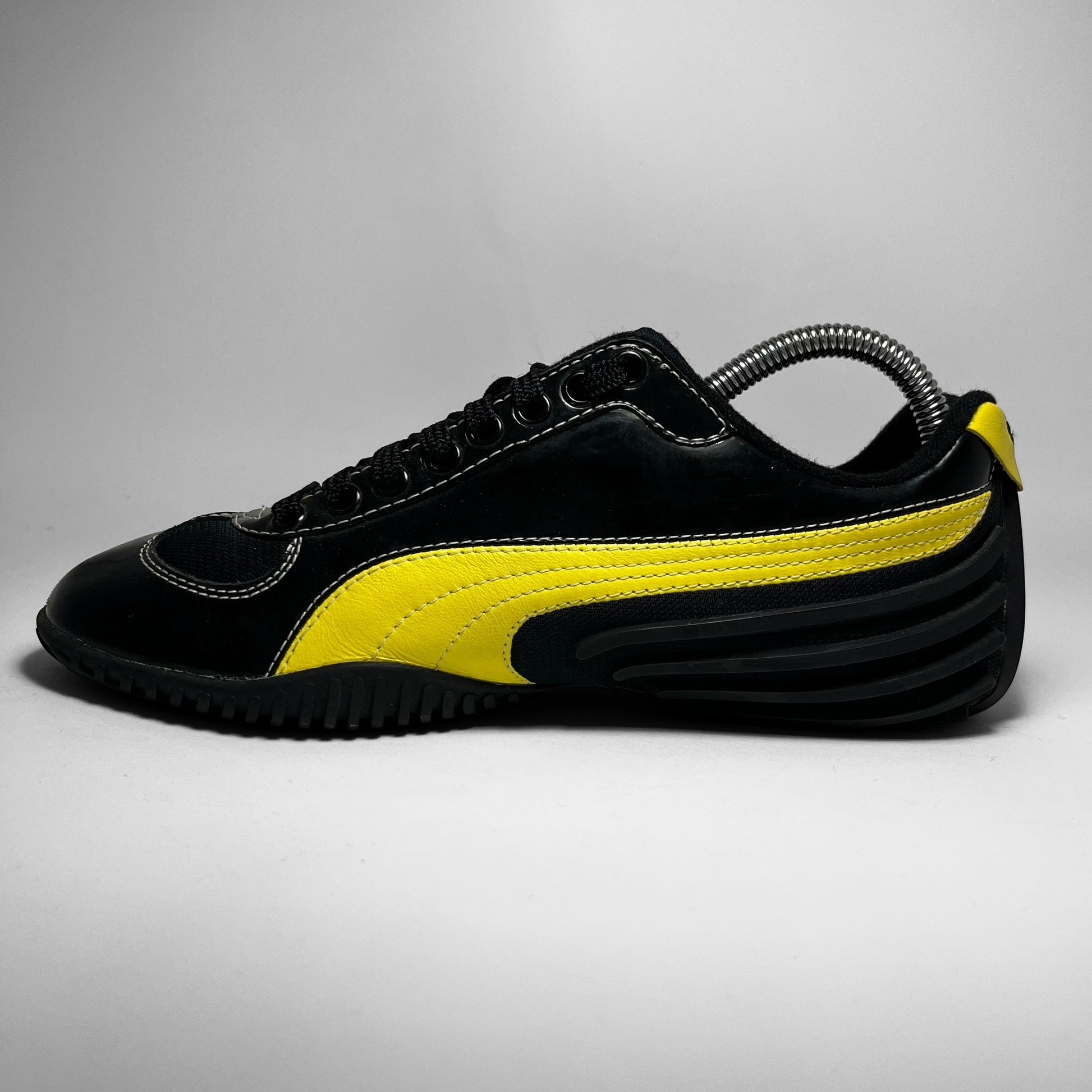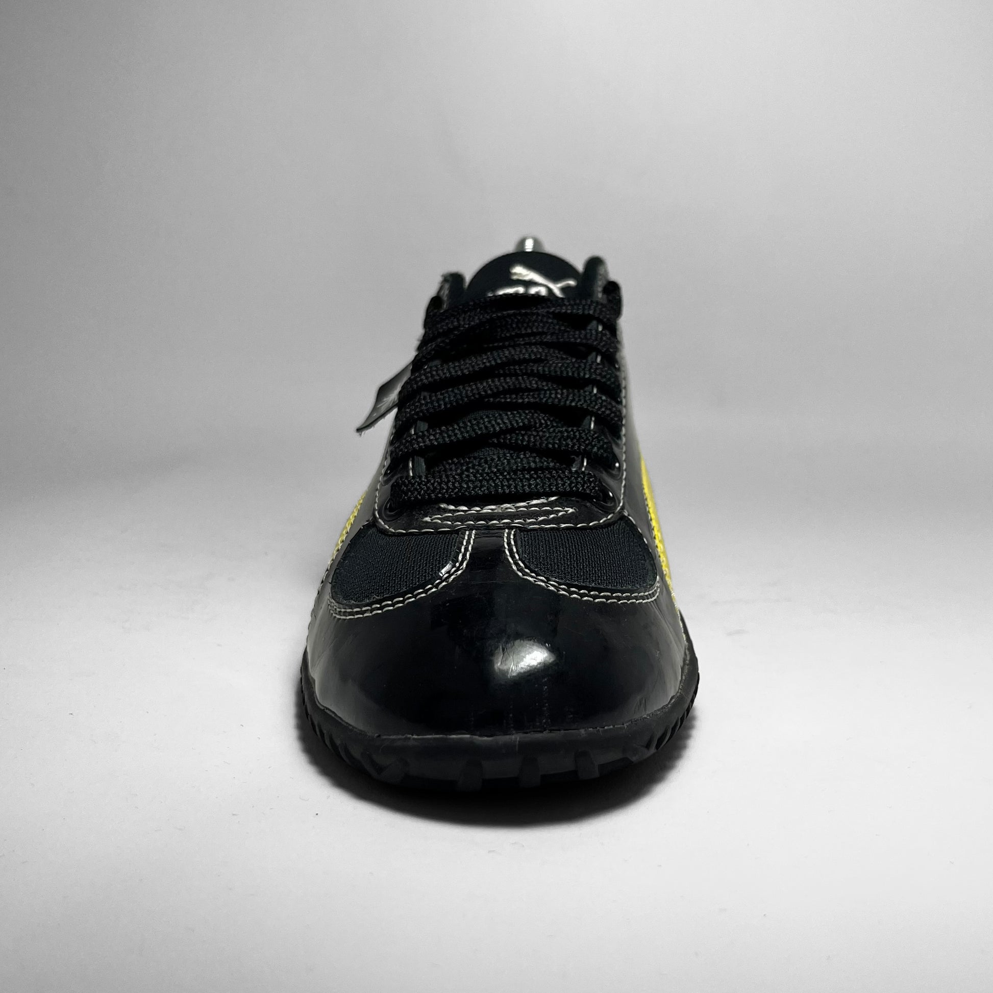 Mihara Yasuhiro designed Puma featuring woven cotton & patent leather upper in black with contrast yellow branding and white stitching throughout, signature outsole which flows into the heel showing rubber intakes and embroidered branding on tongue.