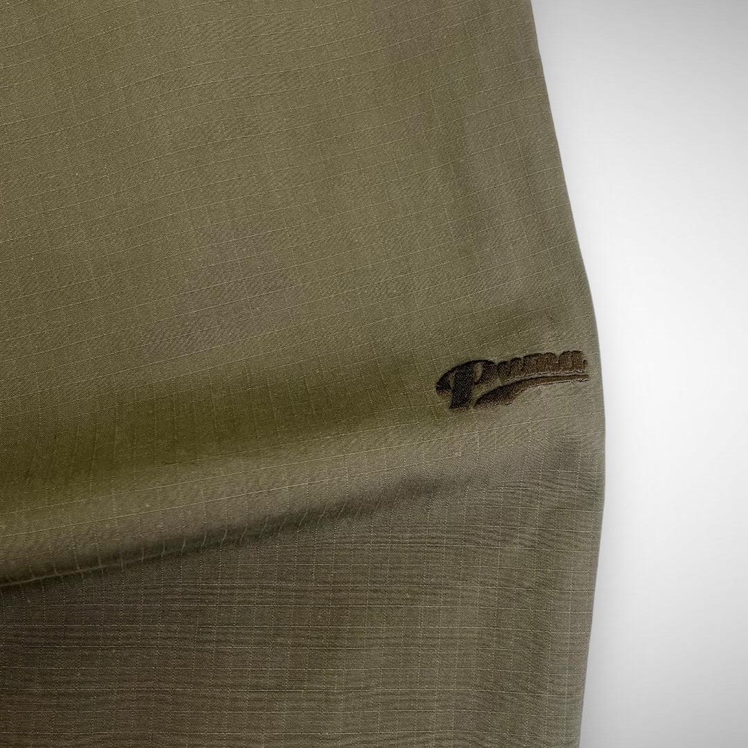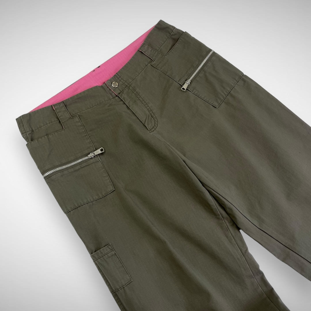 Ripstop construction in khaki colour featuring added pocket panel which functions as dual compartments with a zip fastening, slide entry opening and brand-stamped metal emblem, additional smaller lighter/tools pockets and double flap pockets on the back, and lining in pink.