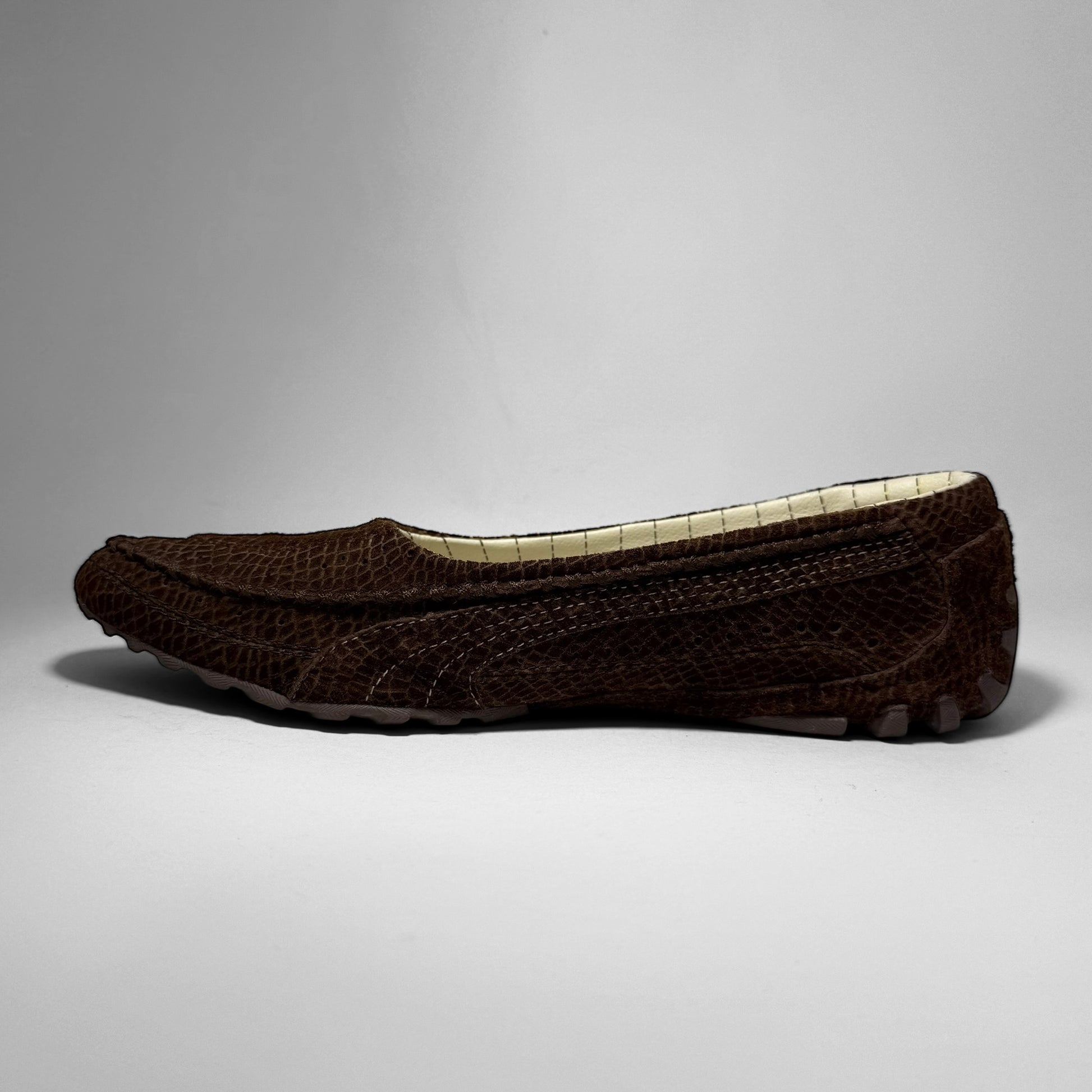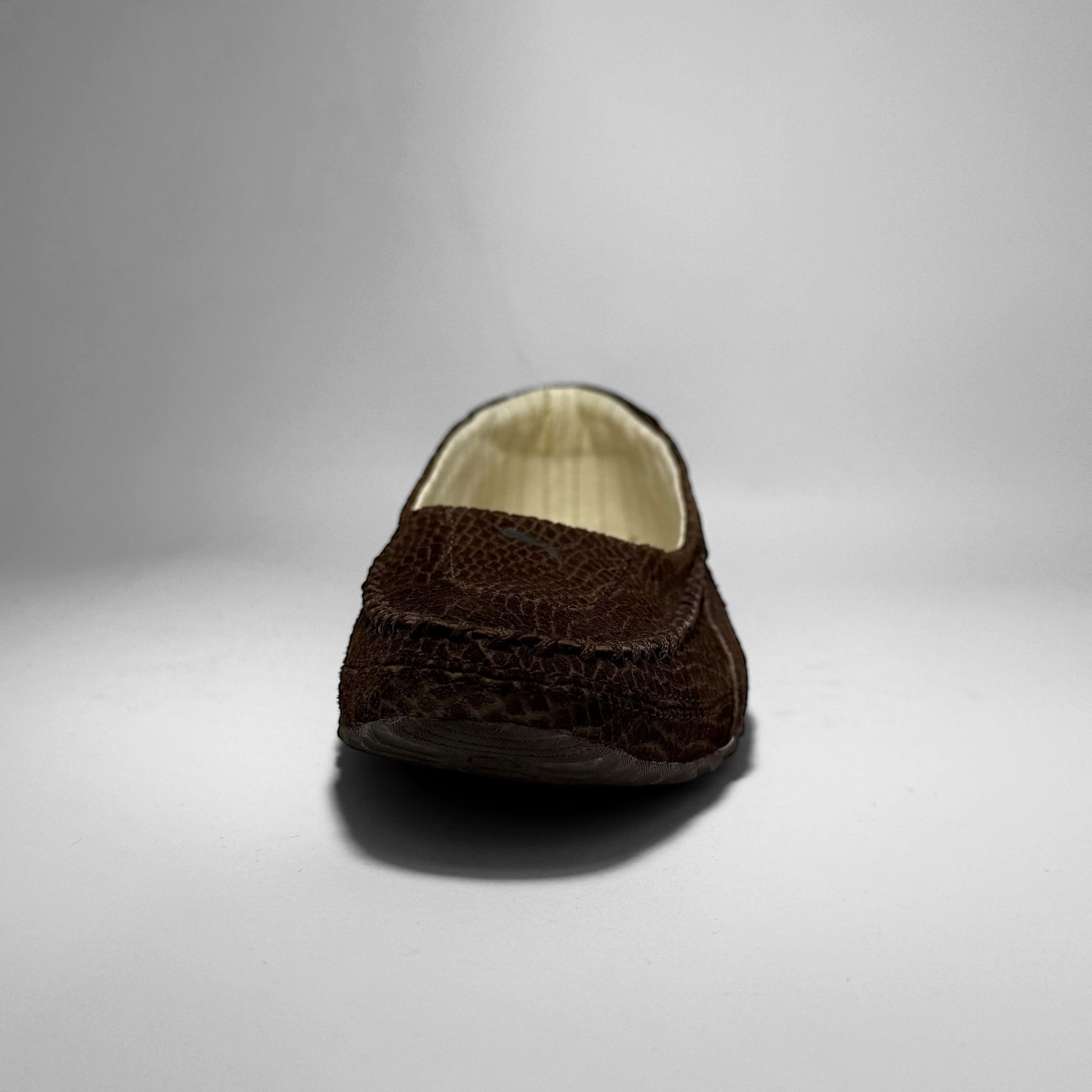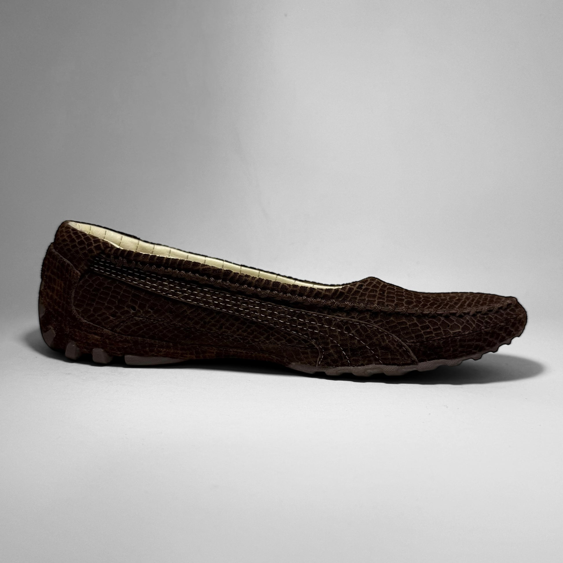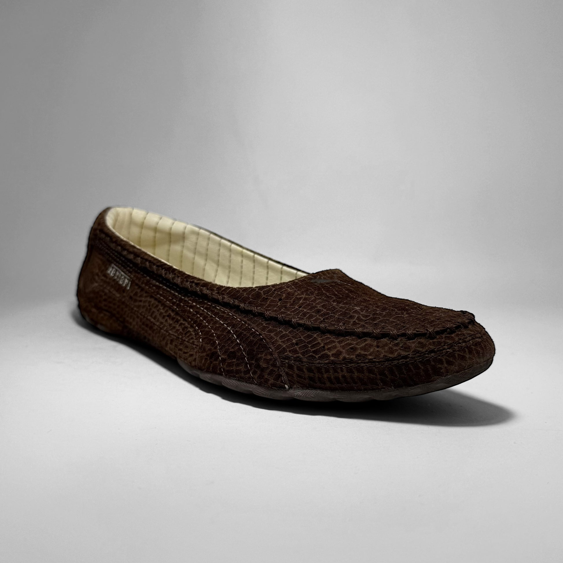 Crafted in brown croc textured suede with a low, driving-shoe silhouette. Features Ferrari branding on the side, a Puma logo on the heel, a cream quilt-lined interior, and a rubber split outsole with aggressive intakes throughout the heel.