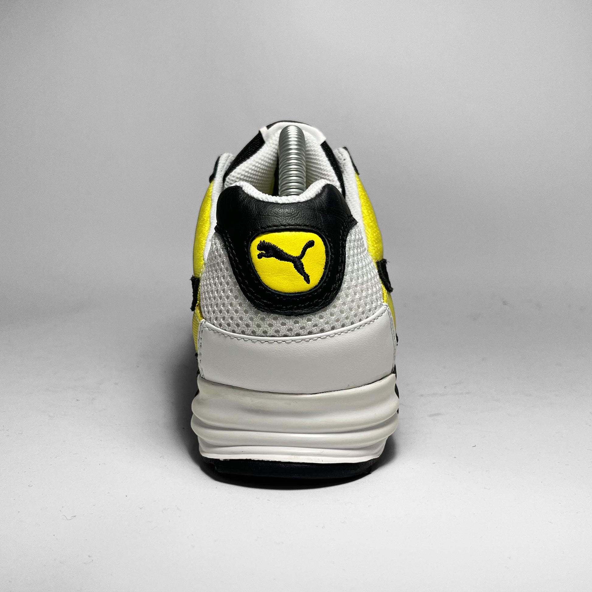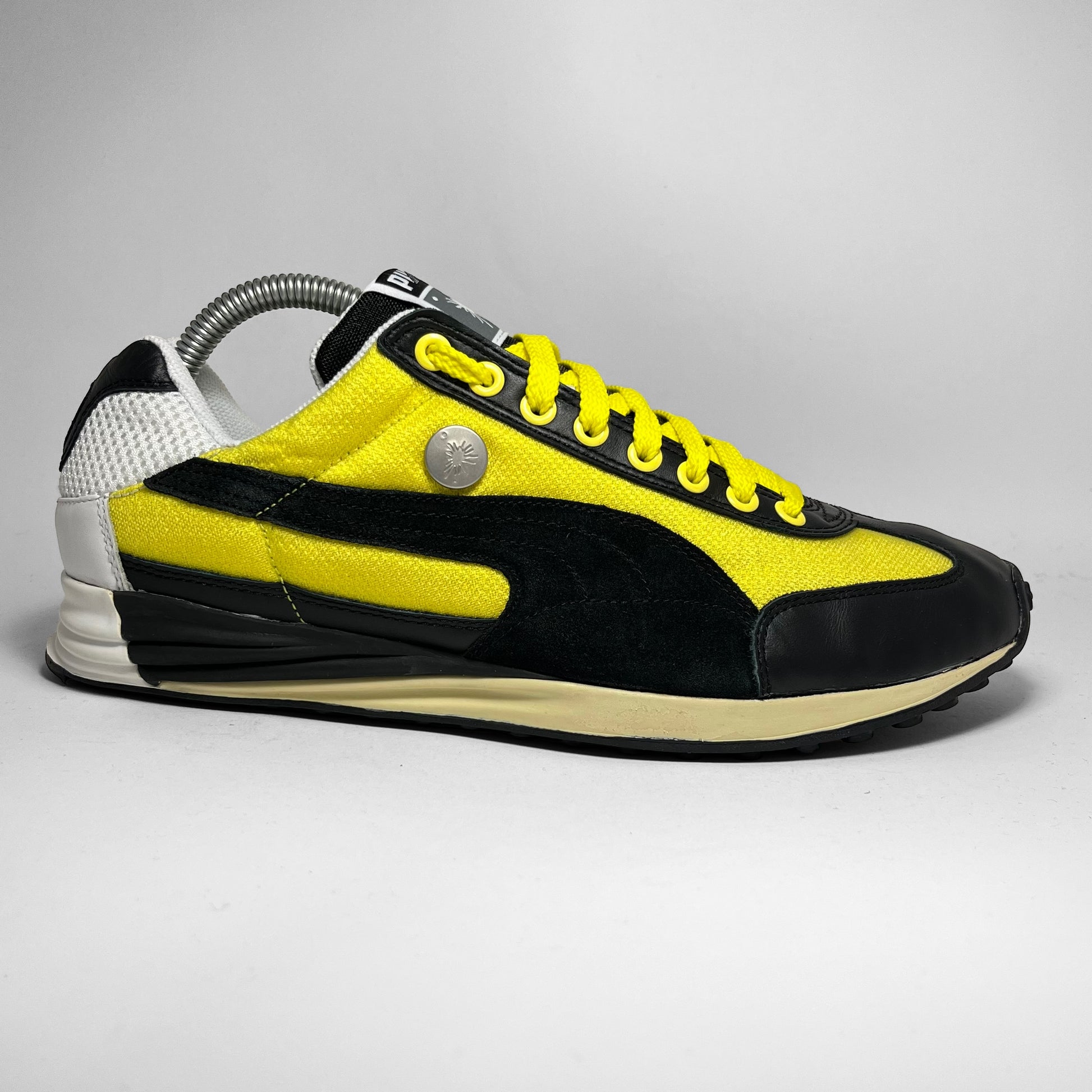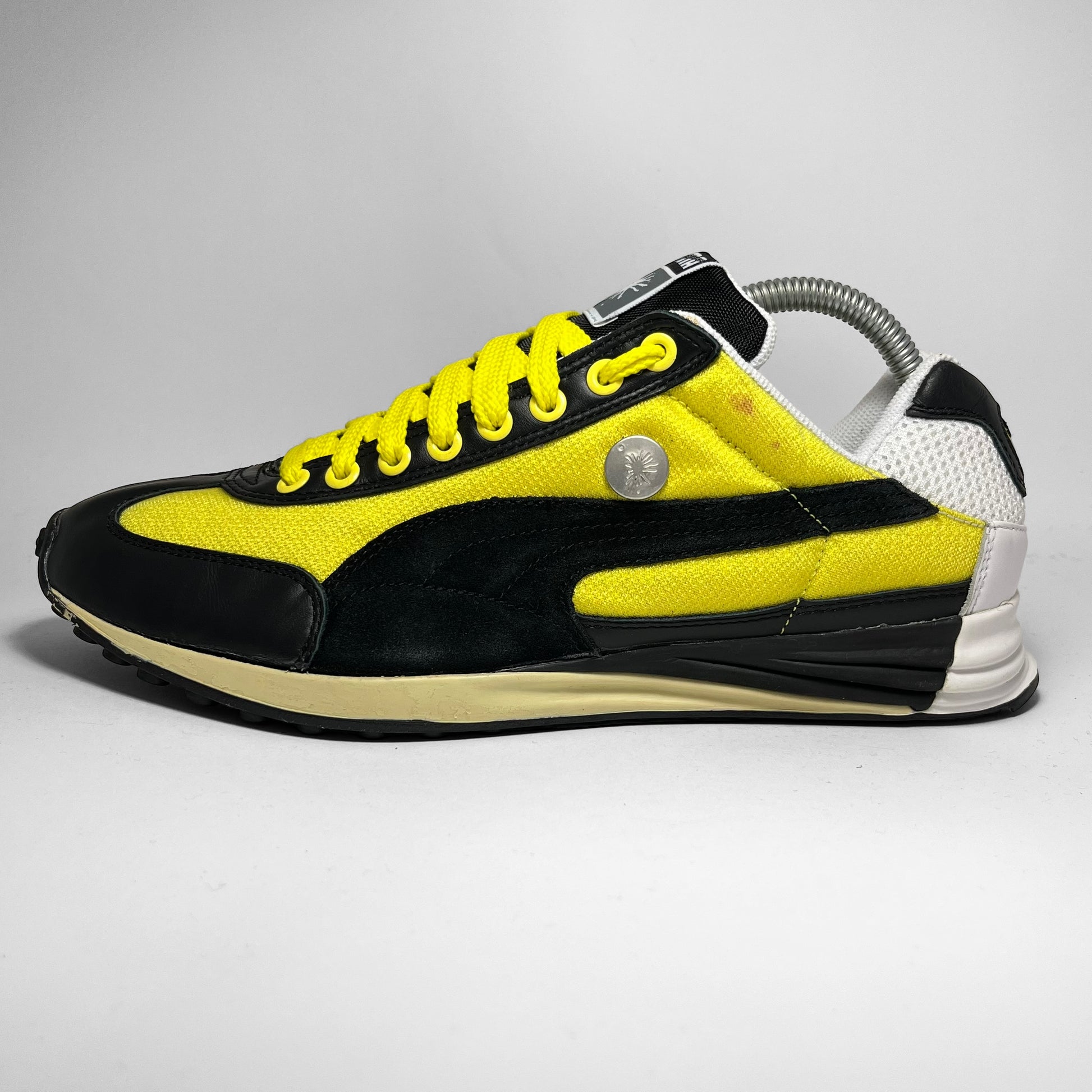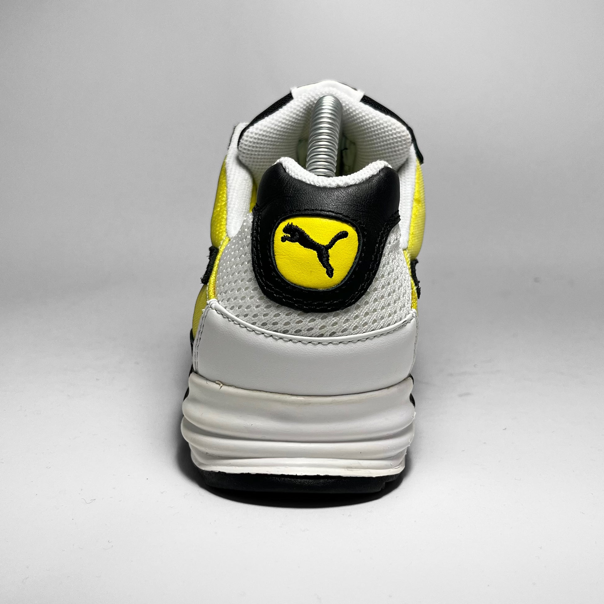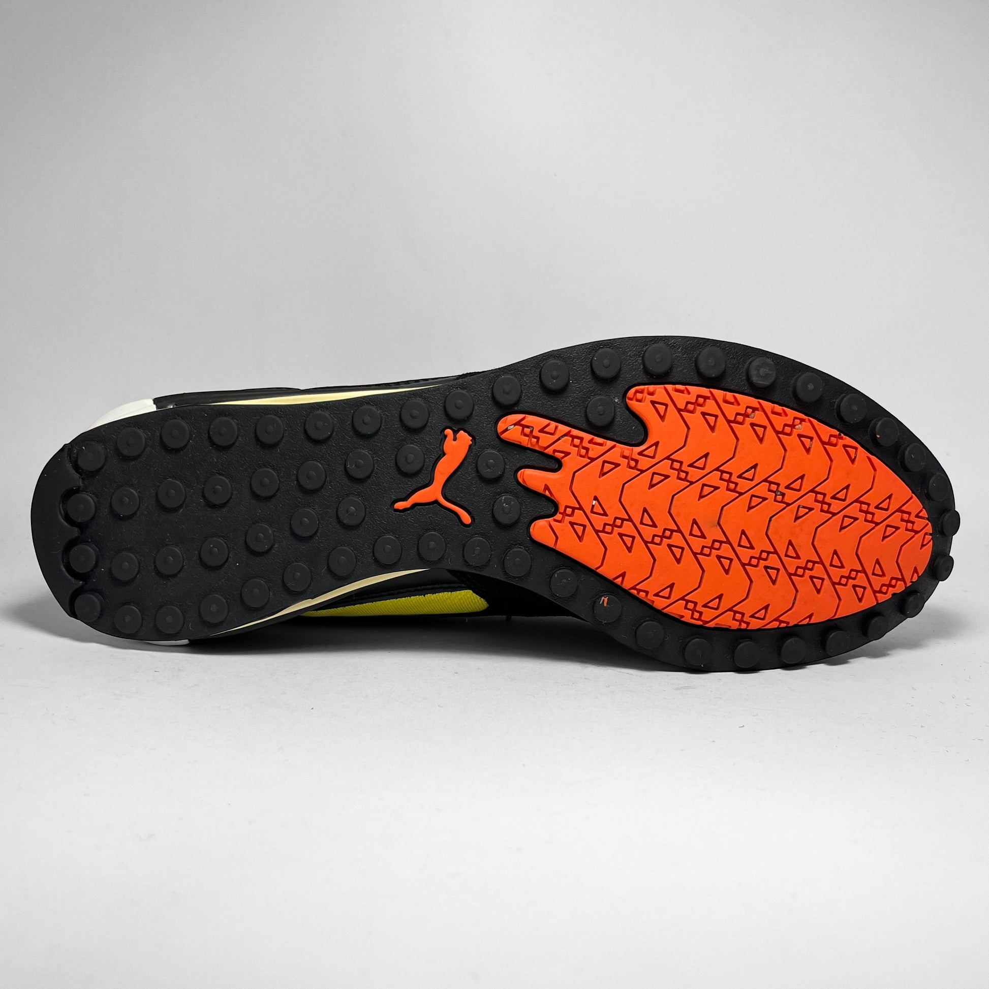 Breathable upper in yellow layered with black leather panels, suede Puma logo, MY3 metal engraved button and branded tag on tongue, mesh heel panel in white combined with a contrast leather panel in black & white, yellow embroidered heel-branding and unique stacked sole technique.