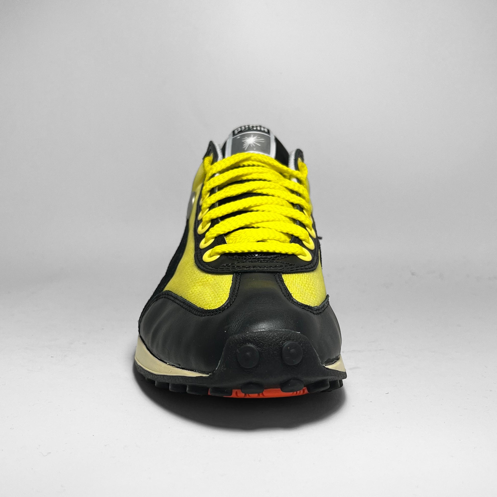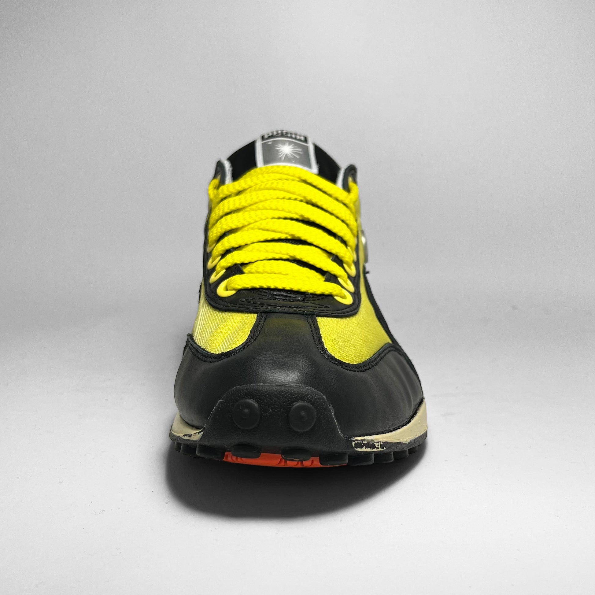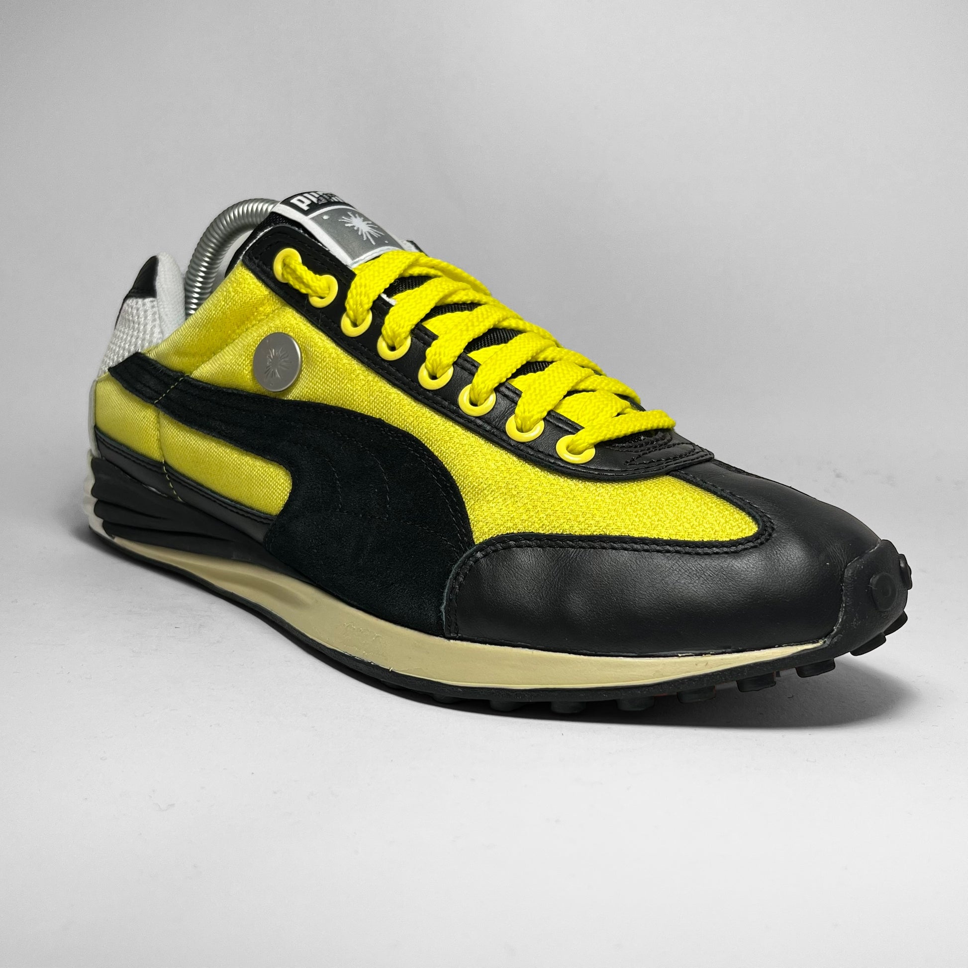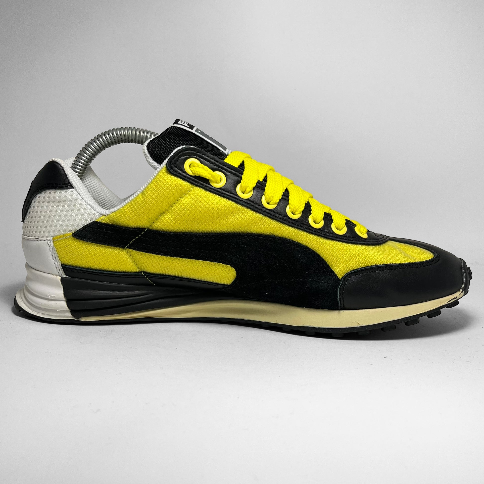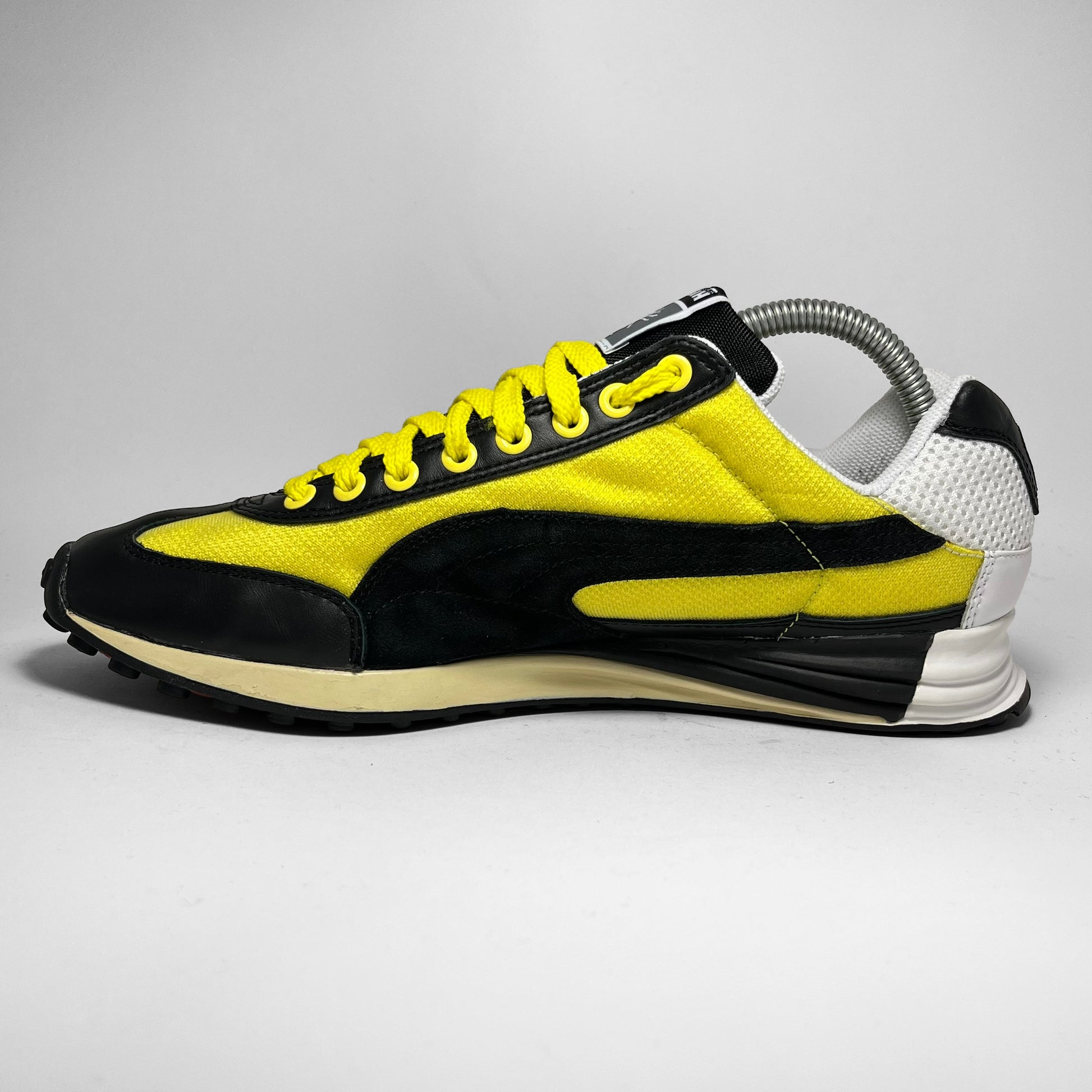 Breathable upper in yellow layered with black leather panels, suede Puma logo, MY3 metal engraved button and branded tag on tongue, mesh heel panel in white combined with a contrast leather panel in black & white, yellow embroidered heel-branding and unique stacked sole technique.