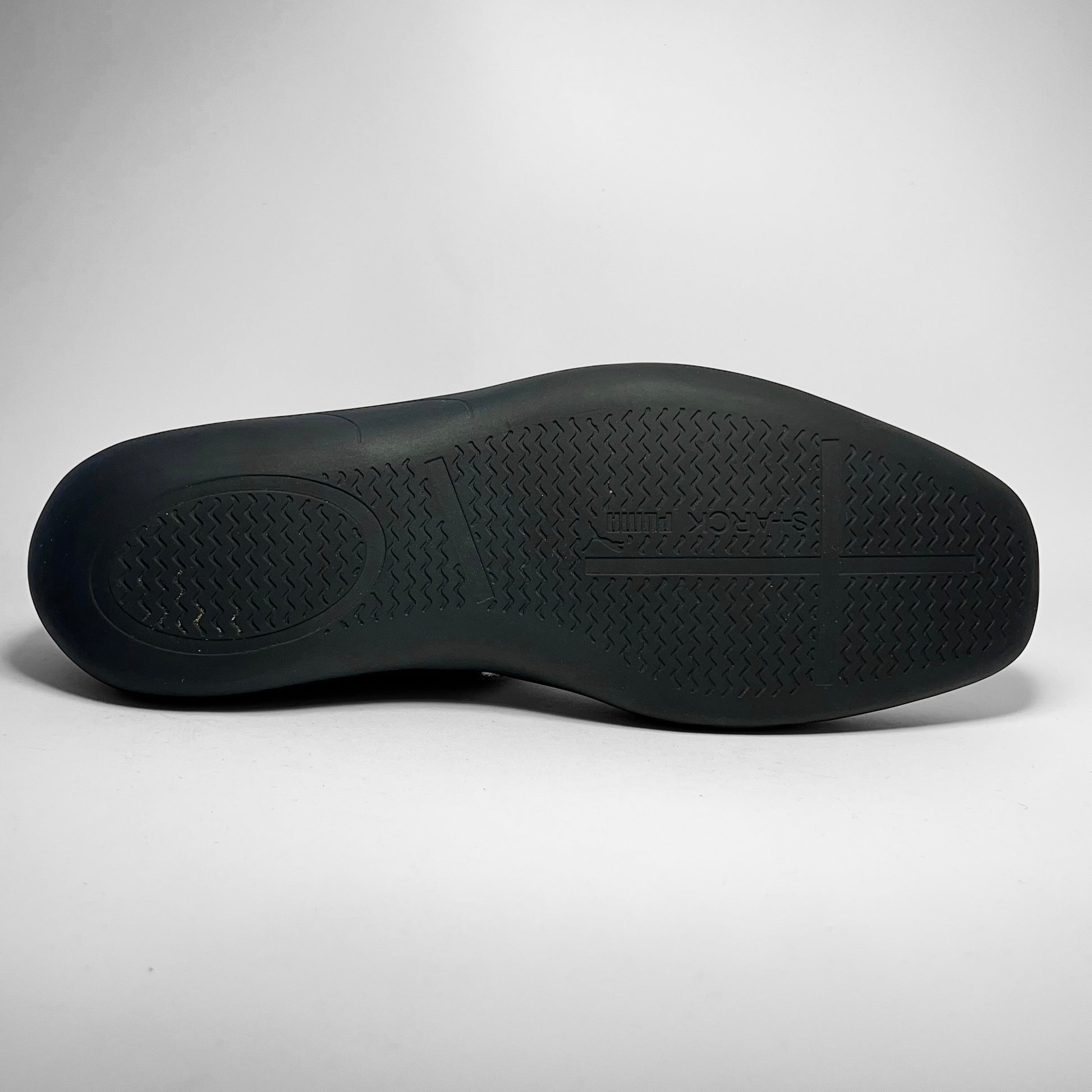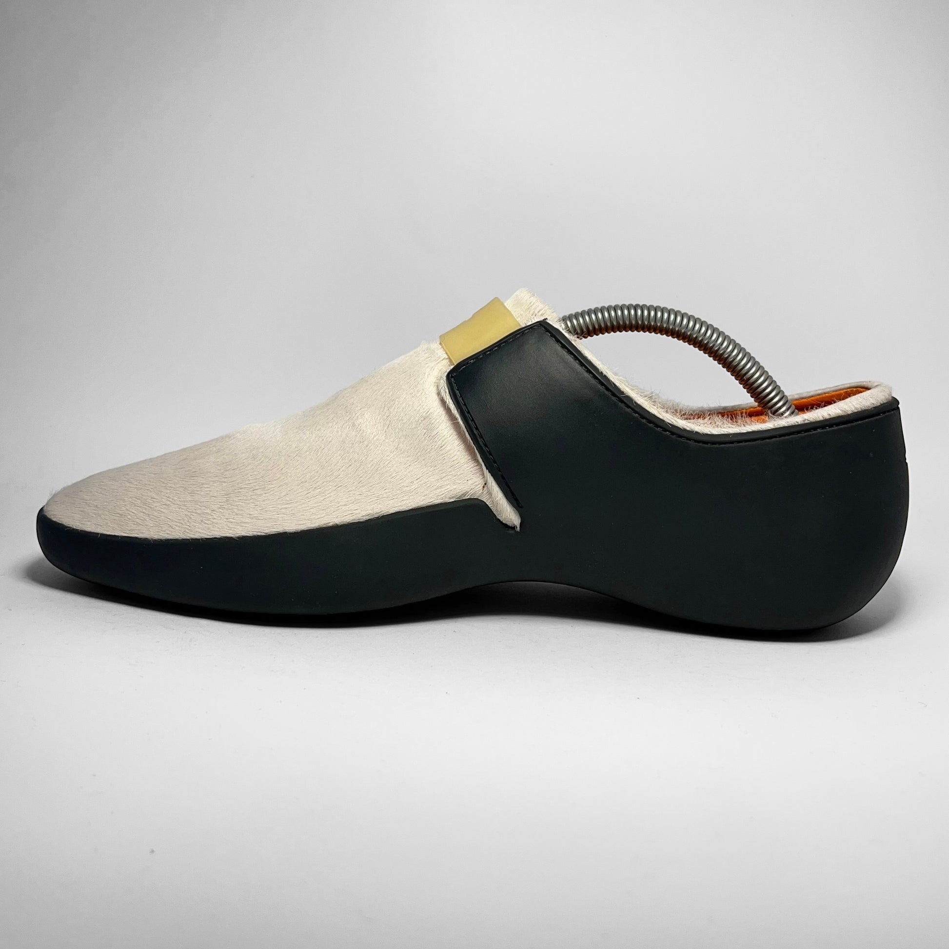 An ultra-minimal slip-on silhouette combining sleek black rubberized panels with a white pony-hair upper. Features a bright orange leather lining and subtle embossed Puma and Starck branding on both inside and outside, as well as the top rubber part.