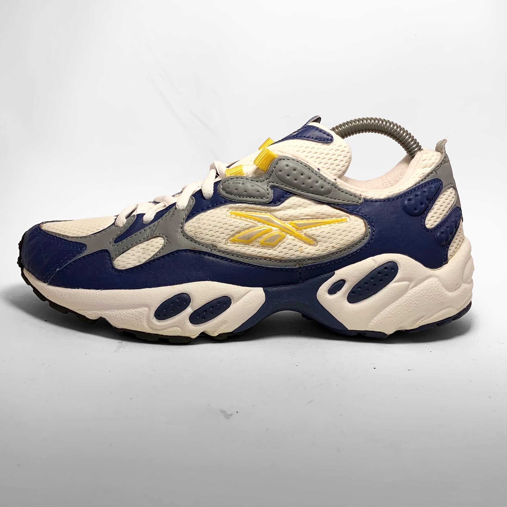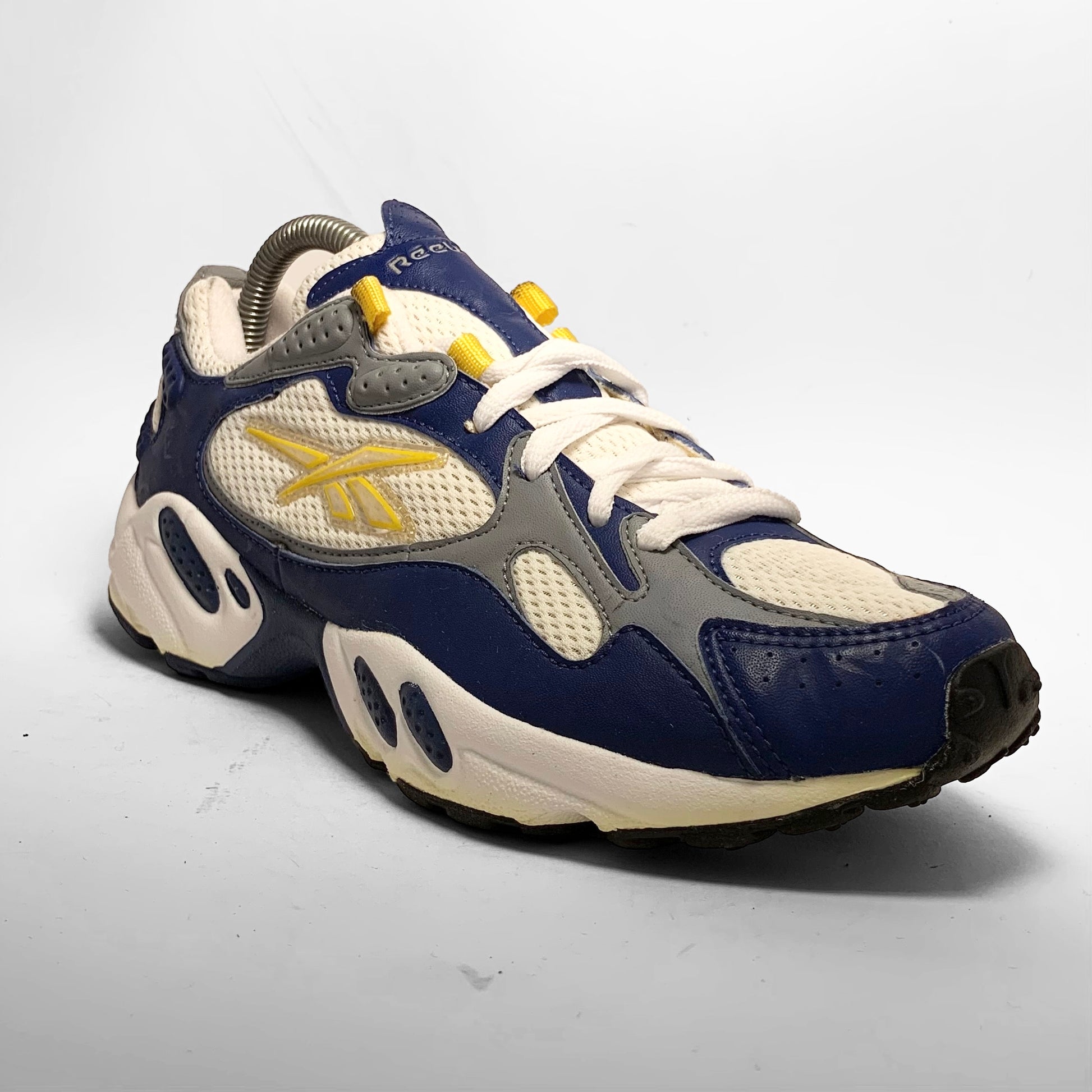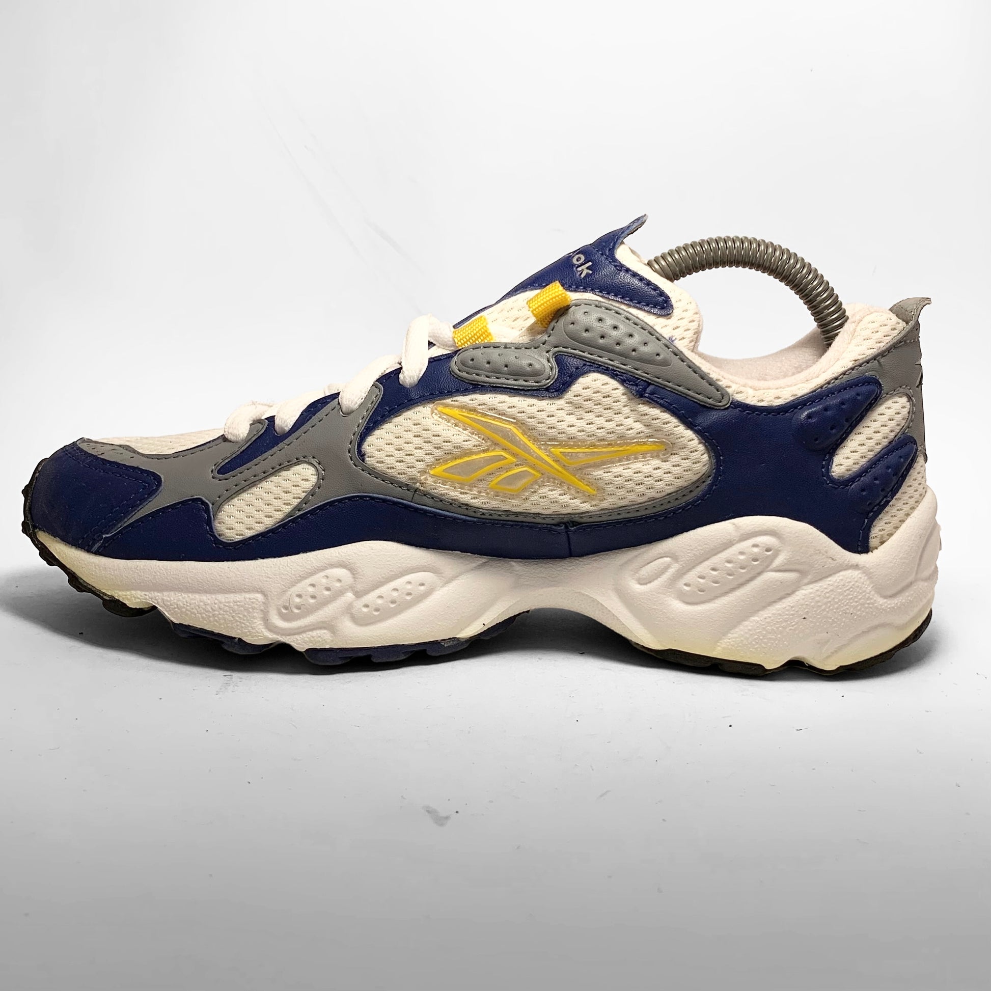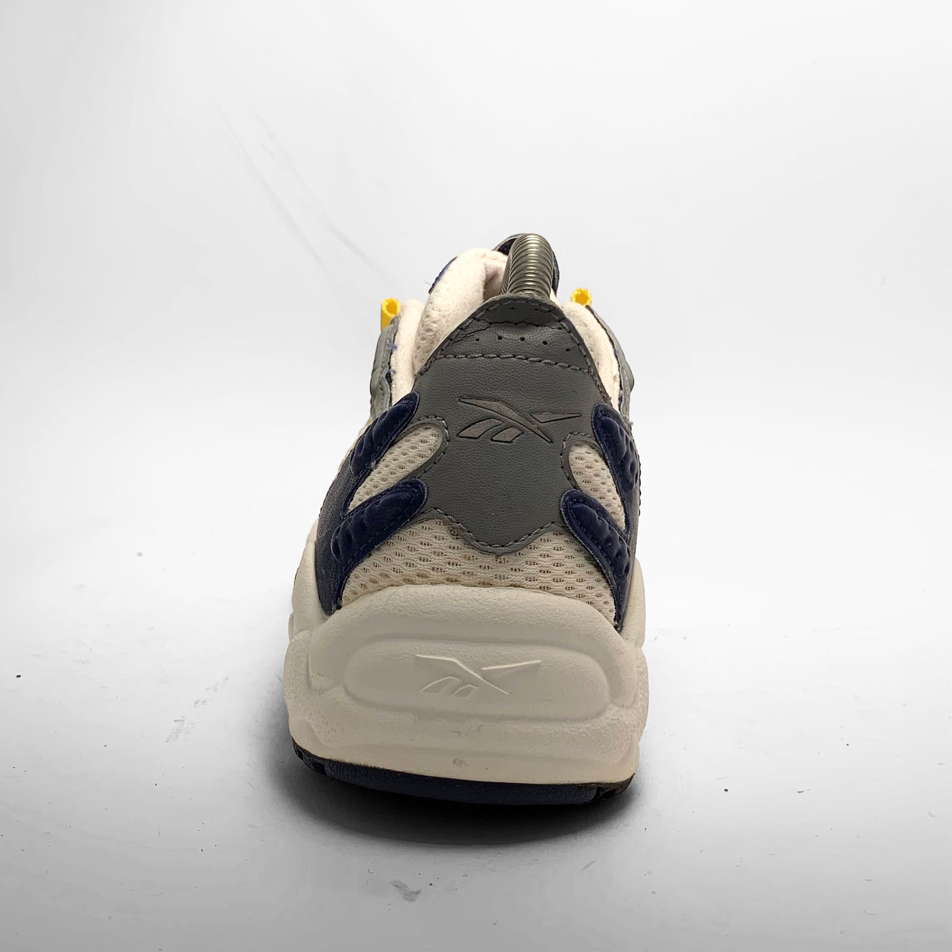 White mesh layered with navy and grey leather panels, perforated embossed details matching the midsole, yellow branding on the sides and upper eyelets together with a grey Reebok script on the tongue.