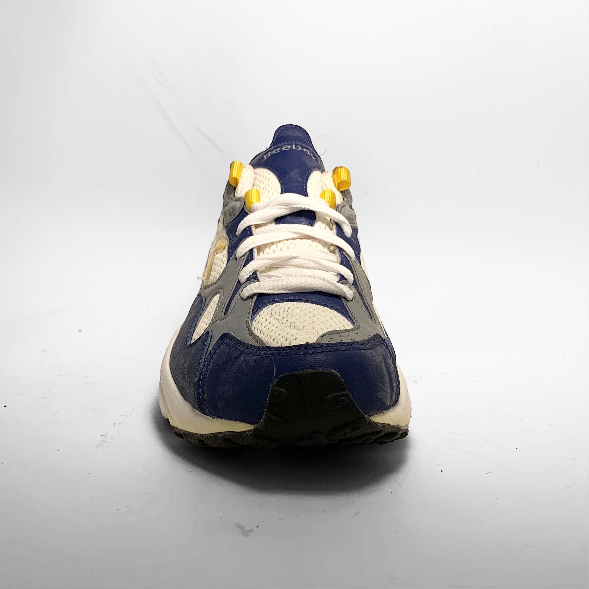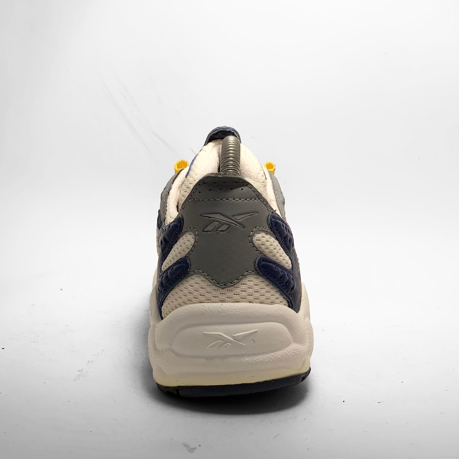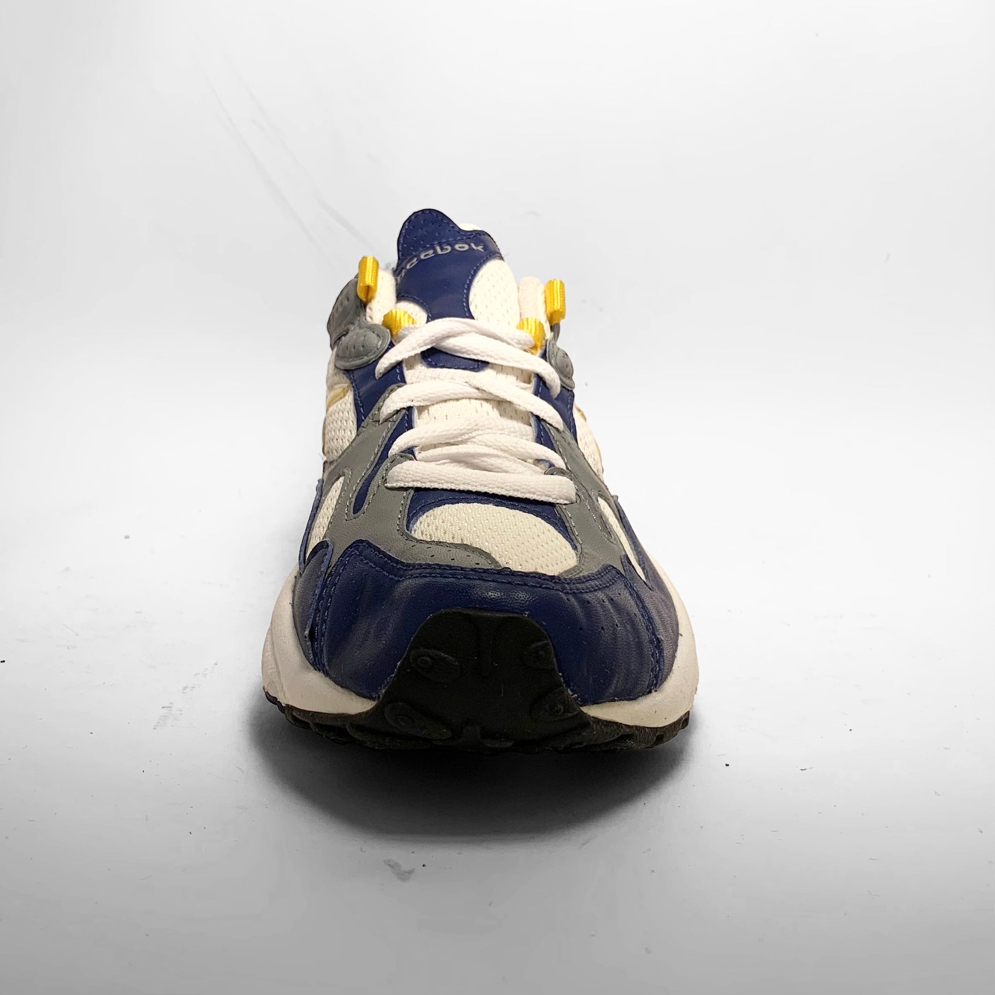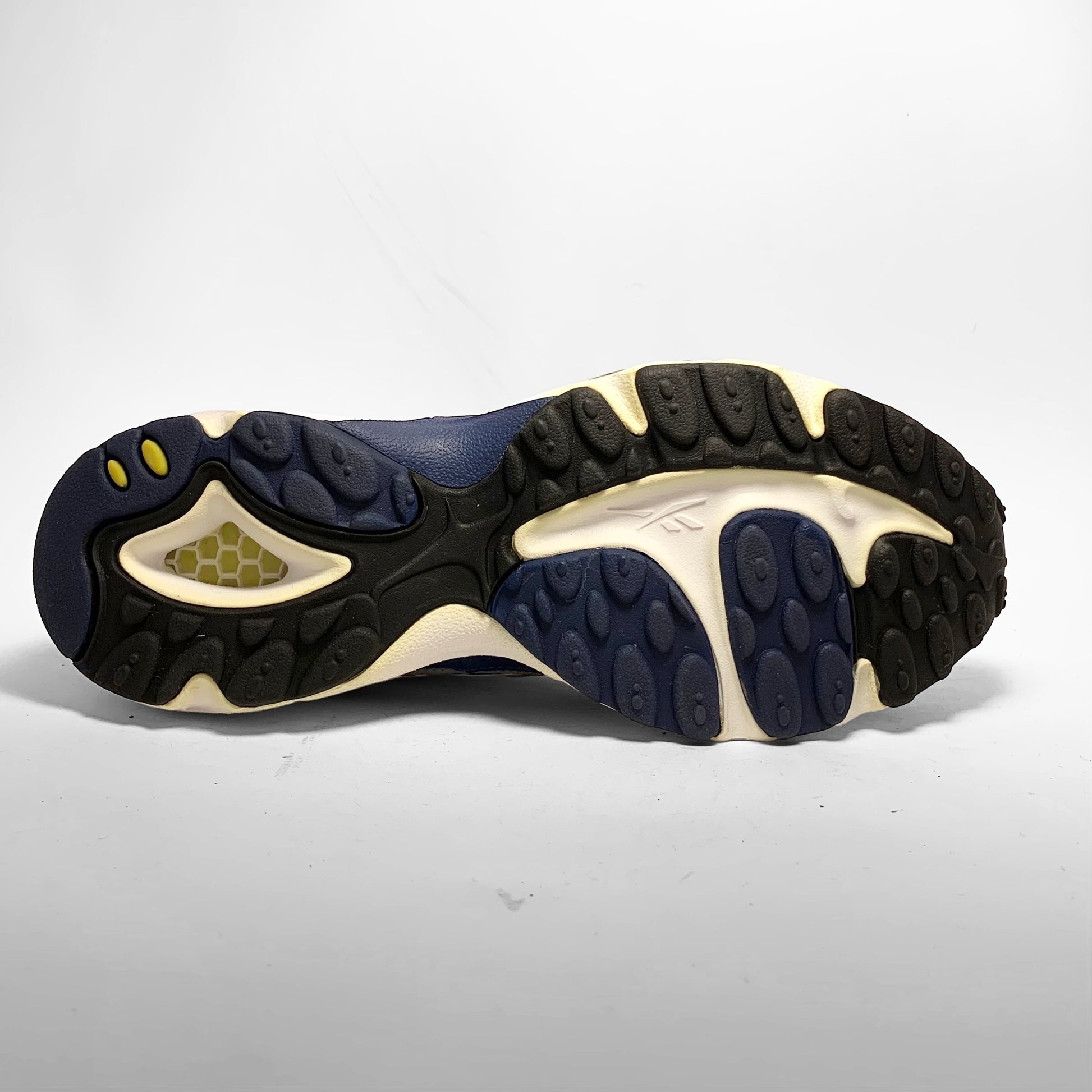 White mesh layered with navy and grey leather panels, perforated embossed details matching the midsole, yellow branding on the sides and upper eyelets together with a grey Reebok script on the tongue.
