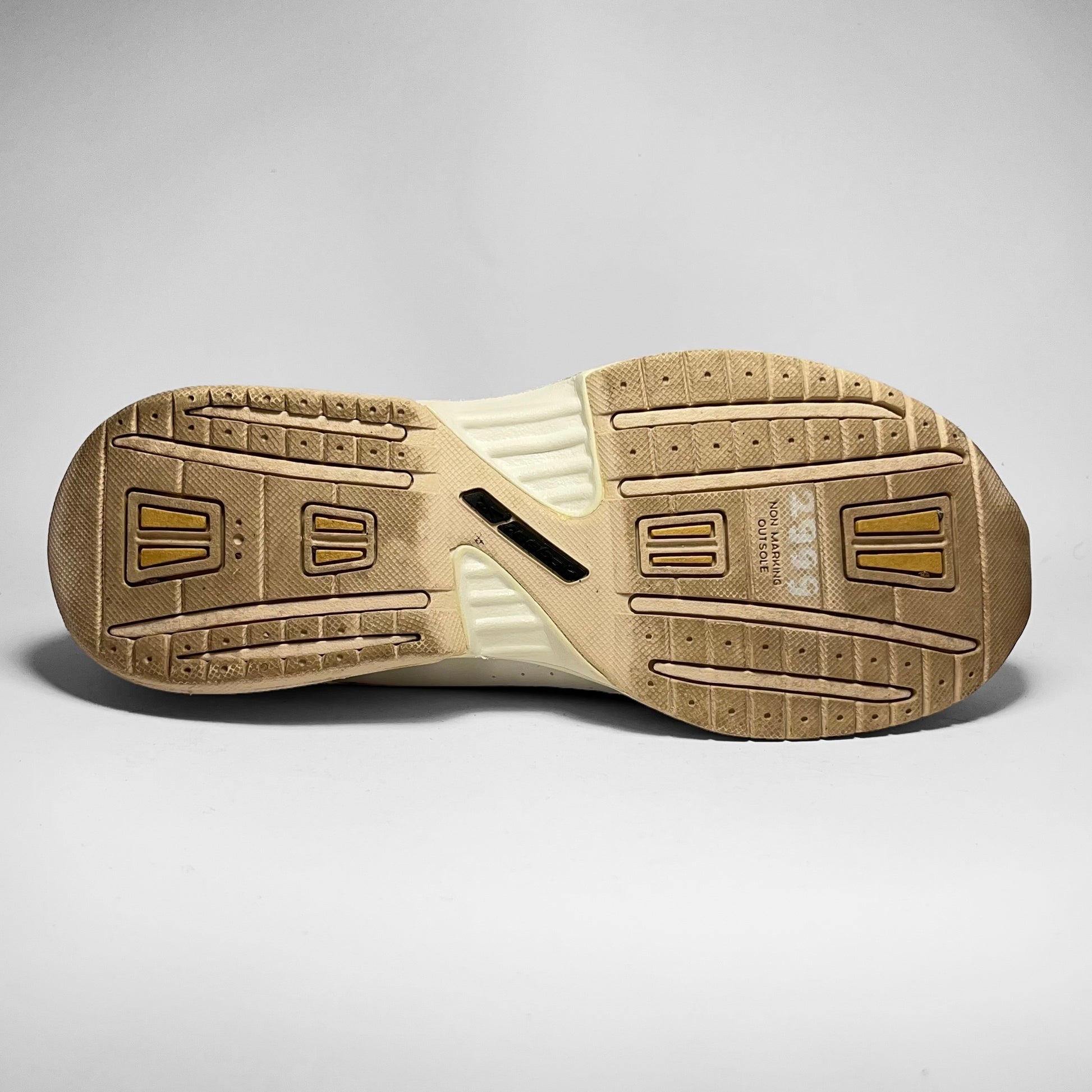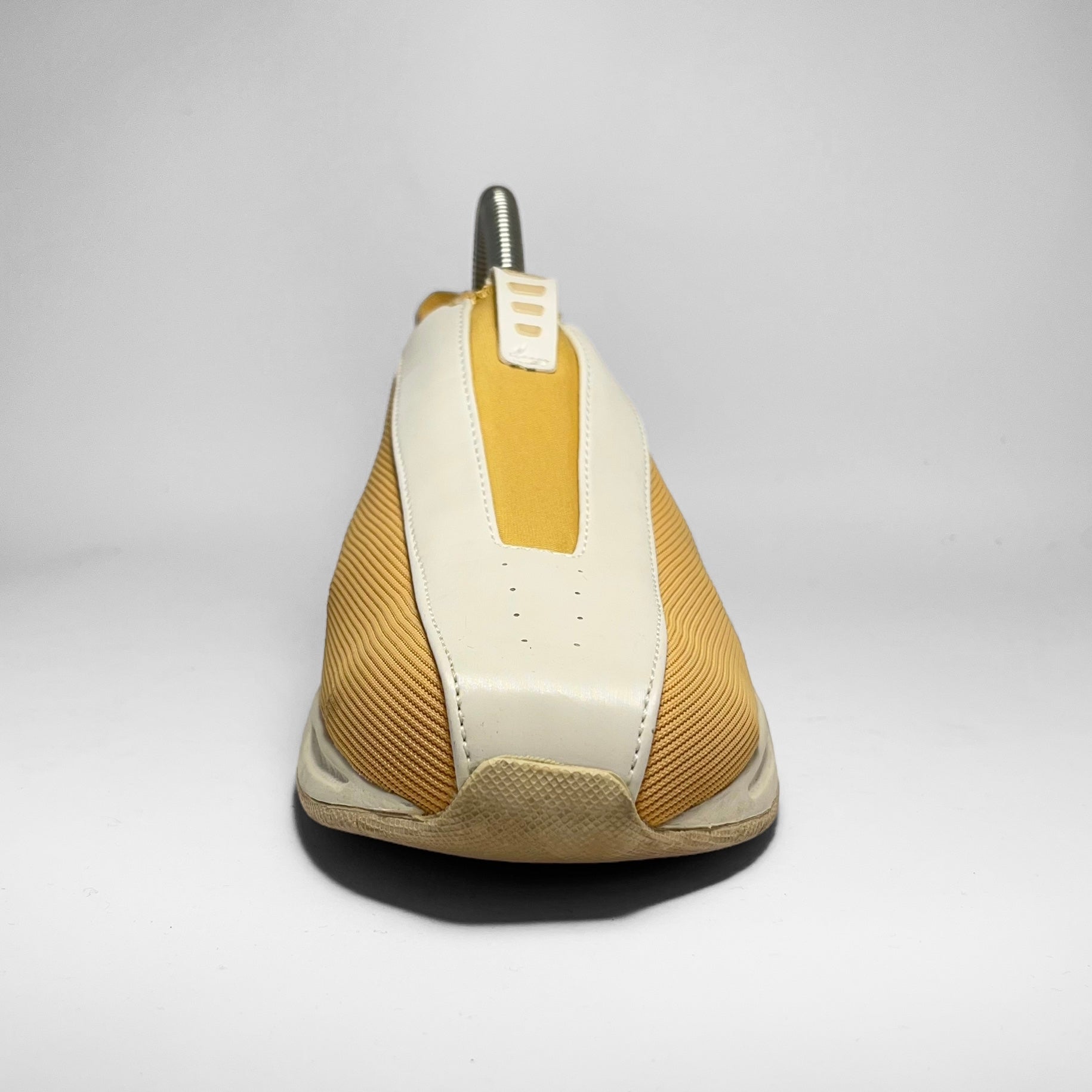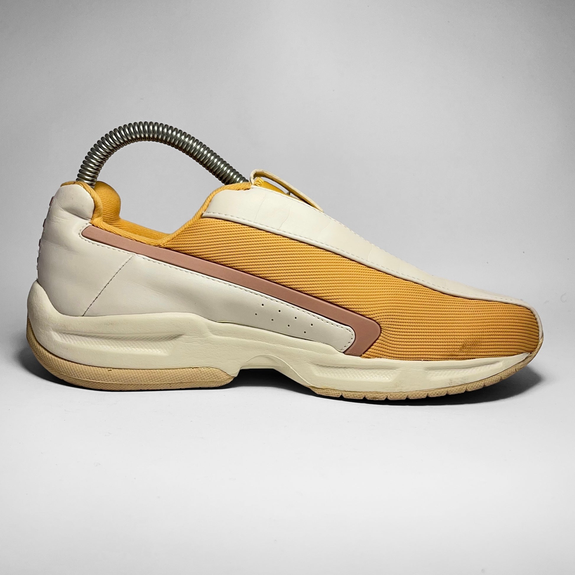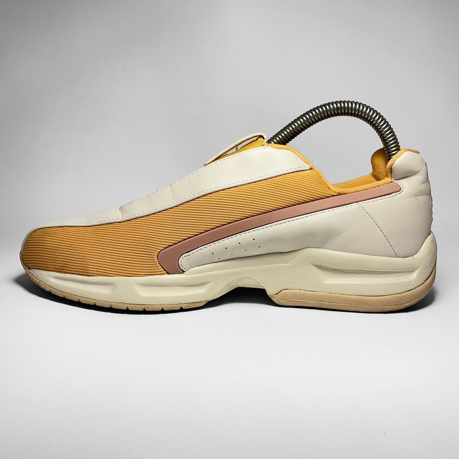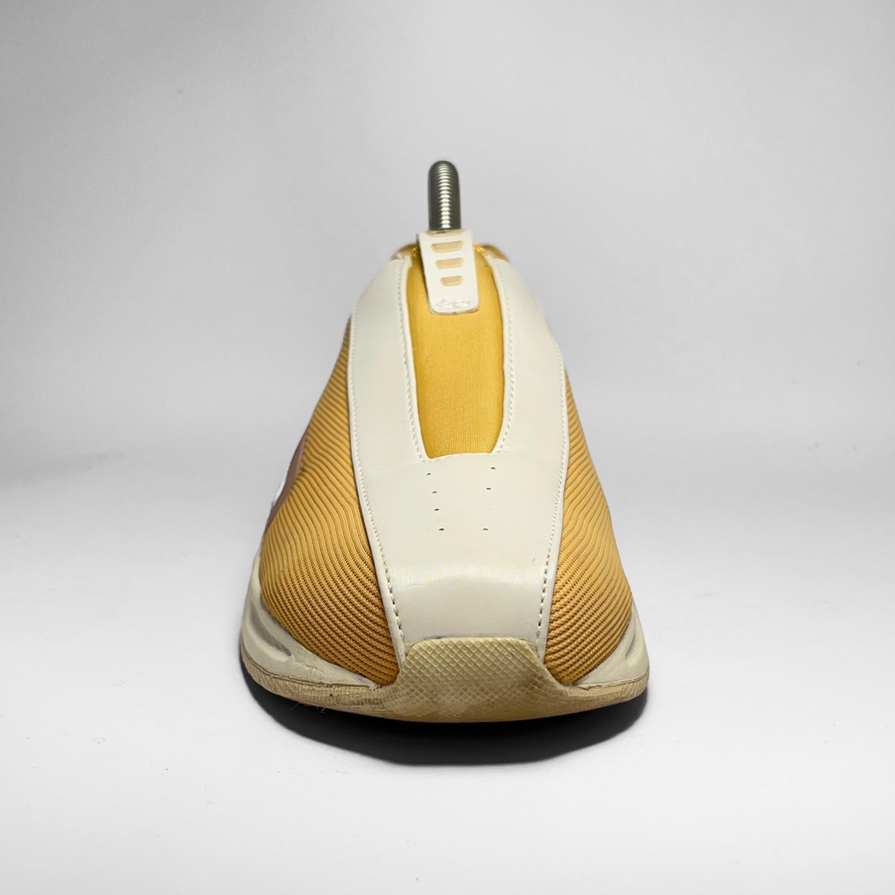 Yellow woven upper panels combined with white leather panel including perforated side and detailed heel, also seen on yellow neoprene tongue’s pull-tab and white leather mudguard separating the panels.