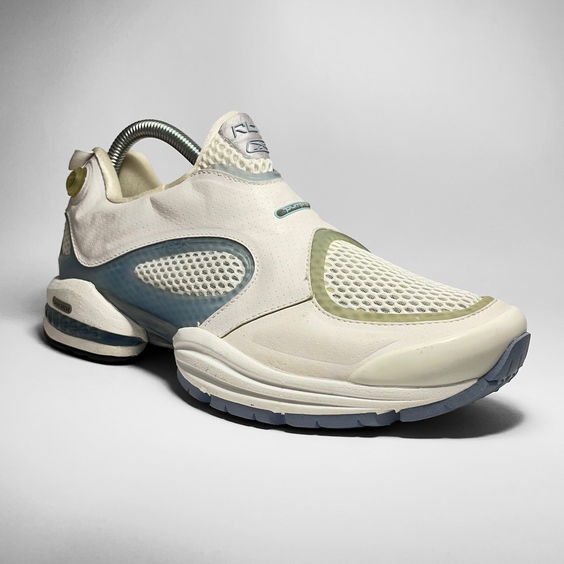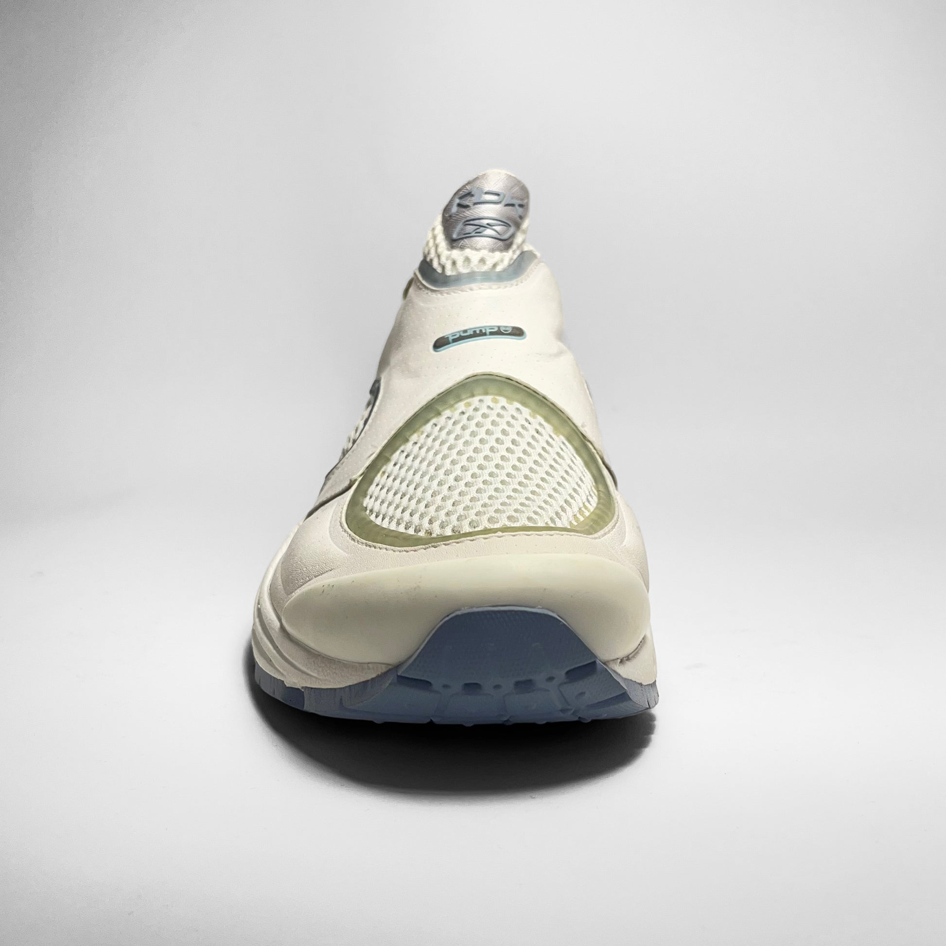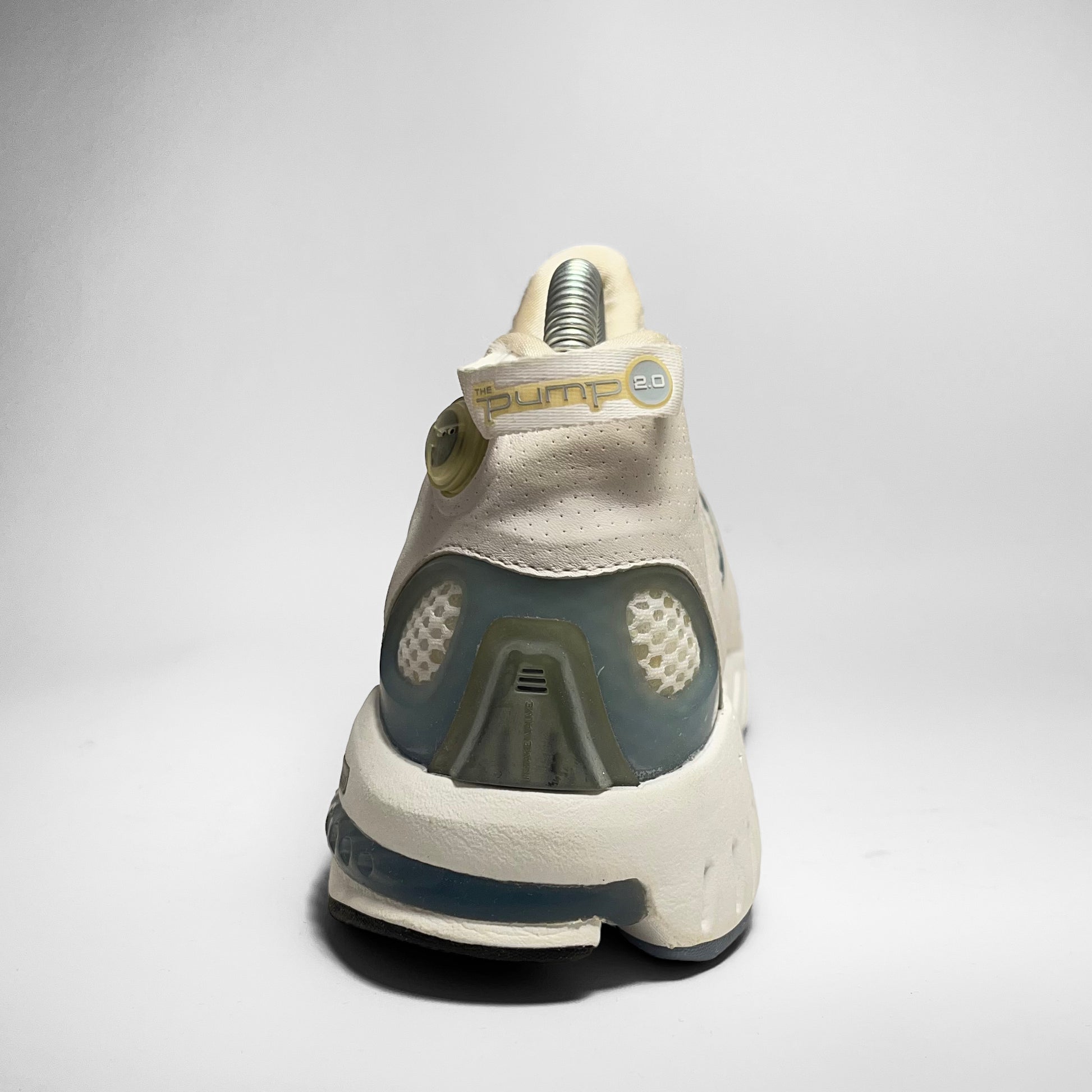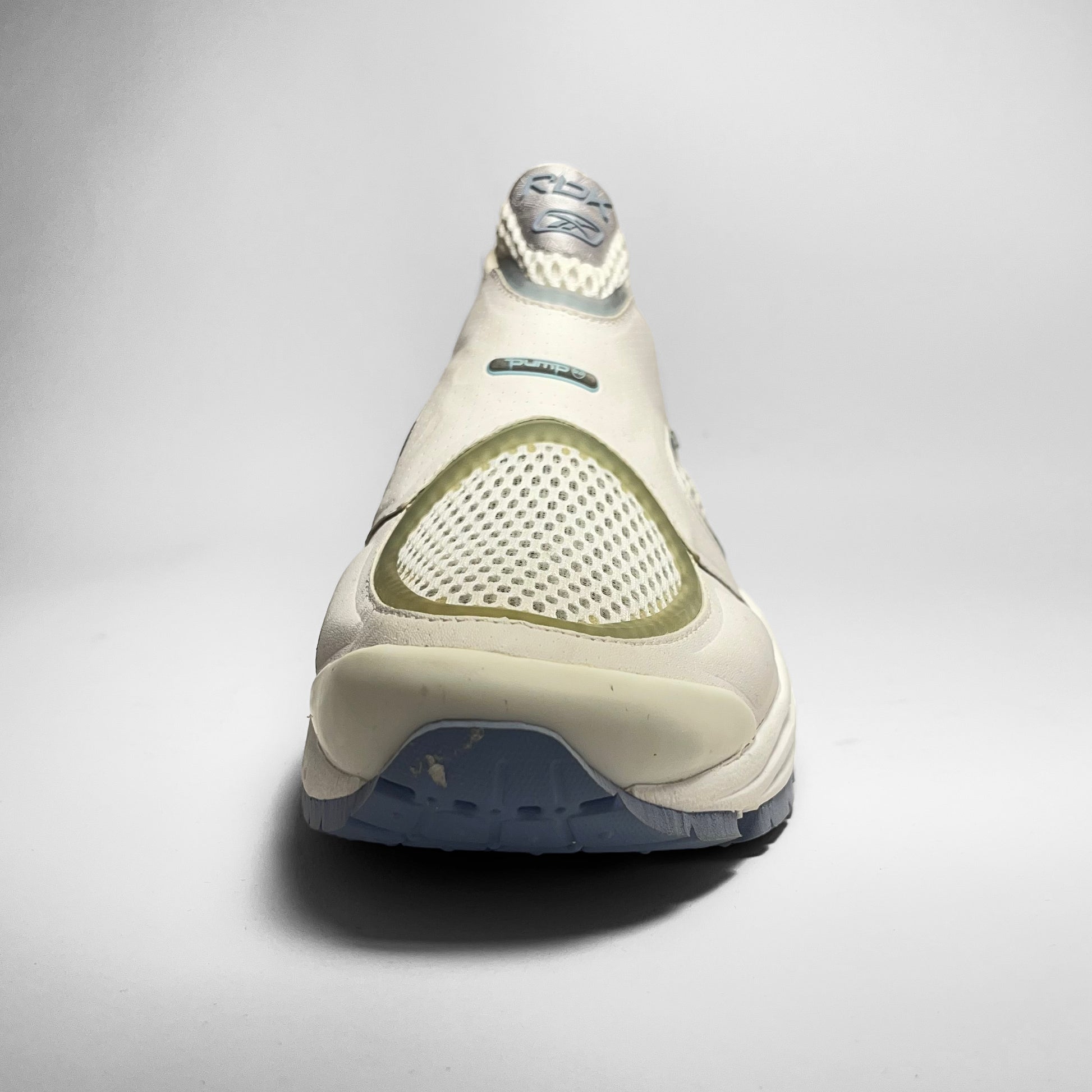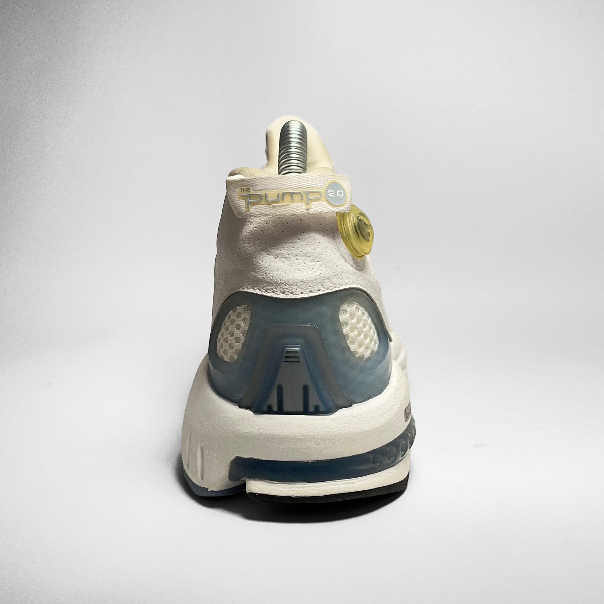 In white/ice blue colours featuring wide pattern mesh base including transparent ice blue parts and white leather panels overlayed, rubber mudguard, heel-tab, branding on tongue and top, rear cage to increase stability and pump 2.0 mechanism near sock collar to enhance comfort.