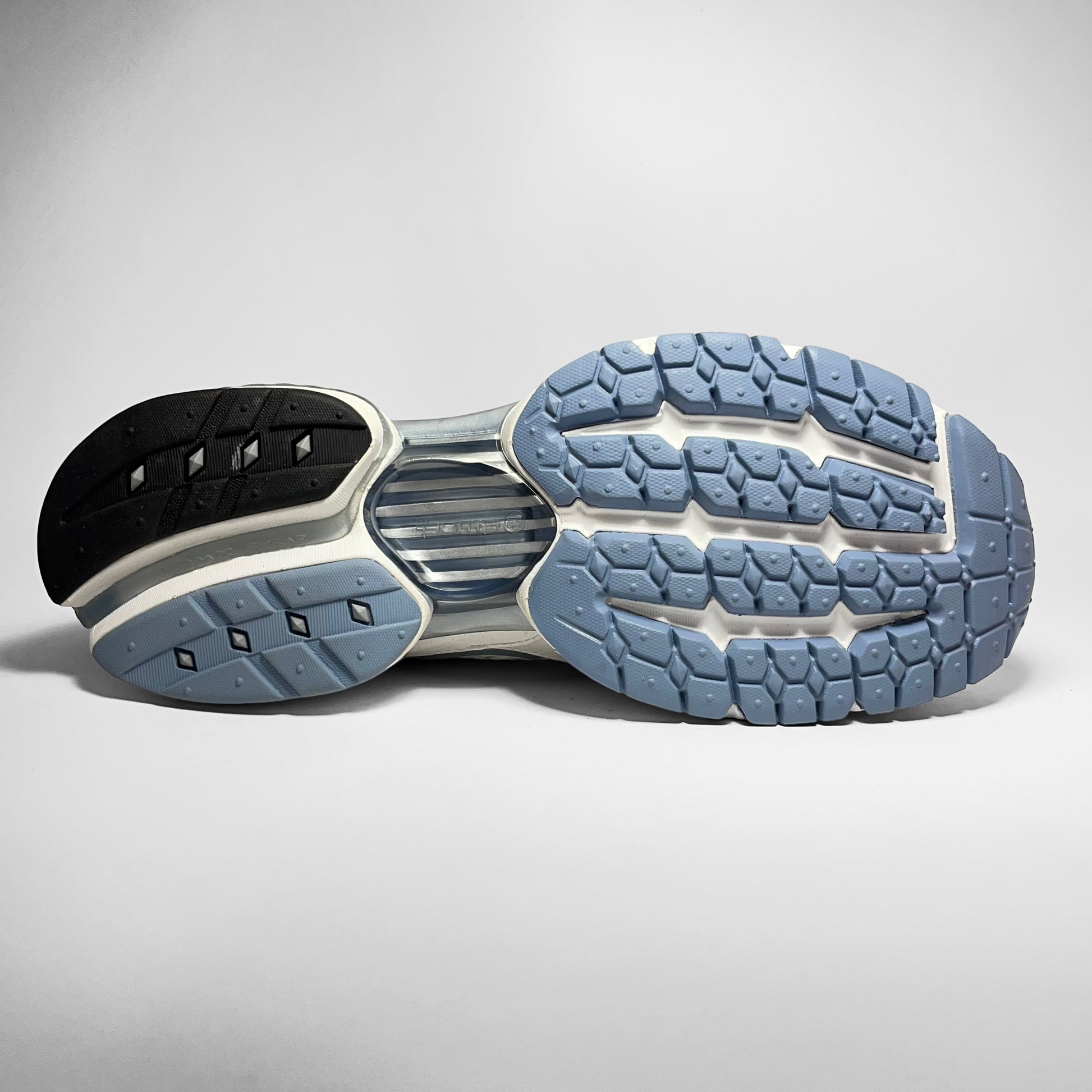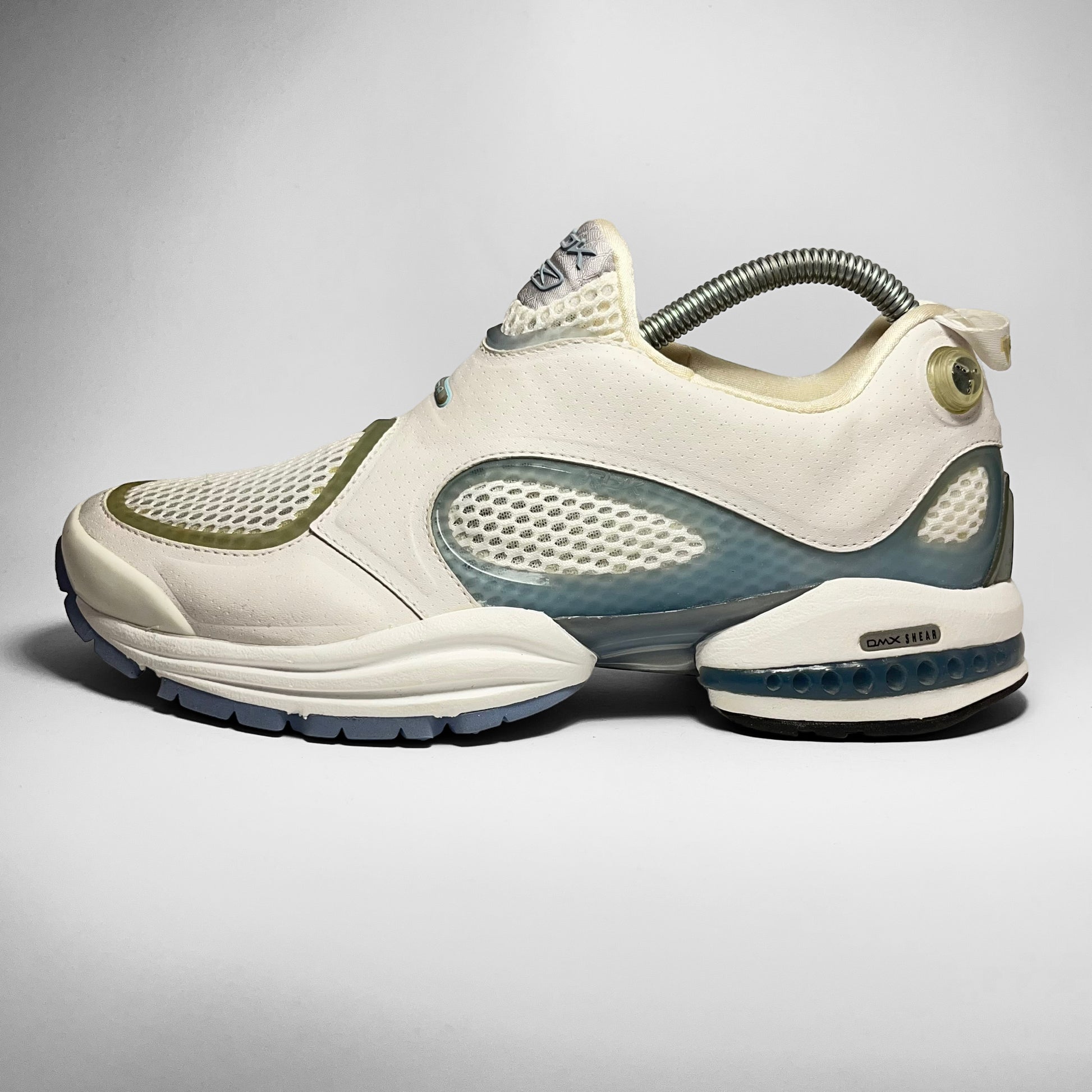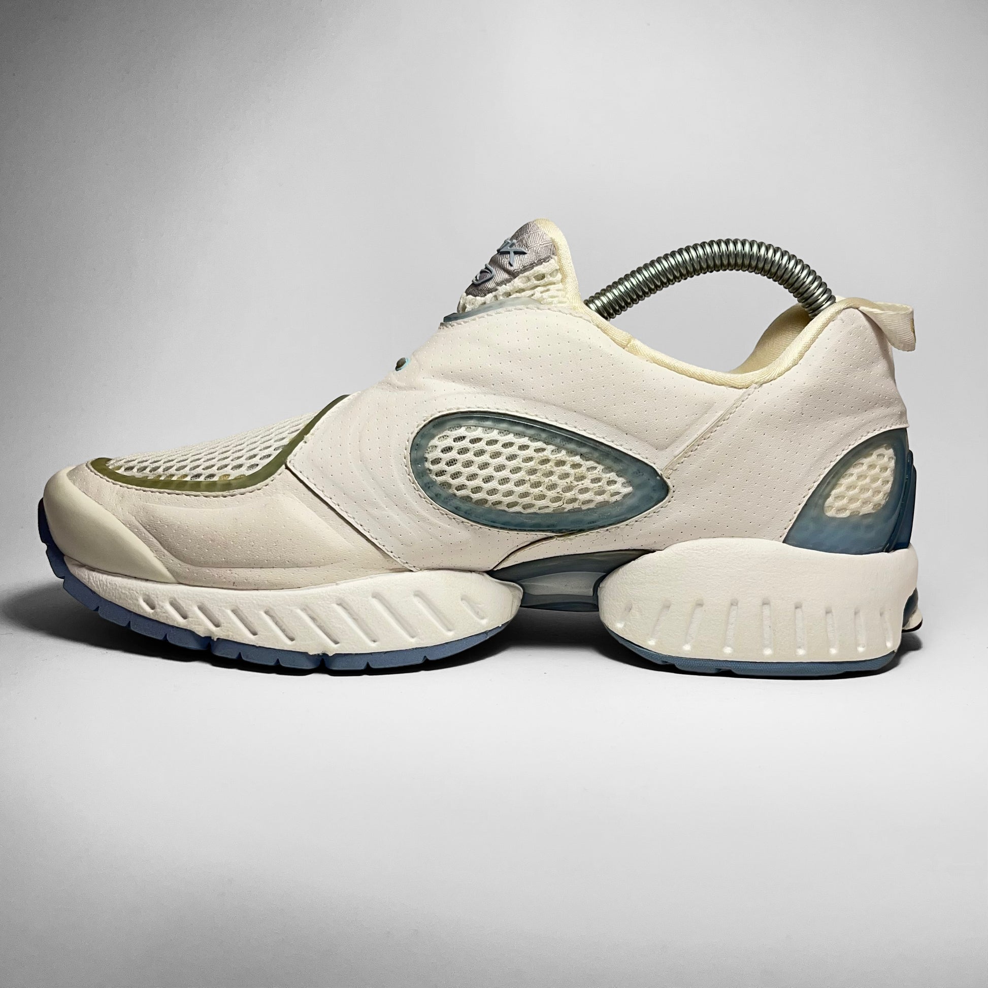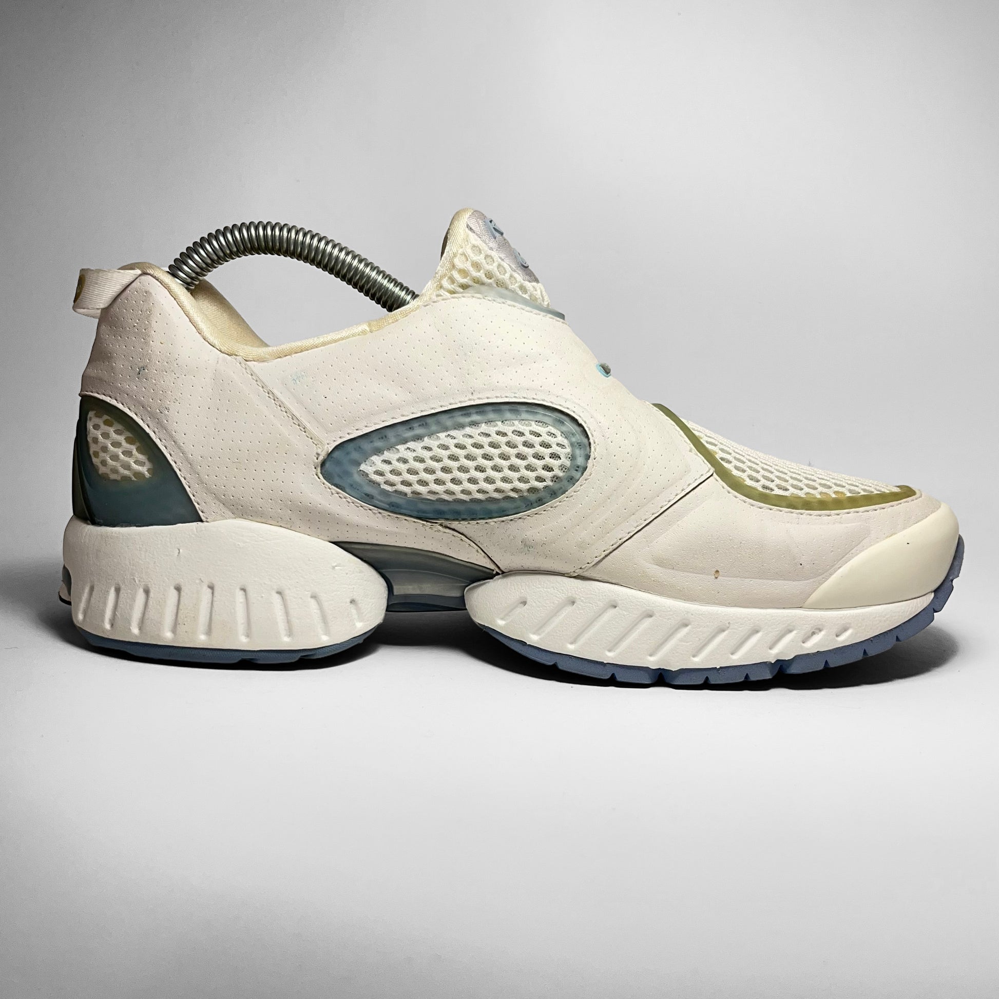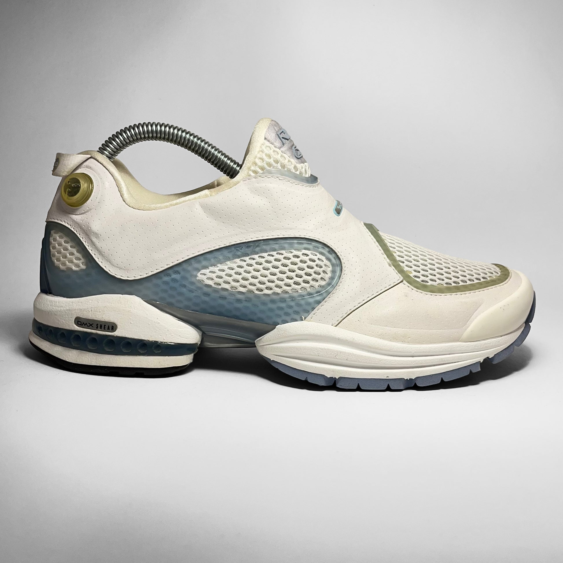 In white/ice blue colours featuring wide pattern mesh base including transparent ice blue parts and white leather panels overlayed, rubber mudguard, heel-tab, branding on tongue and top, rear cage to increase stability and pump 2.0 mechanism near sock collar to enhance comfort.