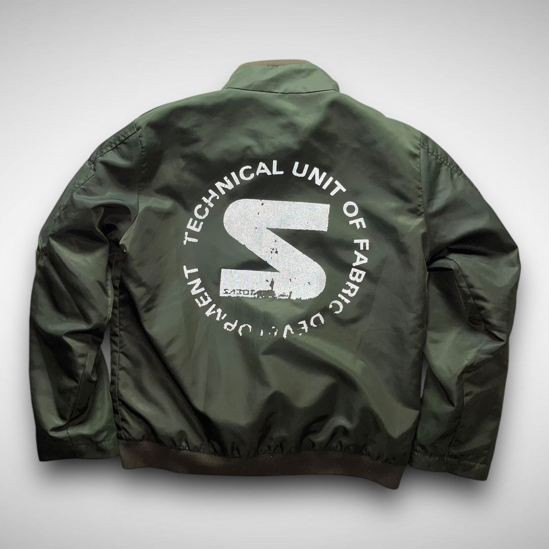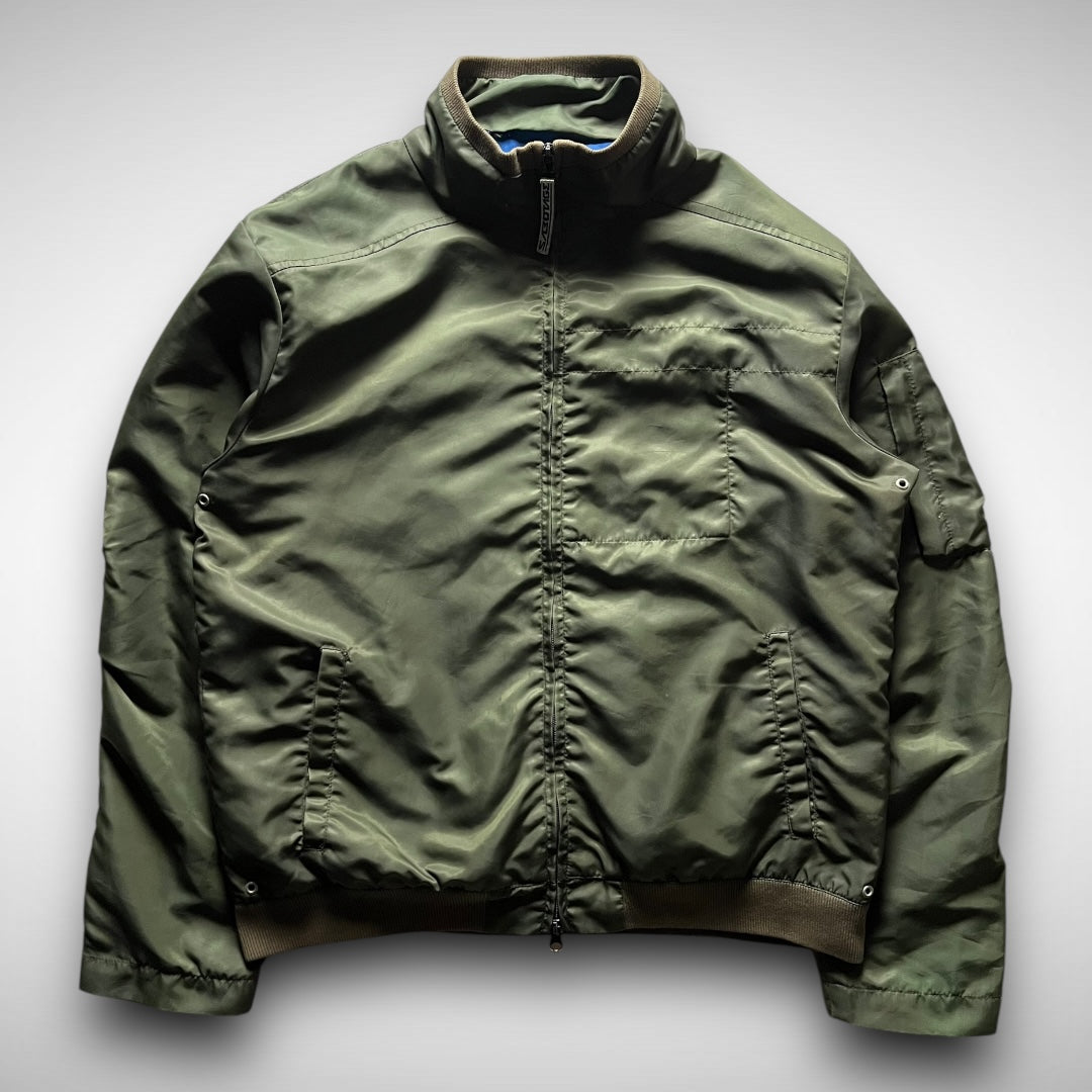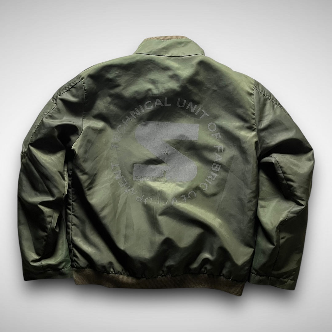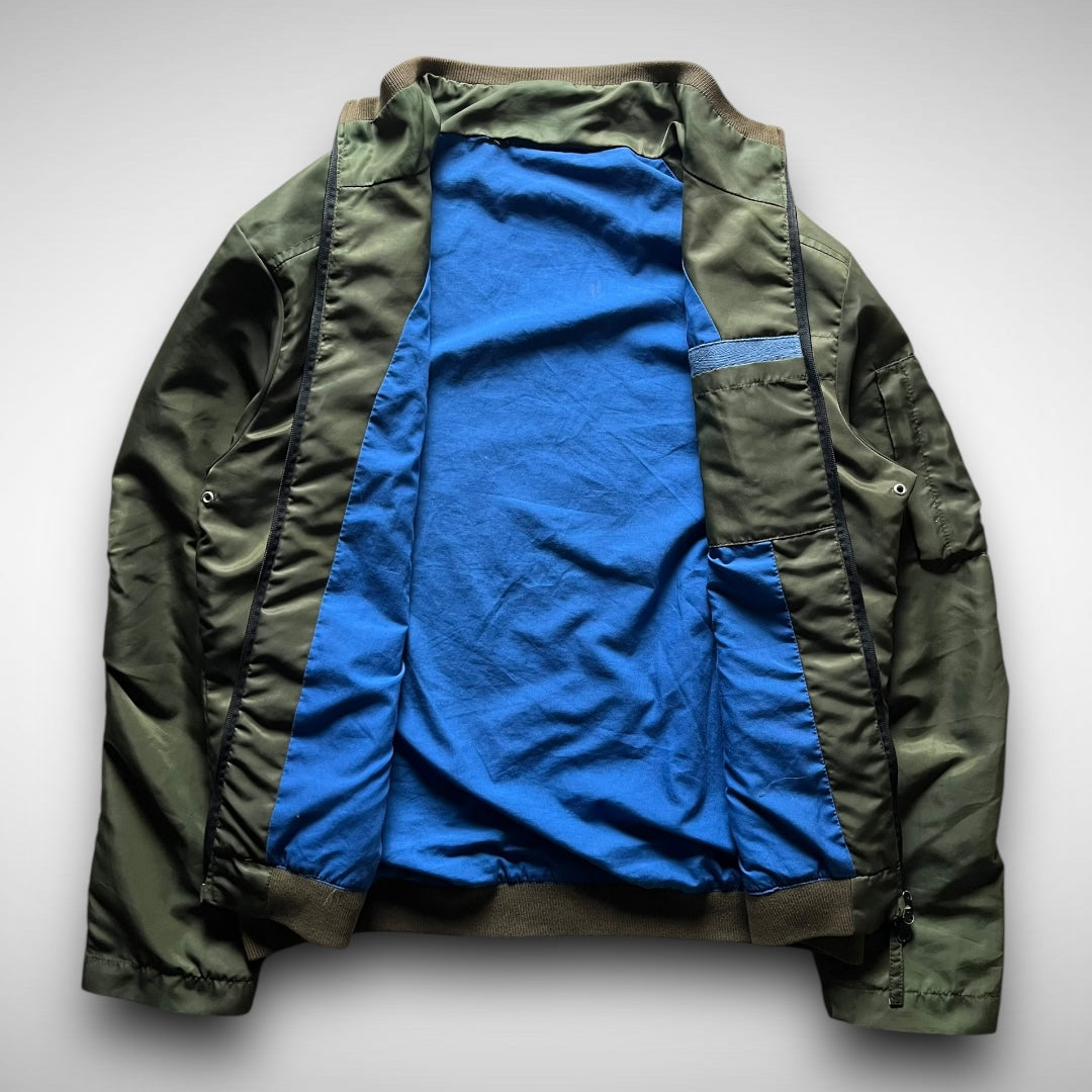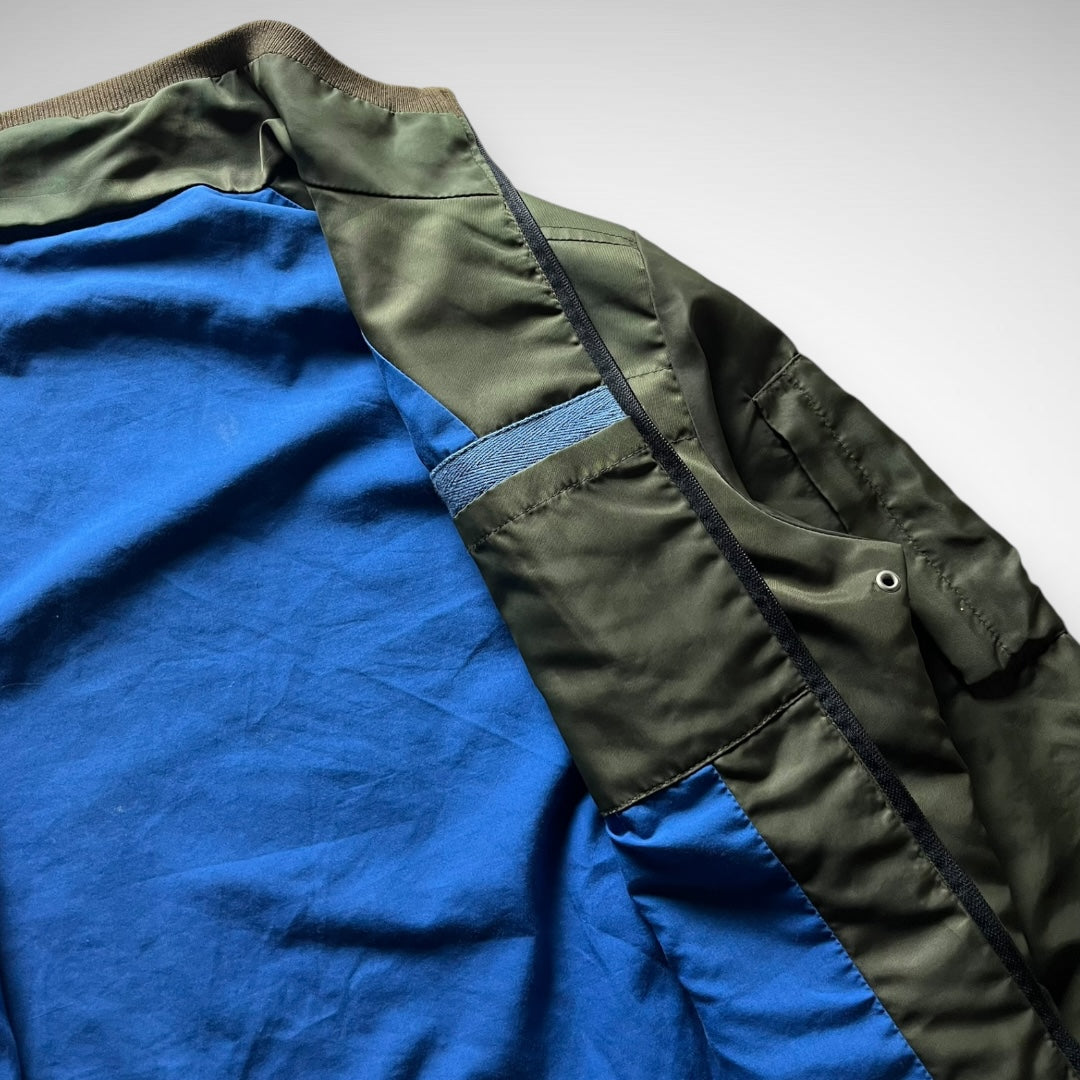 Army green nylon bomber featuring double front pockets and upper arm cargo pocket, arm-pit venting, ribbed cotton collar for comfort, electric blue lining with stash pocket and hidden 3M reflective print on the back showing ‘Technical Unit of Fabric Development.