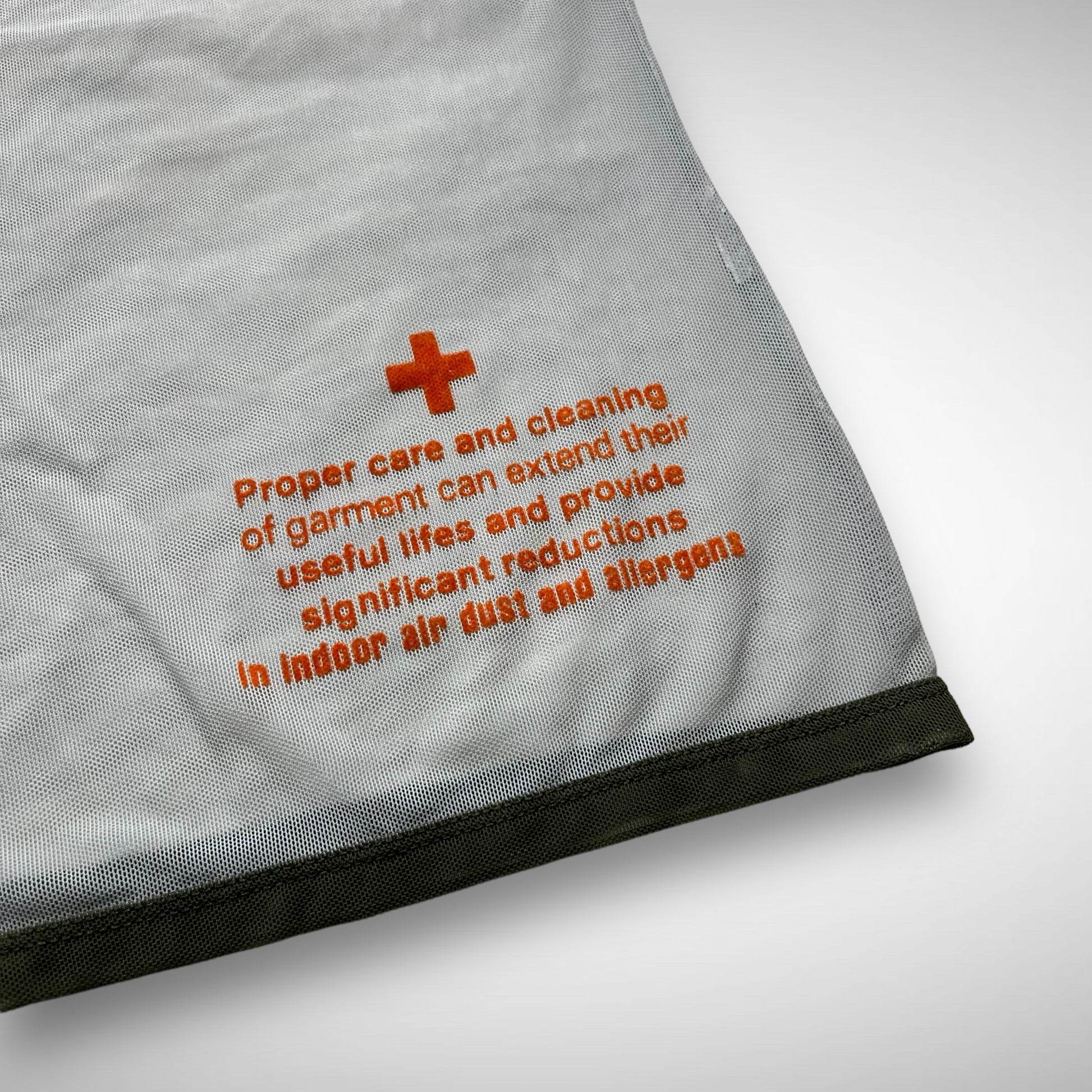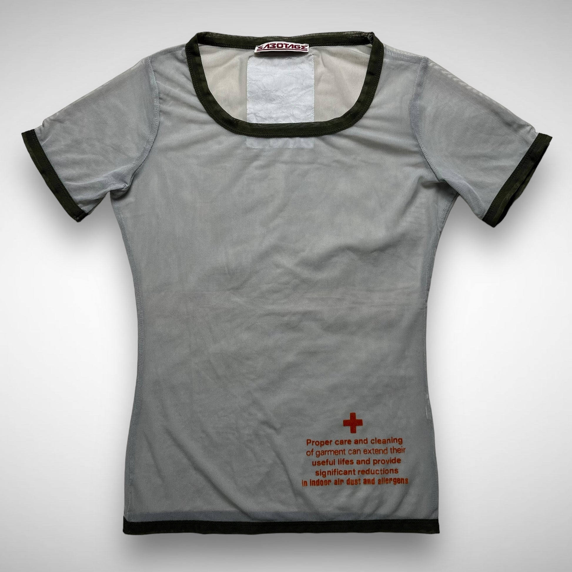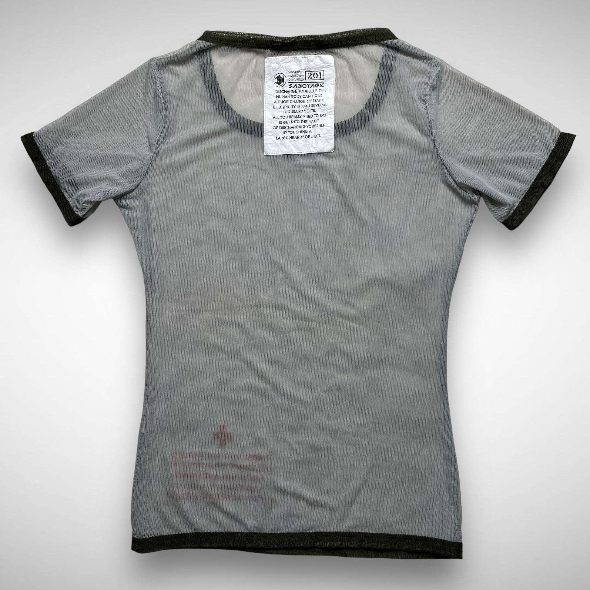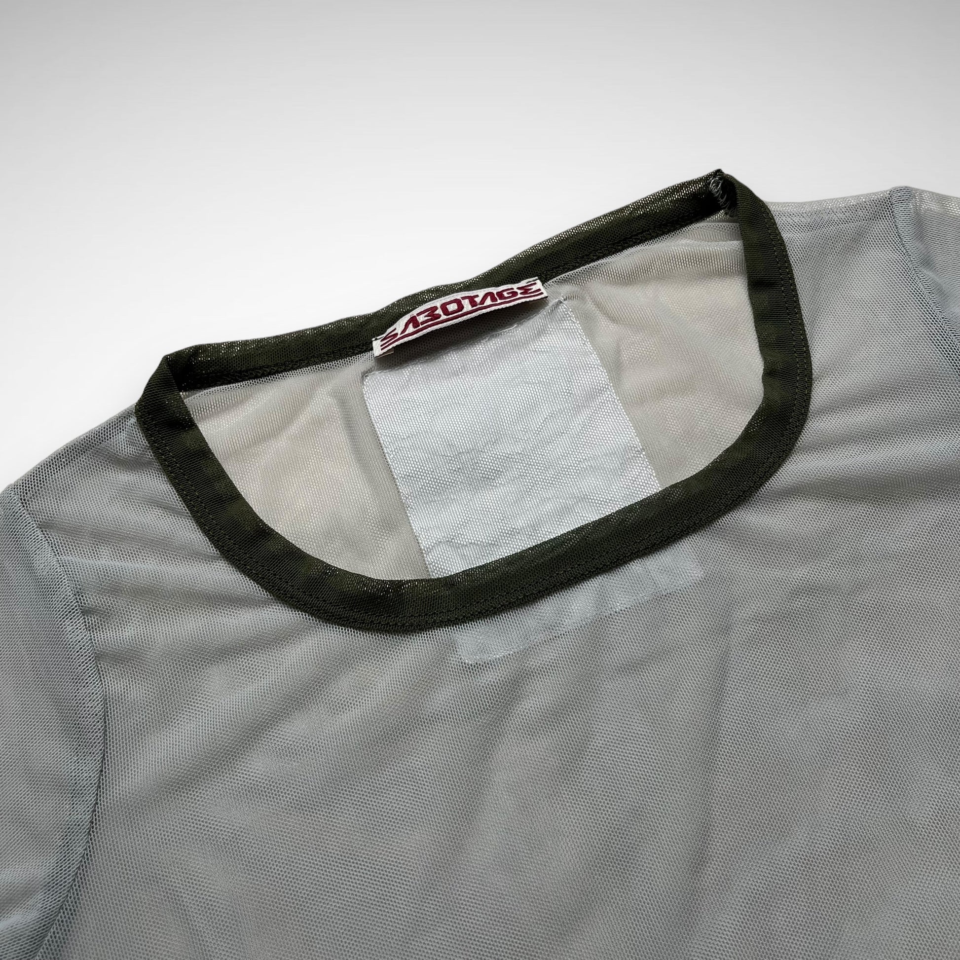 Mesh top with in khaki featuring darker-toned dye arm openings, collar and hem, velour script and cross in orange at lower-right body and signature large tag at back with Sabotage quote.