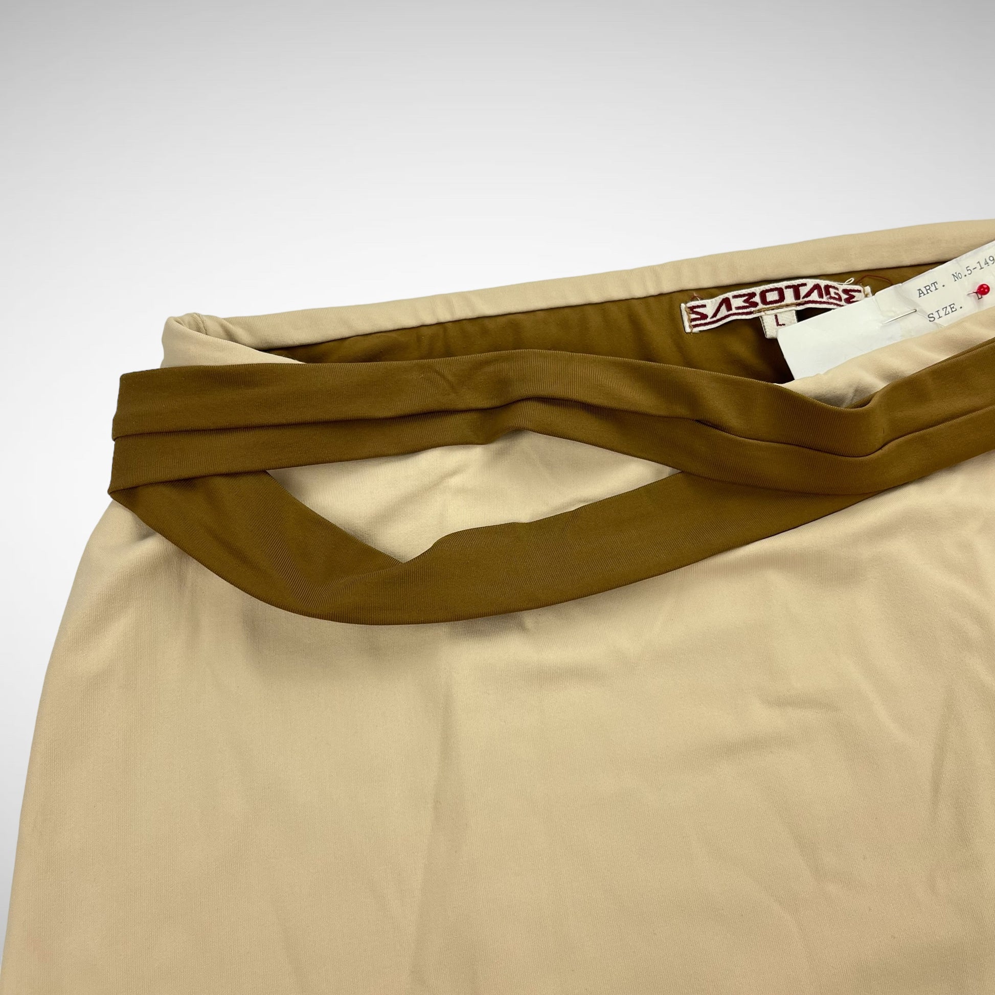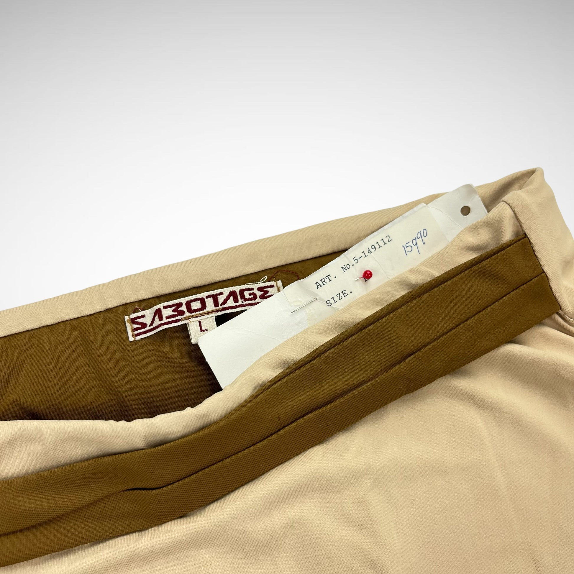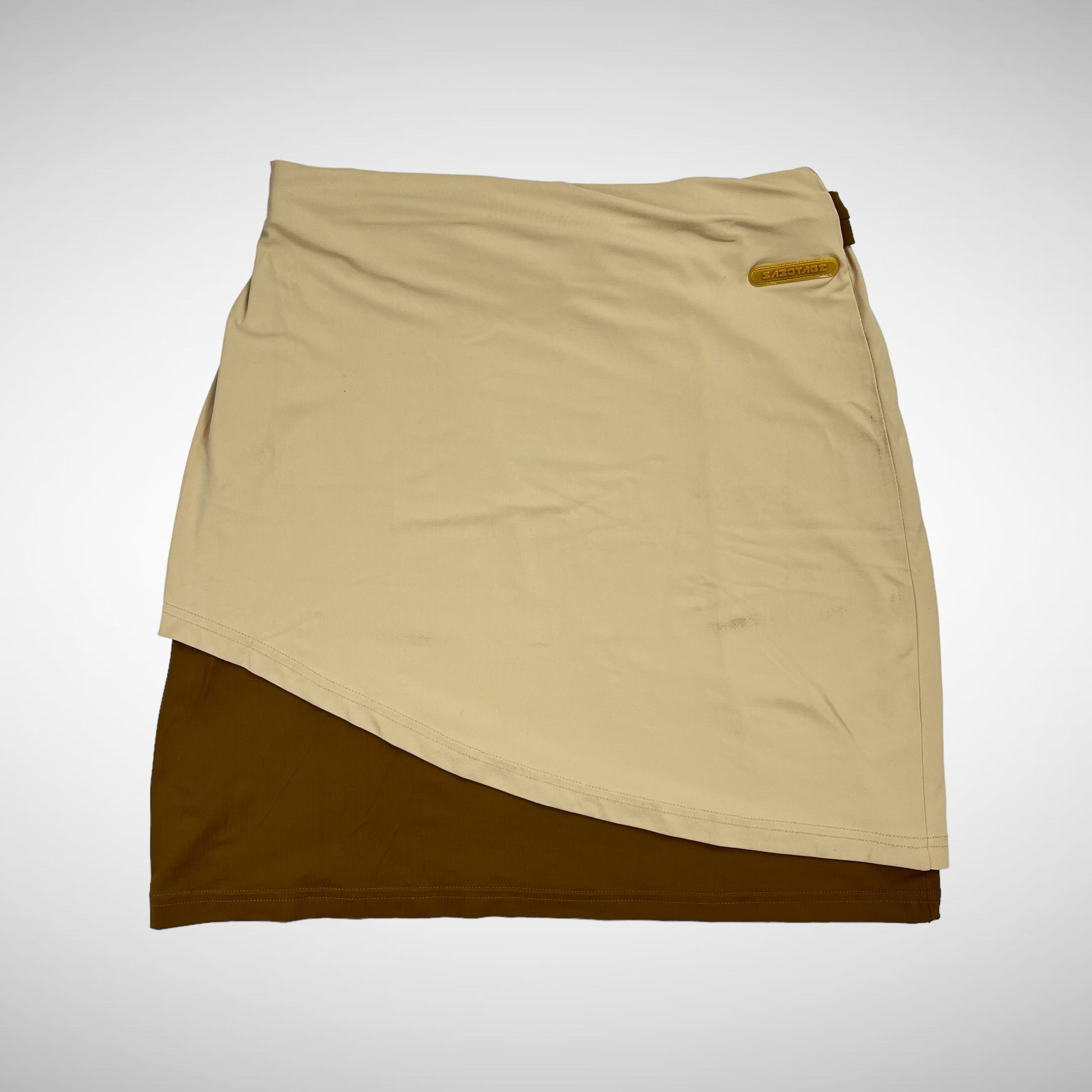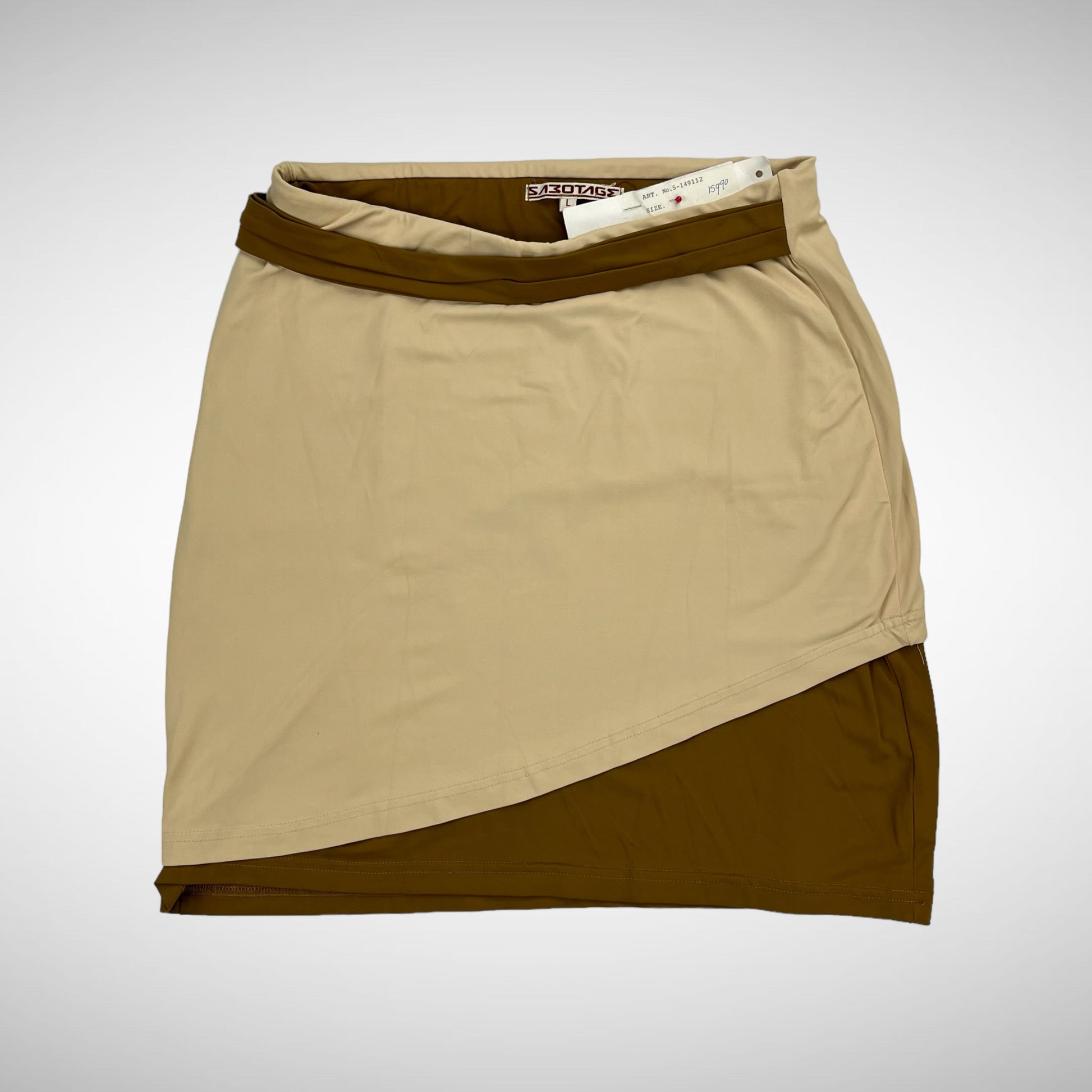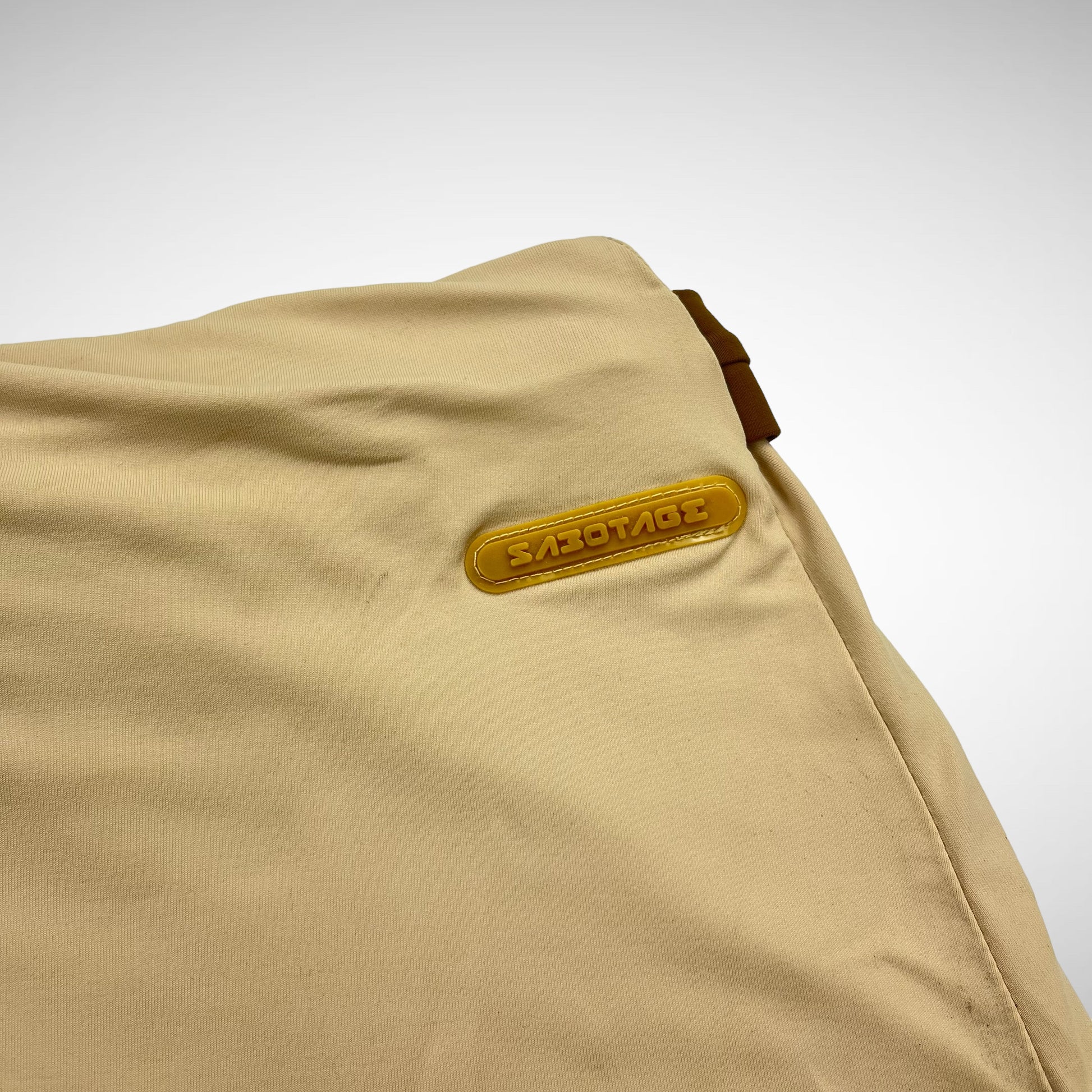 Two-tone nylon skirt with separate layers and elastic waistband to adjust style and fit, and rubber Sabotage patch on upper backside.