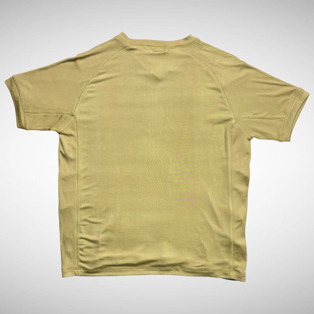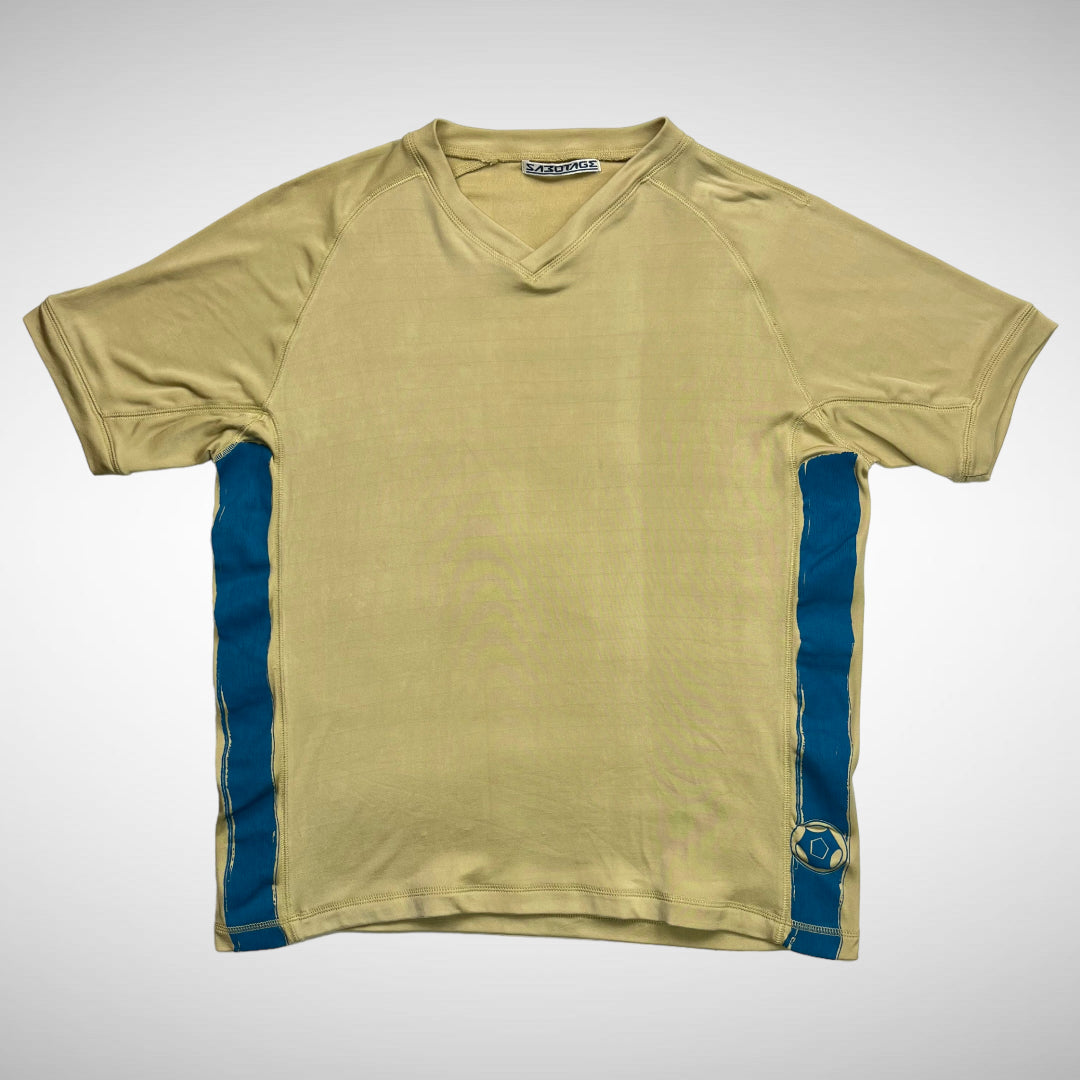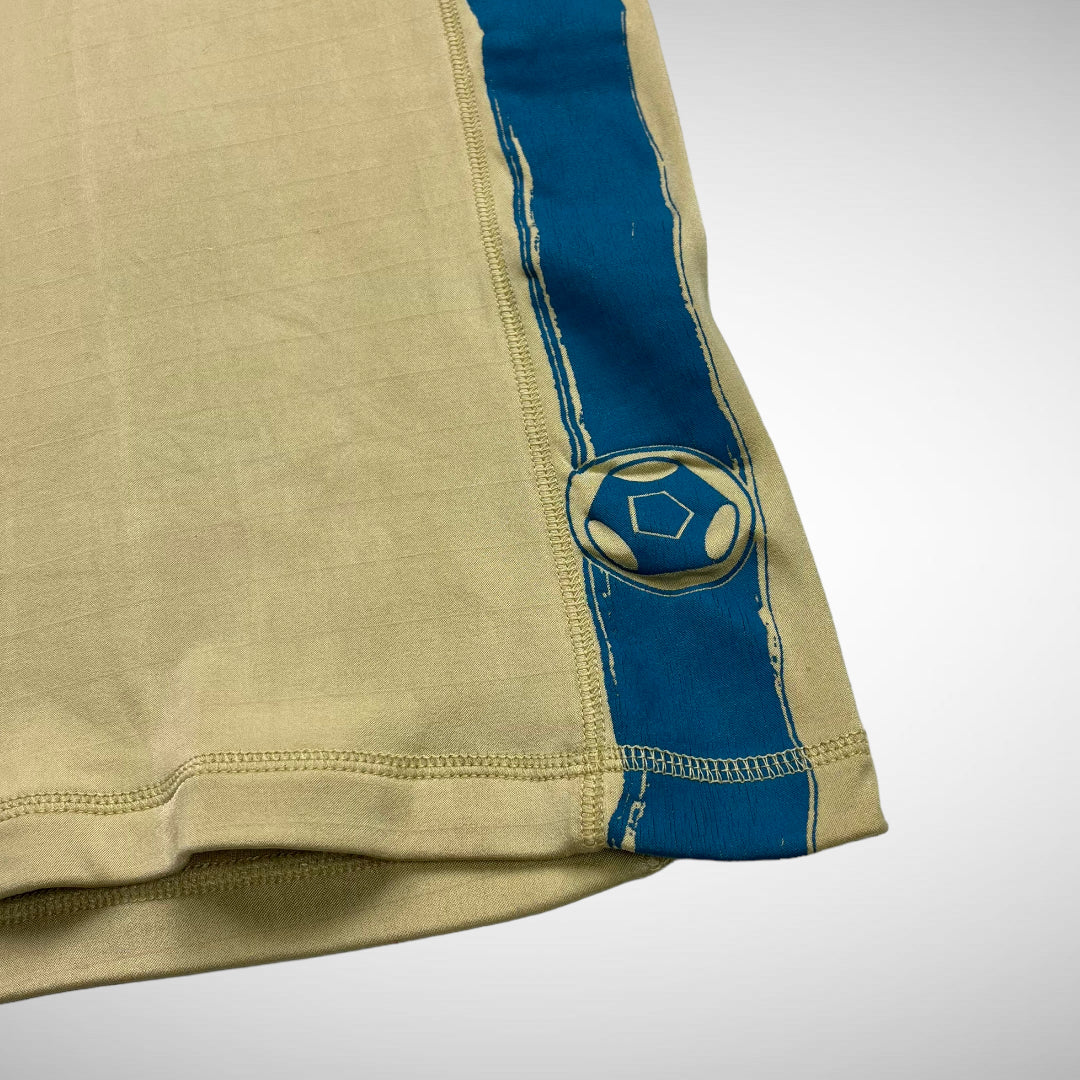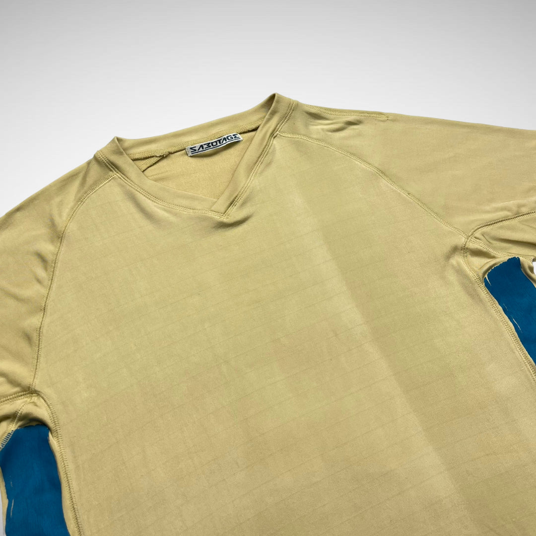 Golden/sand nylon shirt and the painted blue detailed part is heavy quality and super thick. Insane archive piece.
