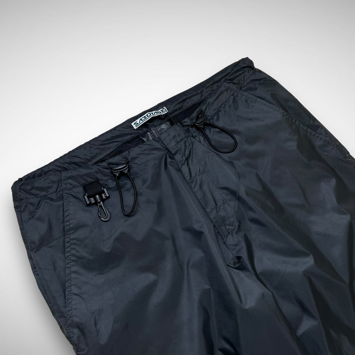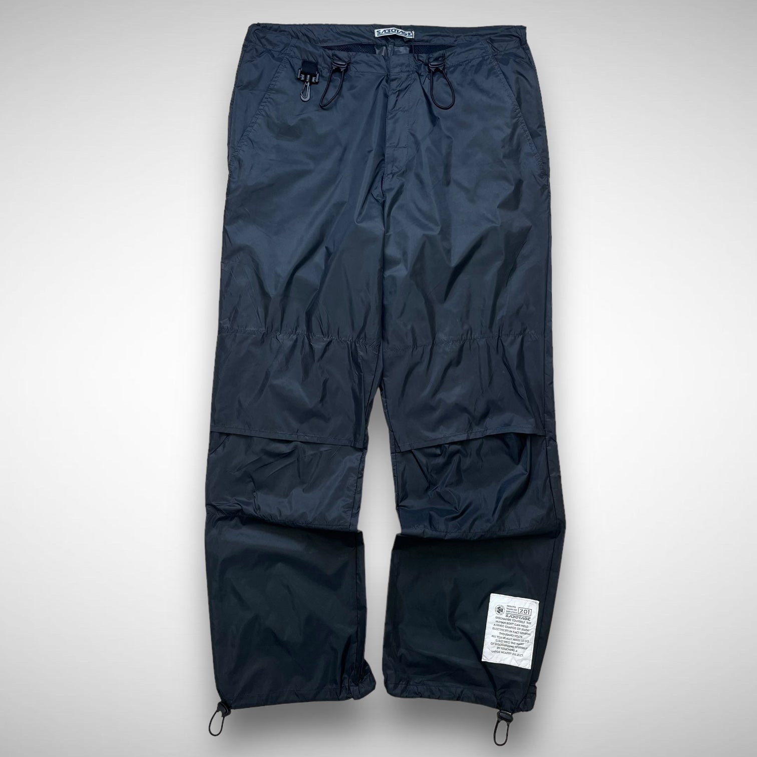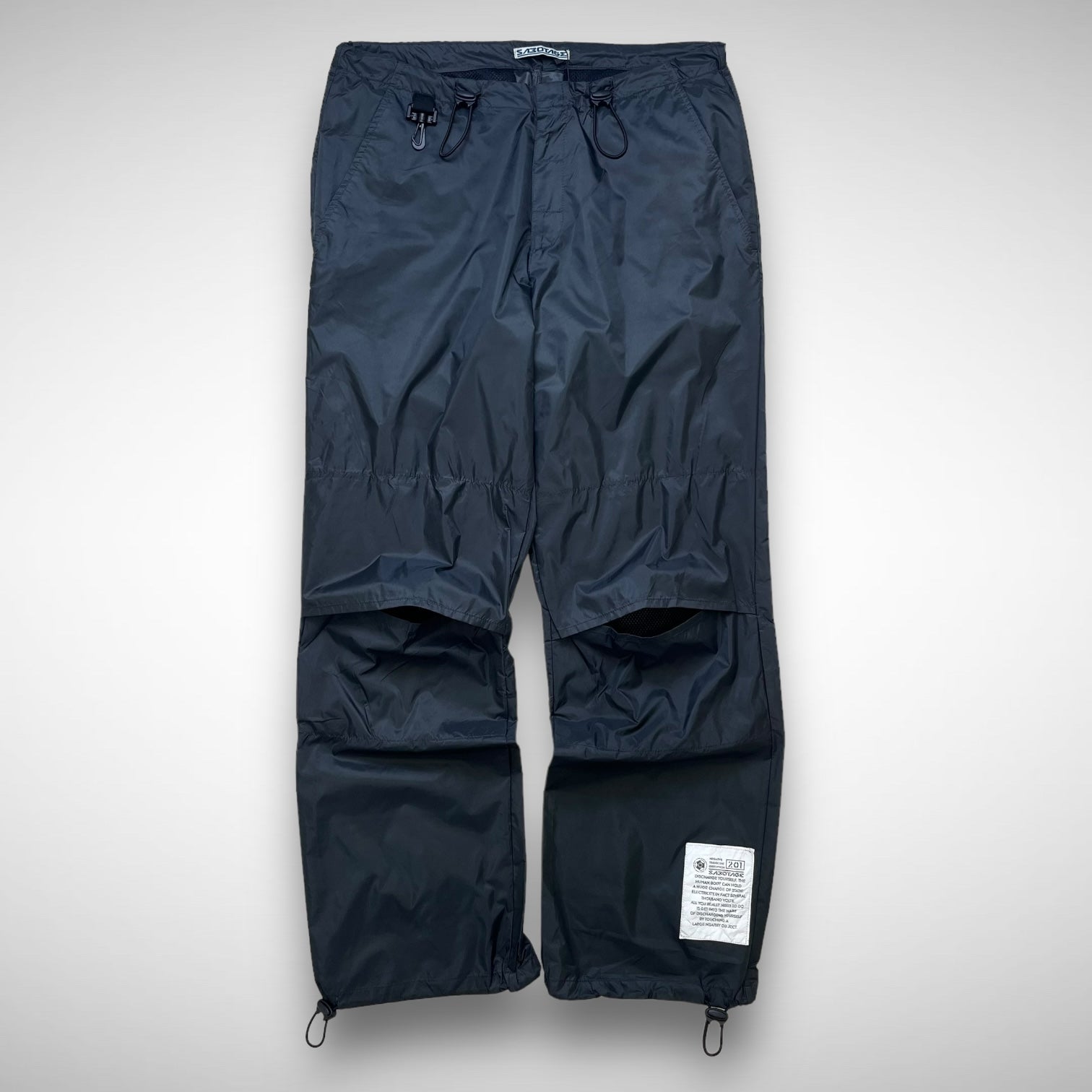 Lightweight parachute cargos featuring grey nylon panels with open-knee construction and mesh underlay for breathability, adjustable elastic cords at hem and ankles, white Sabotage panel with branded script text and back-side hides some Sabotage branding near pockets.