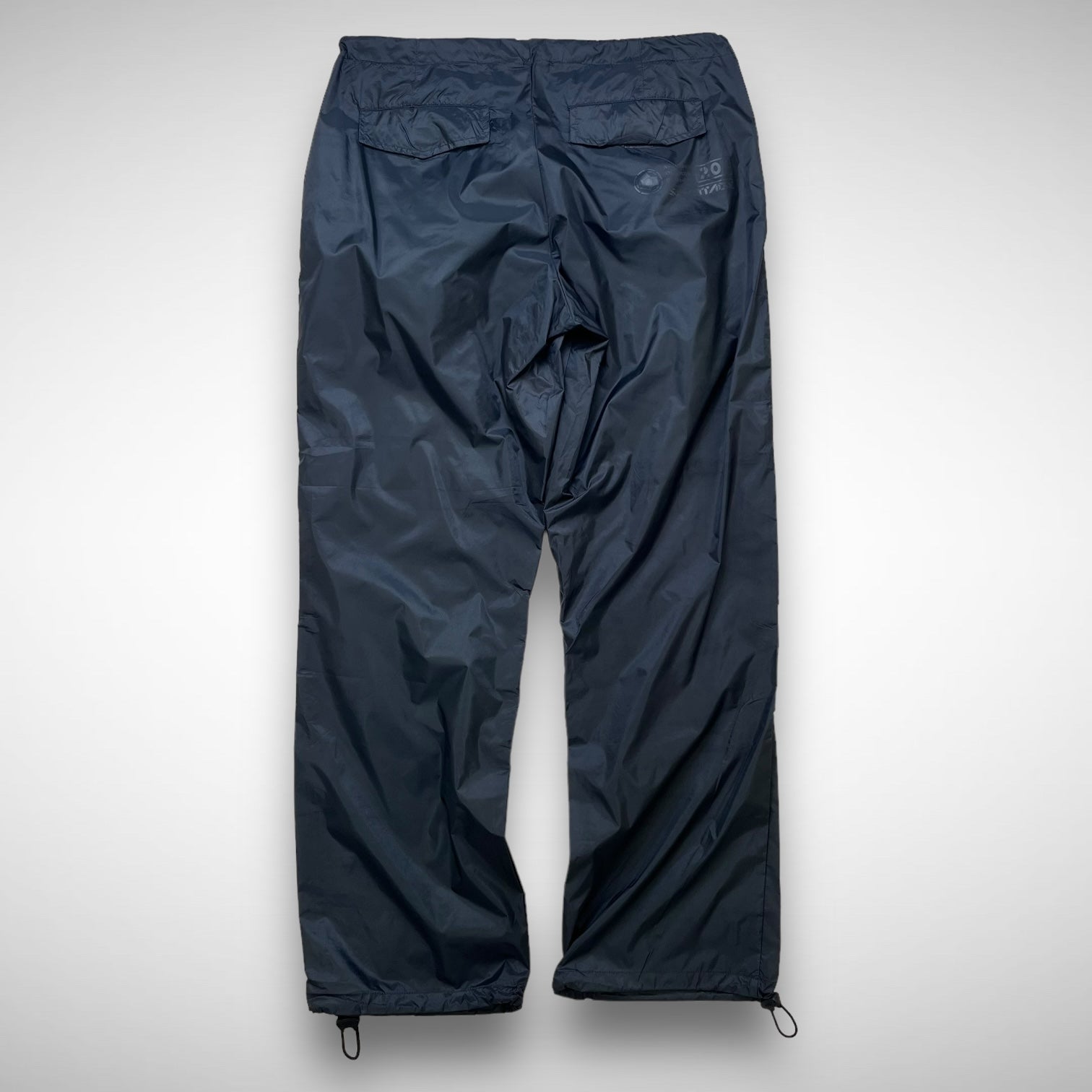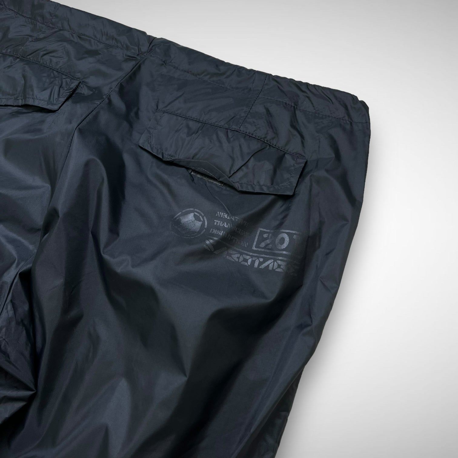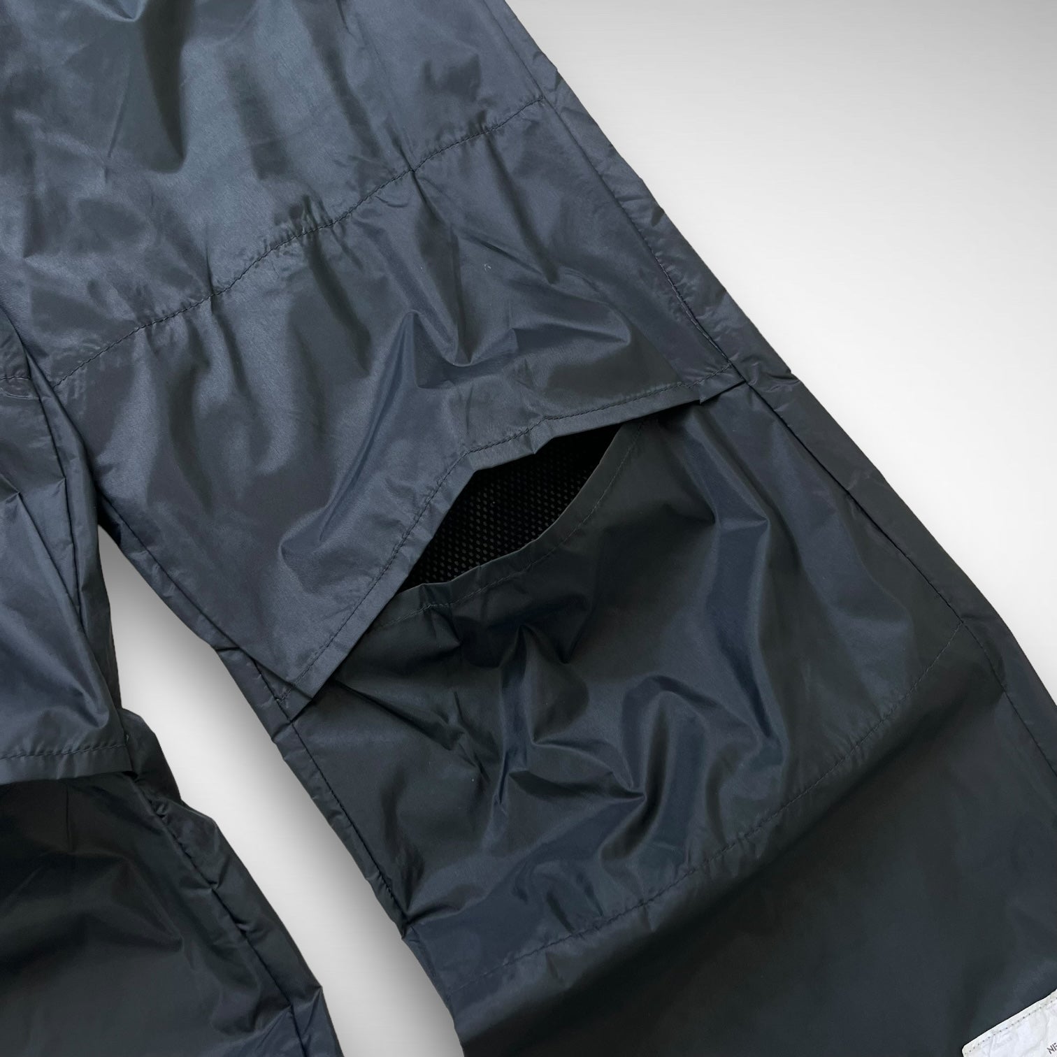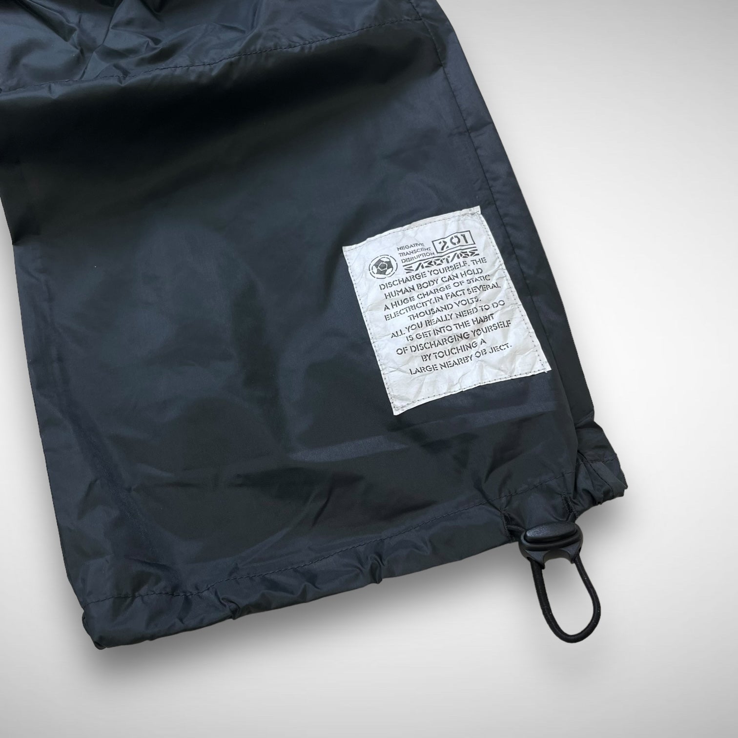 Lightweight parachute cargos featuring grey nylon panels with open-knee construction and mesh underlay for breathability, adjustable elastic cords at hem and ankles, white Sabotage panel with branded script text and back-side hides some Sabotage branding near pockets.