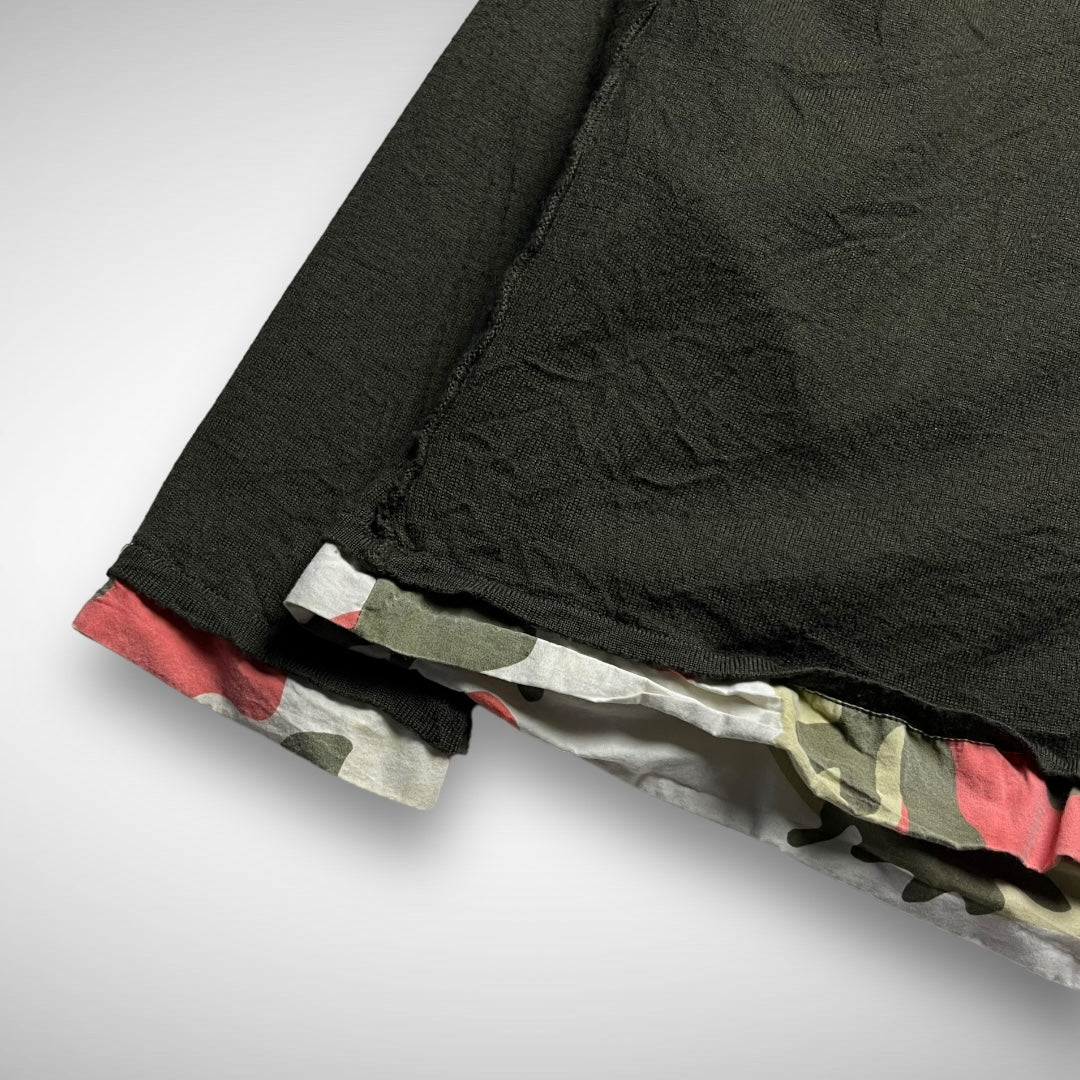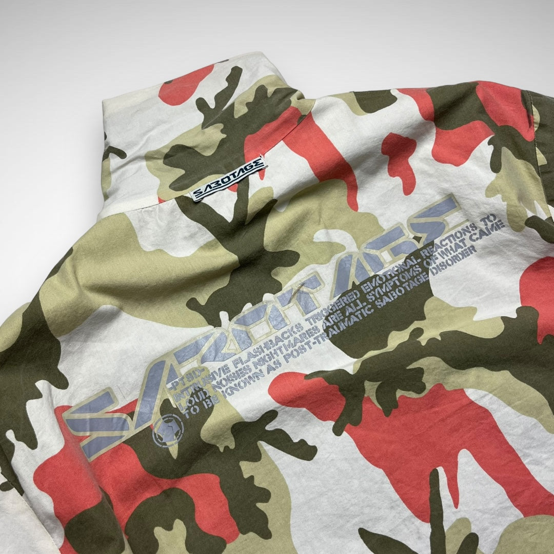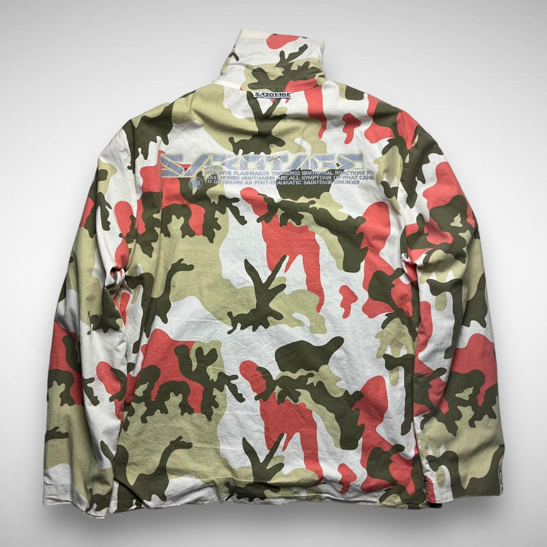 Camo on one-side, casual knit on the other, sick. Old-Swedish army camouflage with a colour-palette from white to coral and light to dark green, spell-out Sabotage script and ‘PTSD’-text, referring to a ‘post traumatic sabotage disorder’, the knit-side has reversed seams and shows slightly the camouflage at hem and cuffs.