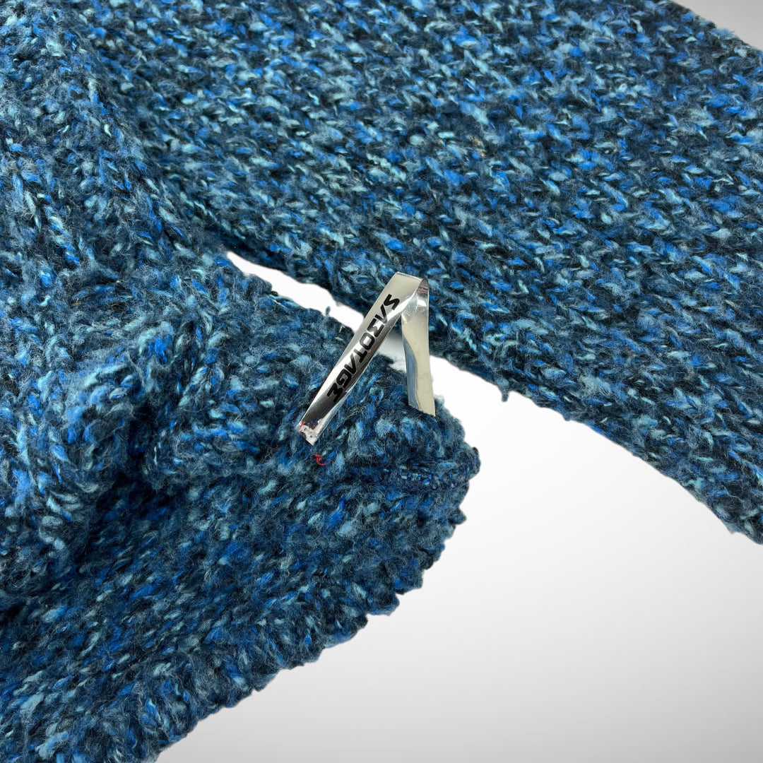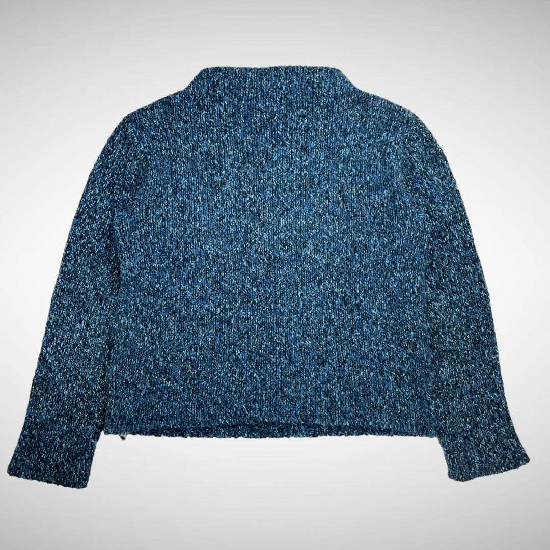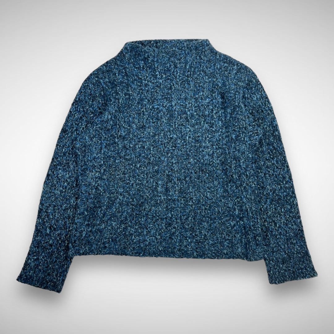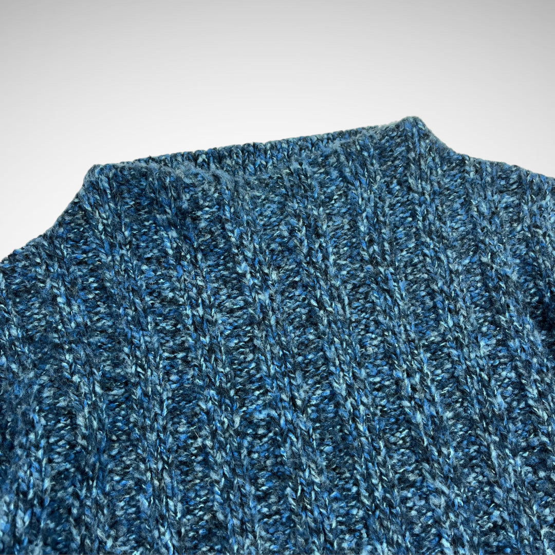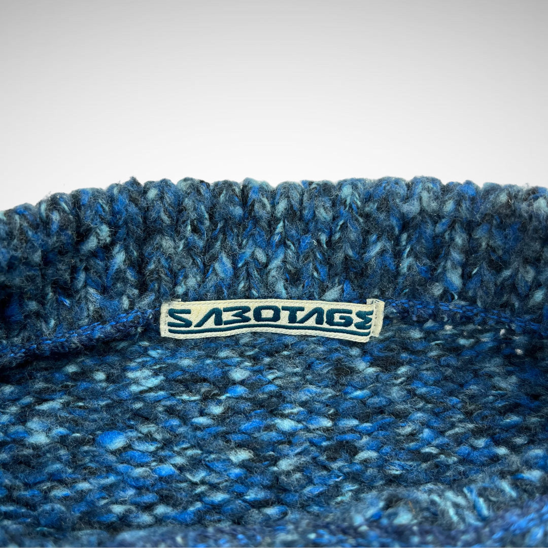 Stunning knit with perfect fit in tones of blue made from wool, minimal branding with no external branding and only two tags of which one is the electric Sabotage tag and other the regular neck-tag.