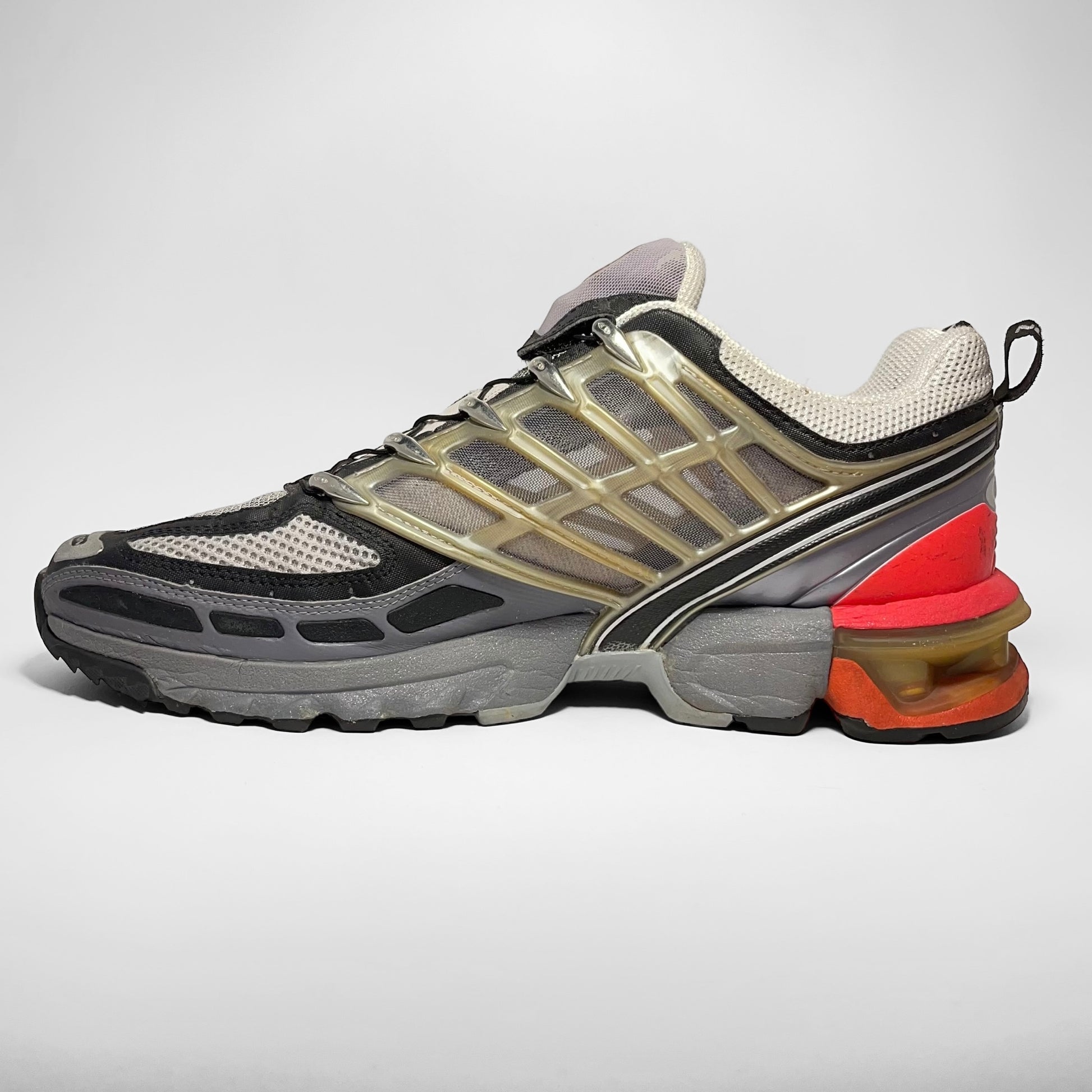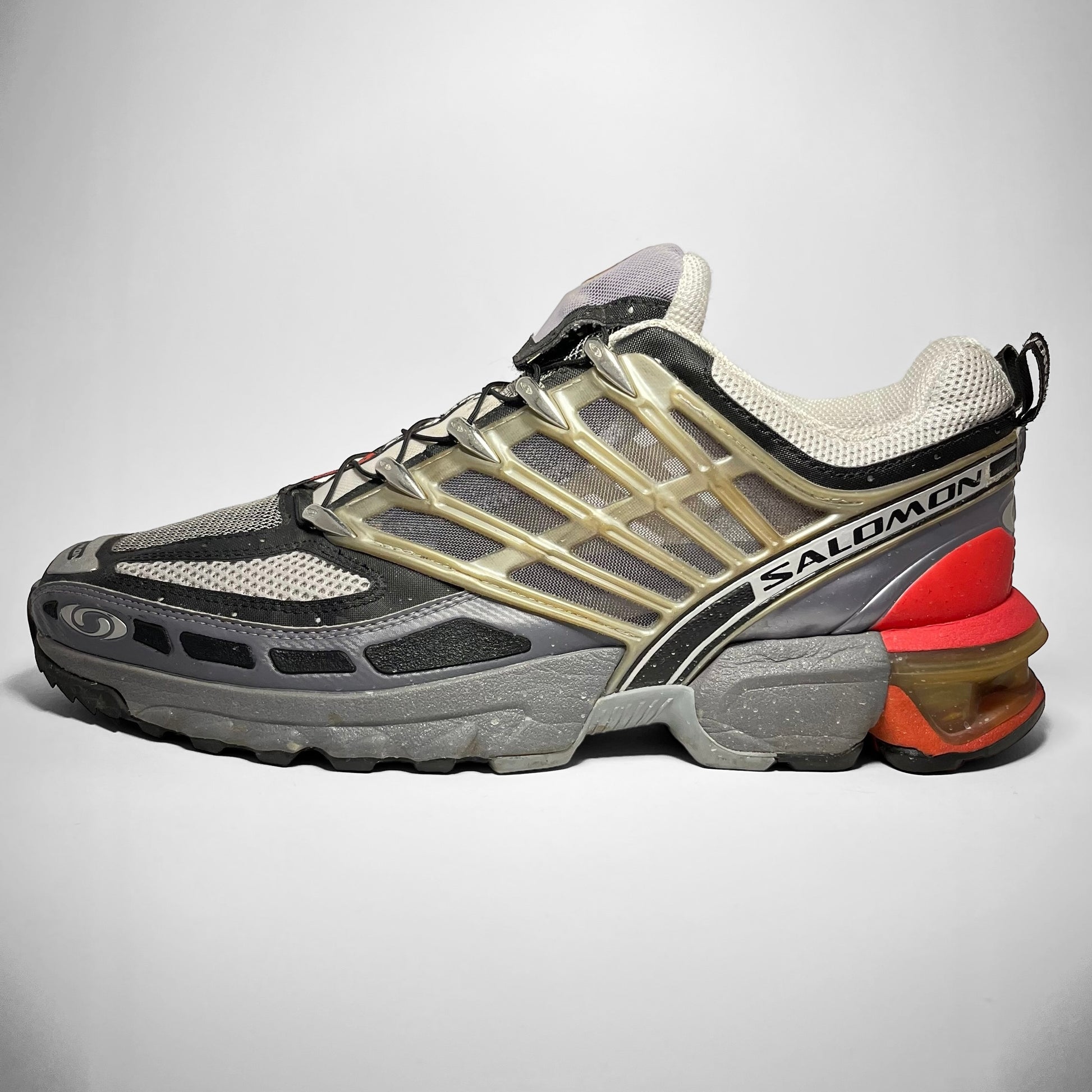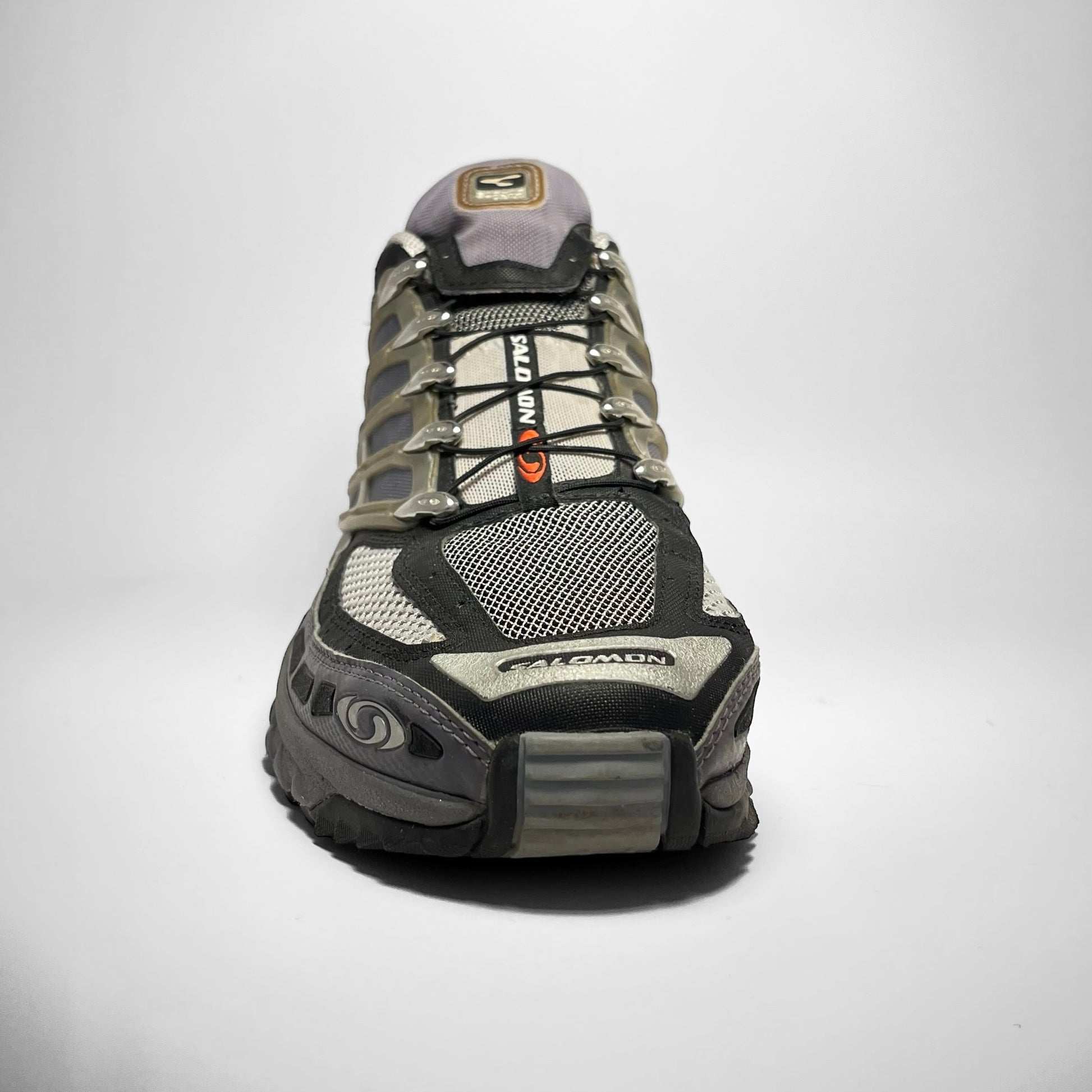 Condition is like new. Famous for its retro last year, this pair has gained immense popularity. Mesh base, black leather panels, plastic rib cage with see through wire construction, one-pull laces with metal eyelets, shock-absorbing units in the heel and completed with Salomon branding on the tongue, sides and tongue.